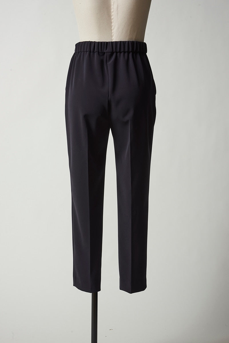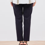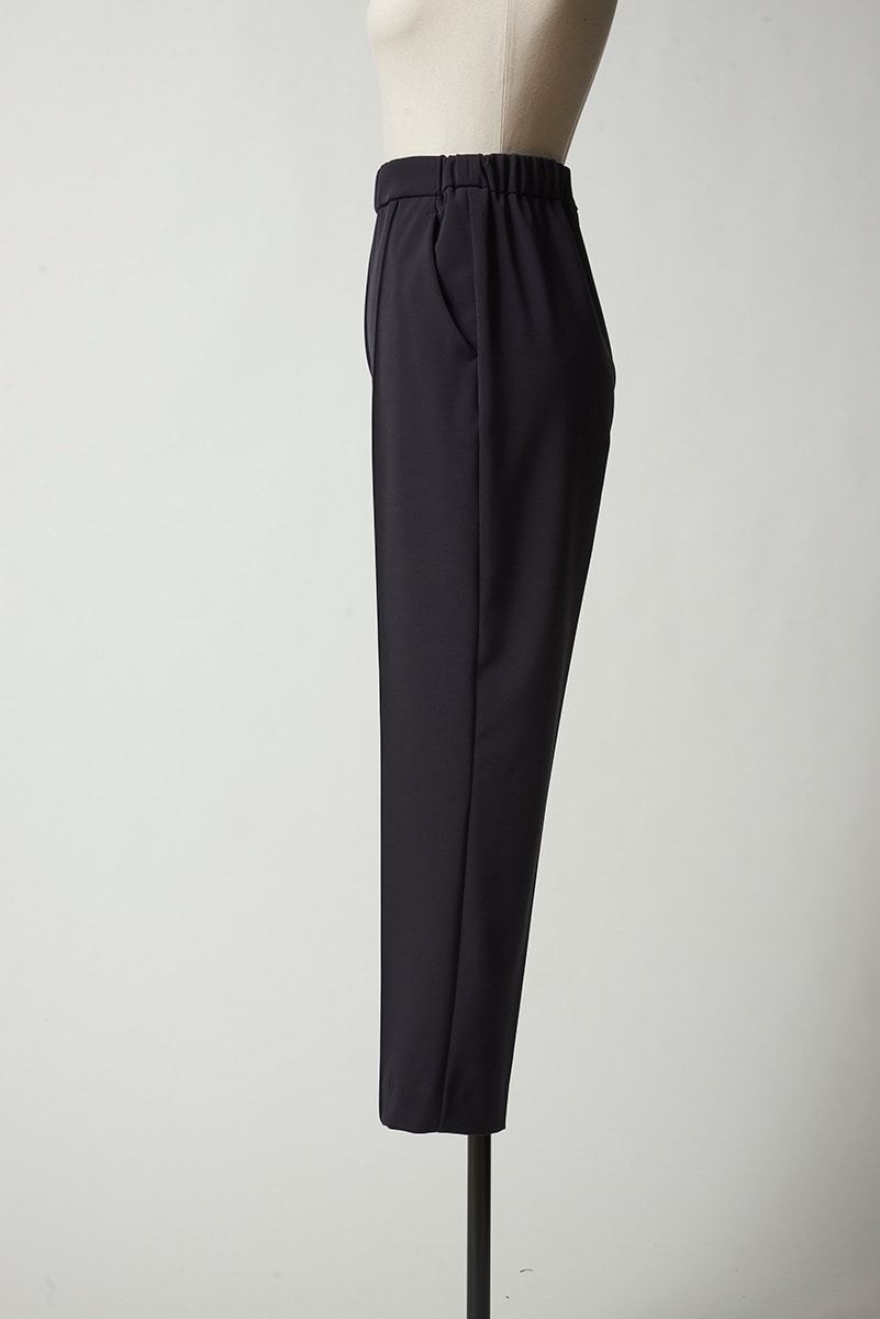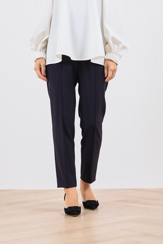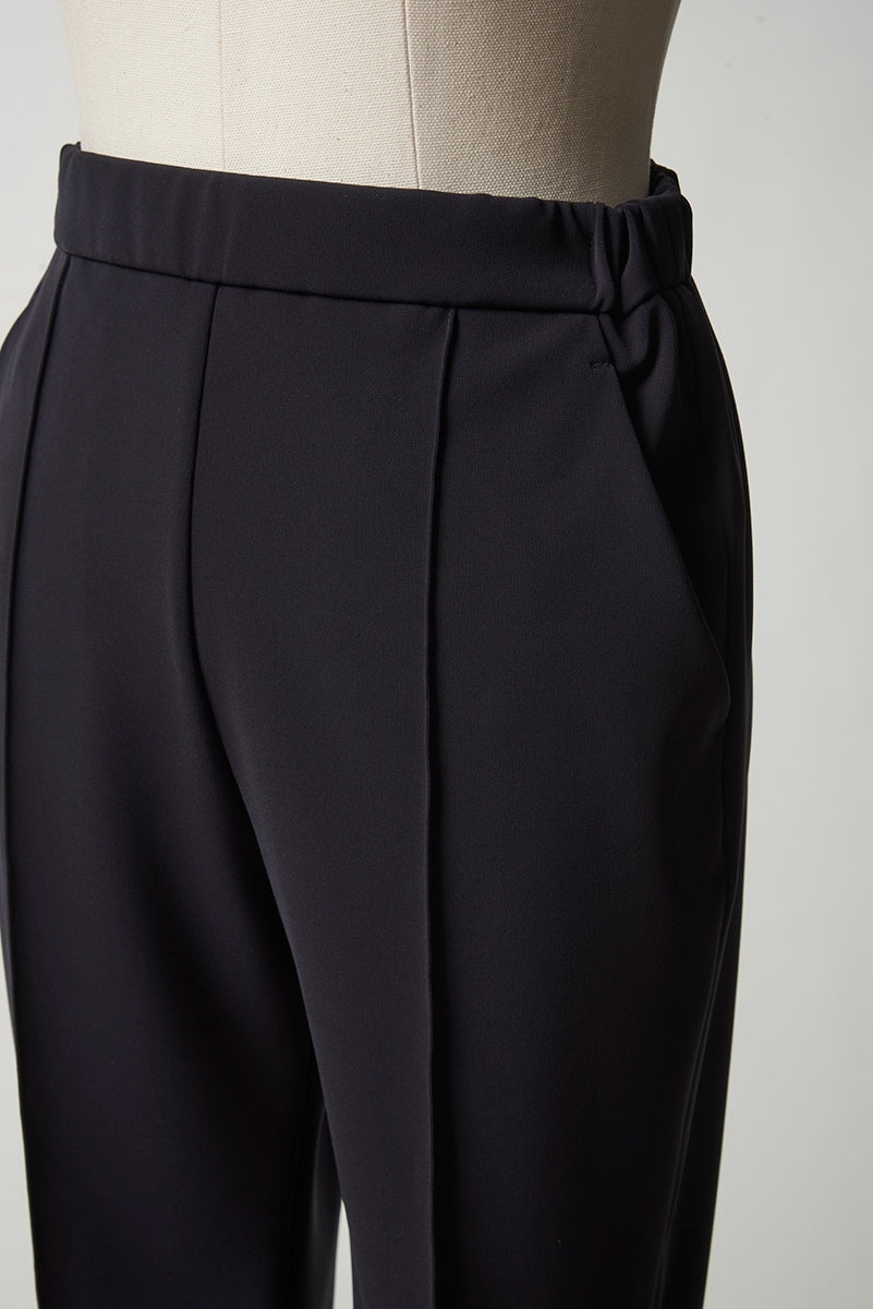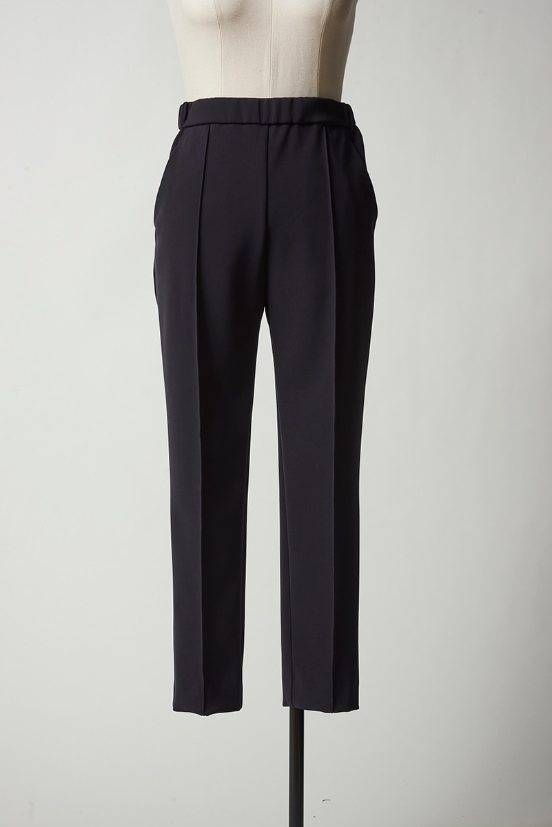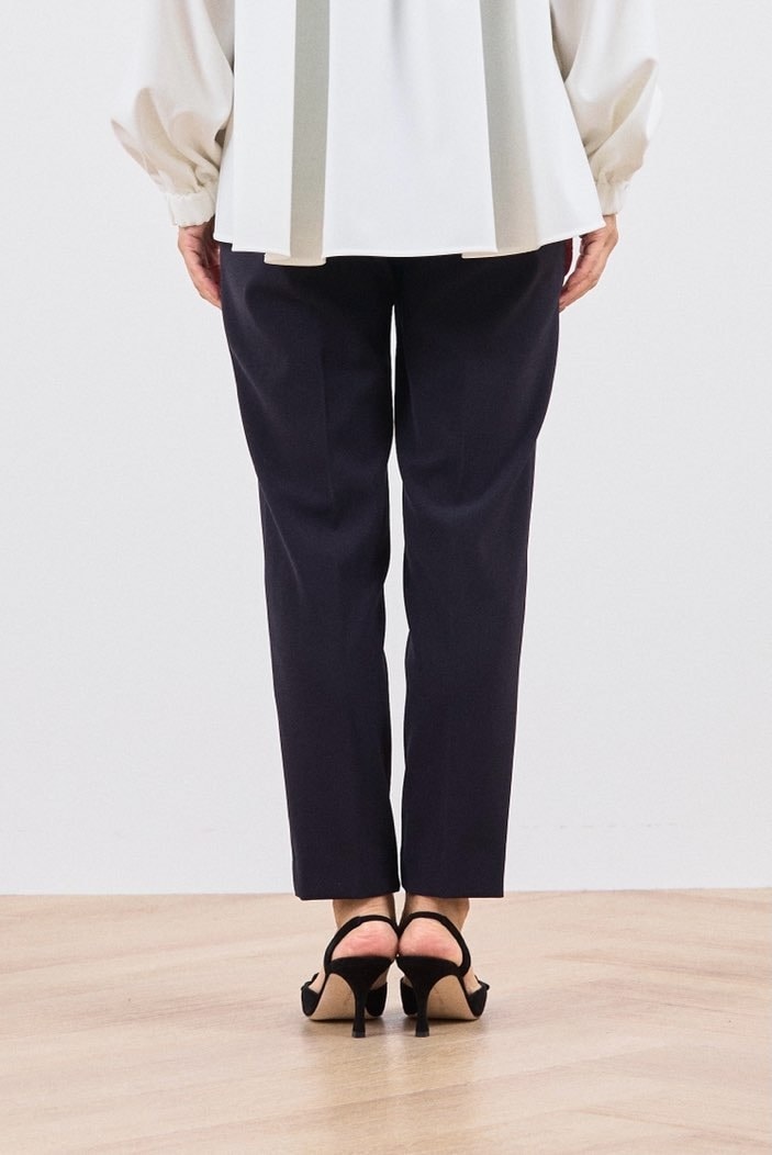 セレモニーピンタックパンツだと丈が足りない足長さんへ、ウエストやヒップなどは同じ寸法になります。しなやかなハリ感とストレッチ性が心地よく、ボディラインを拾わずストンとした落ち感のある生地を使用しています。前中心にピンタックが入ったすっきりシルエットです。後ろウエストはゴム仕様の快適な着用感です。一枚あるとオンオフ問わずさまざまなシーンで活躍してくれるアイテムです。