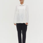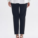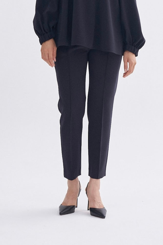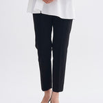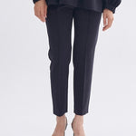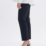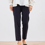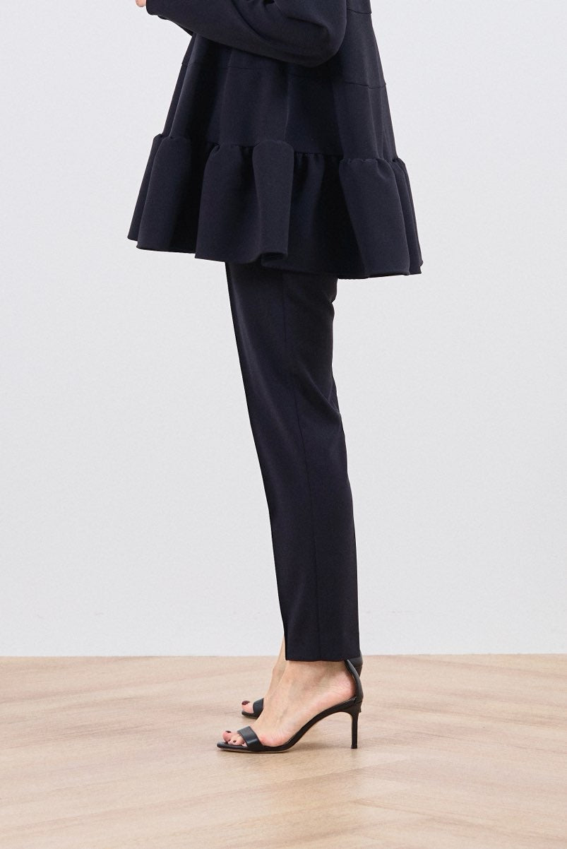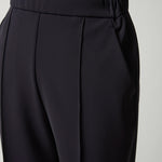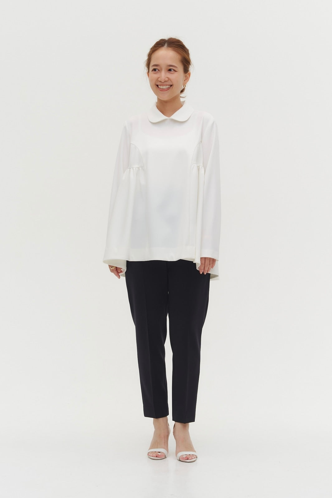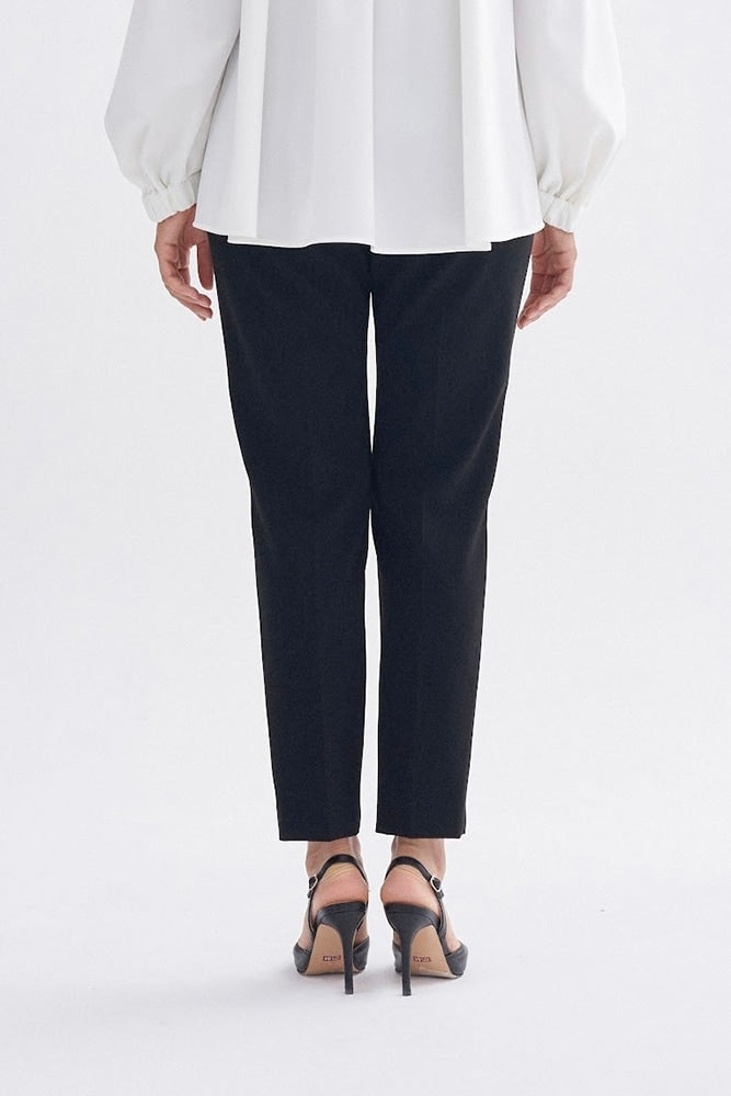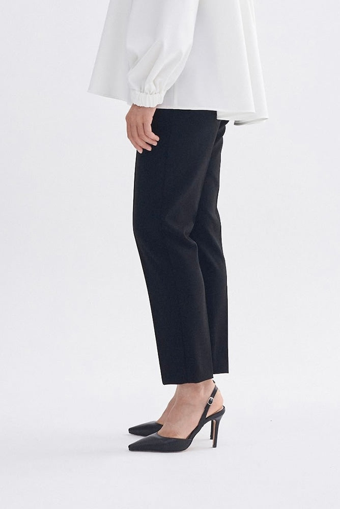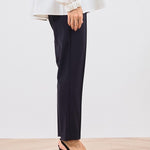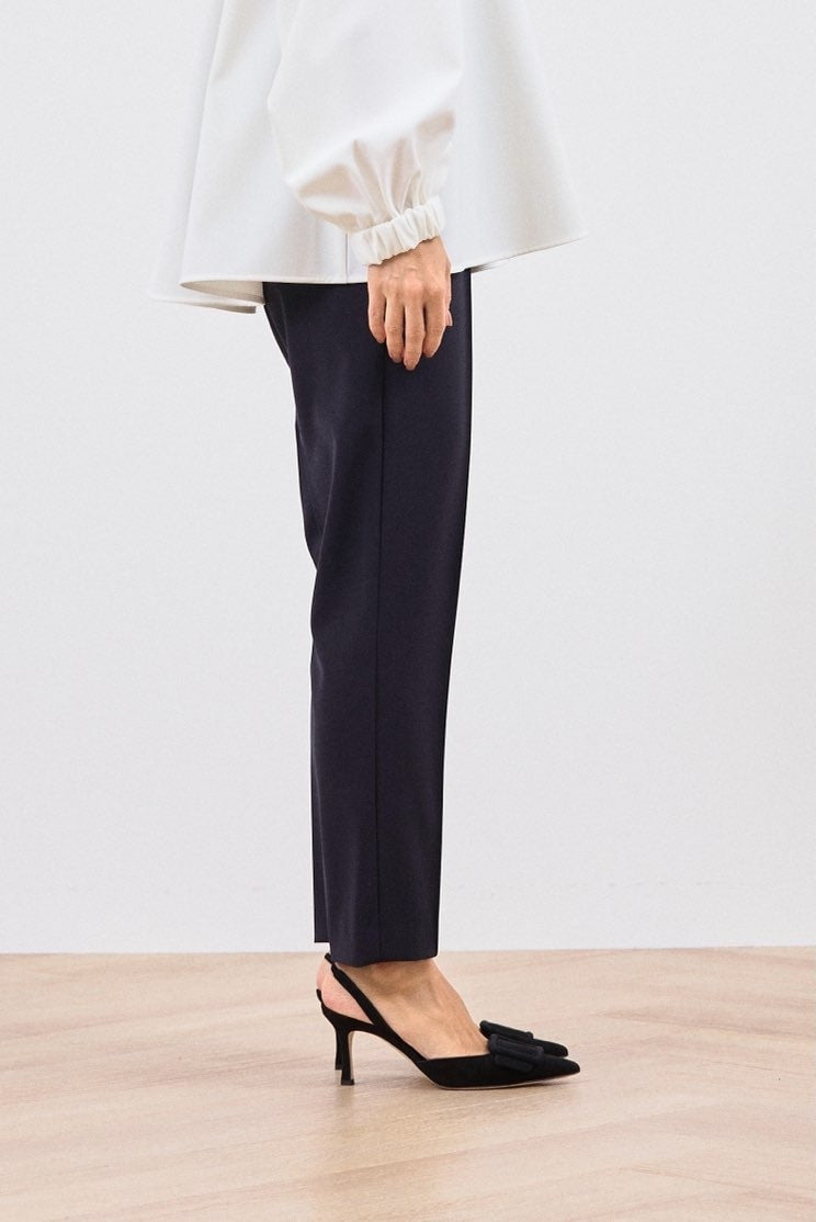 セレモニーピンタックパンツだと丈が足りない足長さんへ、ウエストやヒップなどは同じ寸法になります。しなやかなハリ感とストレッチ性が心地よく、ボディラインを拾わずストンとした落ち感のある生地を使用しています。前中心にピンタックが入ったすっきりシルエットです。後ろウエストはゴム仕様の快適な着用感です。一枚あるとオンオフ問わずさまざまなシーンで活躍してくれるアイテムです。
