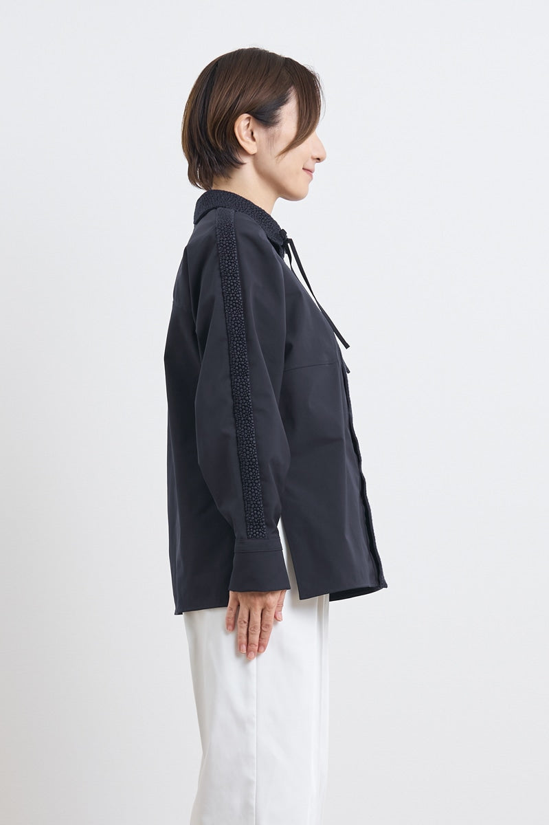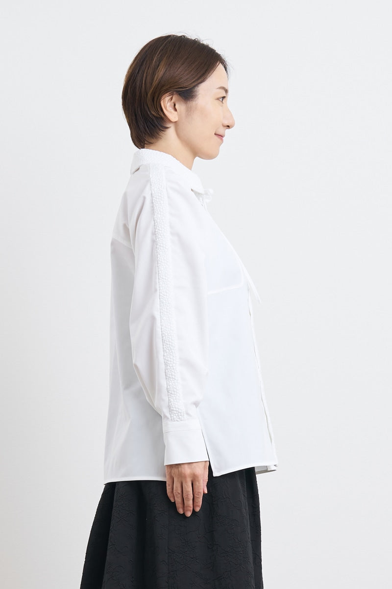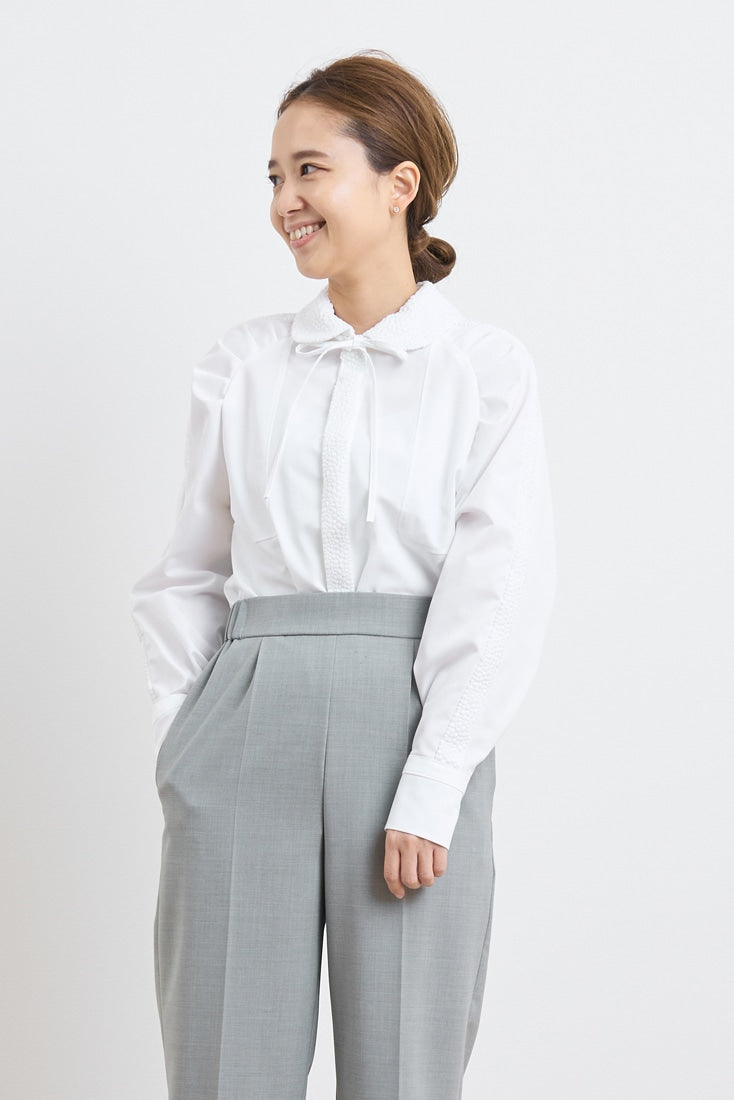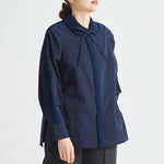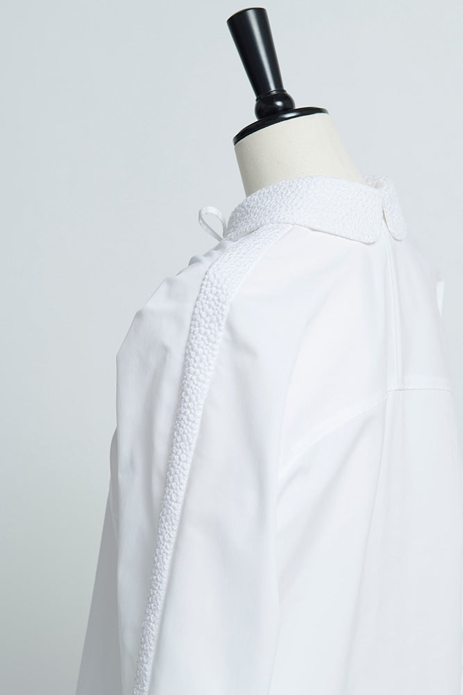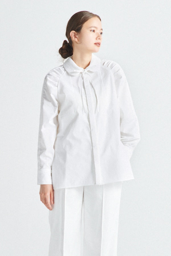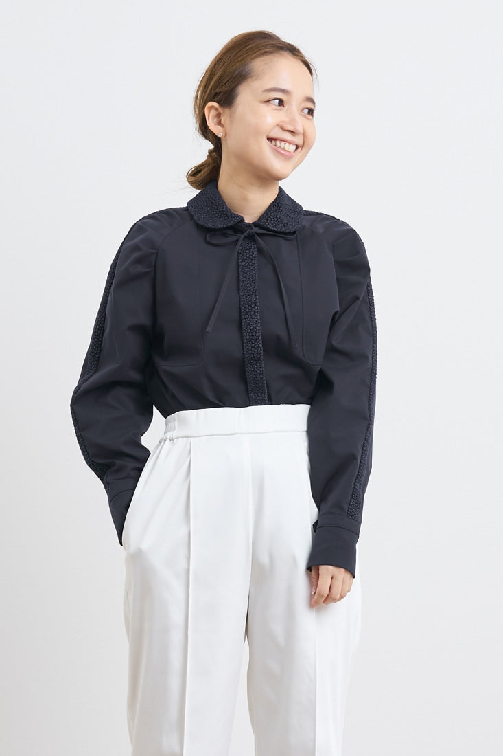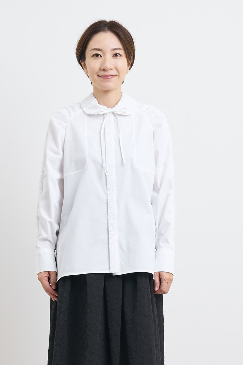 ラグラン袖にはタックを入れたラインが構築的でモードな印象です。伸縮性がありハリとしなやかな風合いのある繊細な表面感に仕上げた素材を使用しています。コンパクトな丸衿下には取り外し可能なリボンが付いています。両サイドには深めのスリットを入れて軽快な印象に。タックを施した立体的なスリーブや、バックの切り替えデザインのバランスにも拘りました。yoriオリジナル貝釦を使用しています。ピュアなホワイトとシックなネイビーの2色展開です。
