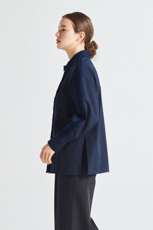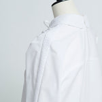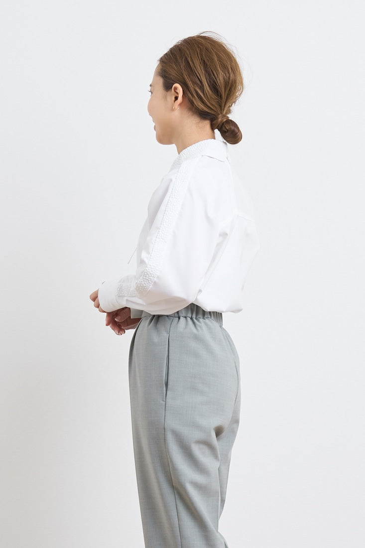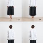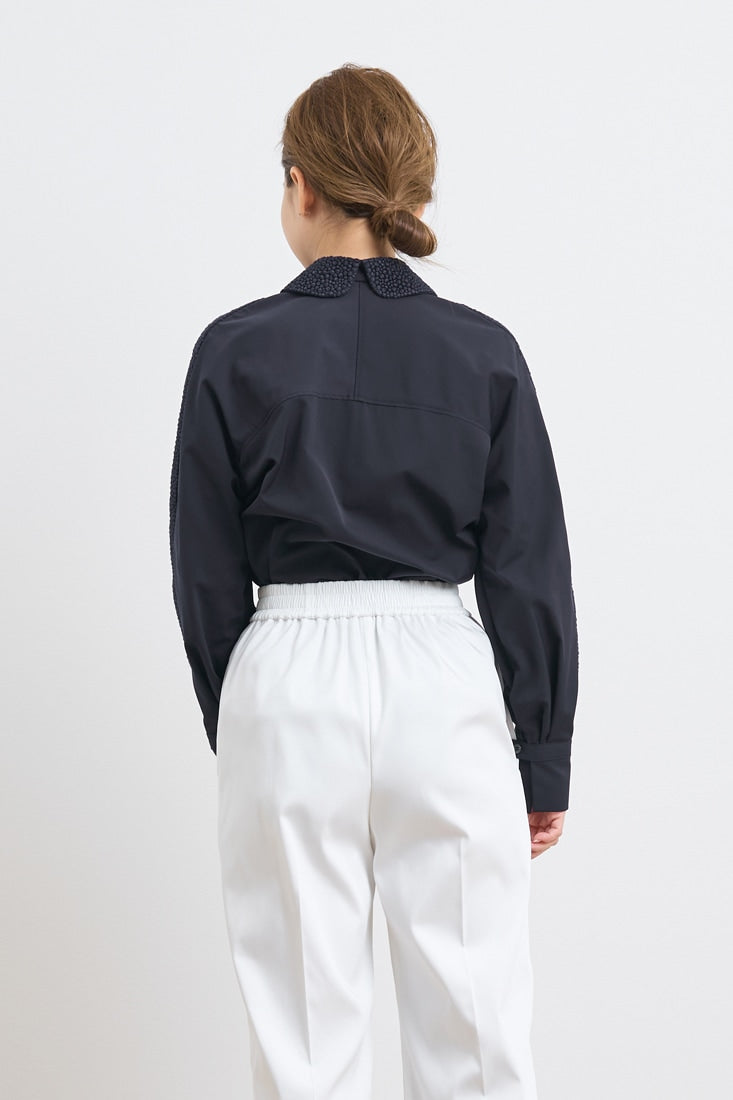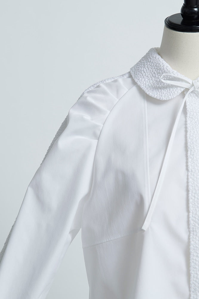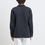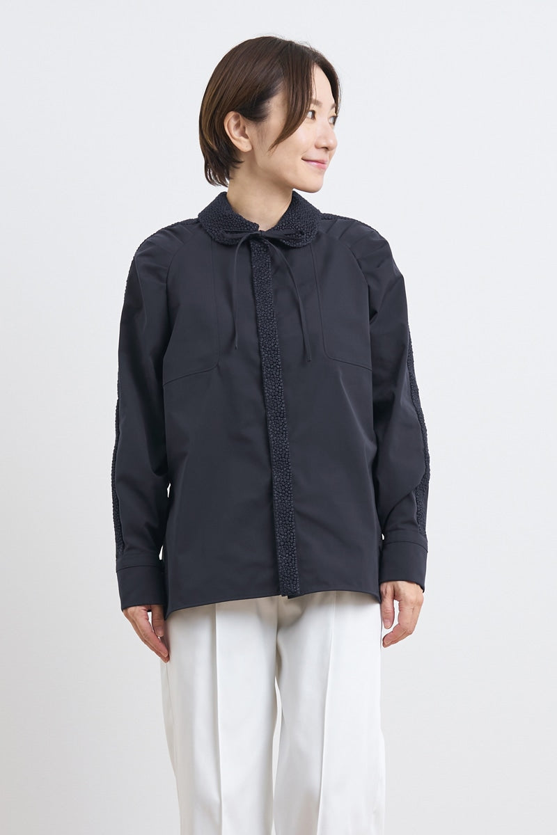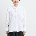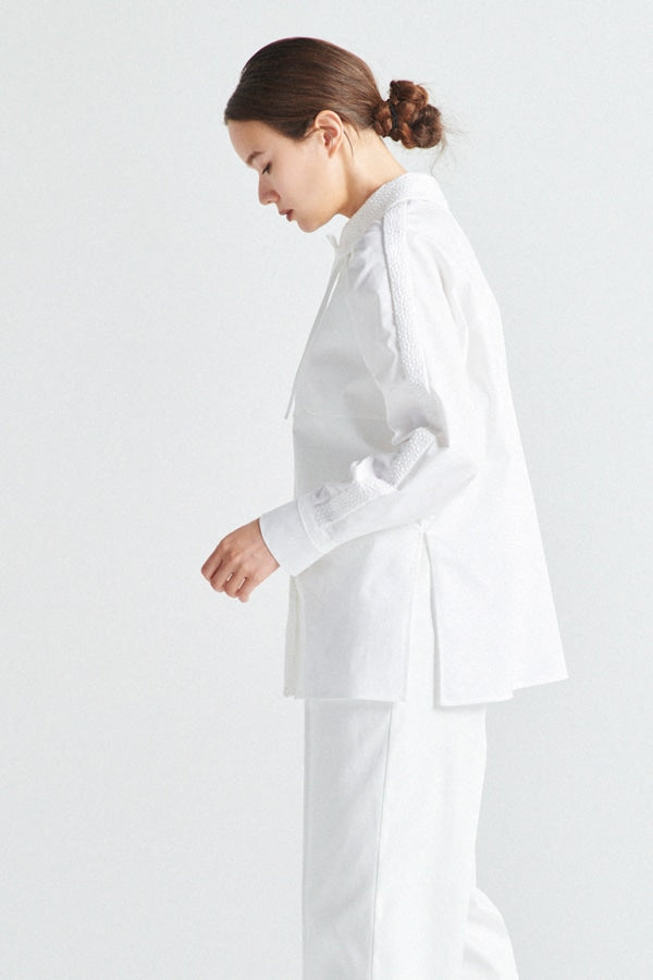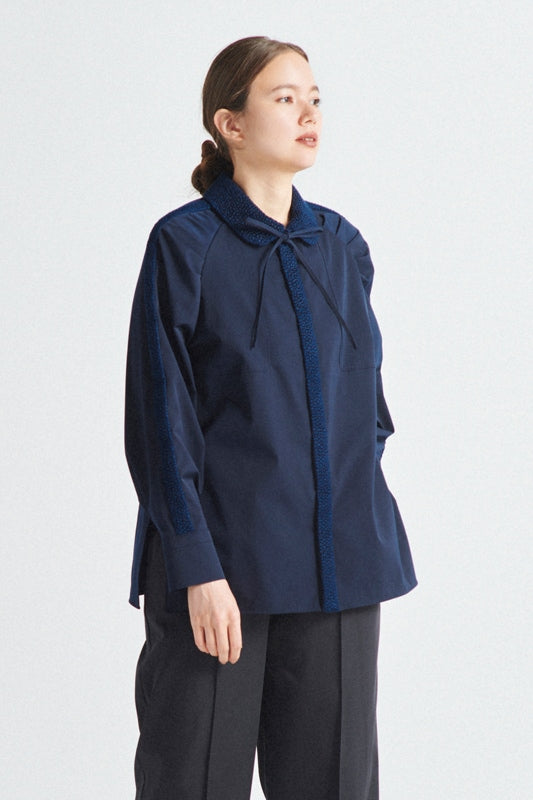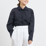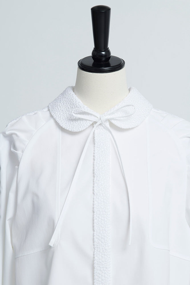ラグラン袖にはタックを入れたラインが構築的でモードな印象です。伸縮性がありハリとしなやかな風合いのある繊細な表面感に仕上げた素材を使用しています。コンパクトな丸衿下には取り外し可能なリボンが付いています。両サイドには深めのスリットを入れて軽快な印象に。タックを施した立体的なスリーブや、バックの切り替えデザインのバランスにも拘りました。yoriオリジナル貝釦を使用しています。ピュアなホワイトとシックなネイビーの2色展開です。