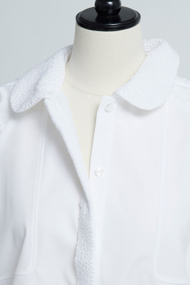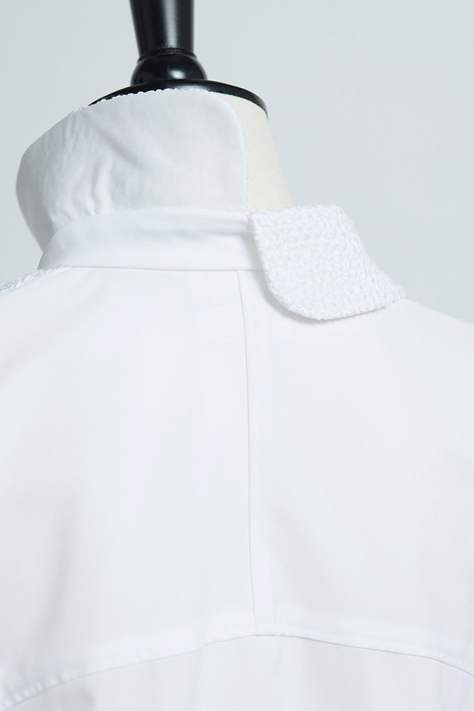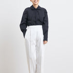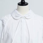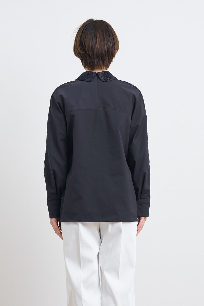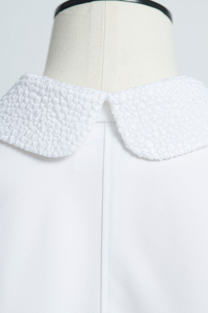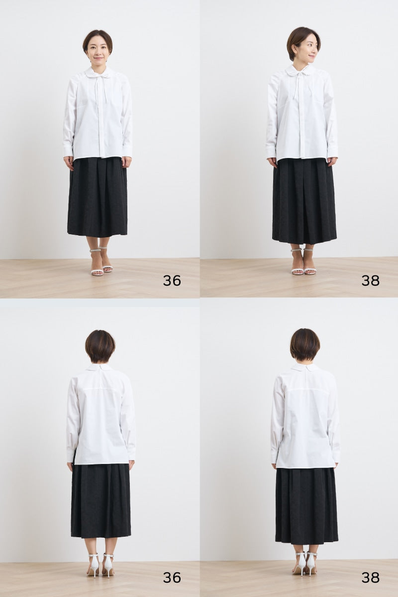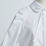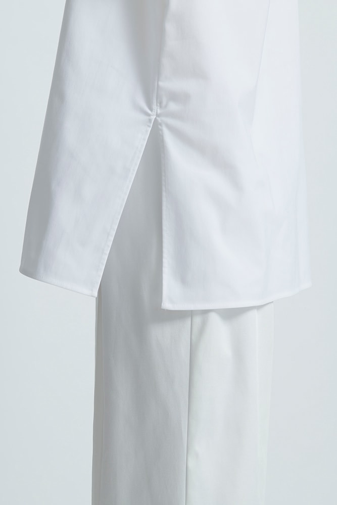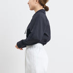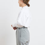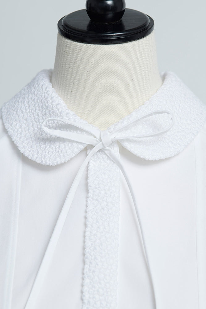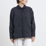 ラグラン袖にはタックを入れたラインが構築的でモードな印象です。伸縮性がありハリとしなやかな風合いのある繊細な表面感に仕上げた素材を使用しています。コンパクトな丸衿下には取り外し可能なリボンが付いています。両サイドには深めのスリットを入れて軽快な印象に。タックを施した立体的なスリーブや、バックの切り替えデザインのバランスにも拘りました。yoriオリジナル貝釦を使用しています。ピュアなホワイトとシックなネイビーの2色展開です。