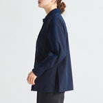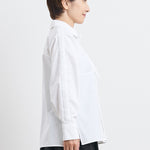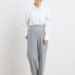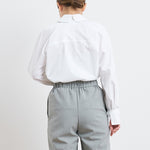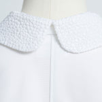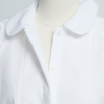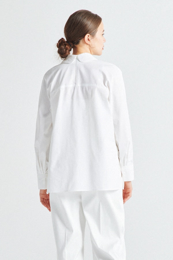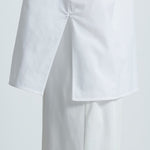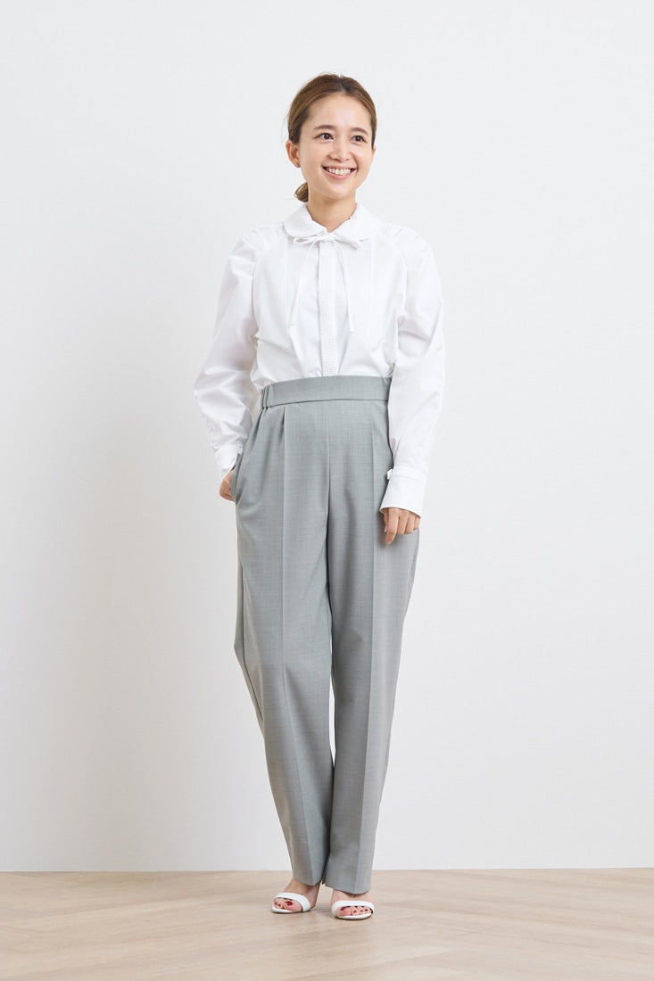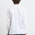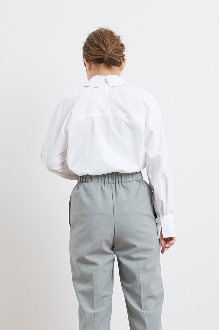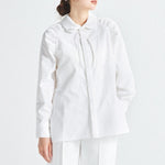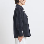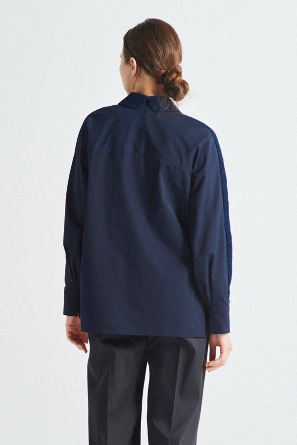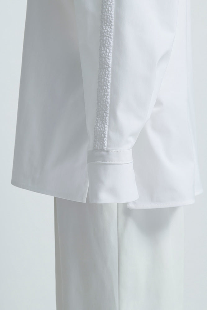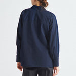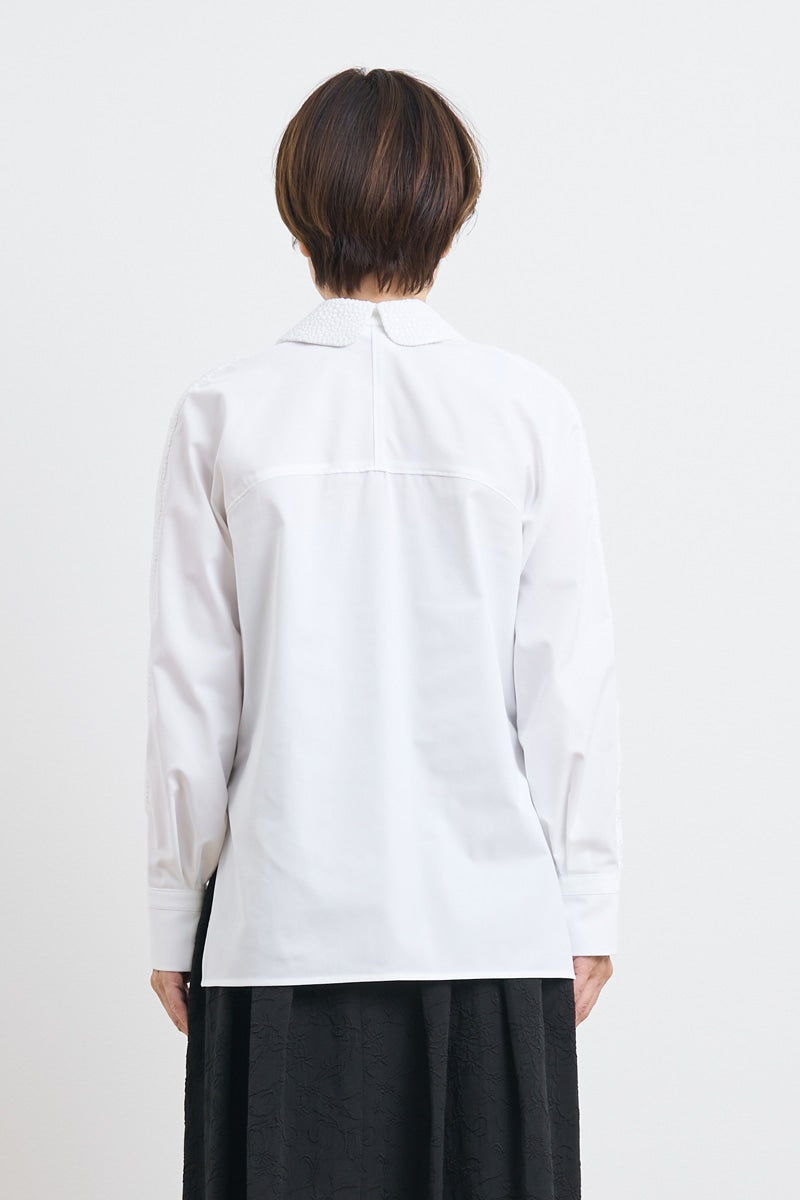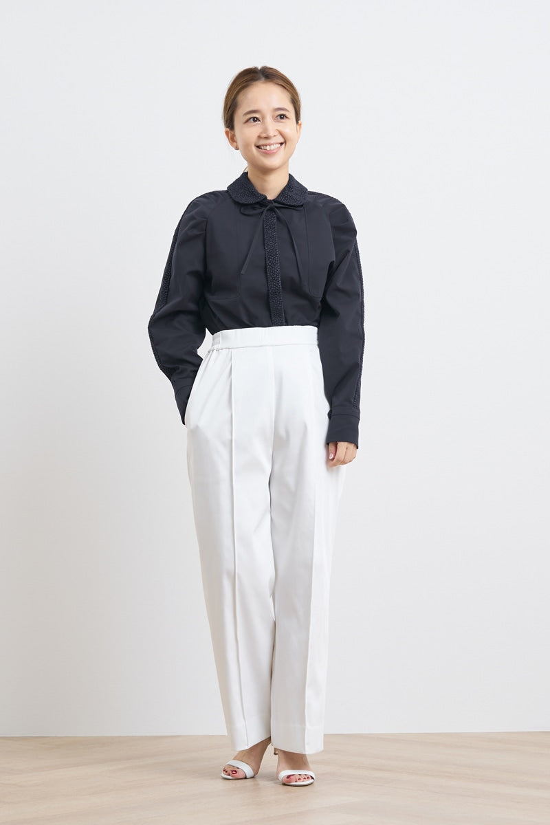 ラグラン袖にはタックを入れたラインが構築的でモードな印象です。伸縮性がありハリとしなやかな風合いのある繊細な表面感に仕上げた素材を使用しています。コンパクトな丸衿下には取り外し可能なリボンが付いています。両サイドには深めのスリットを入れて軽快な印象に。タックを施した立体的なスリーブや、バックの切り替えデザインのバランスにも拘りました。yoriオリジナル貝釦を使用しています。ピュアなホワイトとシックなネイビーの2色展開です。