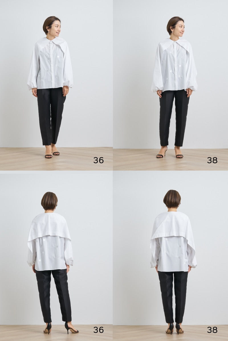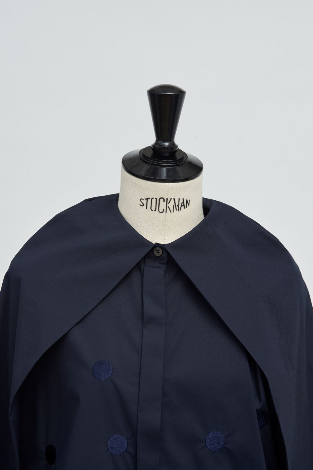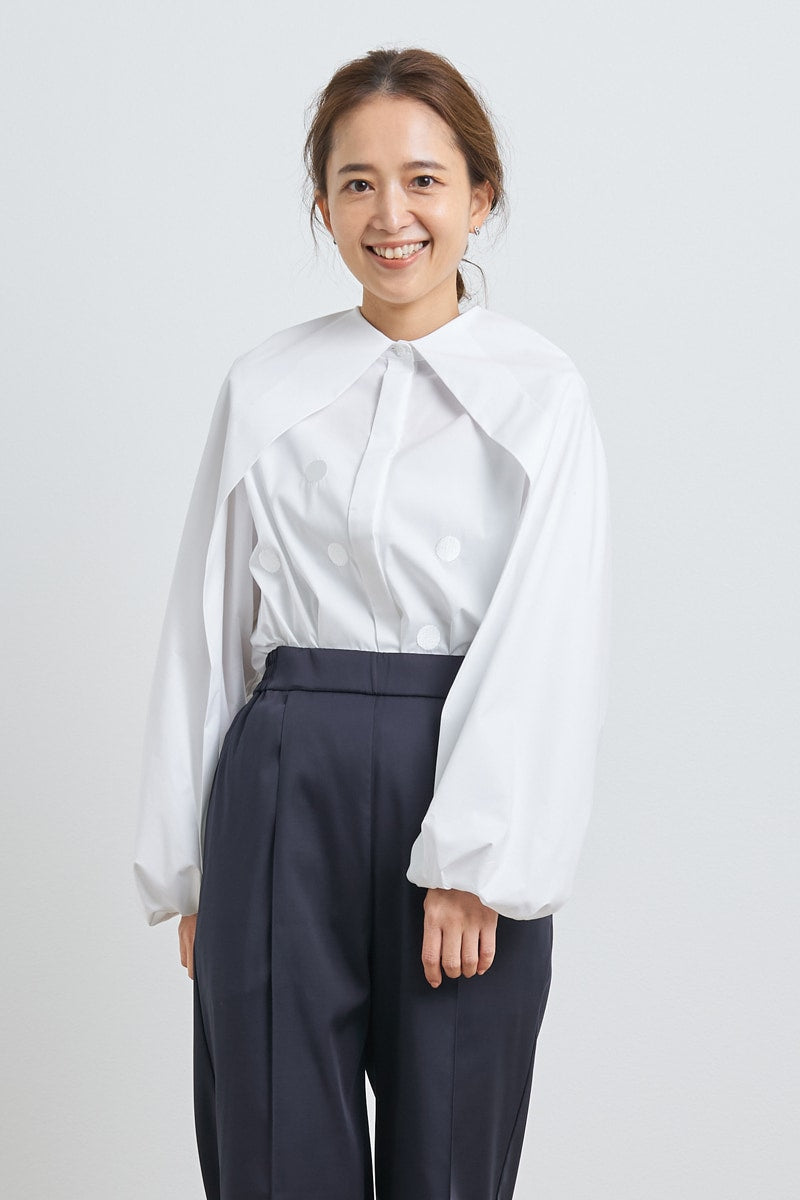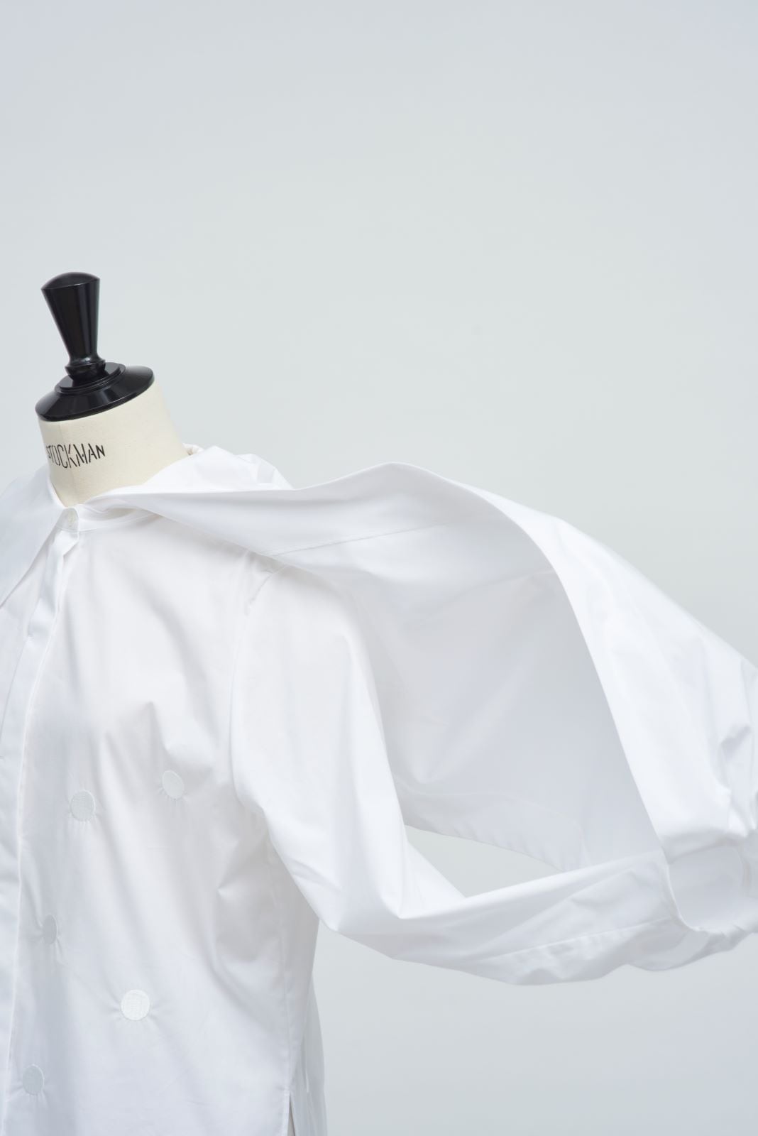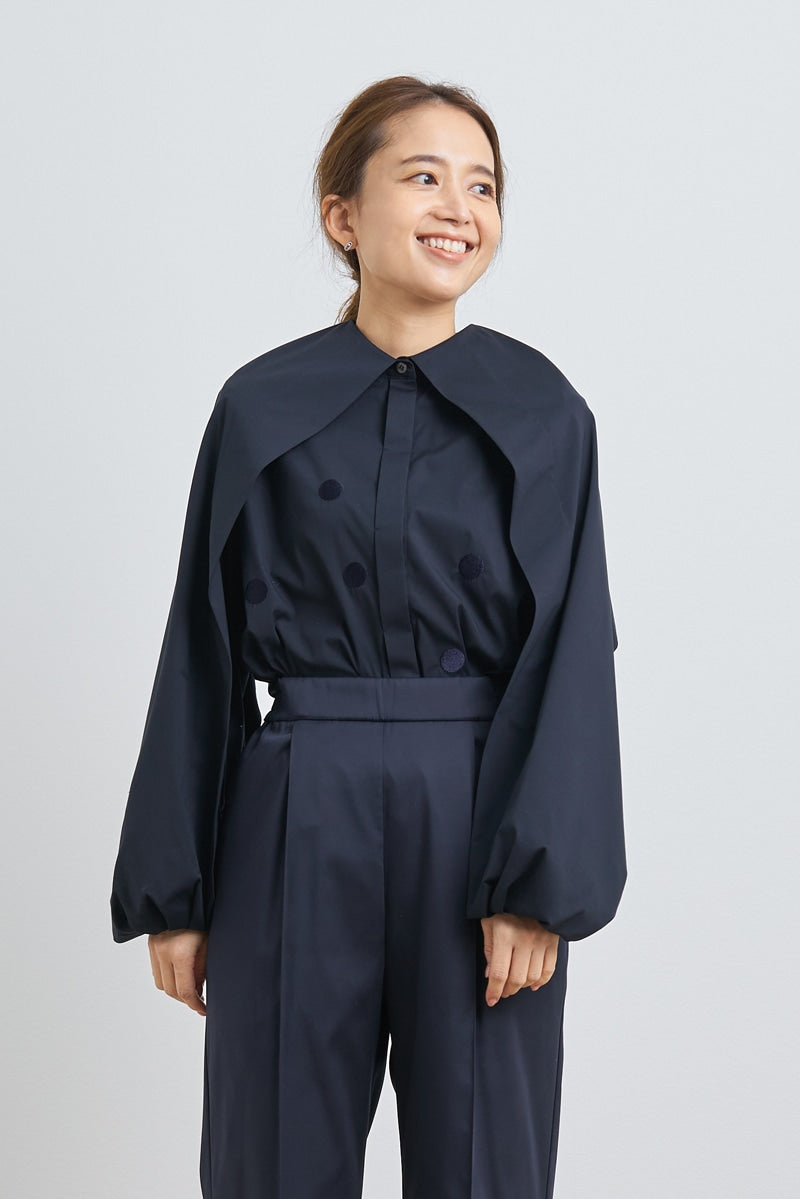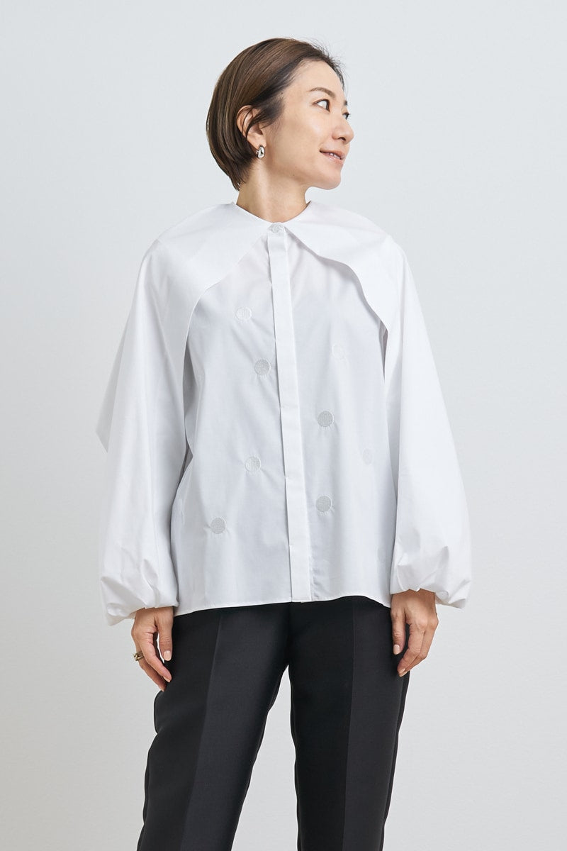 マントを羽織っている様な立体的なシルエットが特徴的なブラウスです。特殊なミシンでドットを刺繍し立体的なラインを表現した繊細で上品なブラウスです。コンパクトなネックとボリュームスリーブのデザインがクラシカルかつエレガントな雰囲気です。伸縮性があり軽さとほど良いハリとしなやかな風合いのある素材を使用しています。