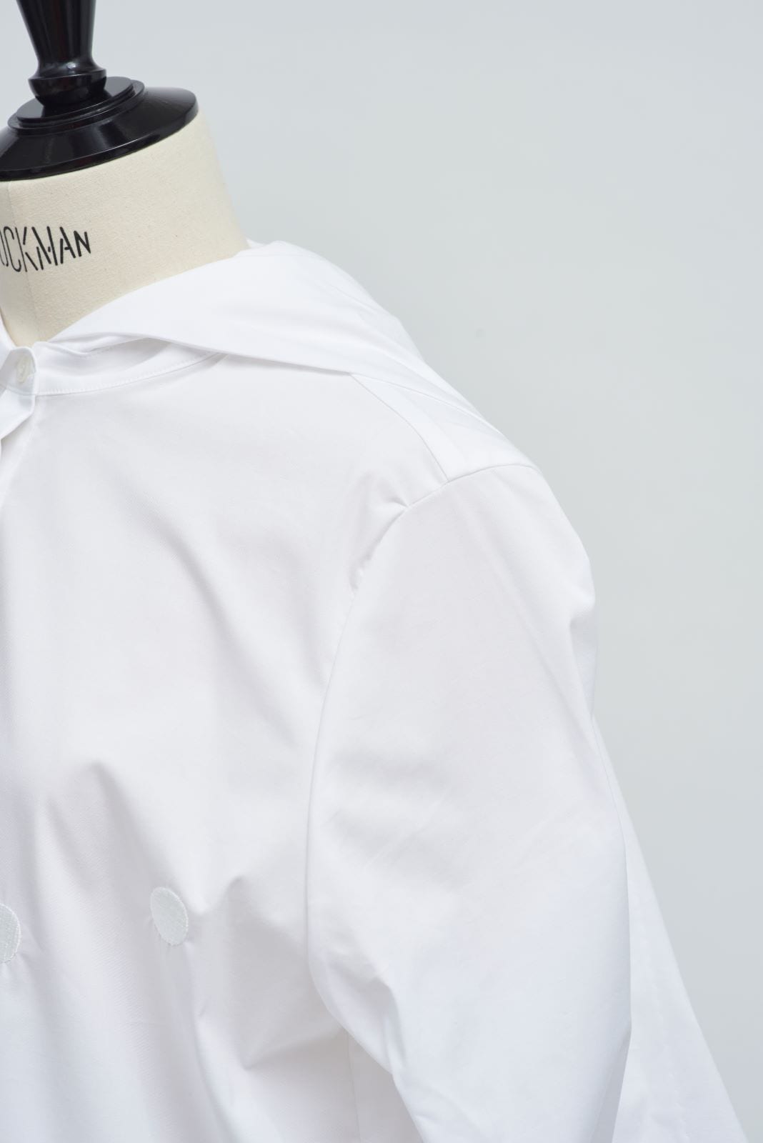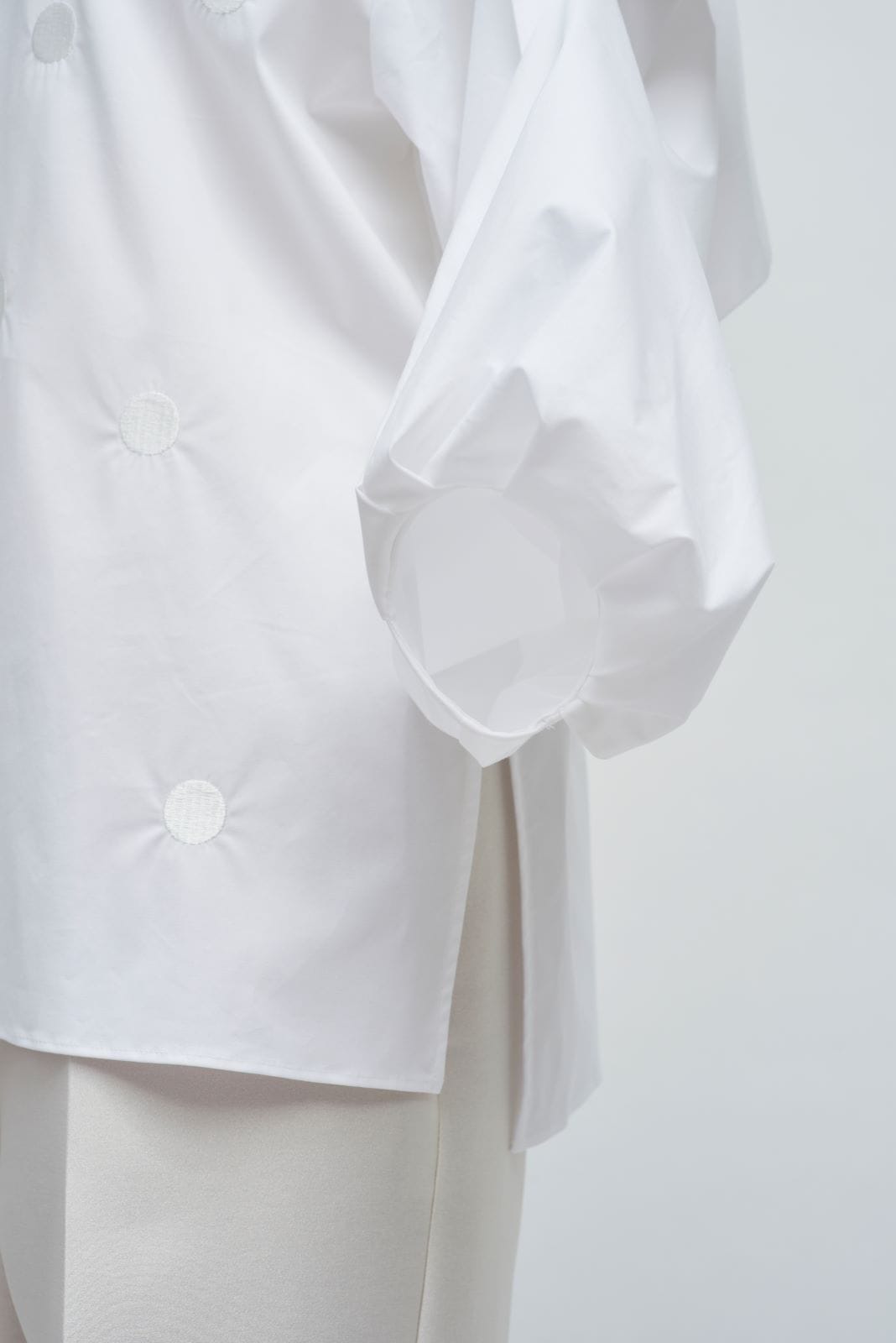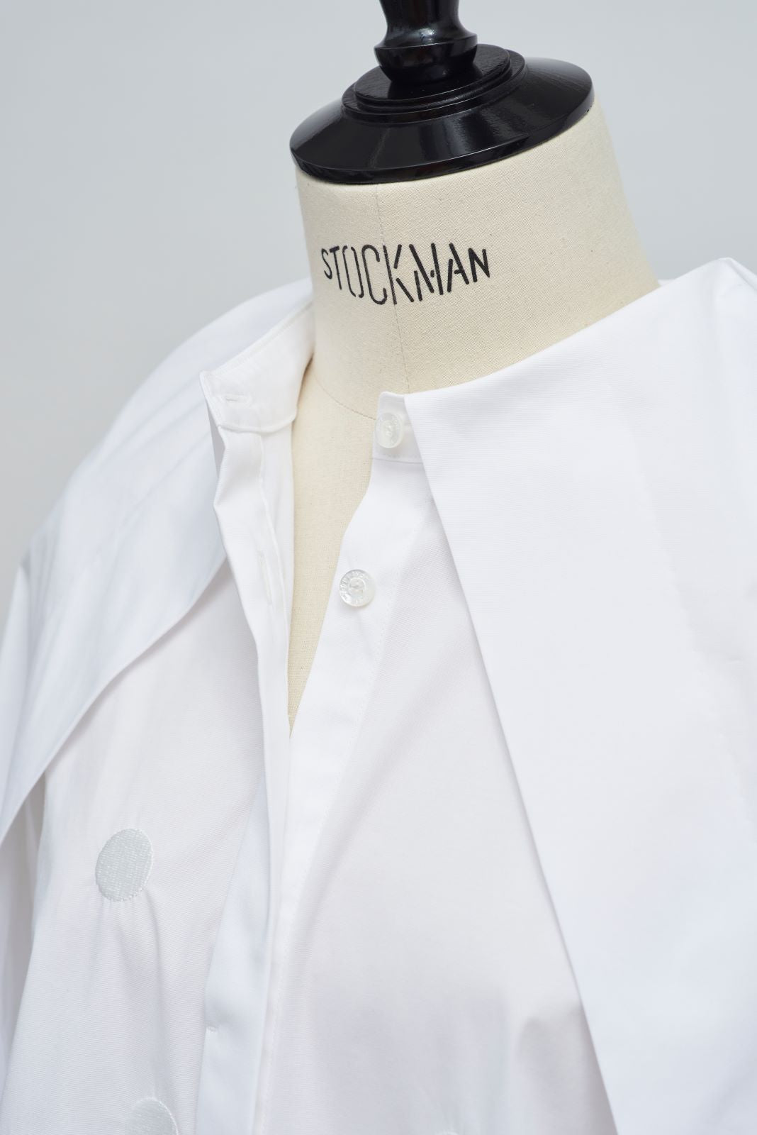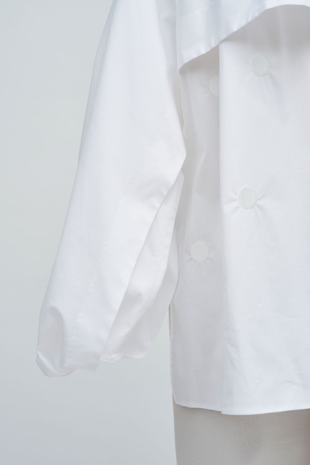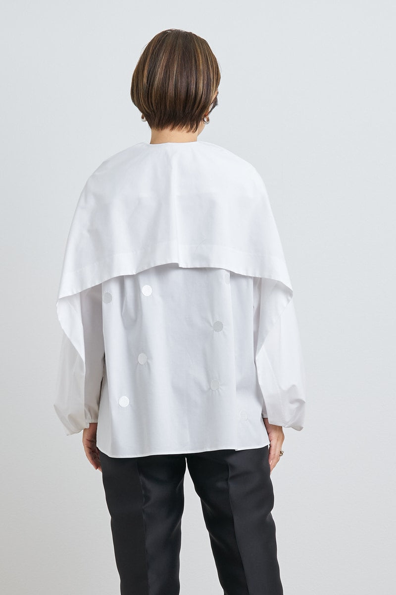 マントを羽織っている様な立体的なシルエットが特徴的なブラウスです。特殊なミシンでドットを刺繍し立体的なラインを表現した繊細で上品なブラウスです。コンパクトなネックとボリュームスリーブのデザインがクラシカルかつエレガントな雰囲気です。伸縮性があり軽さとほど良いハリとしなやかな風合いのある素材を使用しています。