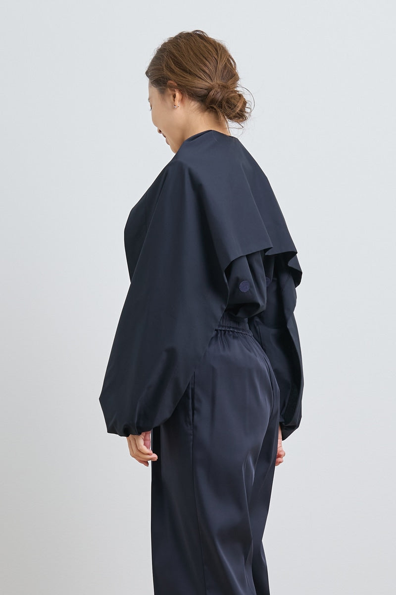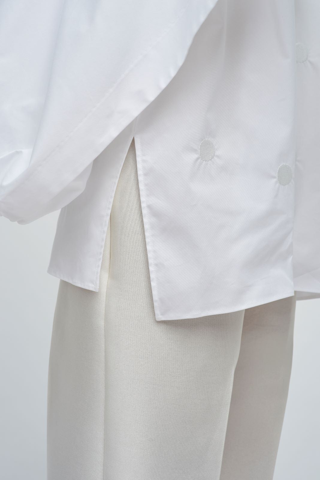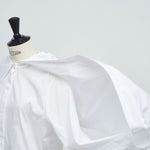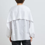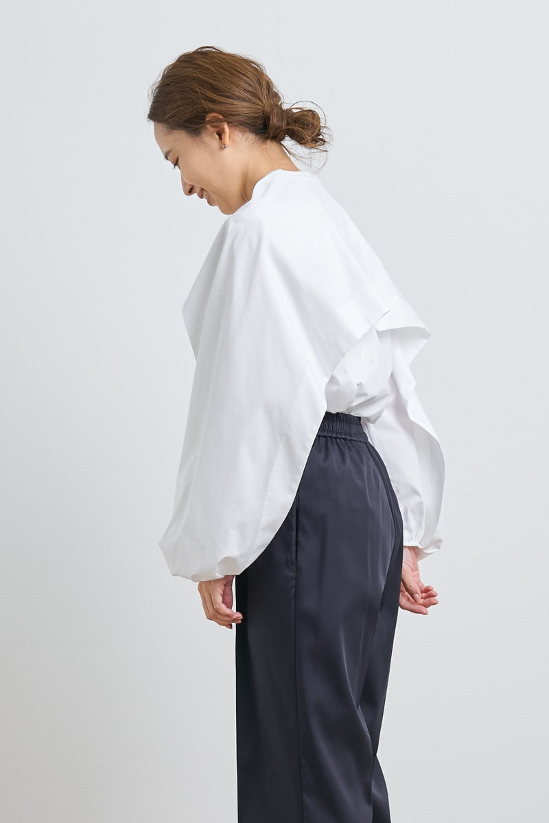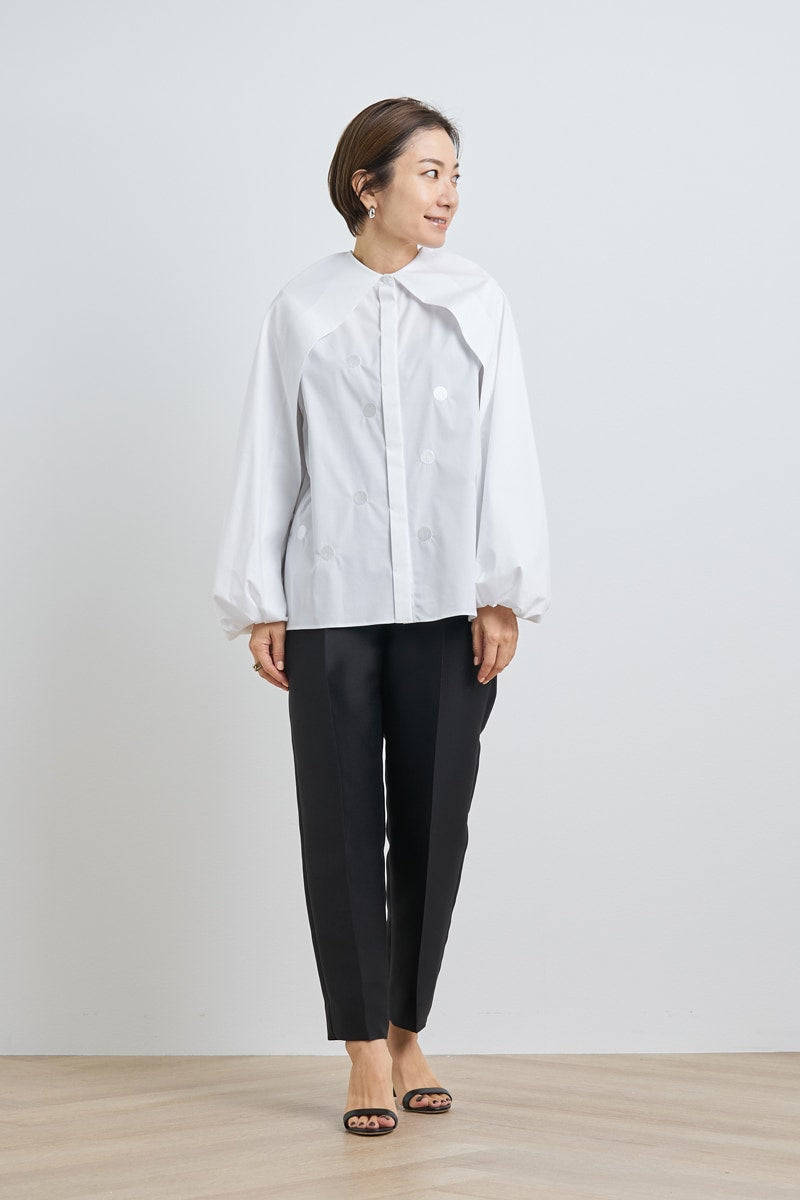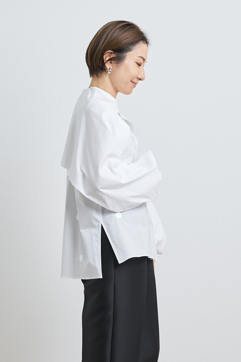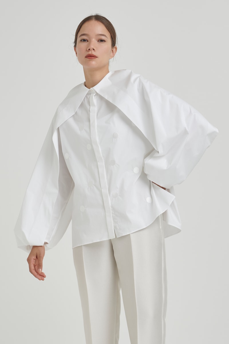 マントを羽織っている様な立体的なシルエットが特徴的なブラウスです。特殊なミシンでドットを刺繍し立体的なラインを表現した繊細で上品なブラウスです。コンパクトなネックとボリュームスリーブのデザインがクラシカルかつエレガントな雰囲気です。伸縮性があり軽さとほど良いハリとしなやかな風合いのある素材を使用しています。