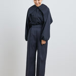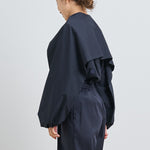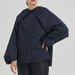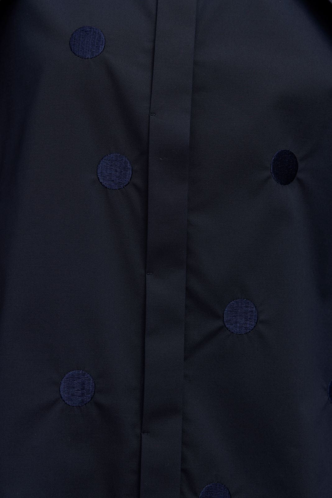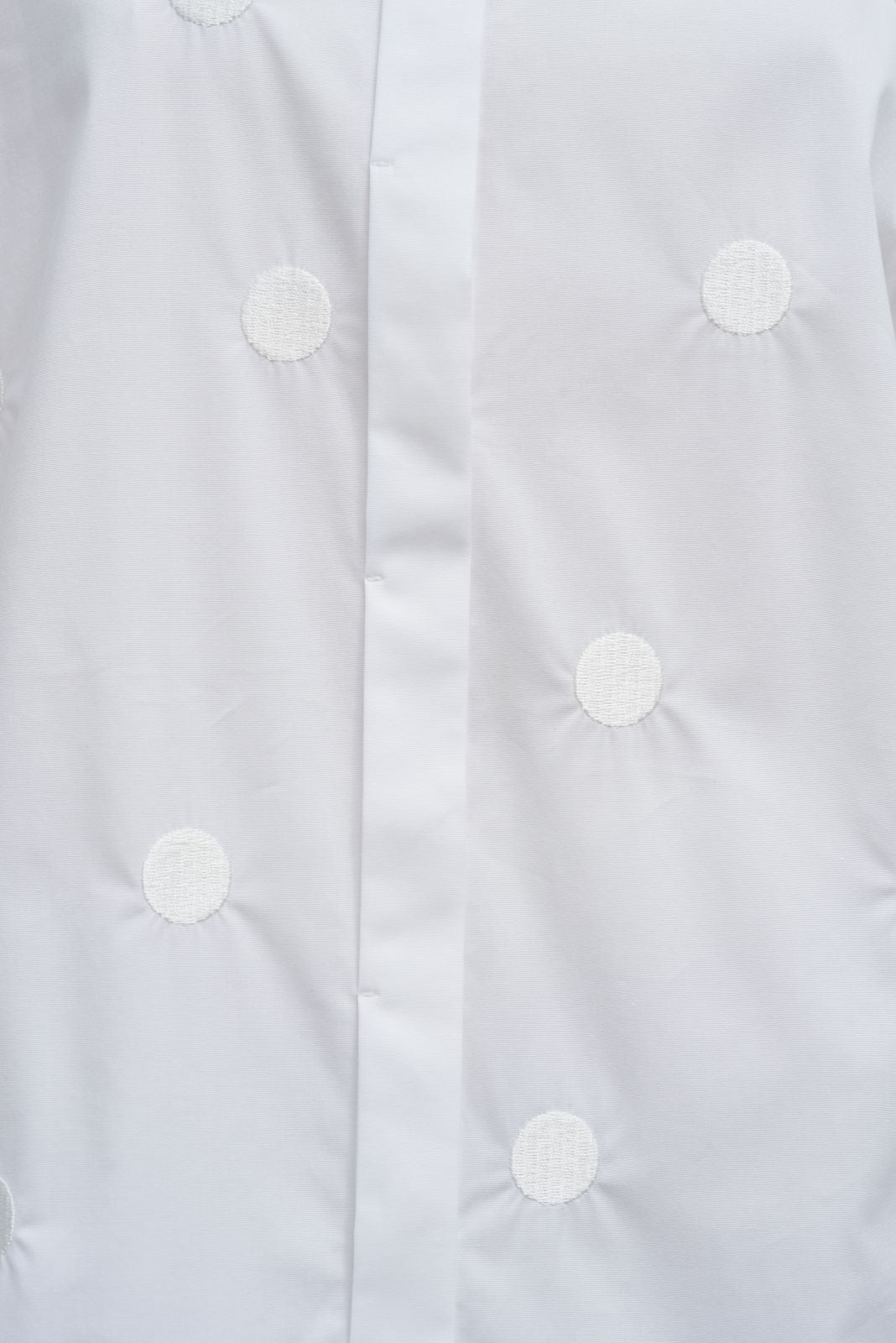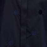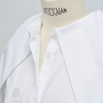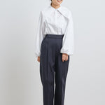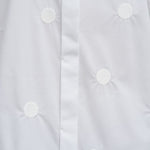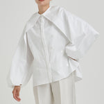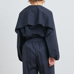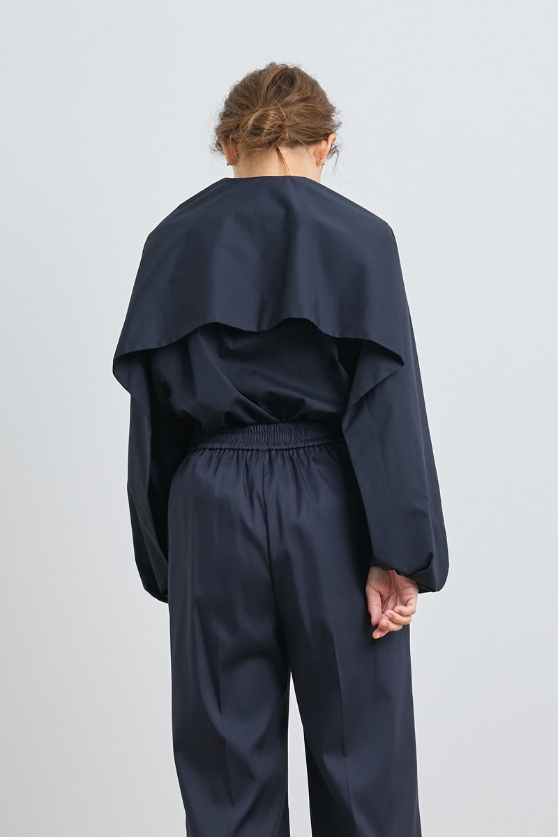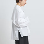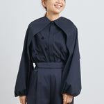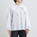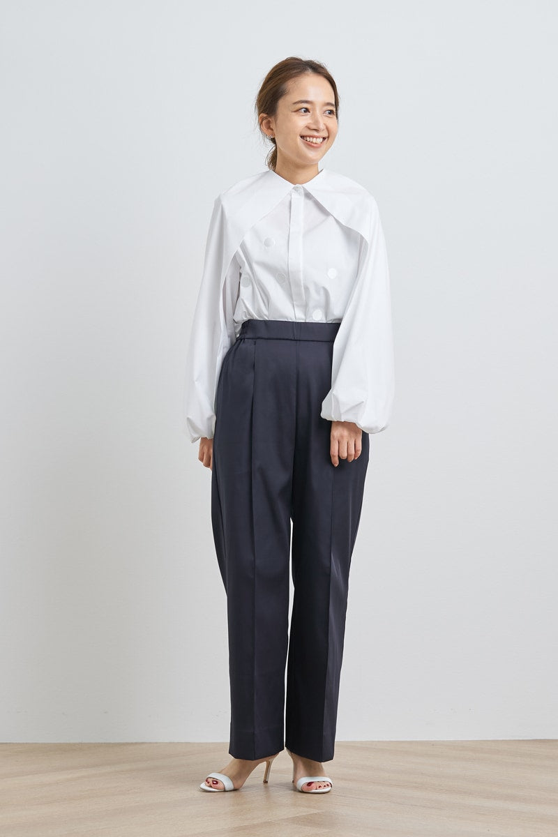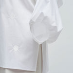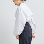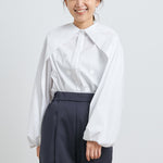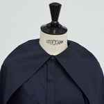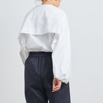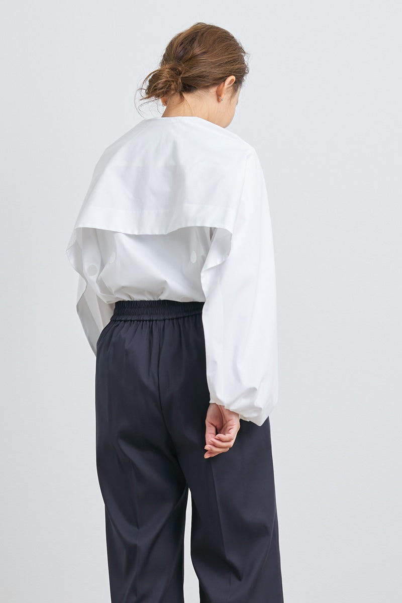 マントを羽織っている様な立体的なシルエットが特徴的なブラウスです。特殊なミシンでドットを刺繍し立体的なラインを表現した繊細で上品なブラウスです。コンパクトなネックとボリュームスリーブのデザインがクラシカルかつエレガントな雰囲気です。伸縮性があり軽さとほど良いハリとしなやかな風合いのある素材を使用しています。