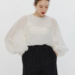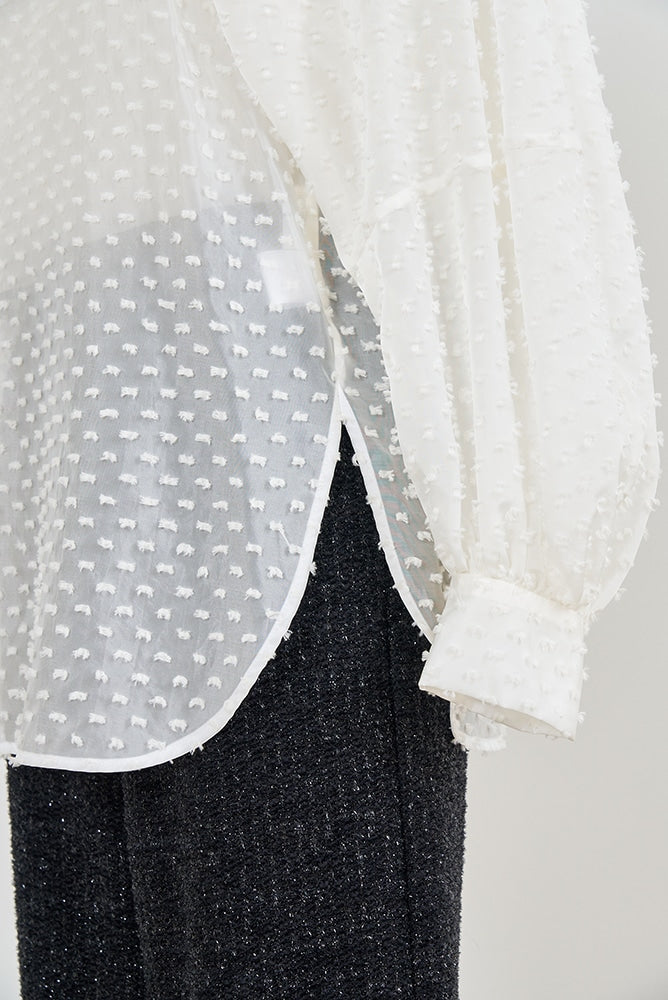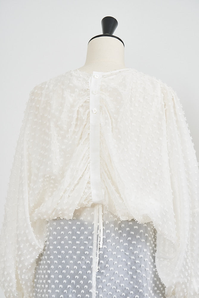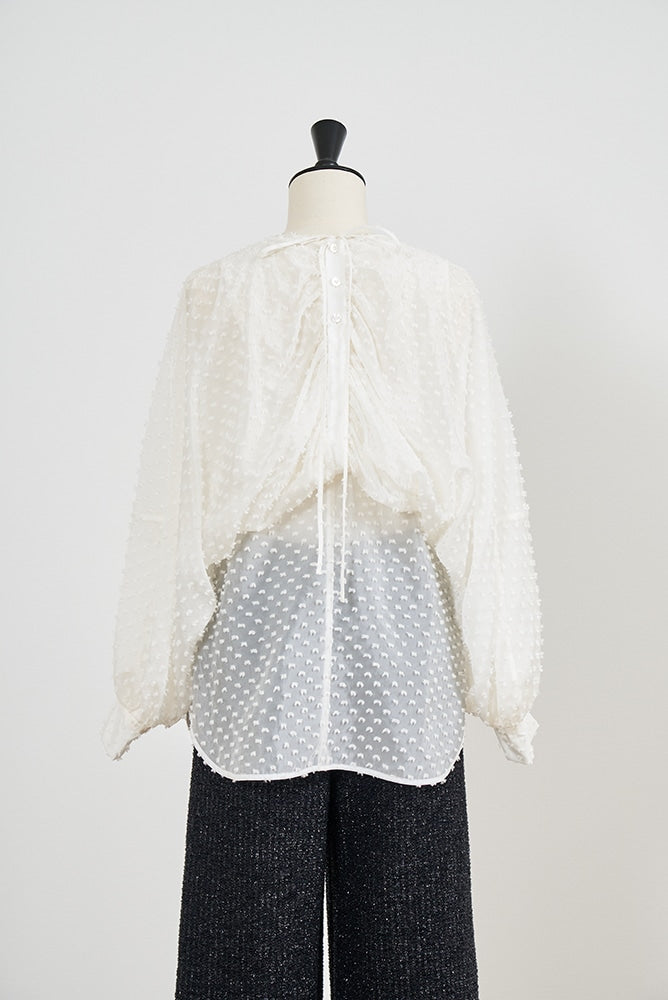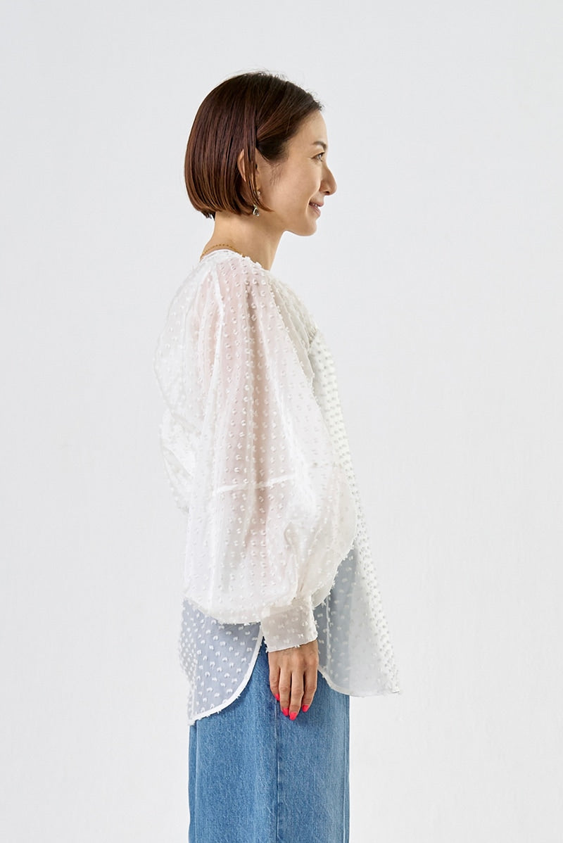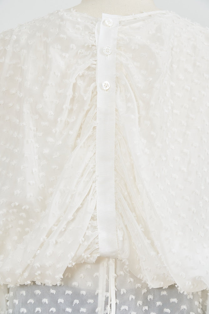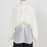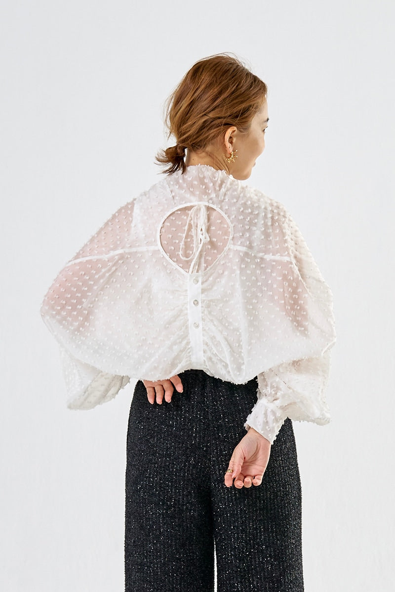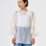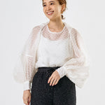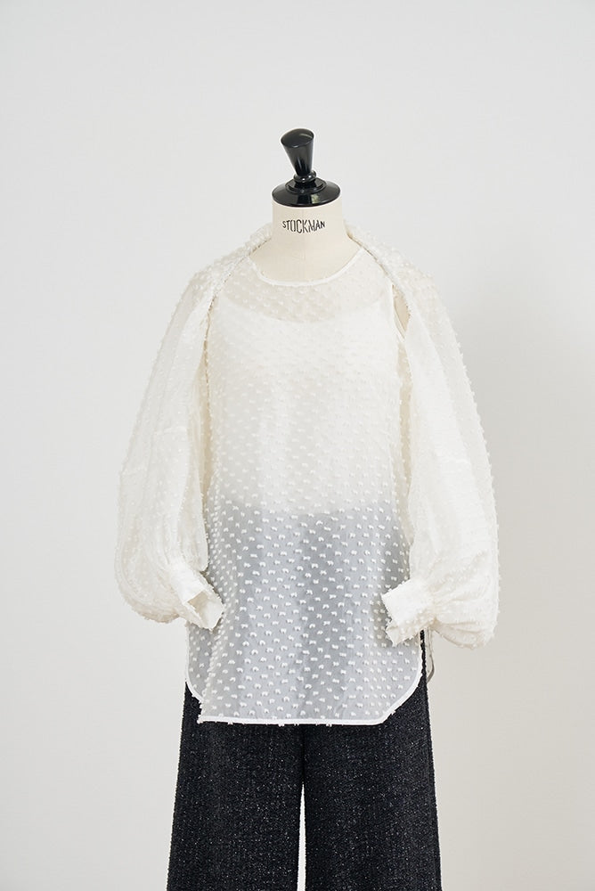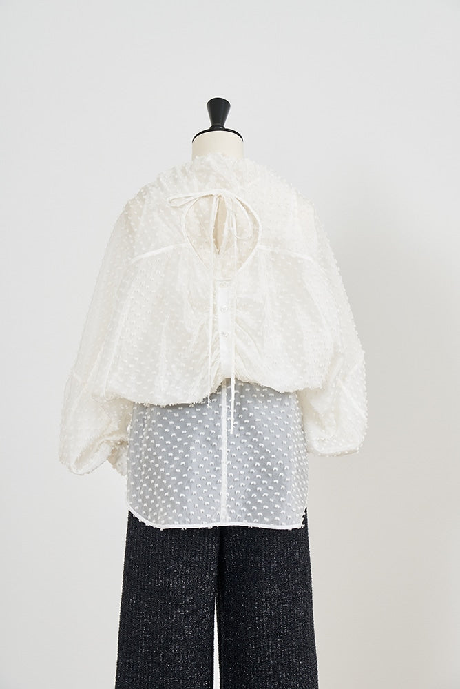 チラチラとしたドット調の雪を散りばめたような透け感のあるジャカード素材のノースリーブ。ボレロは同素材の空気を含んだエアリーさと、ふんわりと優しい着用感も魅力です。shirocon オリジナル日本産生地になります。ボレロのバックはたっぷりとギャザーを寄せたバルーンラインにボリュームスリーブでフェミニンな印象に。カフスで全体を引き締めて華奢な印象にしています。ノースリーブは長めの丈感ながらサイドスリットやラウンドヘムで軽やかな抜け感をプラス。バックの長めのリボンもポイントです。ハイネックニットやシャツはもちろん、シンプルなカットソーやTシャツなど、インナー次第で長い季節で着用いただけます。スタイリングに軽やかな雰囲気のあるアイテムです。