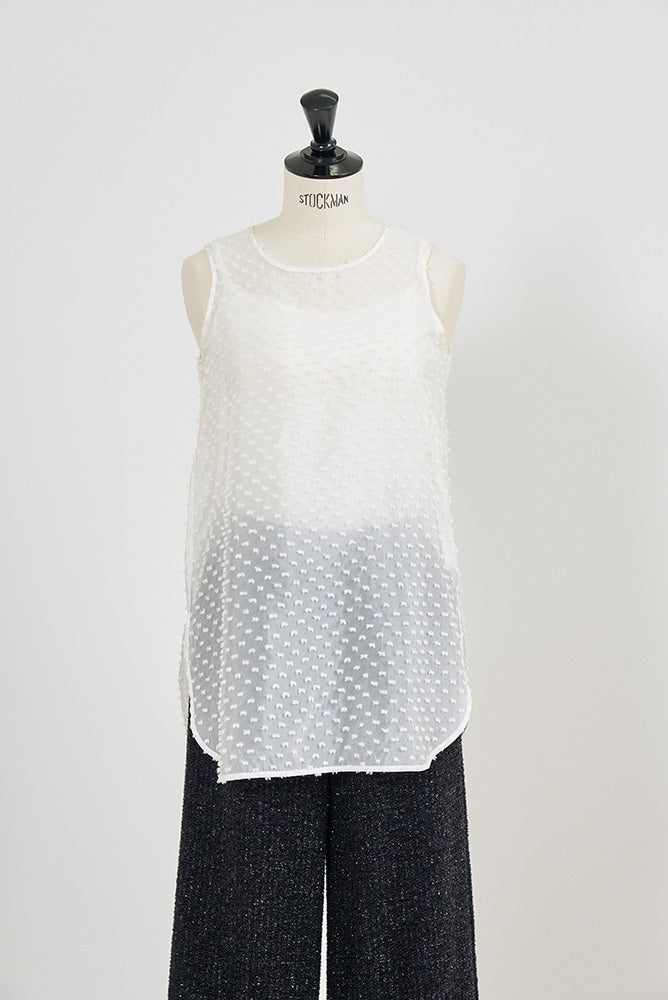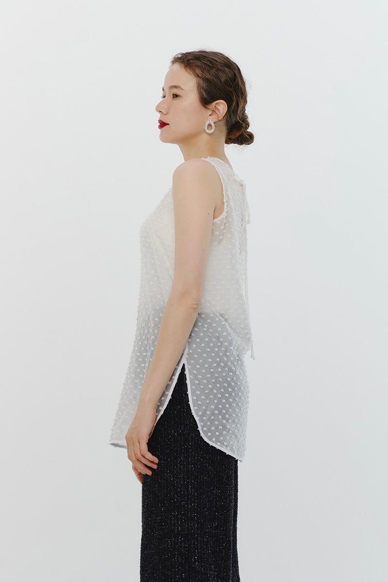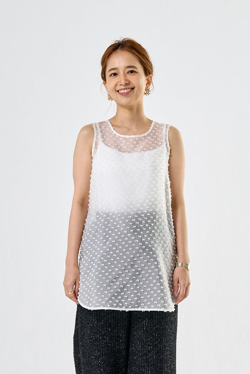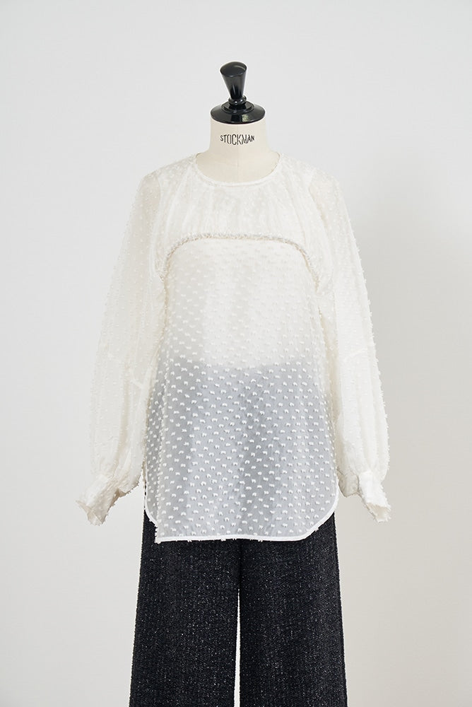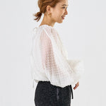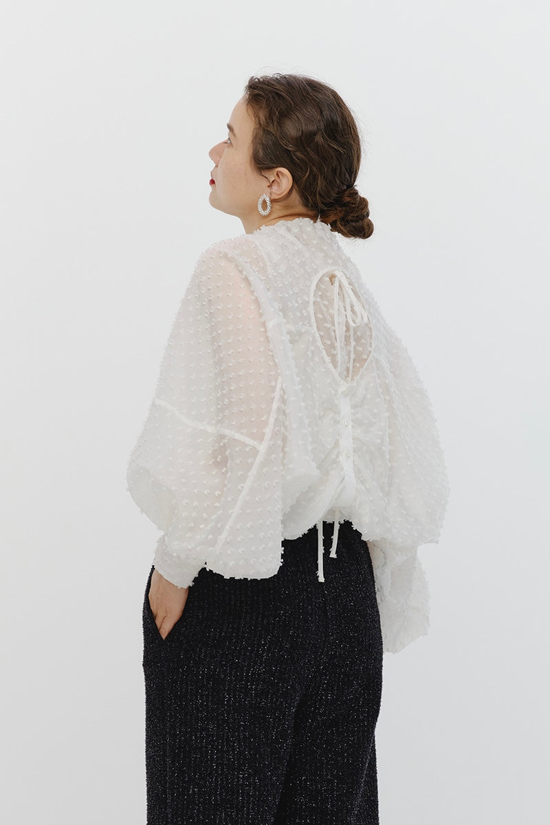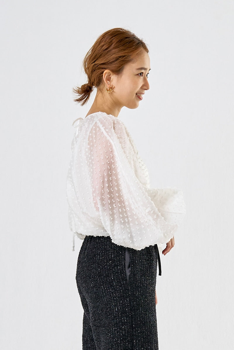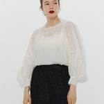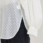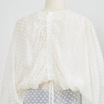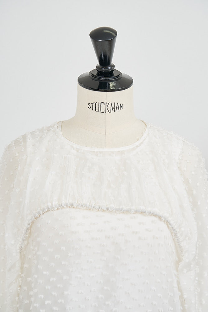 チラチラとしたドット調の雪を散りばめたような透け感のあるジャカード素材のノースリーブ。ボレロは同素材の空気を含んだエアリーさと、ふんわりと優しい着用感も魅力です。shirocon オリジナル日本産生地になります。ボレロのバックはたっぷりとギャザーを寄せたバルーンラインにボリュームスリーブでフェミニンな印象に。カフスで全体を引き締めて華奢な印象にしています。ノースリーブは長めの丈感ながらサイドスリットやラウンドヘムで軽やかな抜け感をプラス。バックの長めのリボンもポイントです。ハイネックニットやシャツはもちろん、シンプルなカットソーやTシャツなど、インナー次第で長い季節で着用いただけます。スタイリングに軽やかな雰囲気のあるアイテムです。