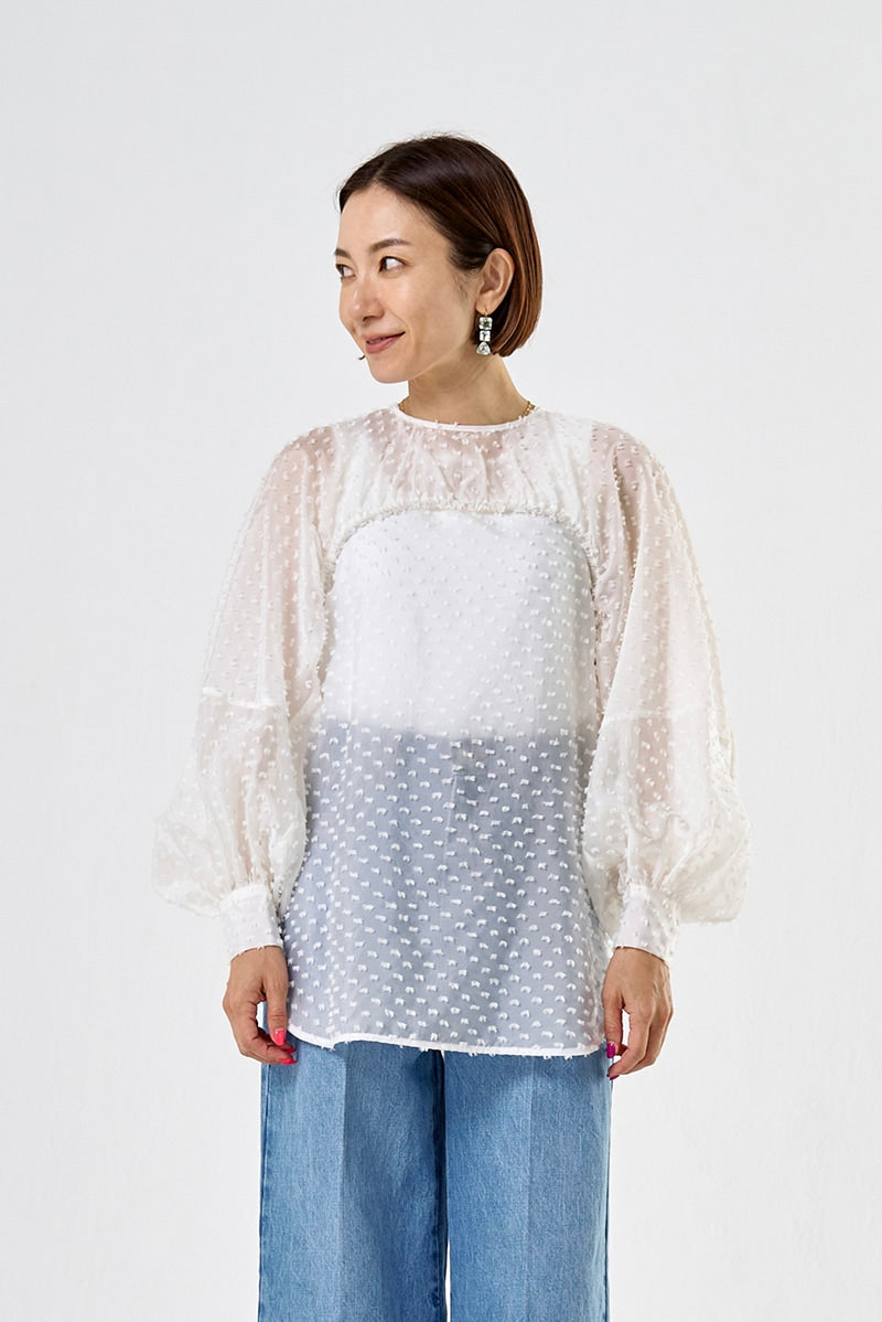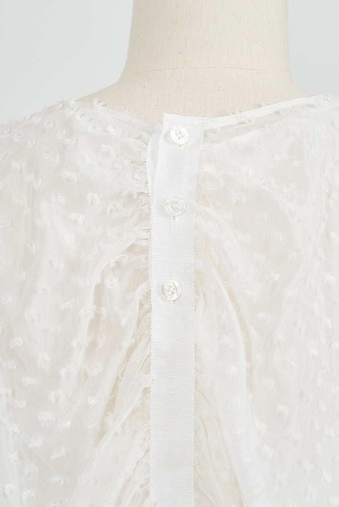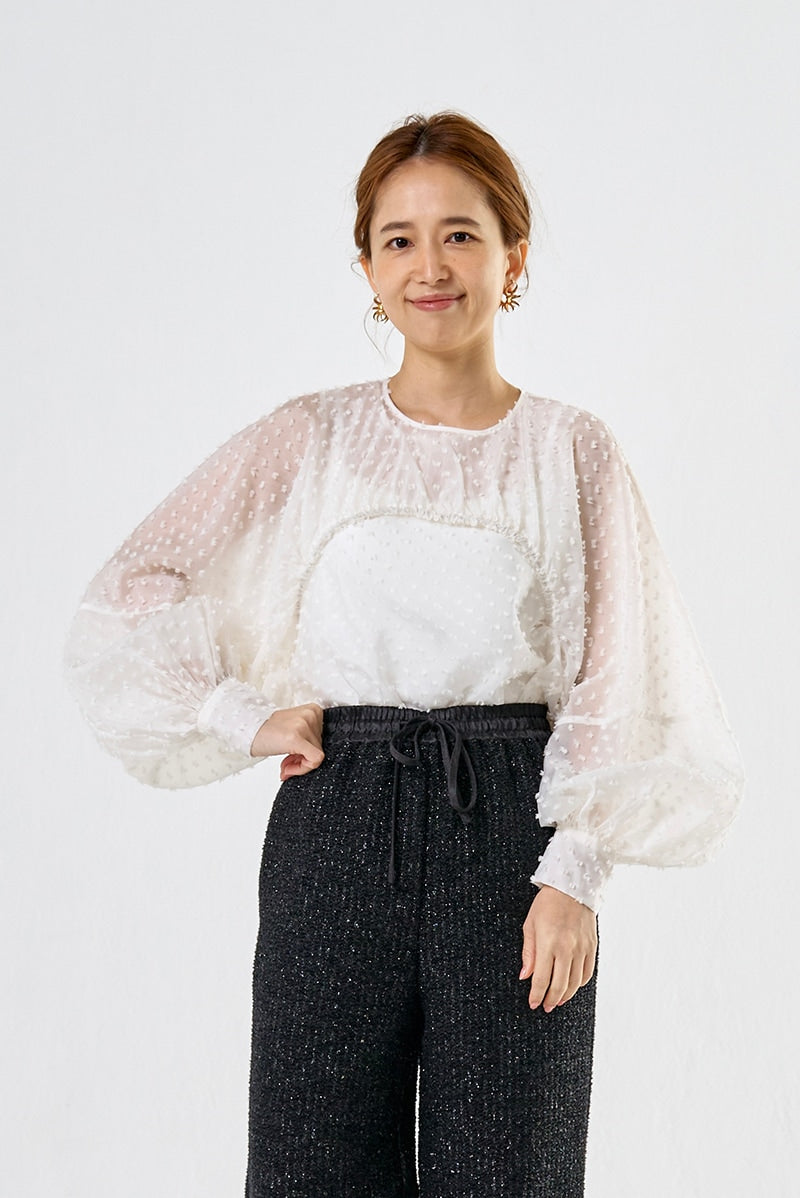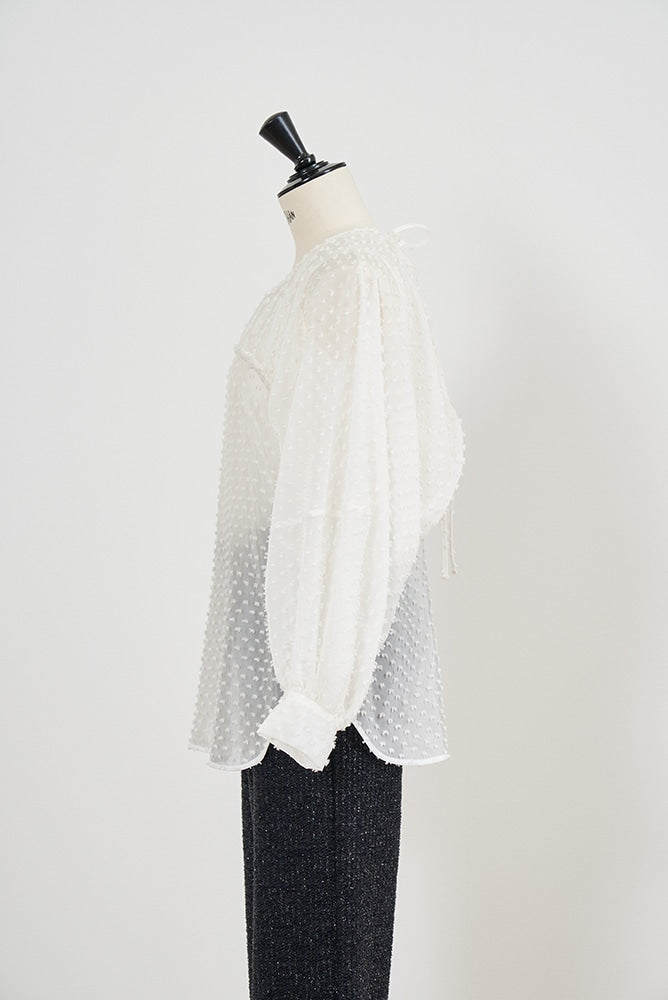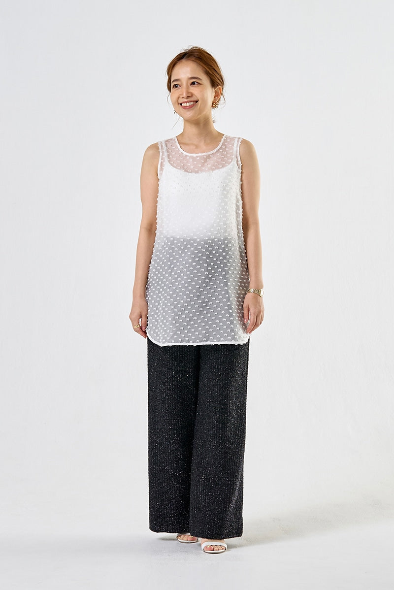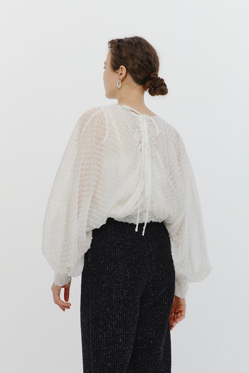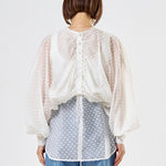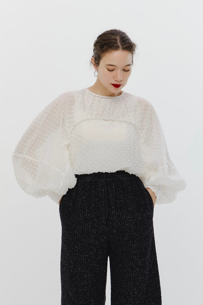 チラチラとしたドット調の雪を散りばめたような透け感のあるジャカード素材のノースリーブ。ボレロは同素材の空気を含んだエアリーさと、ふんわりと優しい着用感も魅力です。shirocon オリジナル日本産生地になります。ボレロのバックはたっぷりとギャザーを寄せたバルーンラインにボリュームスリーブでフェミニンな印象に。カフスで全体を引き締めて華奢な印象にしています。ノースリーブは長めの丈感ながらサイドスリットやラウンドヘムで軽やかな抜け感をプラス。バックの長めのリボンもポイントです。ハイネックニットやシャツはもちろん、シンプルなカットソーやTシャツなど、インナー次第で長い季節で着用いただけます。スタイリングに軽やかな雰囲気のあるアイテムです。
