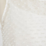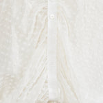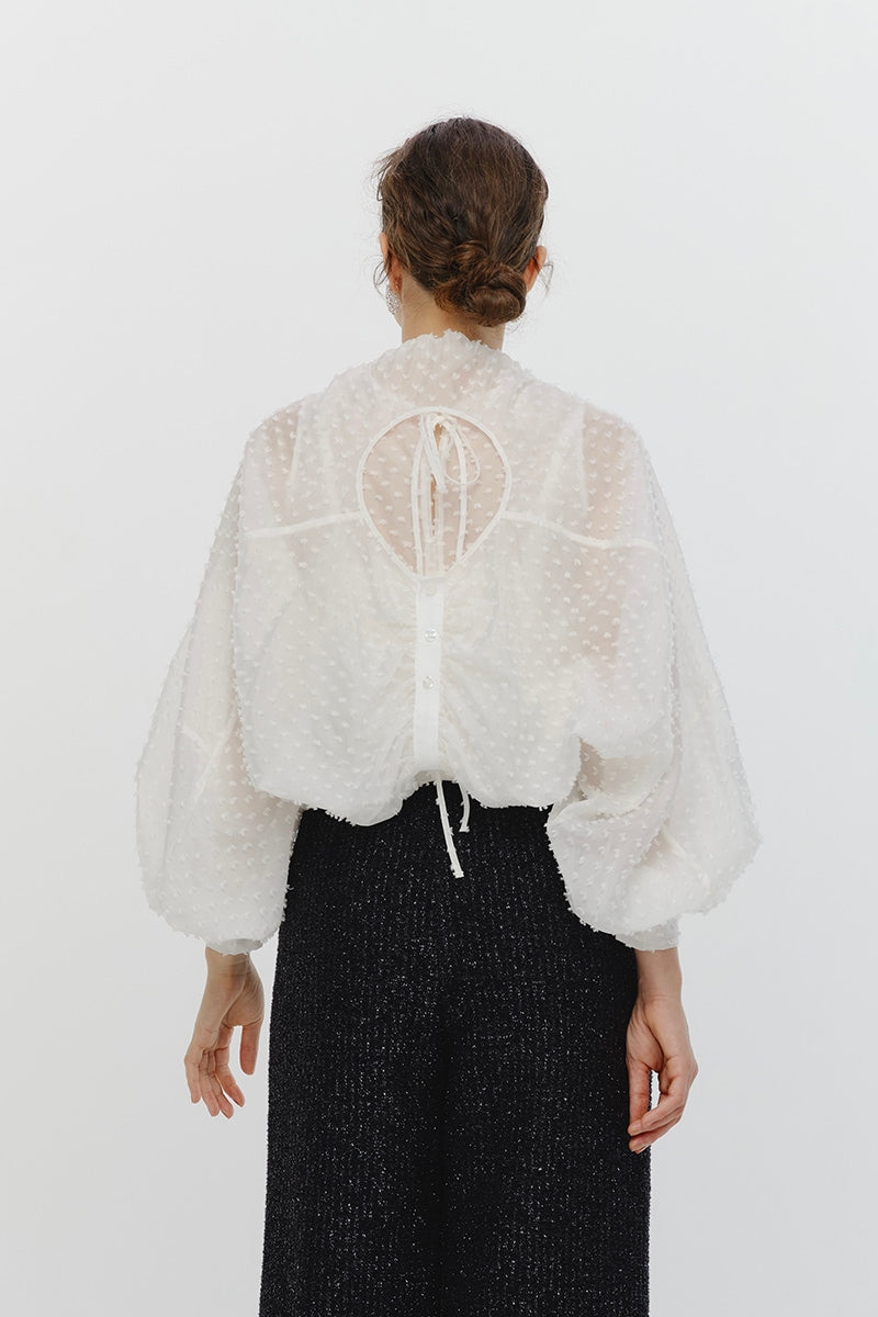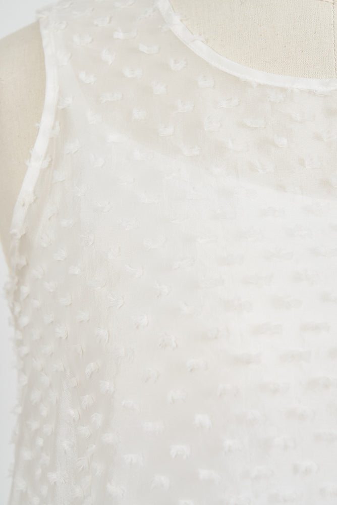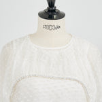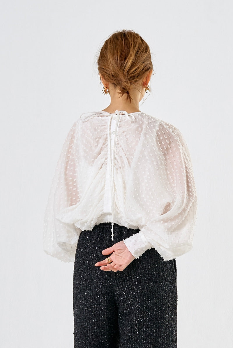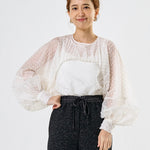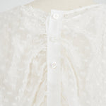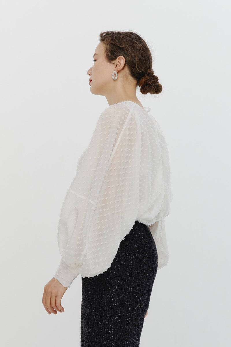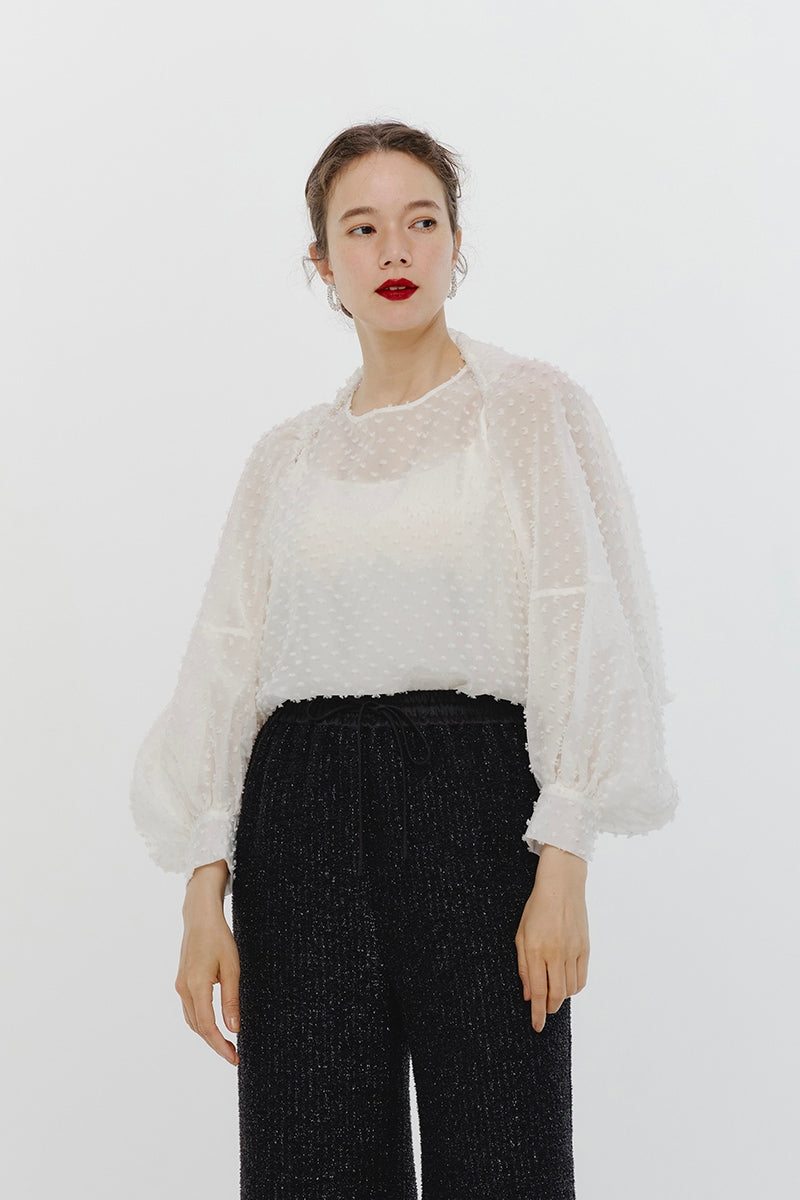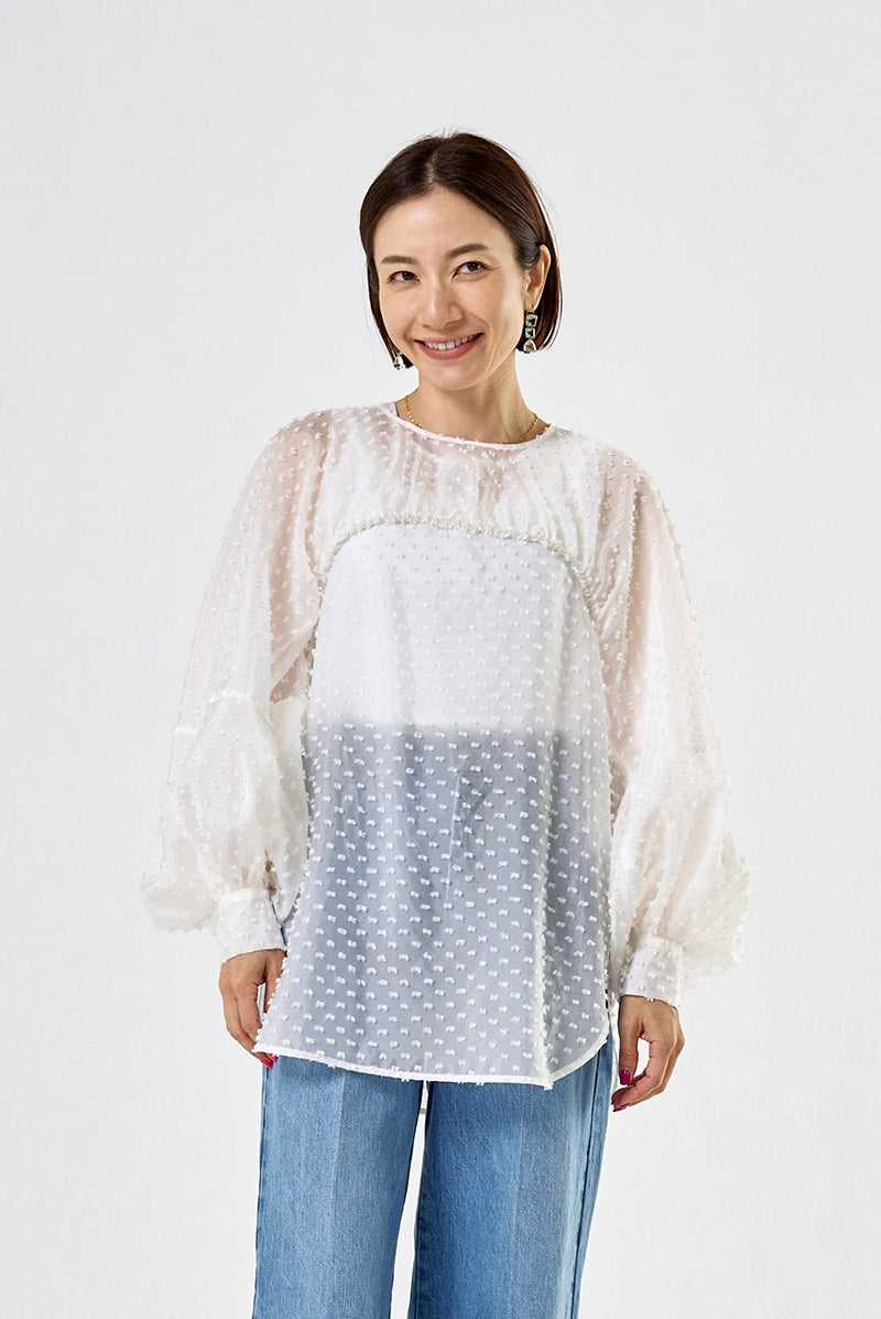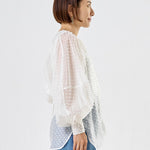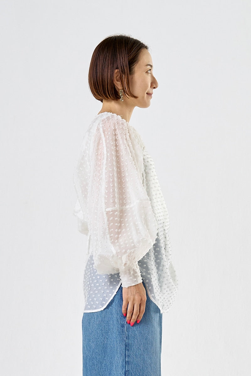 チラチラとしたドット調の雪を散りばめたような透け感のあるジャカード素材のノースリーブ。ボレロは同素材の空気を含んだエアリーさと、ふんわりと優しい着用感も魅力です。shirocon オリジナル日本産生地になります。ボレロのバックはたっぷりとギャザーを寄せたバルーンラインにボリュームスリーブでフェミニンな印象に。カフスで全体を引き締めて華奢な印象にしています。ノースリーブは長めの丈感ながらサイドスリットやラウンドヘムで軽やかな抜け感をプラス。バックの長めのリボンもポイントです。ハイネックニットやシャツはもちろん、シンプルなカットソーやTシャツなど、インナー次第で長い季節で着用いただけます。スタイリングに軽やかな雰囲気のあるアイテムです。