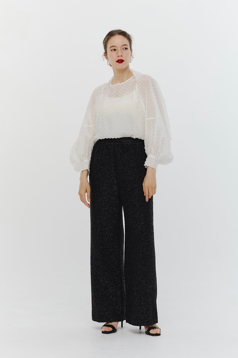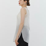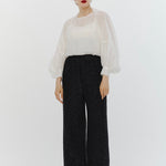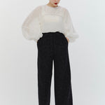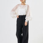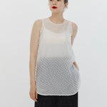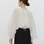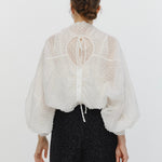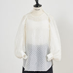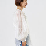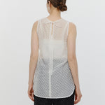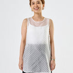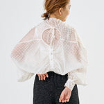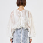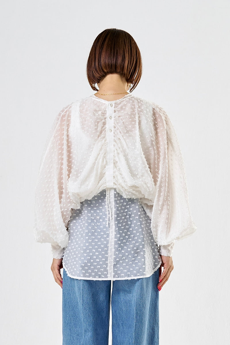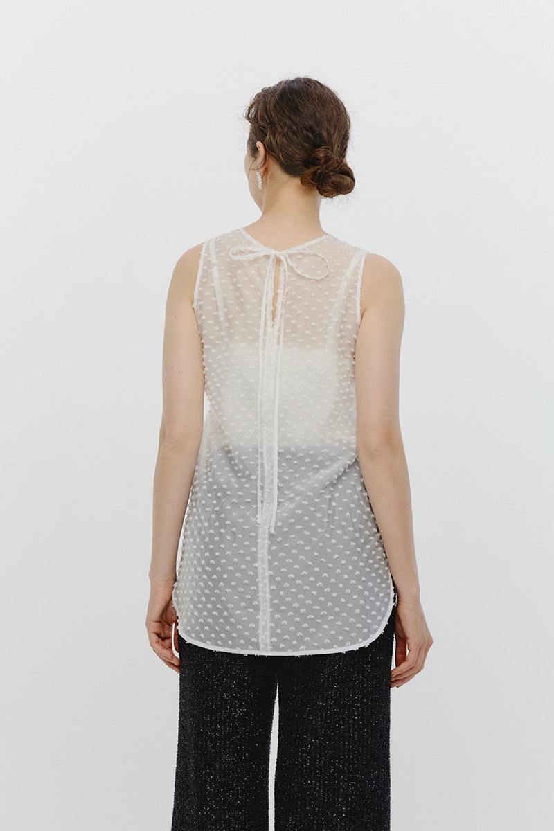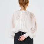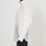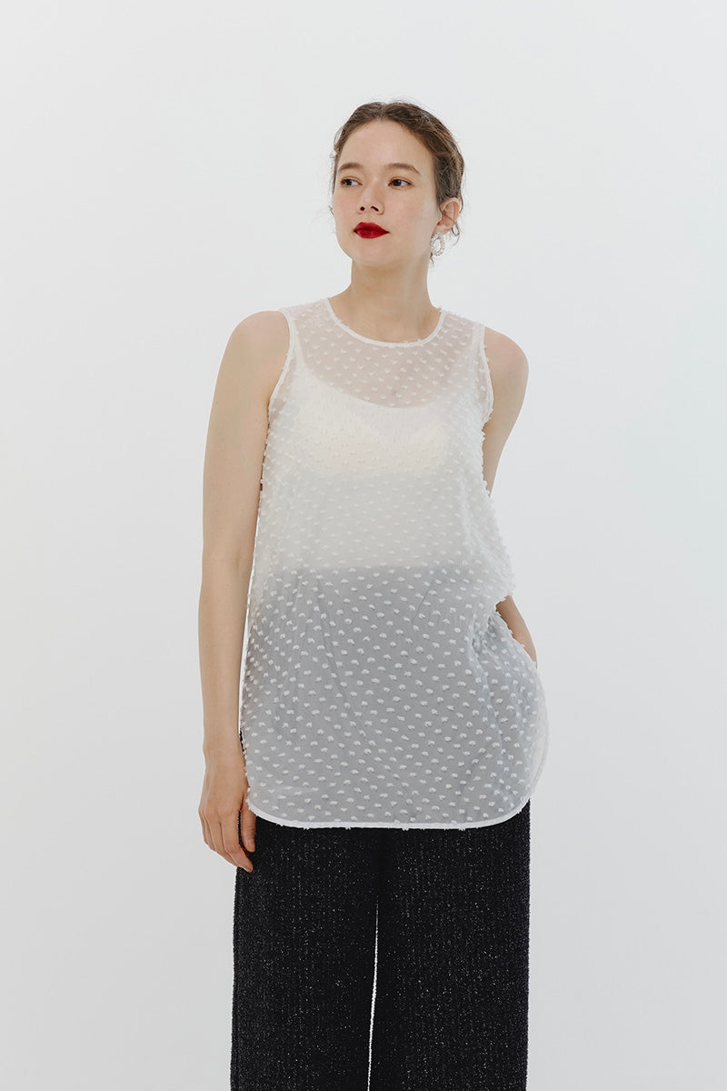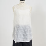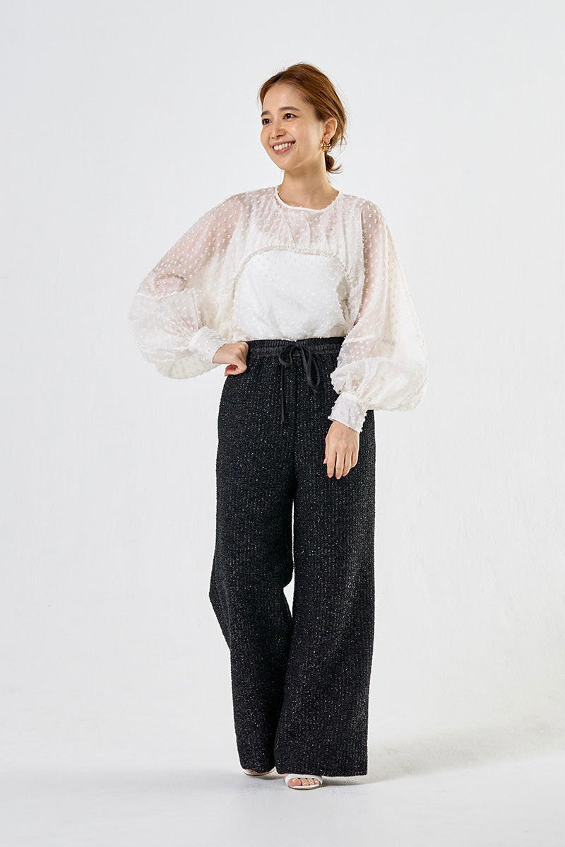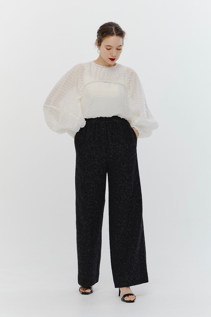 チラチラとしたドット調の雪を散りばめたような透け感のあるジャカード素材のノースリーブ。ボレロは同素材の空気を含んだエアリーさと、ふんわりと優しい着用感も魅力です。shirocon オリジナル日本産生地になります。ボレロのバックはたっぷりとギャザーを寄せたバルーンラインにボリュームスリーブでフェミニンな印象に。カフスで全体を引き締めて華奢な印象にしています。ノースリーブは長めの丈感ながらサイドスリットやラウンドヘムで軽やかな抜け感をプラス。バックの長めのリボンもポイントです。ハイネックニットやシャツはもちろん、シンプルなカットソーやTシャツなど、インナー次第で長い季節で着用いただけます。スタイリングに軽やかな雰囲気のあるアイテムです。