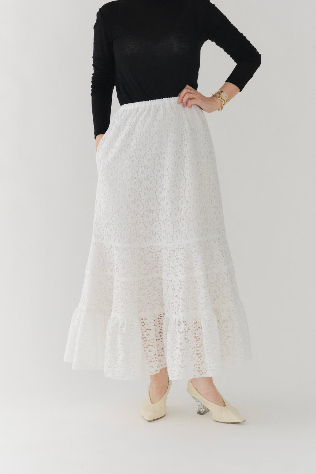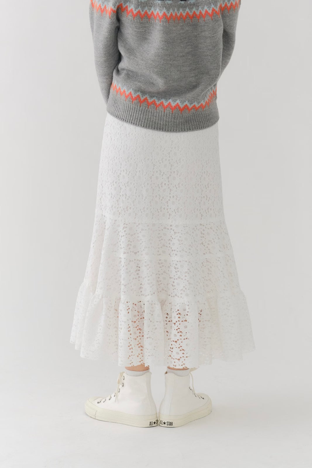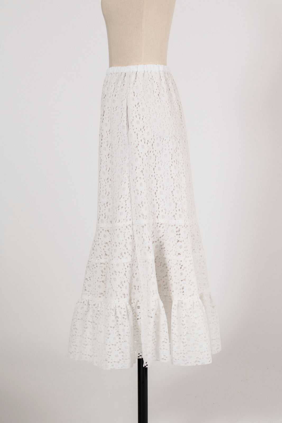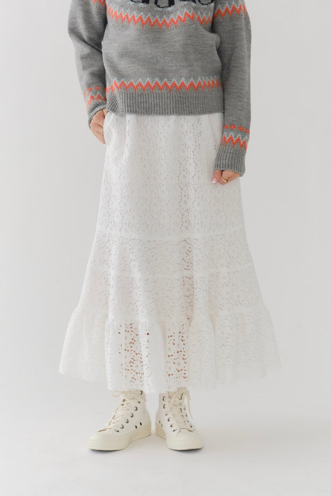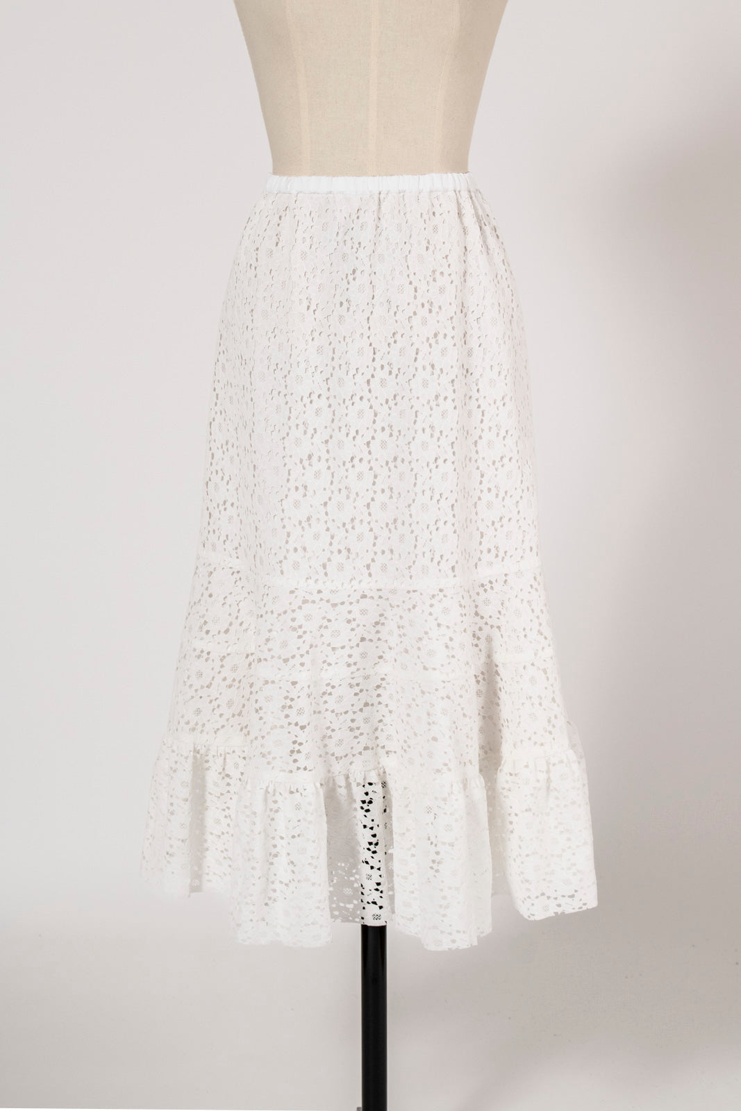 <yori>オリジナルの繊細なフロッキーレース生地を贅沢に使用したロングスカート。満開に咲く花々を思わせる優しいレースにふんわりと立体感を添えるフロッキー加工が、奥行きのある可憐な表情を生み出します。裾に向かってふわりと広がるティアードラインが歩くたびに揺れ、華やかさと上品さを兼ね備えた佇まいに。レースのほんのりとした透け感がシルエットに抜けをつくり、甘さのあるデザインを引き締めてくれます。ウエストは細めのゴム仕様で締めつけ感がなく、サイドファスナーで着脱もスムーズ。コンパクトなトップスと合わせて軽やかに、ボリュームのあるニットで甘さを楽しむコーディネートもおすすめ。日常にそっと華やかさを添え、特別な日の装いにも自信をくれるアイテムです。
