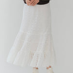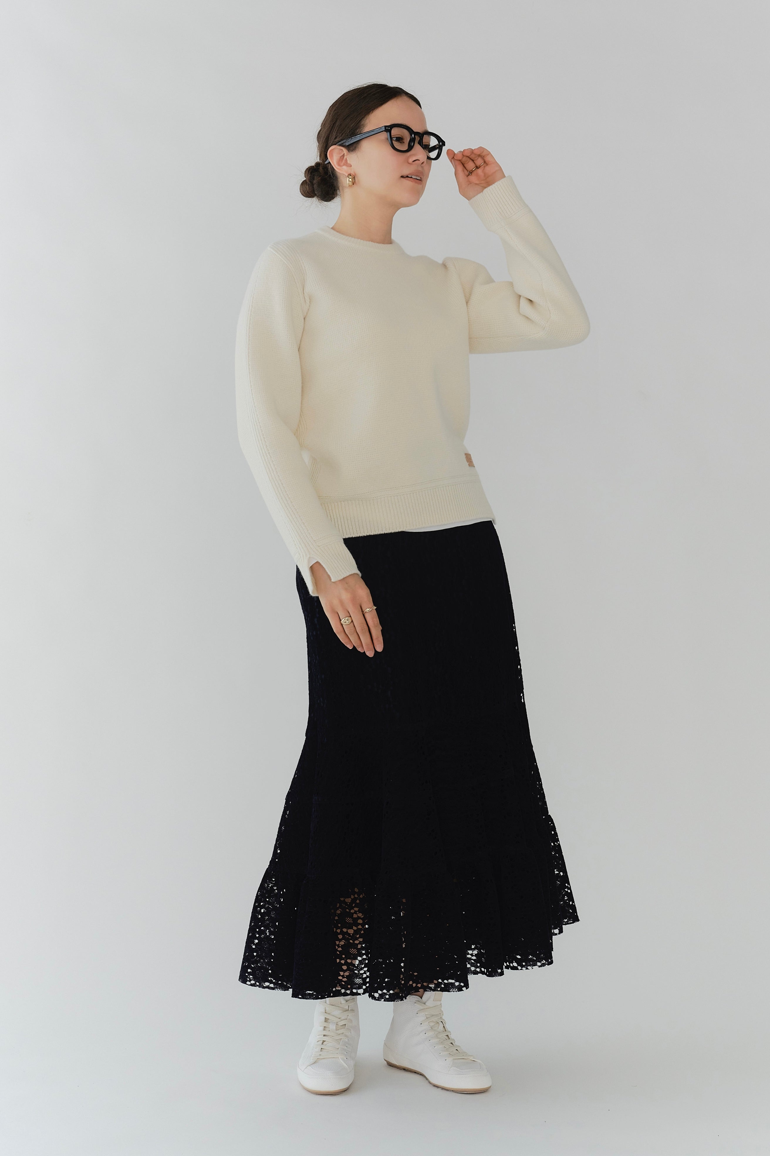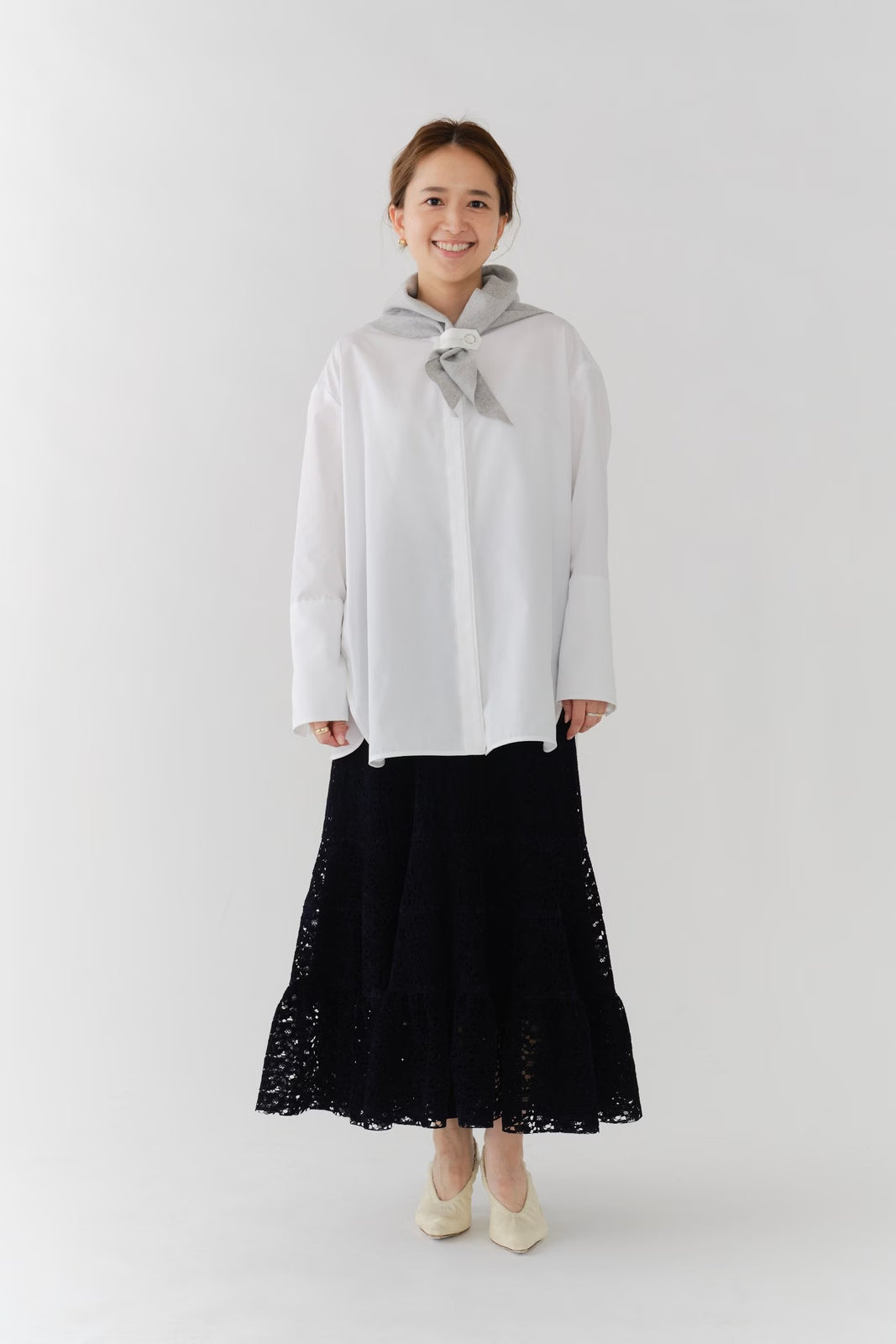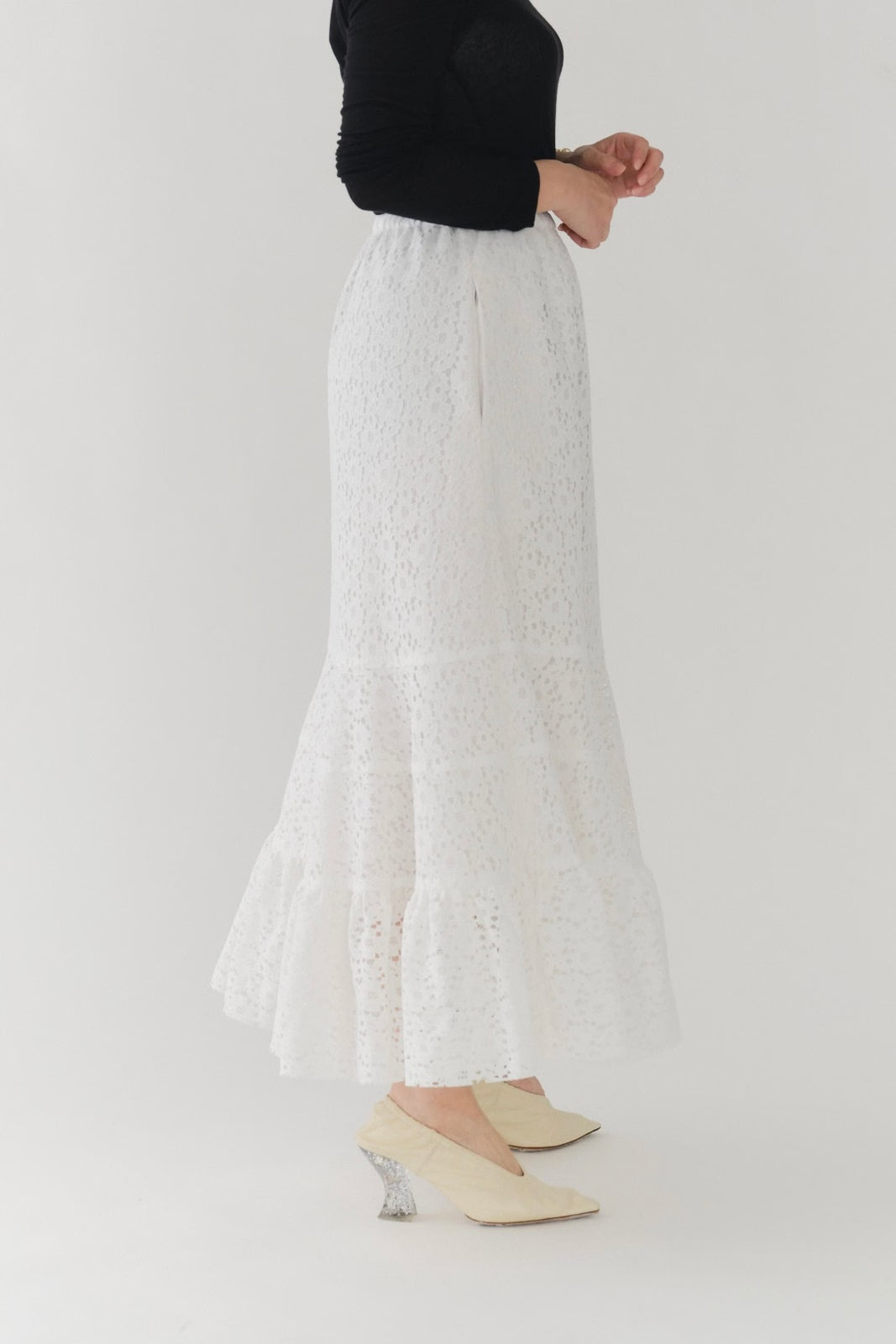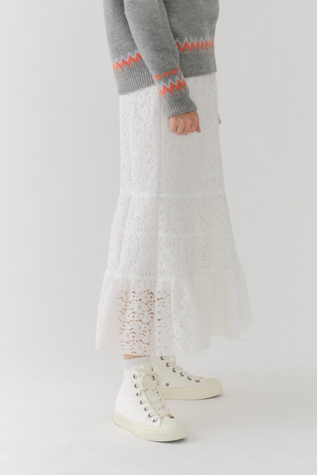 <yori>オリジナルの繊細なフロッキーレース生地を贅沢に使用したロングスカート。満開に咲く花々を思わせる優しいレースにふんわりと立体感を添えるフロッキー加工が、奥行きのある可憐な表情を生み出します。裾に向かってふわりと広がるティアードラインが歩くたびに揺れ、華やかさと上品さを兼ね備えた佇まいに。レースのほんのりとした透け感がシルエットに抜けをつくり、甘さのあるデザインを引き締めてくれます。ウエストは細めのゴム仕様で締めつけ感がなく、サイドファスナーで着脱もスムーズ。コンパクトなトップスと合わせて軽やかに、ボリュームのあるニットで甘さを楽しむコーディネートもおすすめ。日常にそっと華やかさを添え、特別な日の装いにも自信をくれるアイテムです。