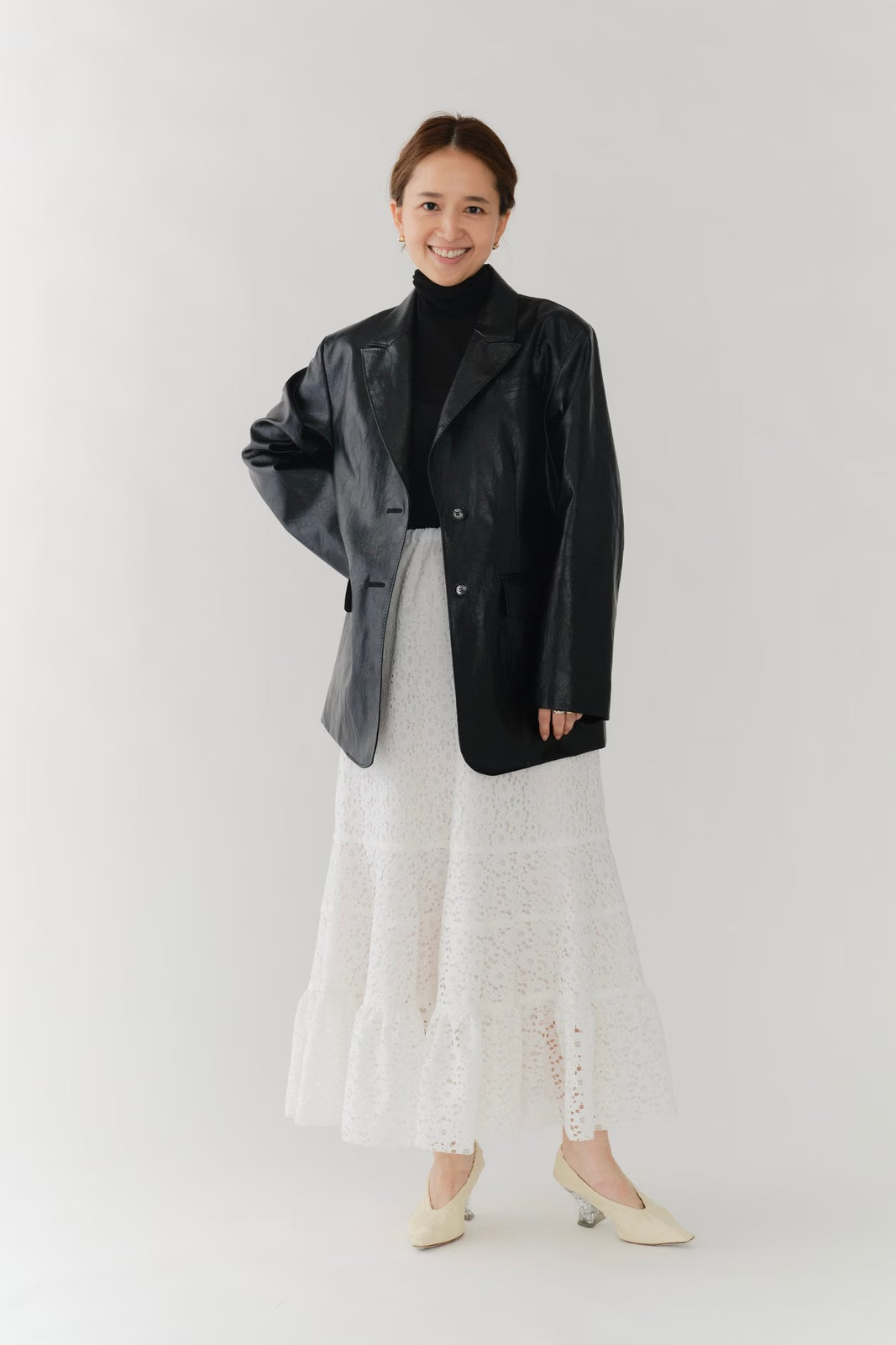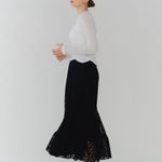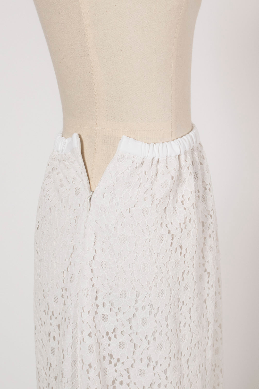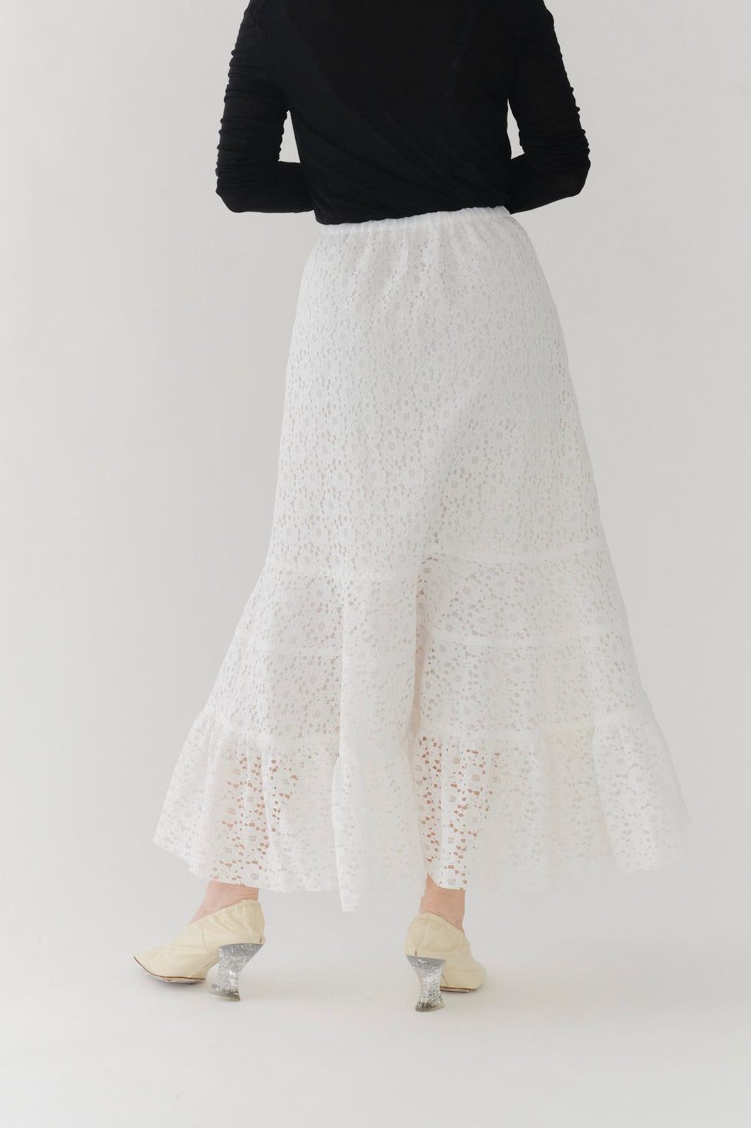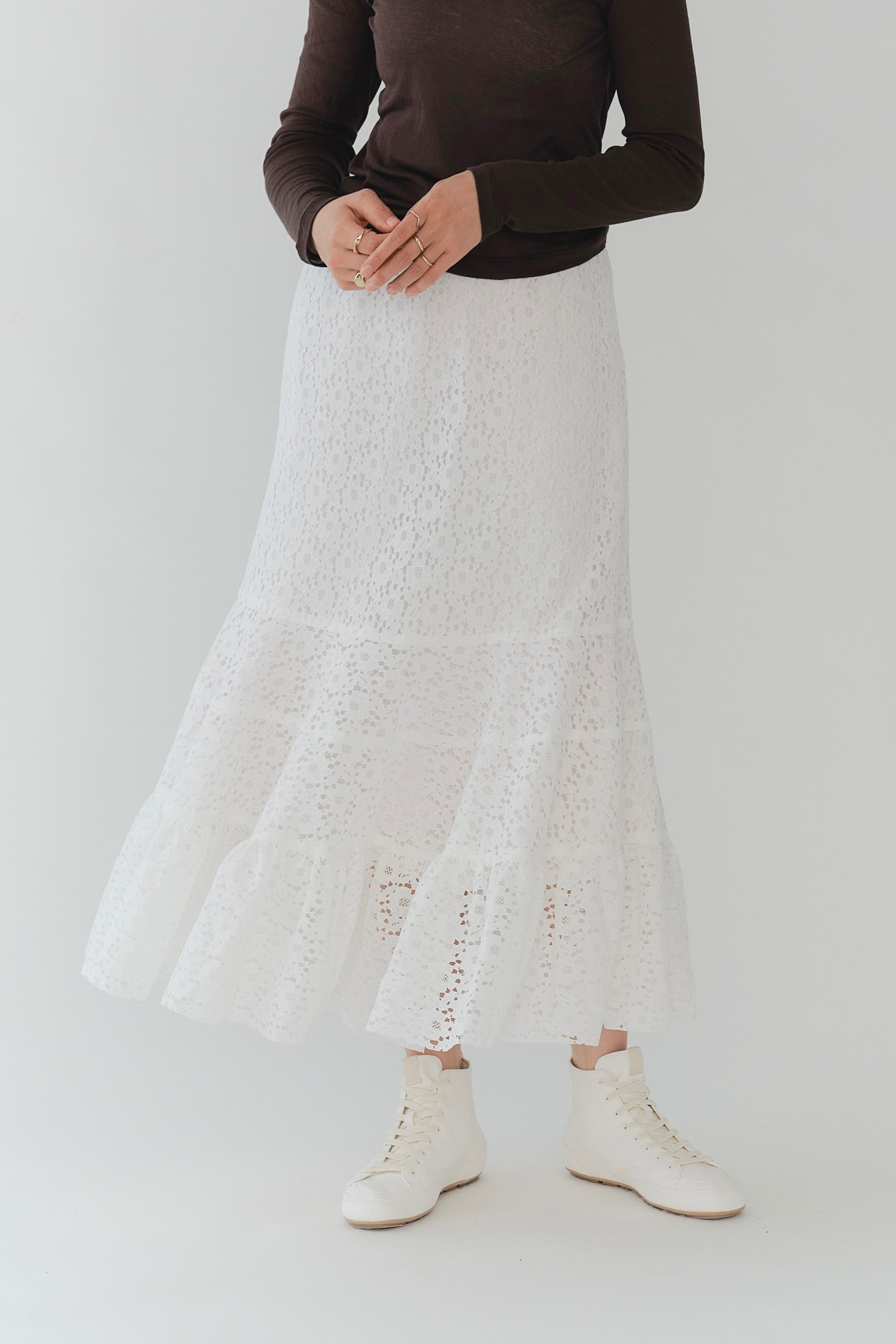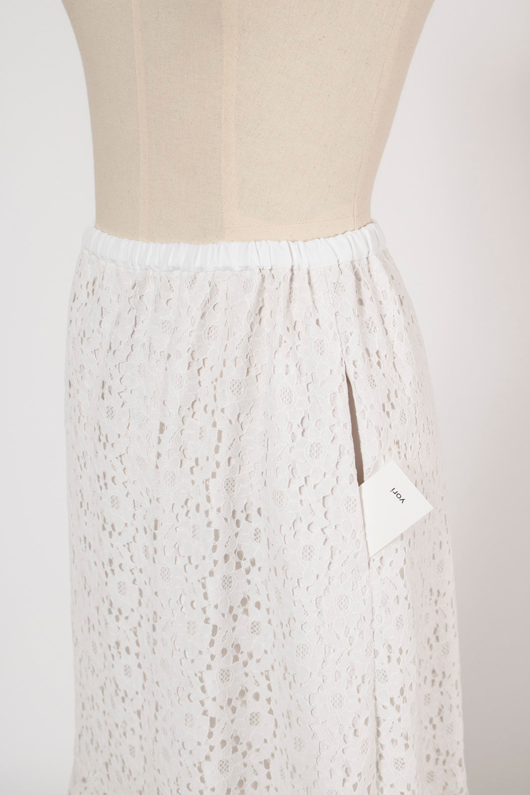 <yori>オリジナルの繊細なフロッキーレース生地を贅沢に使用したロングスカート。満開に咲く花々を思わせる優しいレースにふんわりと立体感を添えるフロッキー加工が、奥行きのある可憐な表情を生み出します。裾に向かってふわりと広がるティアードラインが歩くたびに揺れ、華やかさと上品さを兼ね備えた佇まいに。レースのほんのりとした透け感がシルエットに抜けをつくり、甘さのあるデザインを引き締めてくれます。ウエストは細めのゴム仕様で締めつけ感がなく、サイドファスナーで着脱もスムーズ。コンパクトなトップスと合わせて軽やかに、ボリュームのあるニットで甘さを楽しむコーディネートもおすすめ。日常にそっと華やかさを添え、特別な日の装いにも自信をくれるアイテムです。
