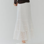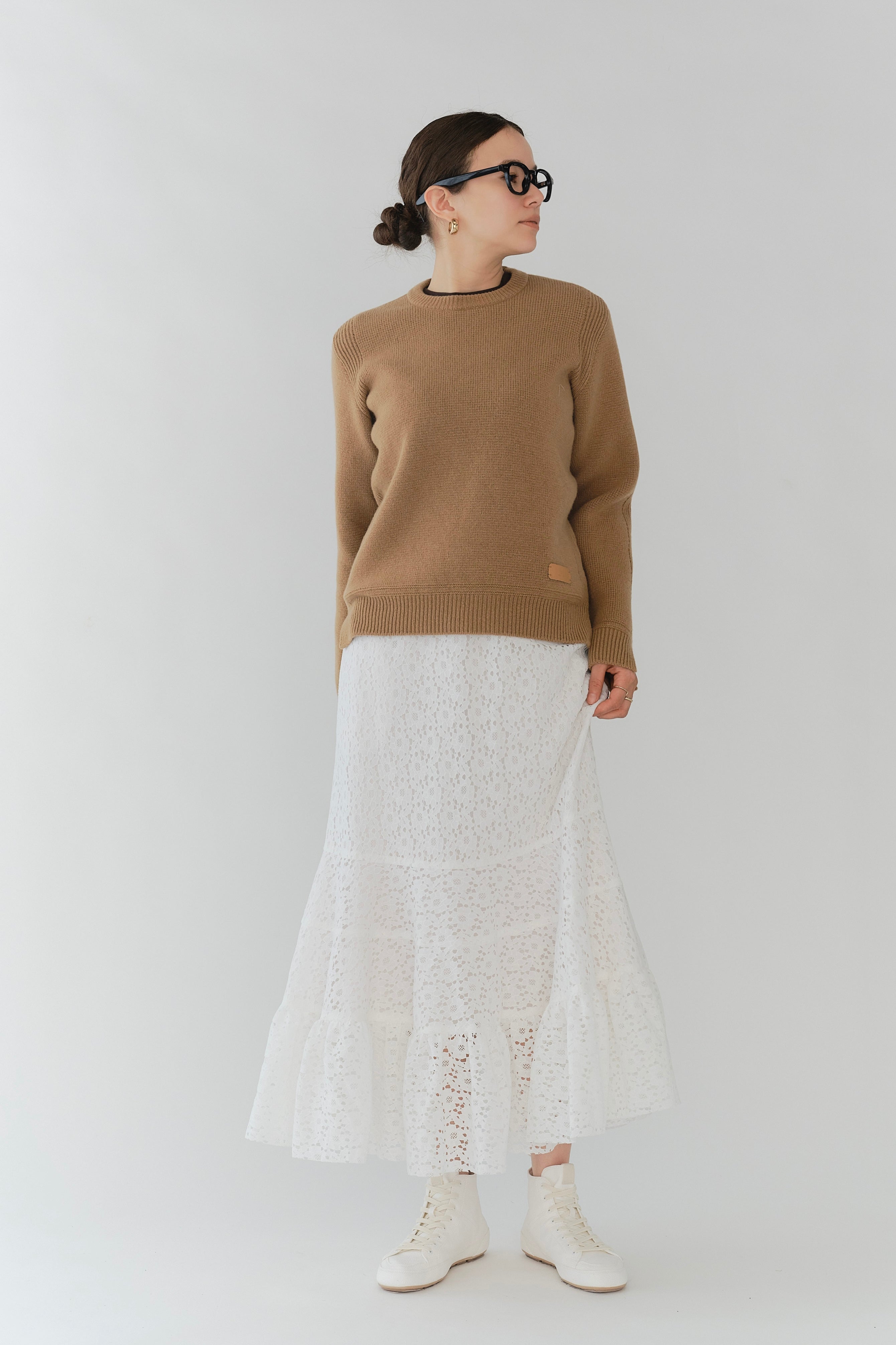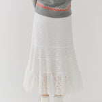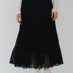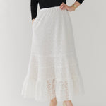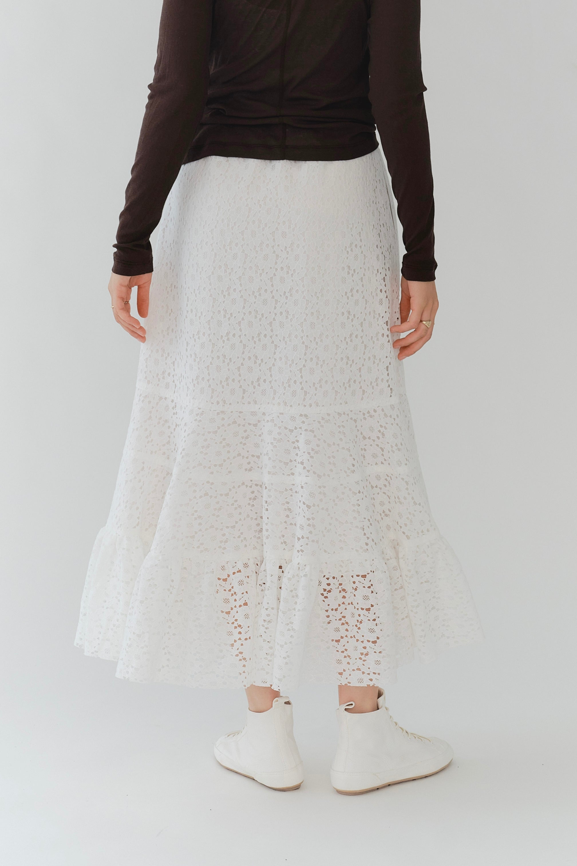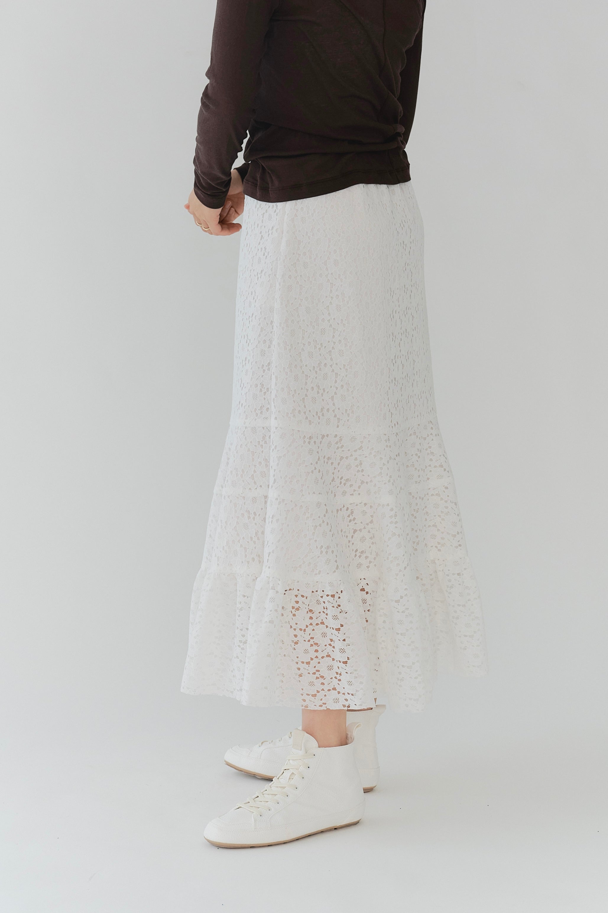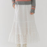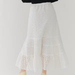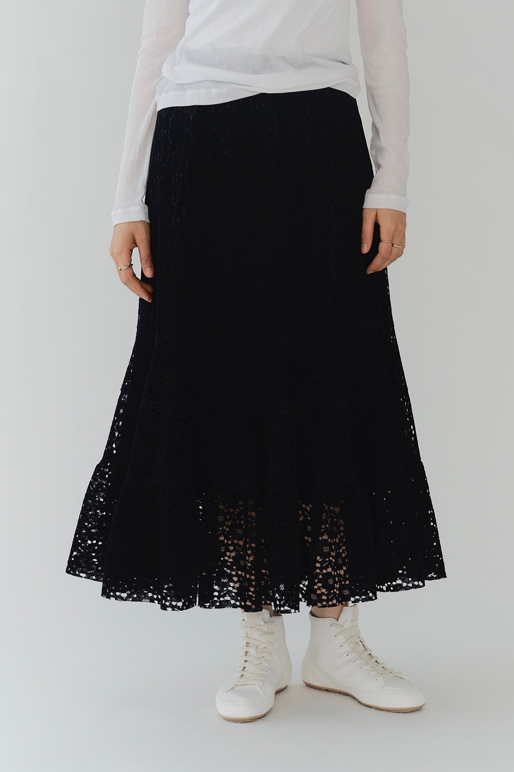 <yori>オリジナルの繊細なフロッキーレース生地を贅沢に使用したロングスカート。満開に咲く花々を思わせる優しいレースにふんわりと立体感を添えるフロッキー加工が、奥行きのある可憐な表情を生み出します。裾に向かってふわりと広がるティアードラインが歩くたびに揺れ、華やかさと上品さを兼ね備えた佇まいに。レースのほんのりとした透け感がシルエットに抜けをつくり、甘さのあるデザインを引き締めてくれます。ウエストは細めのゴム仕様で締めつけ感がなく、サイドファスナーで着脱もスムーズ。コンパクトなトップスと合わせて軽やかに、ボリュームのあるニットで甘さを楽しむコーディネートもおすすめ。日常にそっと華やかさを添え、特別な日の装いにも自信をくれるアイテムです。