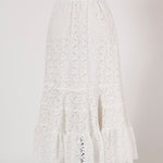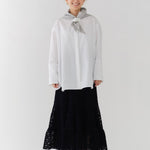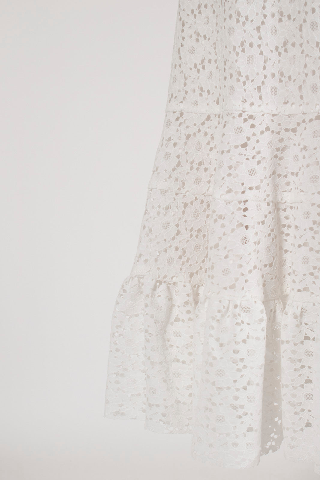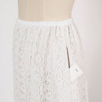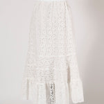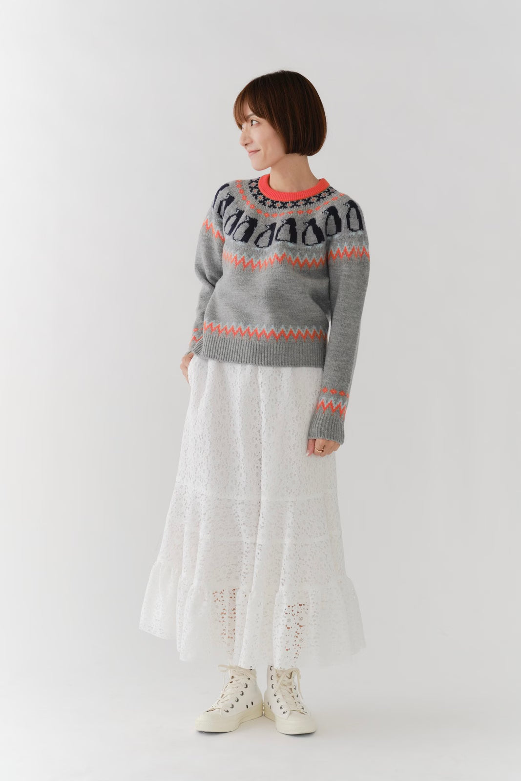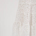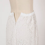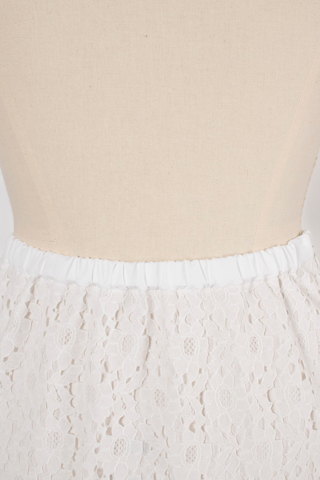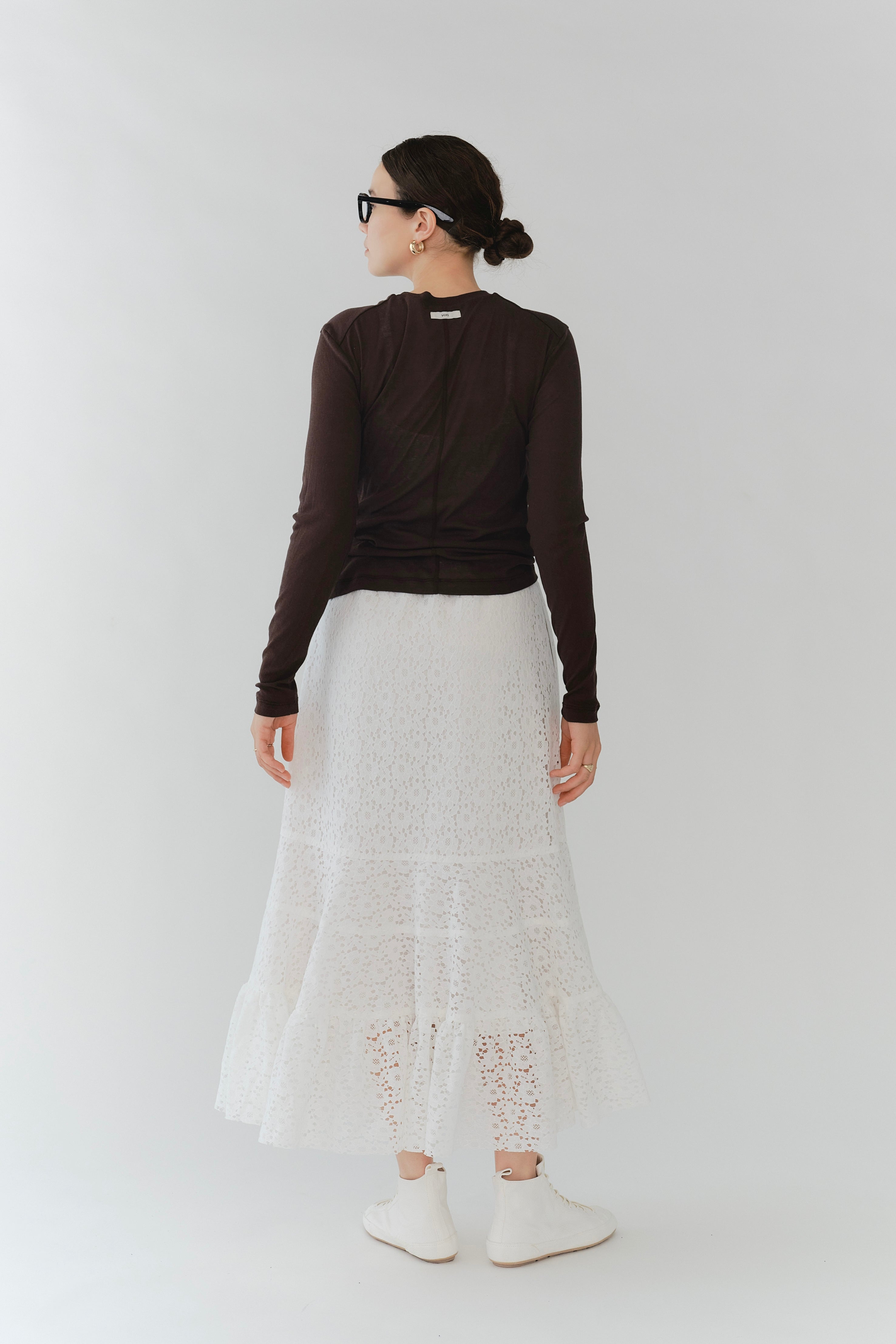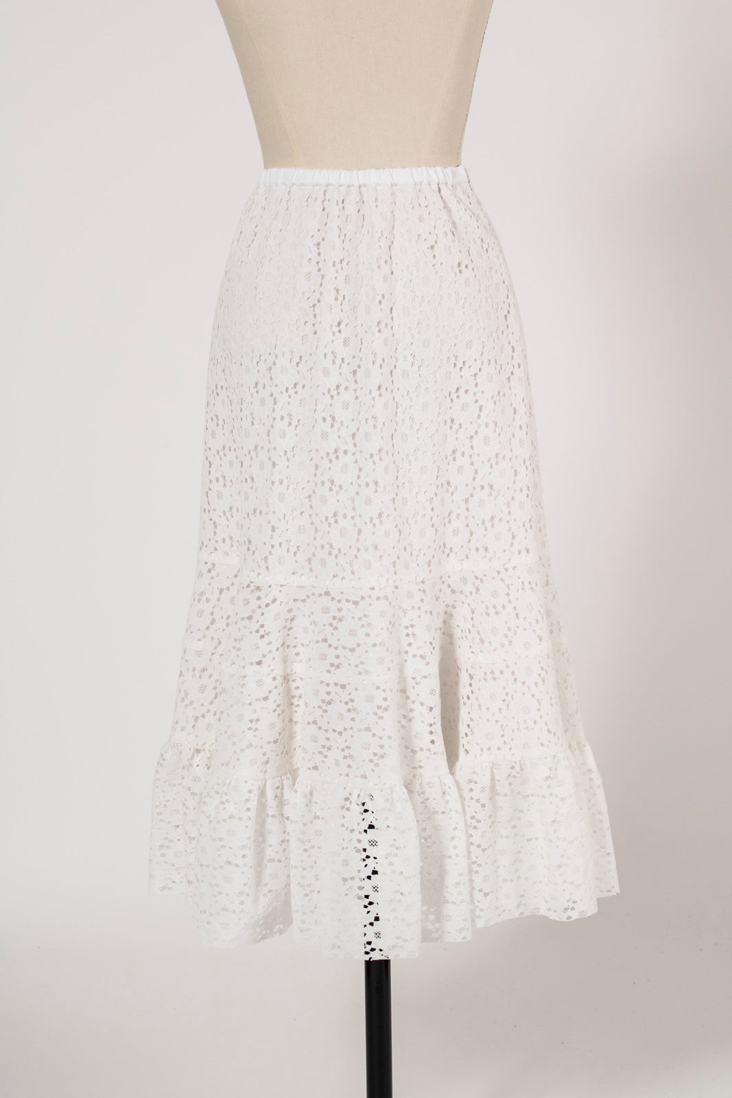 <yori>オリジナルの繊細なフロッキーレース生地を贅沢に使用したロングスカート。満開に咲く花々を思わせる優しいレースにふんわりと立体感を添えるフロッキー加工が、奥行きのある可憐な表情を生み出します。裾に向かってふわりと広がるティアードラインが歩くたびに揺れ、華やかさと上品さを兼ね備えた佇まいに。レースのほんのりとした透け感がシルエットに抜けをつくり、甘さのあるデザインを引き締めてくれます。ウエストは細めのゴム仕様で締めつけ感がなく、サイドファスナーで着脱もスムーズ。コンパクトなトップスと合わせて軽やかに、ボリュームのあるニットで甘さを楽しむコーディネートもおすすめ。日常にそっと華やかさを添え、特別な日の装いにも自信をくれるアイテムです。