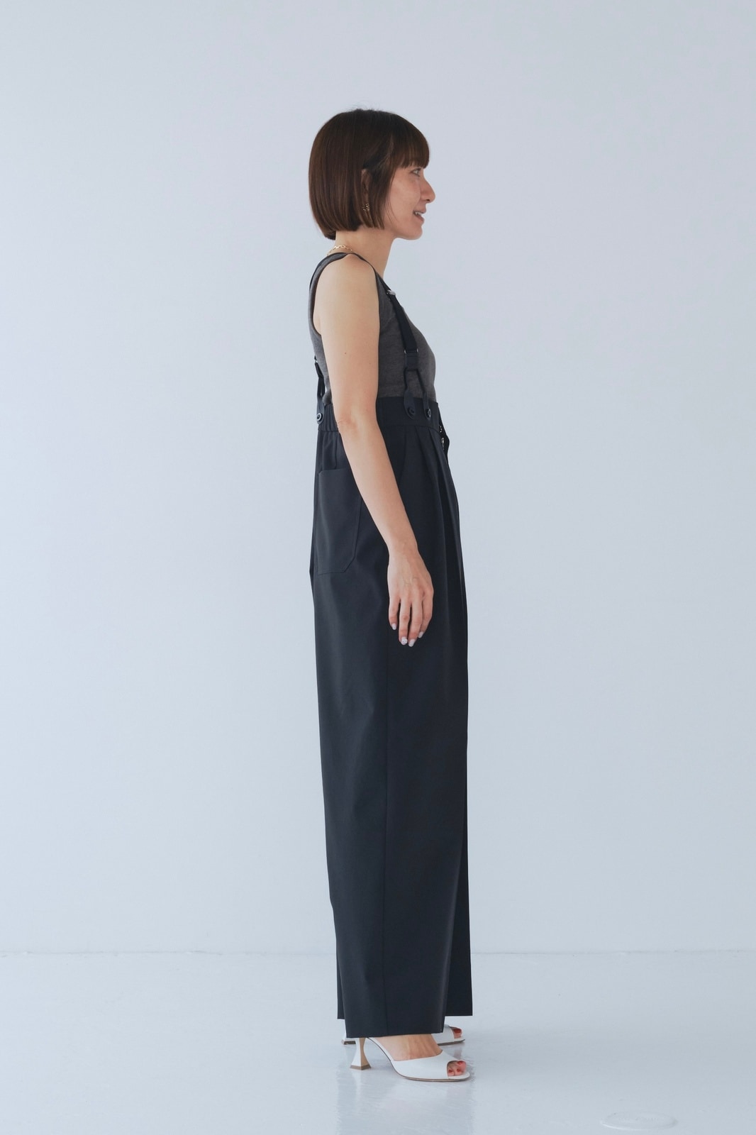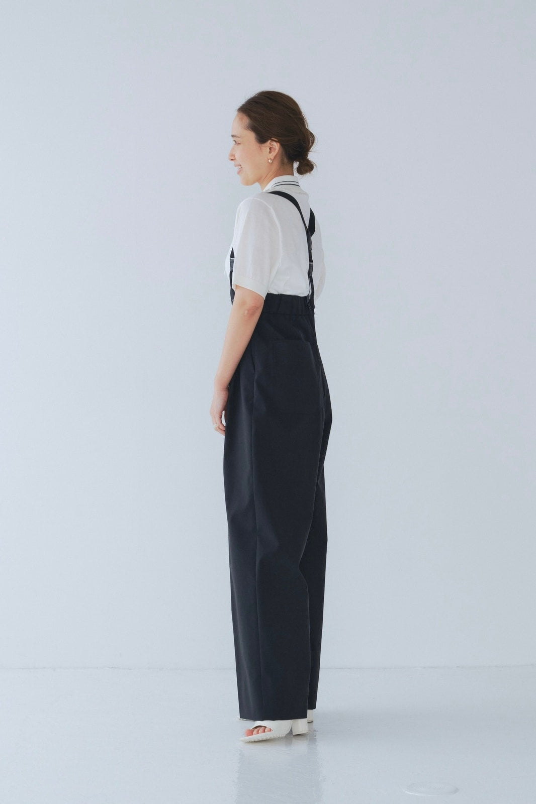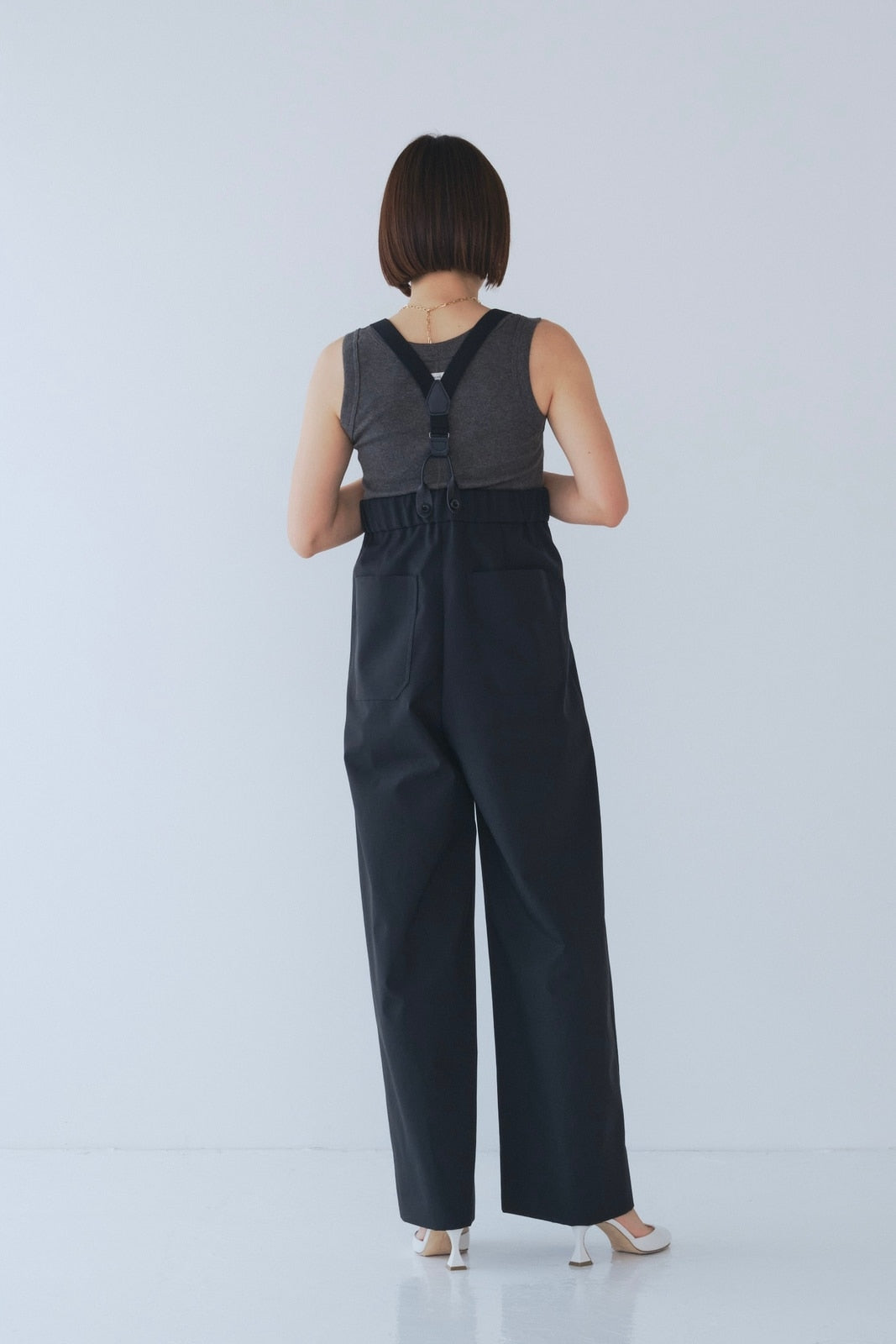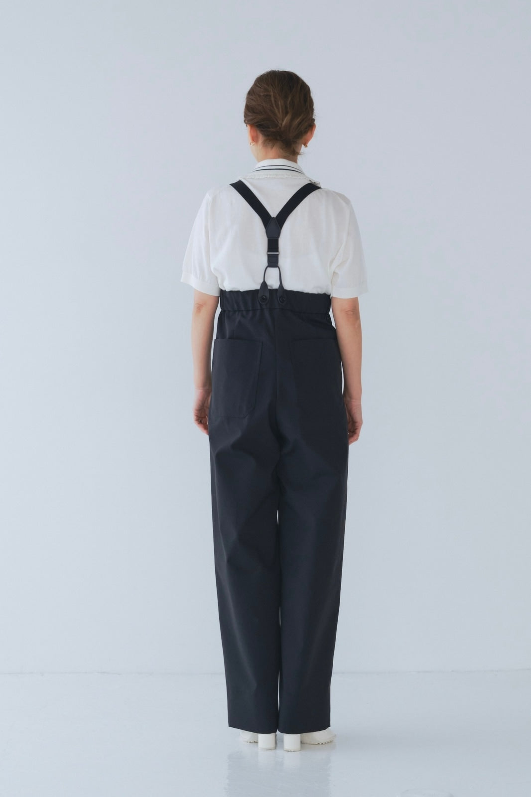 密度の高いタイプライター素材を使用したサロペット。縦糸、緯糸に軽量な糸を織り上げたストレッチ素材で、しなやかさと快適さが感じられます。UVカット機能と吸水速乾機能が備わっており、夏の暑い日でもさっぱりと快適にお過ごしいただけます。ふくらみのある風合いとクリアな見え方、ドライなタッチが特徴で、シワになりにくくデイリーに使いやすい点も嬉しいポイントです。身体のラインを拾わず、ストレートシルエットでリラックス感が漂います。太めのウエストベルトとストラップで、ハイウエストに見せるデザインが、カジュアルなサロペットに女性らしい雰囲気をプラスしています。肩紐は調整可能で、お好みの丈感にぴったり合わせられるので、どんな体型にもフィットします。フロントに施したタックや、落ち感のあるワイドシルエットが絶妙なバランスで、程よい抜け感を演出します。後ろには高い位置に大きめのパッチポケットがありスタイルを良く見せてくれる効果も!合わせるインナーやアクセサリー次第で、さまざまな表情を楽しむことができ、スタイリングの幅がぐっと広がるアイテムです。
