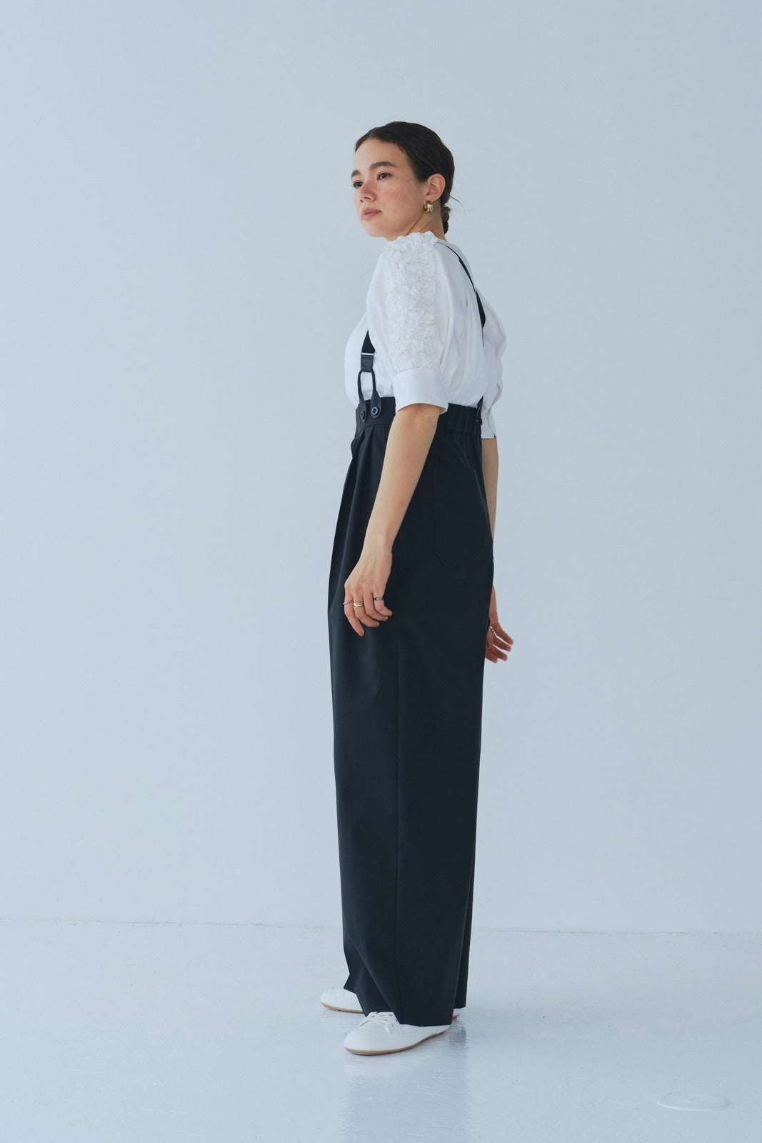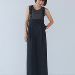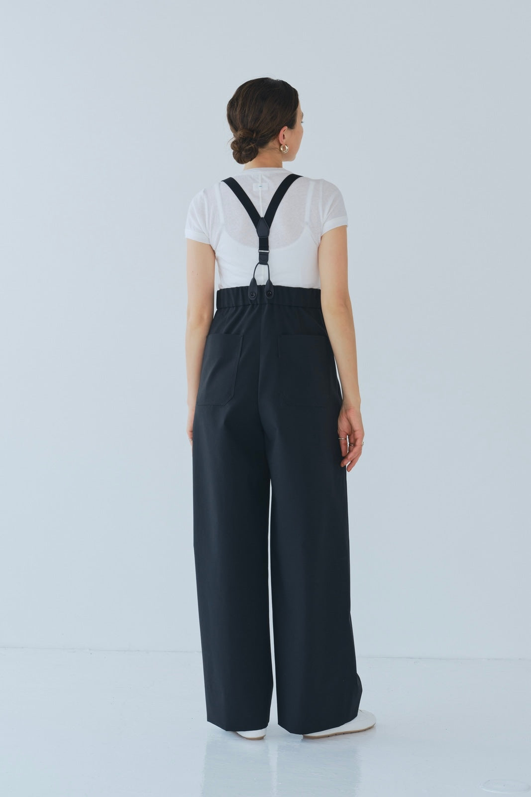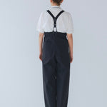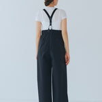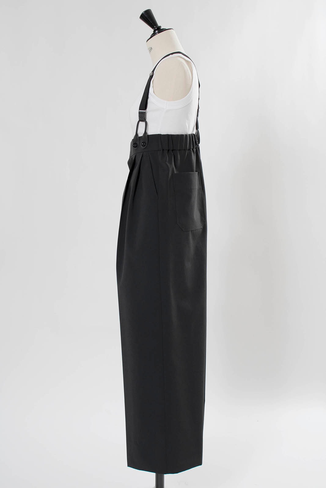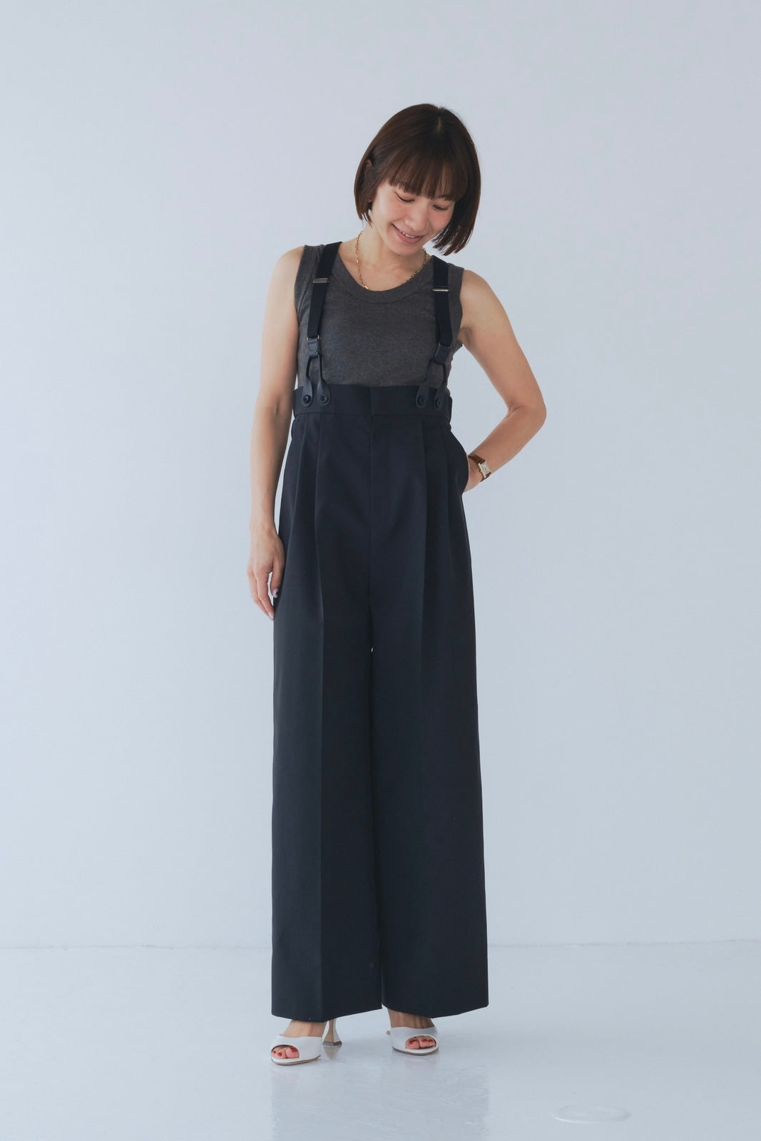 密度の高いタイプライター素材を使用したサロペット。縦糸、緯糸に軽量な糸を織り上げたストレッチ素材で、しなやかさと快適さが感じられます。UVカット機能と吸水速乾機能が備わっており、夏の暑い日でもさっぱりと快適にお過ごしいただけます。ふくらみのある風合いとクリアな見え方、ドライなタッチが特徴で、シワになりにくくデイリーに使いやすい点も嬉しいポイントです。身体のラインを拾わず、ストレートシルエットでリラックス感が漂います。太めのウエストベルトとストラップで、ハイウエストに見せるデザインが、カジュアルなサロペットに女性らしい雰囲気をプラスしています。肩紐は調整可能で、お好みの丈感にぴったり合わせられるので、どんな体型にもフィットします。フロントに施したタックや、落ち感のあるワイドシルエットが絶妙なバランスで、程よい抜け感を演出します。後ろには高い位置に大きめのパッチポケットがありスタイルを良く見せてくれる効果も!合わせるインナーやアクセサリー次第で、さまざまな表情を楽しむことができ、スタイリングの幅がぐっと広がるアイテムです。