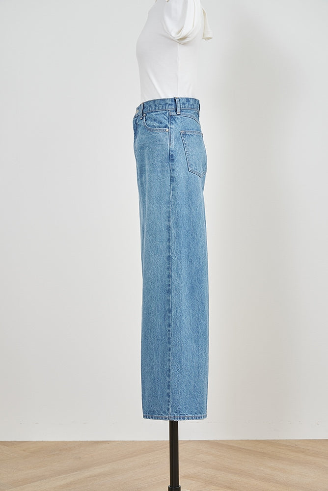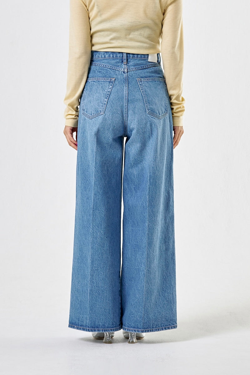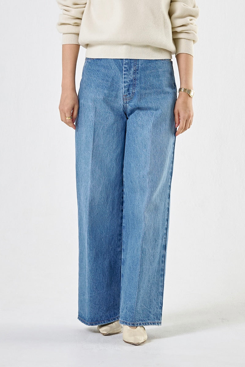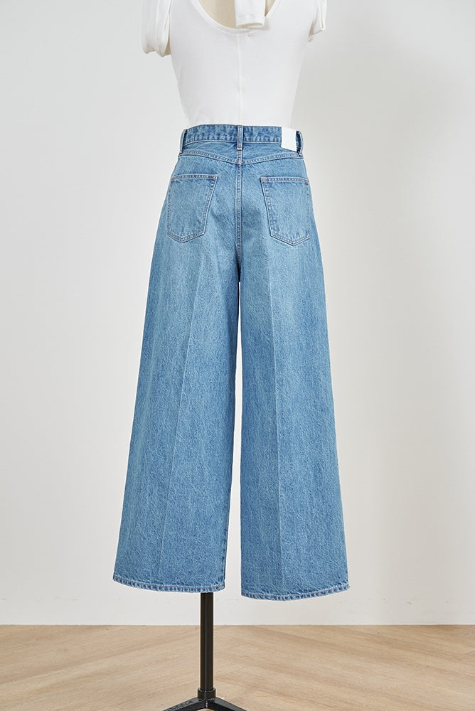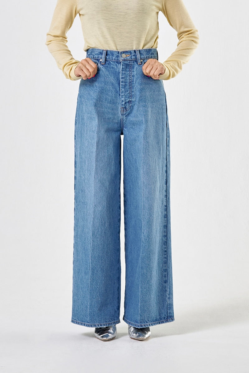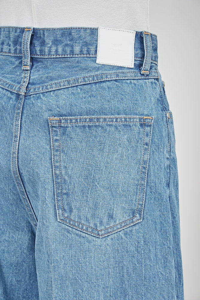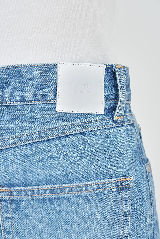 yori初めての5ポケットデニム登場です。カジュアルになりすぎずLadylikeなデニムパンツに仕上げました。ウエスト周りはすっきりとさせたハイライズ、腰まわりをややタイトにすることですっきりとしたバランスに。膝や裾は大きく取ったワイドシルエットです。腰位置が高く見え、センタープレスのコスリ加工により脚長効果抜群の1本。裾にダメージ加工を施し最後に風合いを柔らかくするのに柔軟WASHしています。デニム職人が1点1点手作業で加工を仕上げました。バックウエストのホワイト革パッチにはyoriロゴを型押しし、存在感のあるバックスタイルに。一つお持ちいただくと、テイストやシーズンを問わず活躍してくれるアイテムです。Tシャツとのカジュアルなコーディネートはもちろん、過去yoriブラウスなどと合わせたきれいめな着こなしも新鮮に見せてくれるのでおすすめです。