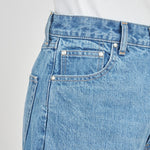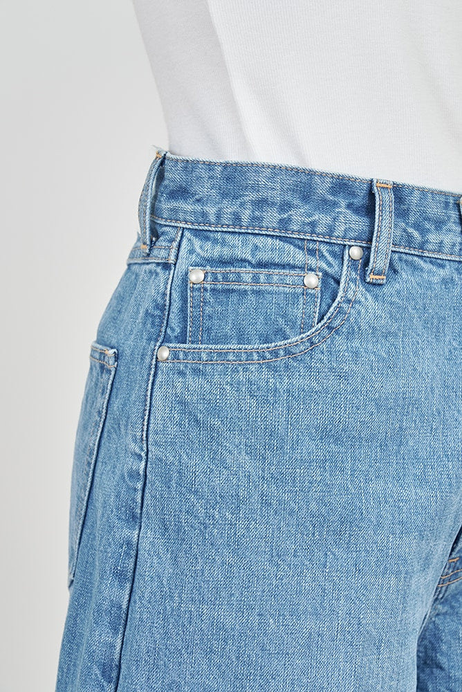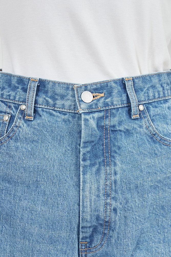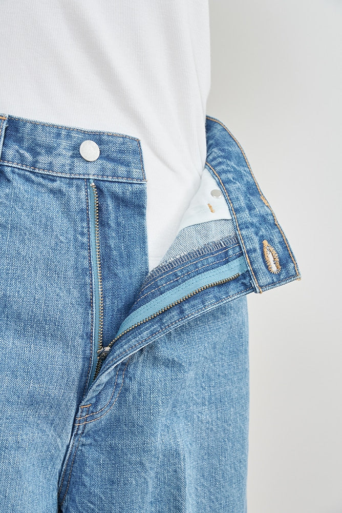 100年以上歴史のある広島県の染色工場で染色し、 デニム生地の産地、岡山県井原市で織られたデニムを使用しています。 使用の糸は70年代、デニムのムラ糸が出始めたころの糸を再現。ほどよい肉感と着心地の良さも特徴。 タテ糸の7番のムラ糸をインディゴロープ染色。 インディゴの色もその当時の少し浅めのインディゴブルー。 芯白にロープ染色した糸の為、経年変化による色落ちが楽しめます。