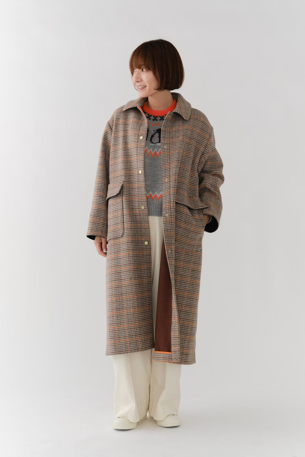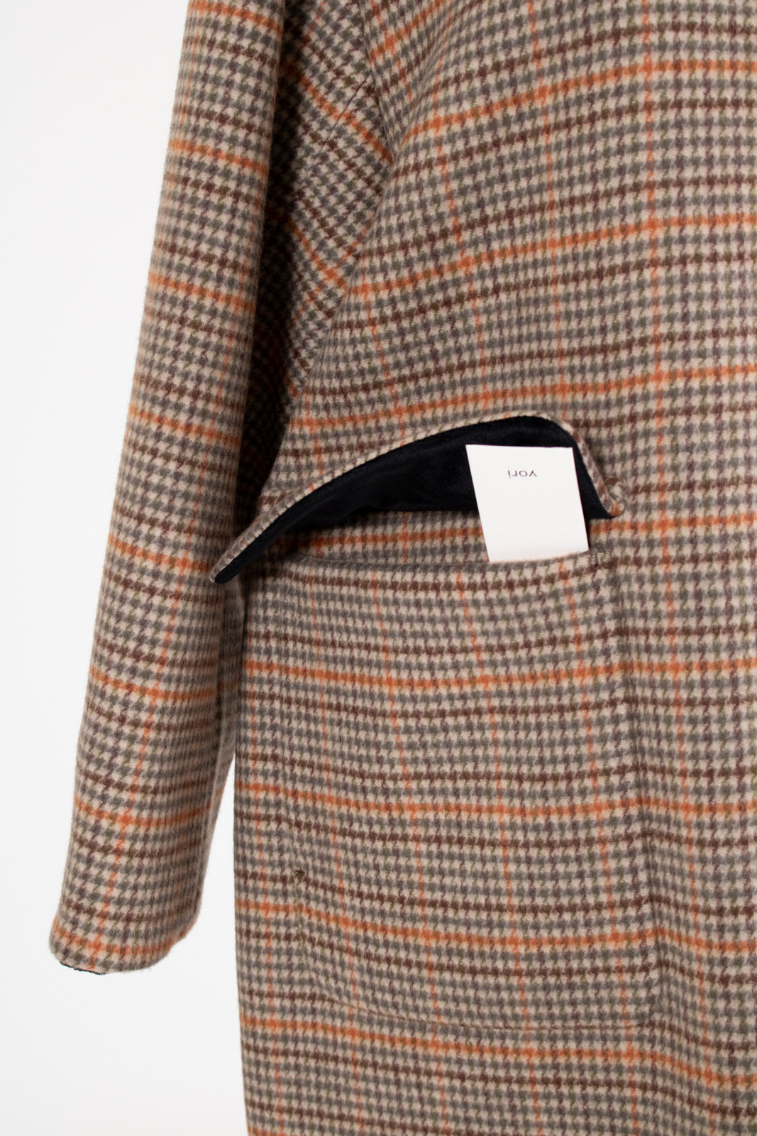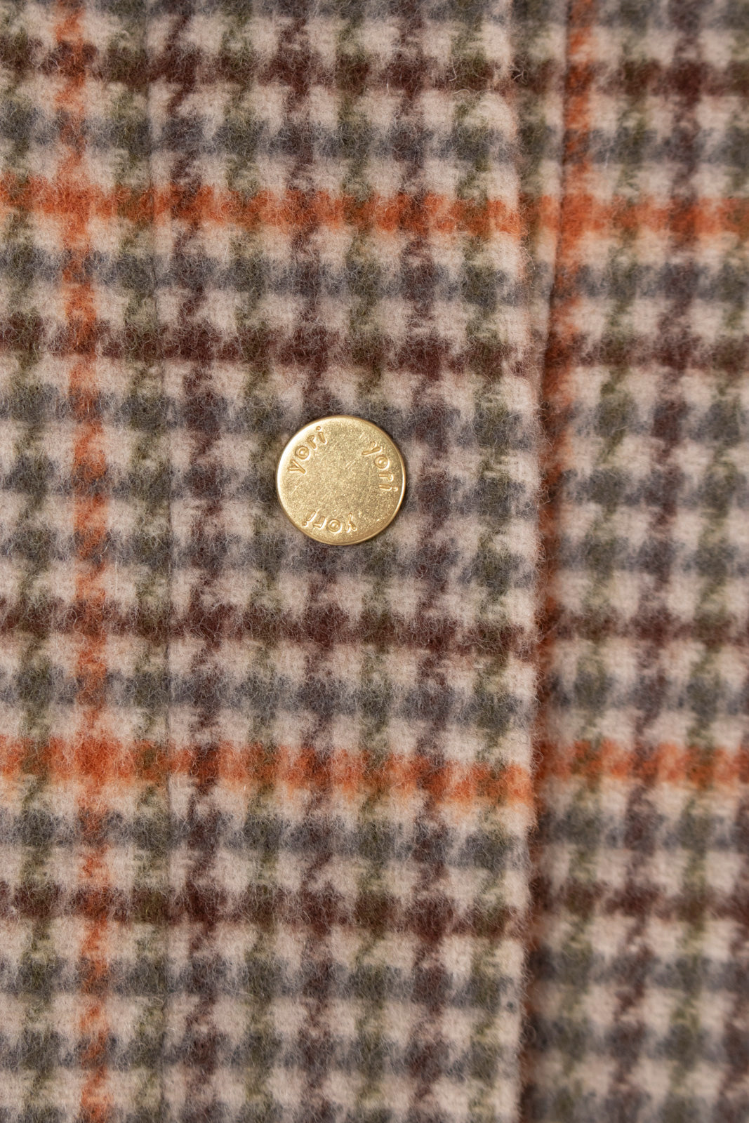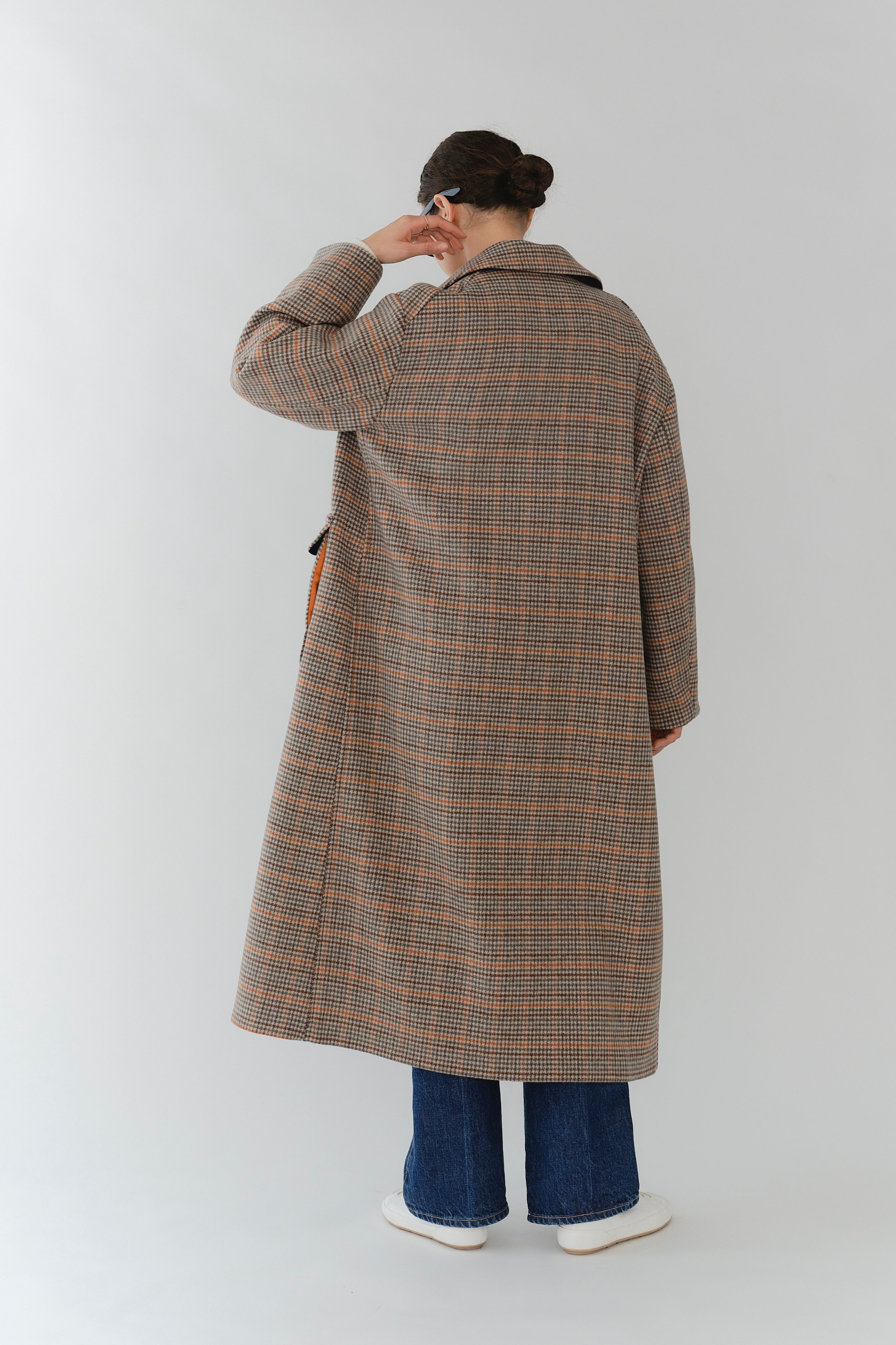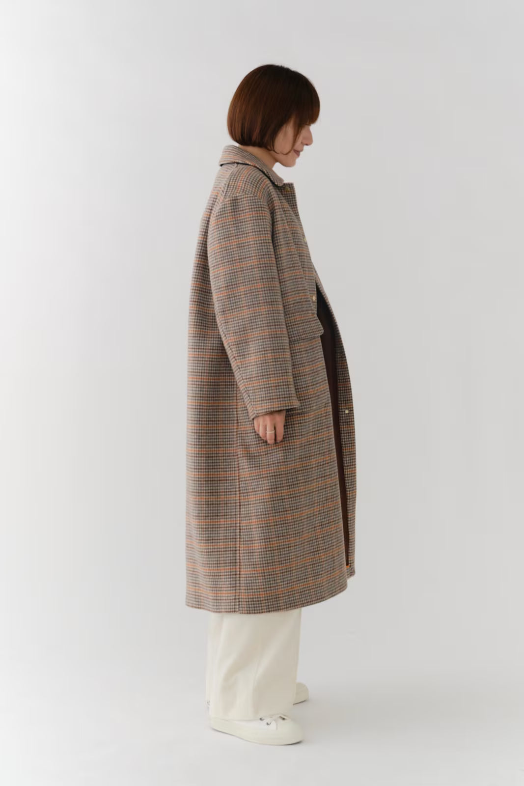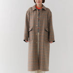 クラシックなチェック柄を、yoriらしい上品な感性で仕上げたロングコート。表地はチェック柄、裏地は無地の両面表使い出来る上質な生地を仕様し、軽くなめらかな肌触りが魅力です。すっきりとしたIラインシルエットで、スタイルアップ効果も抜群。フロントにはyoriのロゴが刻印されたオリジナルのドットボタンを使用し、ミニマルながらも高級感をプラス。さらに、フロント裏には鮮やかなオレンジのグログランテープを施し、コートを開けたときに目を引く印象的なアクセントに。まるでクッキーのようなモチーフとして、yoriらしいエッセンスのネームタグをさりげなく添えました。袖裏地は腕通りが良く、快適な着心地を実現。ポケット裏と衿裏には上品な艶をもつベルベット素材を使用し、細部までyoriのこだわりが詰まった一着です。