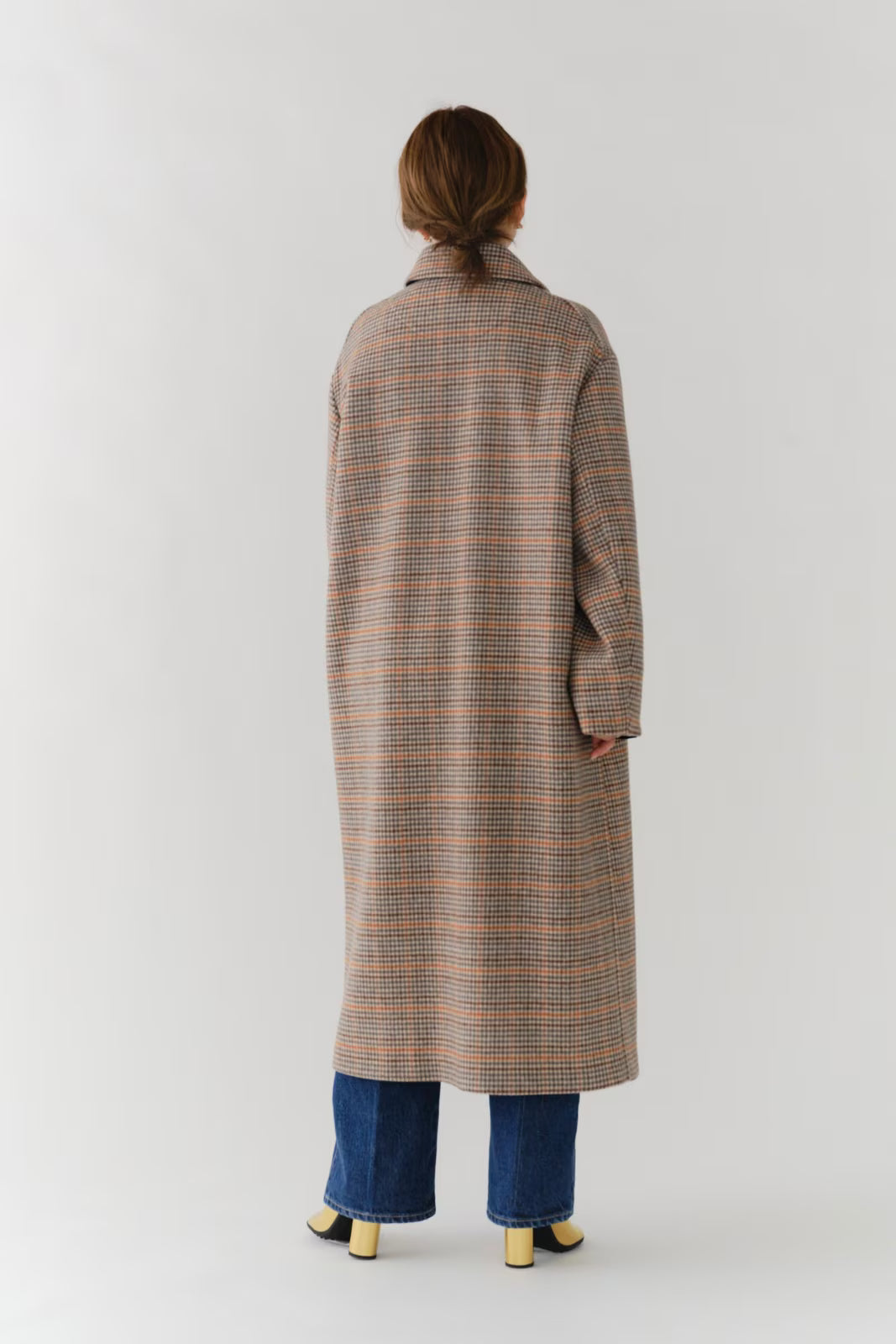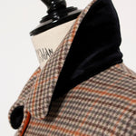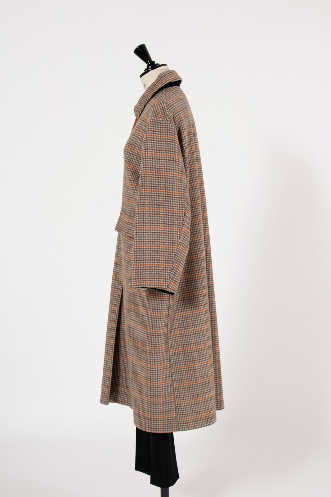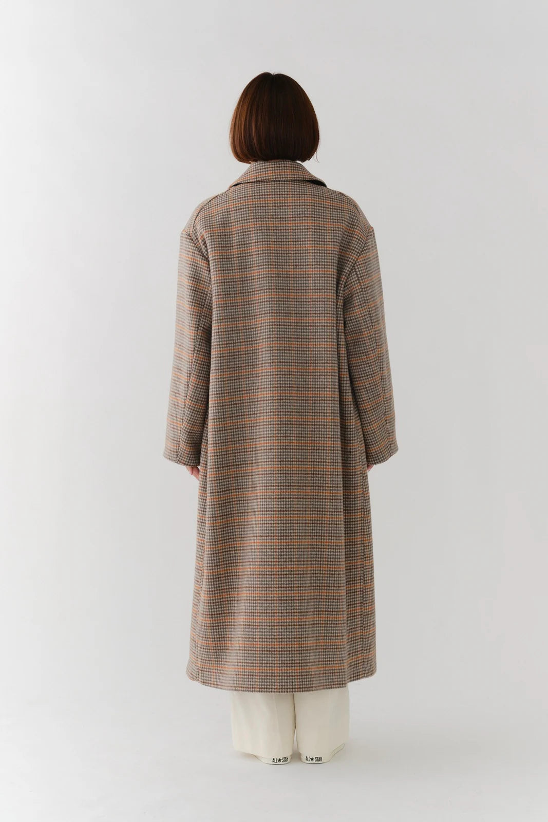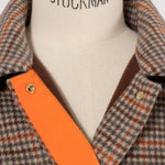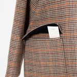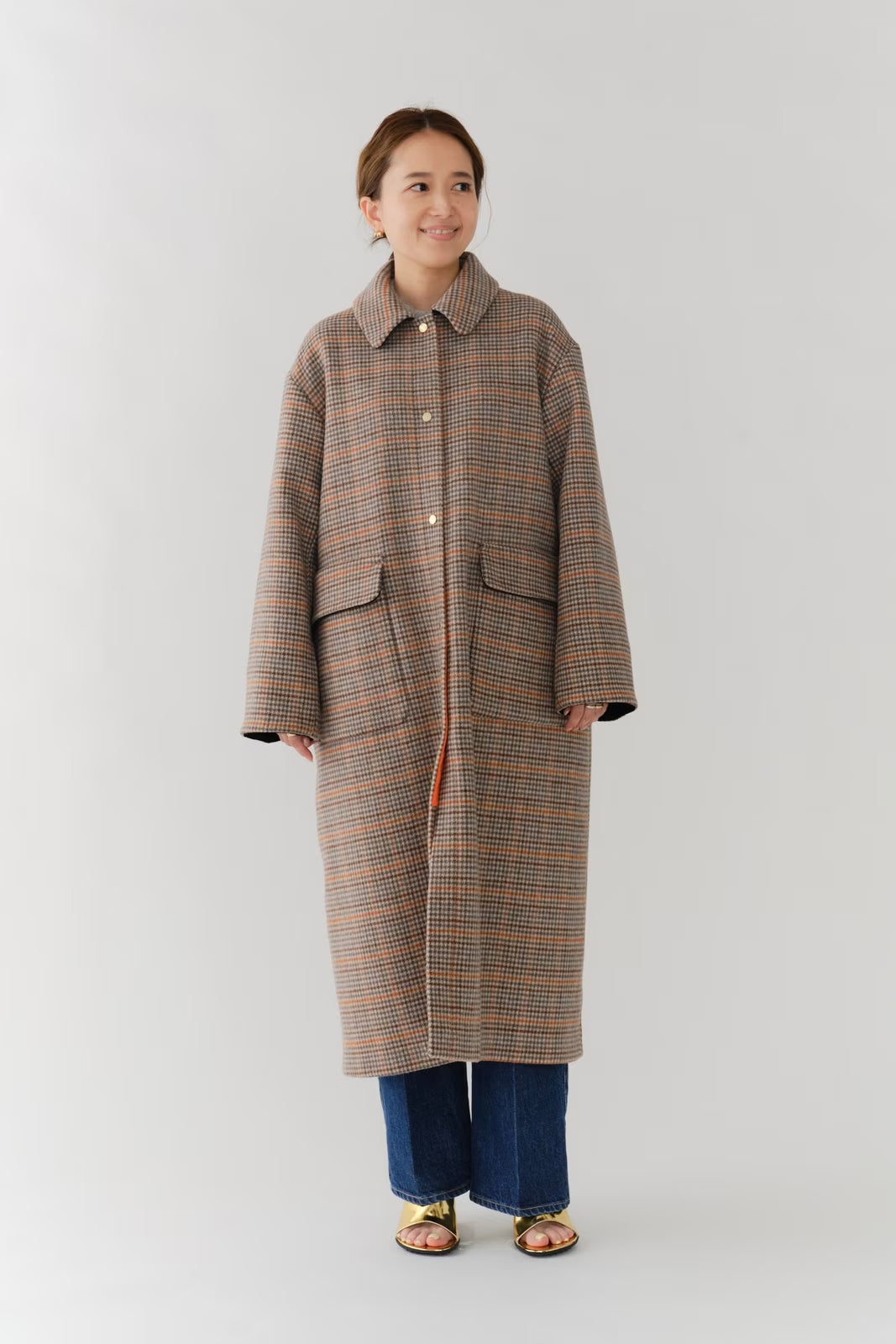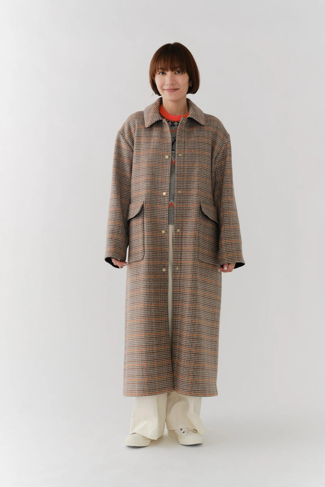 クラシックなチェック柄を、yoriらしい上品な感性で仕上げたロングコート。表地はチェック柄、裏地は無地の両面表使い出来る上質な生地を仕様し、軽くなめらかな肌触りが魅力です。すっきりとしたIラインシルエットで、スタイルアップ効果も抜群。フロントにはyoriのロゴが刻印されたオリジナルのドットボタンを使用し、ミニマルながらも高級感をプラス。さらに、フロント裏には鮮やかなオレンジのグログランテープを施し、コートを開けたときに目を引く印象的なアクセントに。まるでクッキーのようなモチーフとして、yoriらしいエッセンスのネームタグをさりげなく添えました。袖裏地は腕通りが良く、快適な着心地を実現。ポケット裏と衿裏には上品な艶をもつベルベット素材を使用し、細部までyoriのこだわりが詰まった一着です。