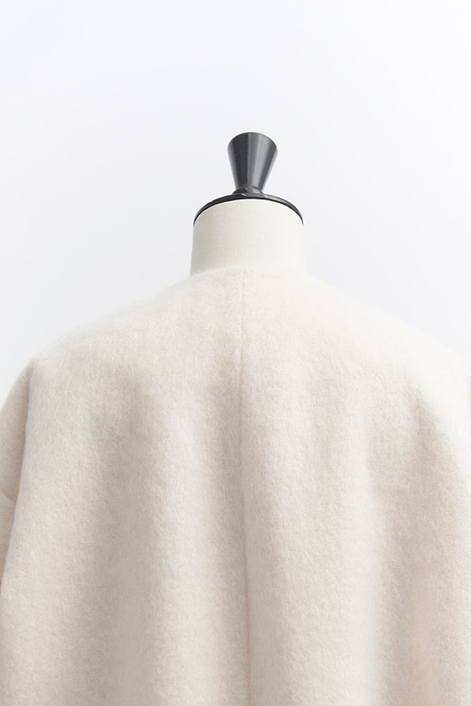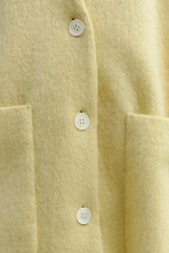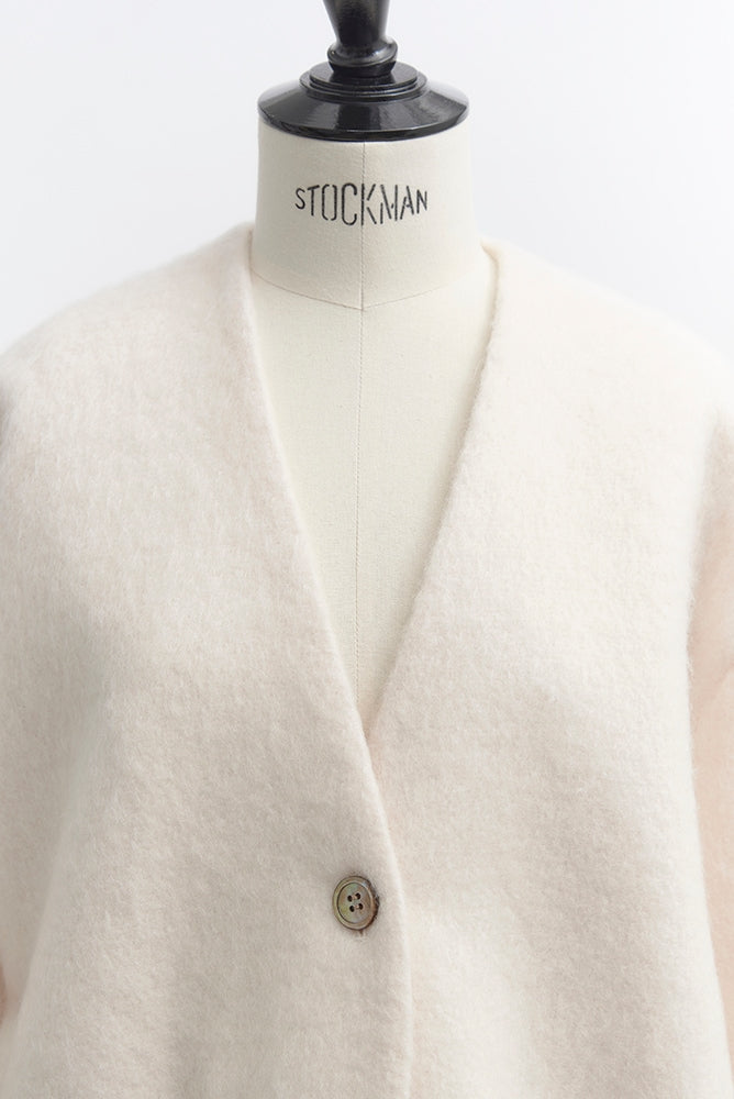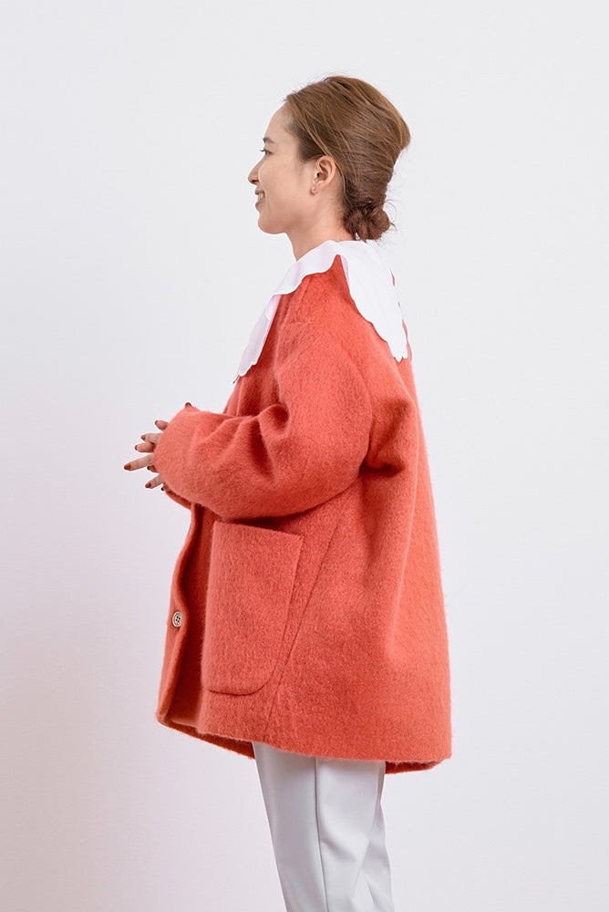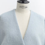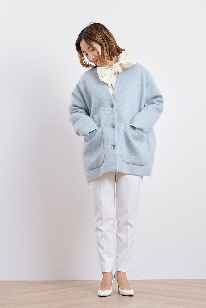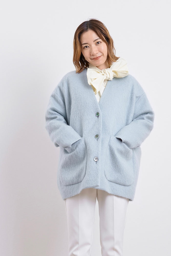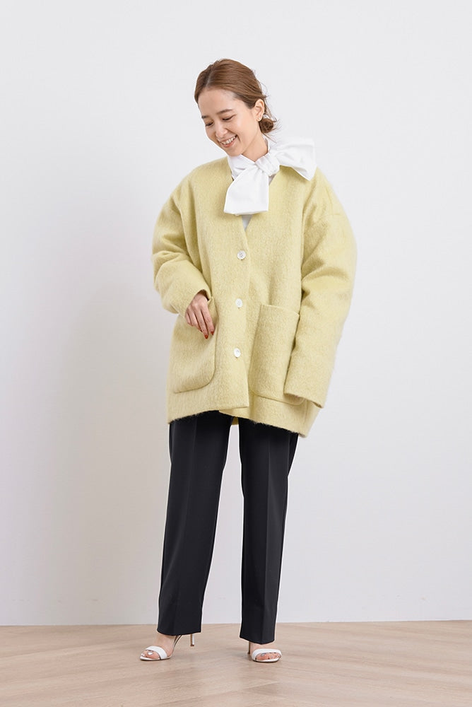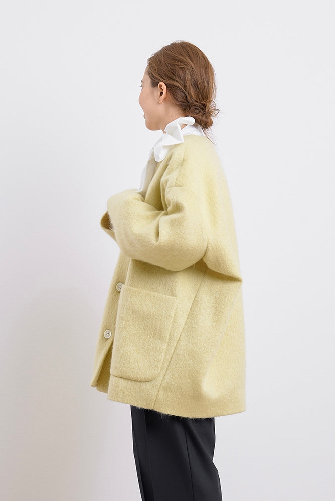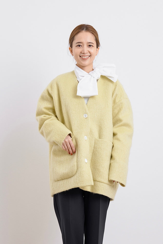 顔回りを華やかに魅せるyoriオリジナルカラーのライトイエローと女性らしい印象を与えるコーラルレッドが新作です。今期は防寒性と型崩れを防止する裏地付きにアップデート。表面がふっくらとした毛足のある優しいタッチと軽い着心地のシャギー素材を使用しています。ウールとモヘア独特の微光沢感と暖かさが特徴です。身体を包みこむようなたっぷりとした分量感、バックは裾に向かって細くなるコクーンシルエット。深めのV衿開きで着ぶくれせずスマートな印象でお召しになれます。ヒップが隠れる丈感でゆったりシルエットだから体が華奢見えします。 フロントに配した贅沢な貝ボタンもポイント。シンプルなスタイリングに羽織るだけでぐっとこなれた印象に。春先までお召し頂けます