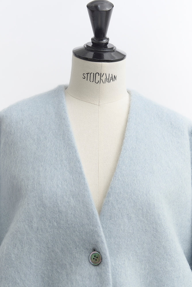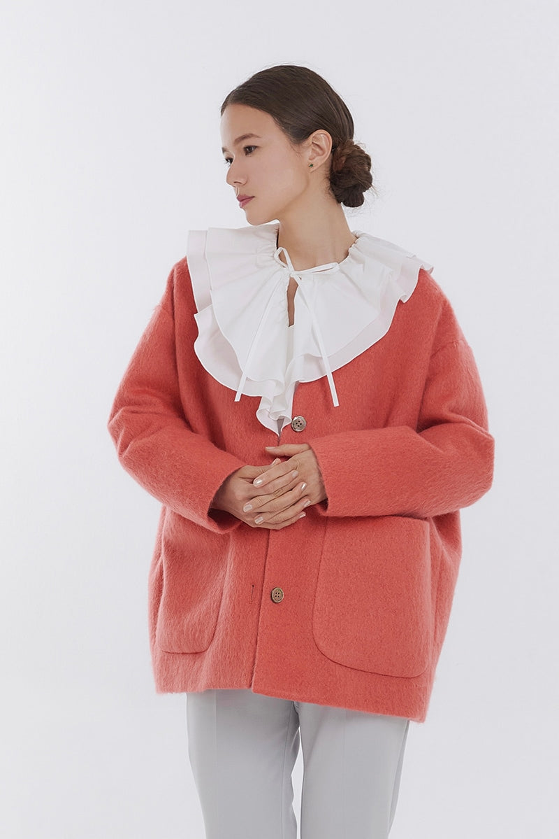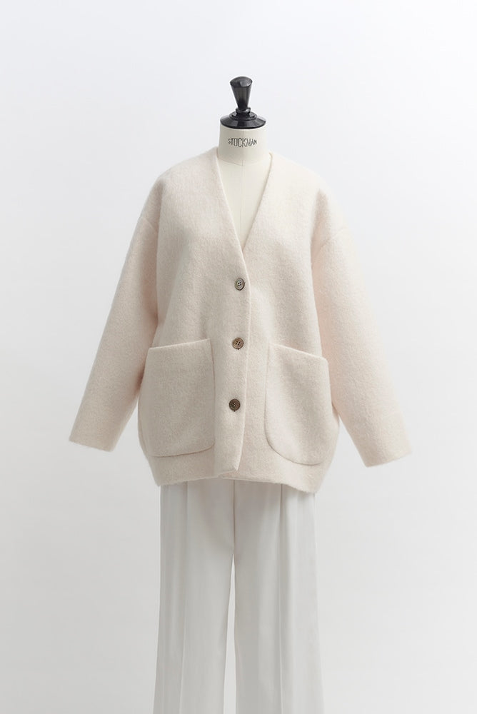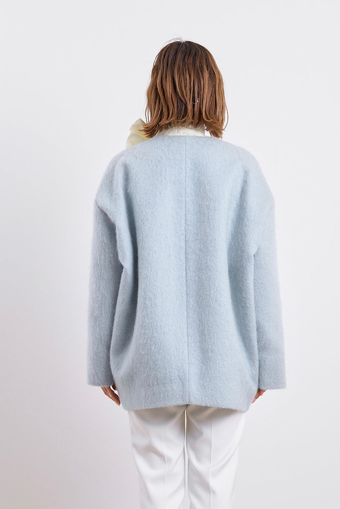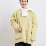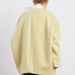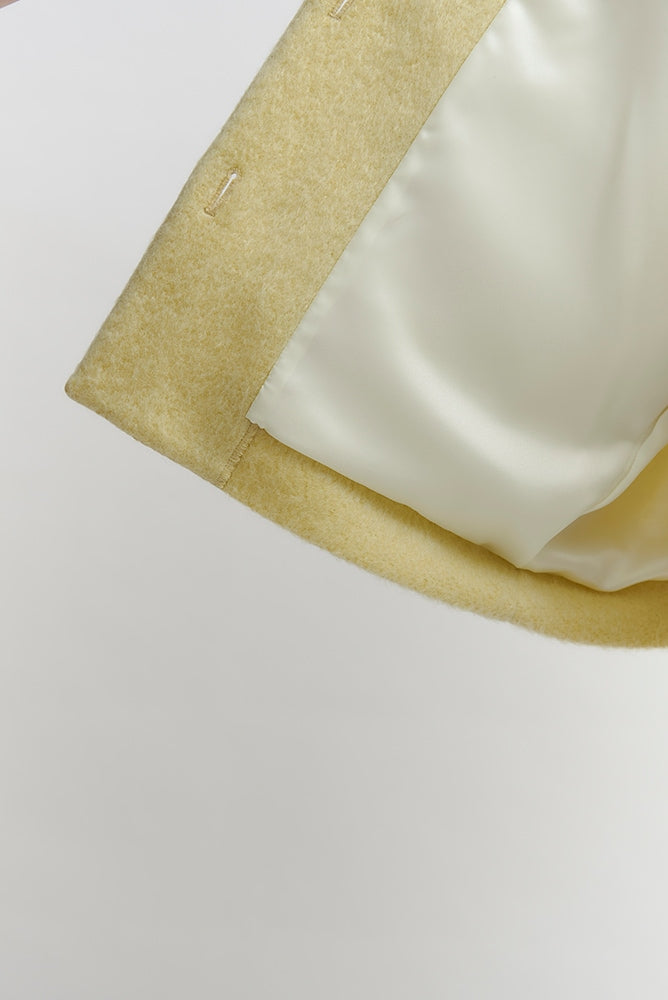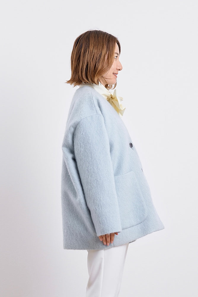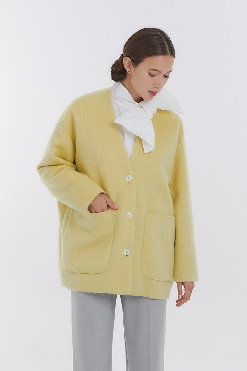 顔回りを華やかに魅せるyoriオリジナルカラーのライトイエローと女性らしい印象を与えるコーラルレッドが新作です。今期は防寒性と型崩れを防止する裏地付きにアップデート。表面がふっくらとした毛足のある優しいタッチと軽い着心地のシャギー素材を使用しています。ウールとモヘア独特の微光沢感と暖かさが特徴です。身体を包みこむようなたっぷりとした分量感、バックは裾に向かって細くなるコクーンシルエット。深めのV衿開きで着ぶくれせずスマートな印象でお召しになれます。ヒップが隠れる丈感でゆったりシルエットだから体が華奢見えします。 フロントに配した贅沢な貝ボタンもポイント。シンプルなスタイリングに羽織るだけでぐっとこなれた印象に。春先までお召し頂けます