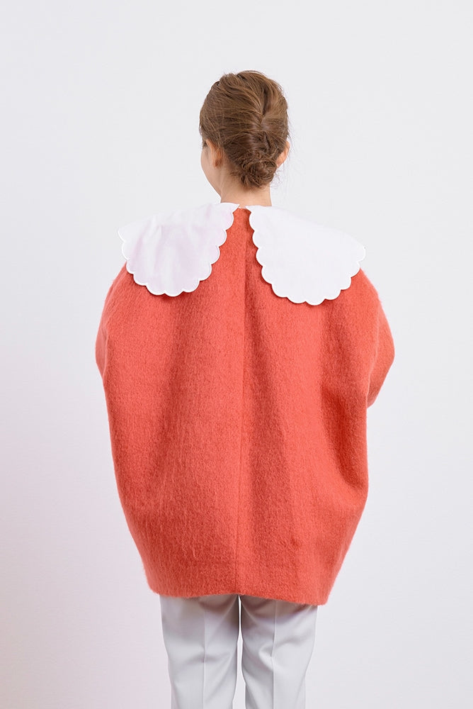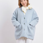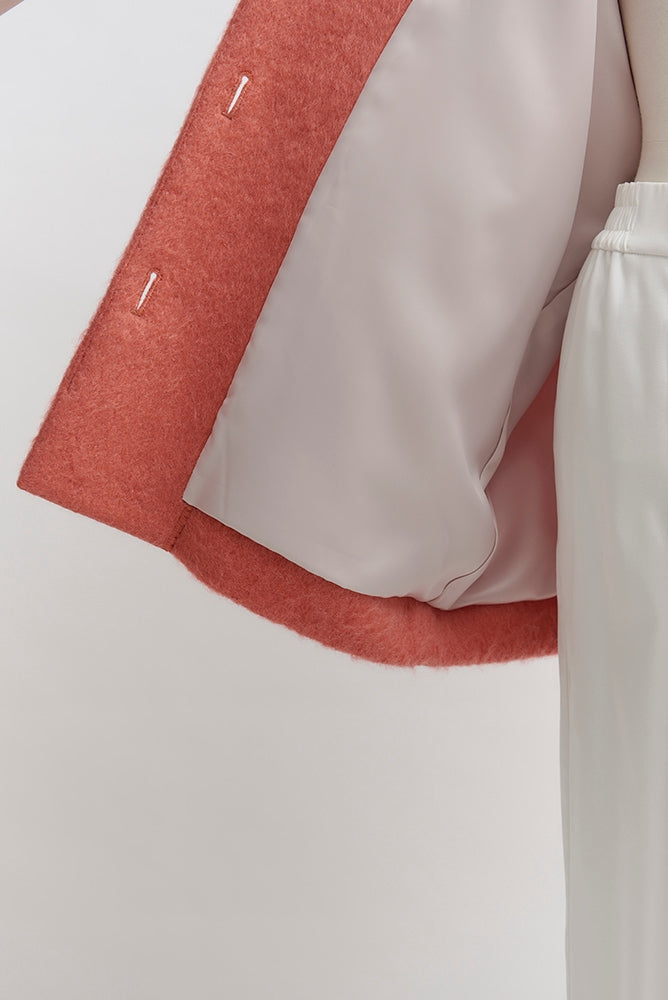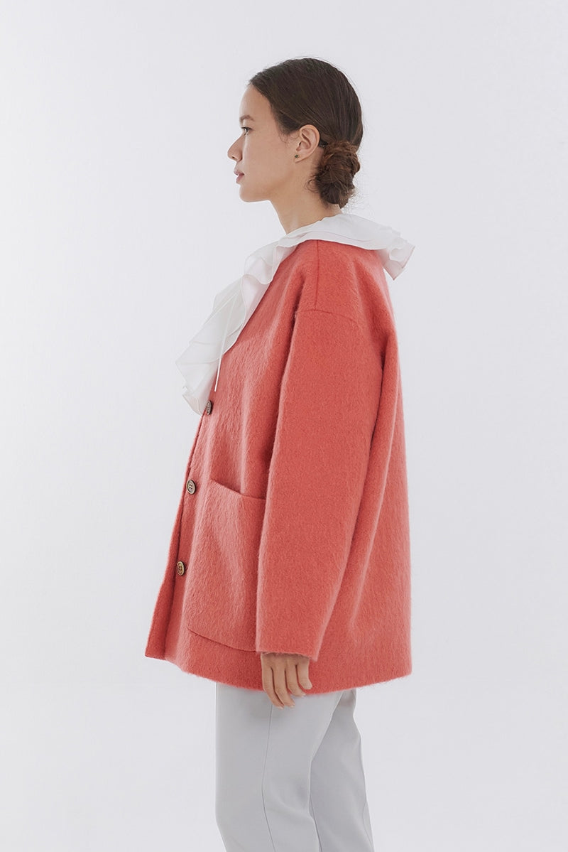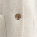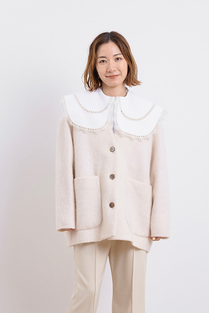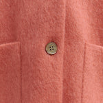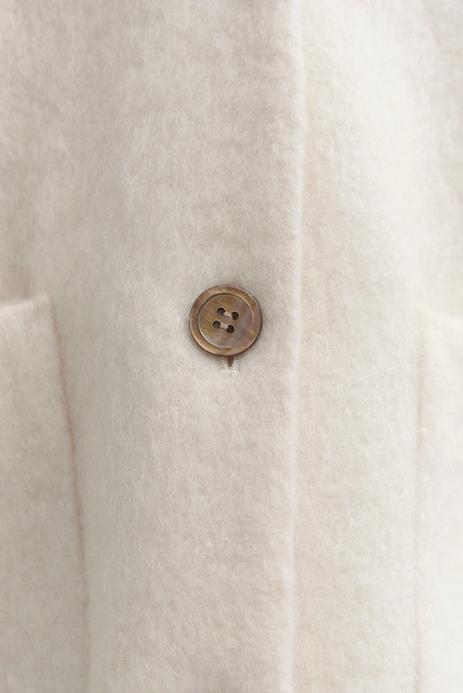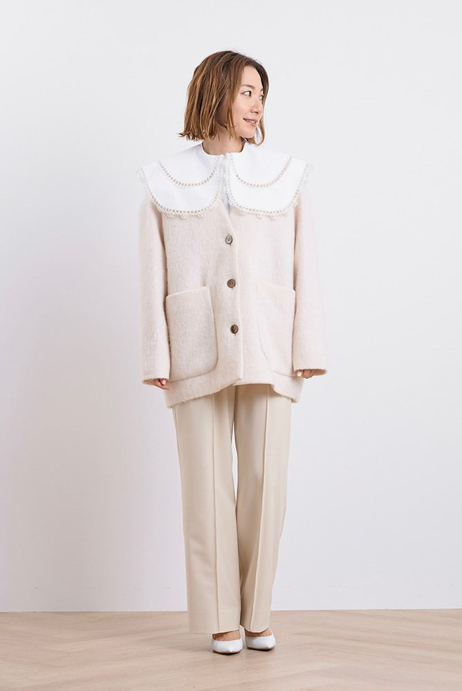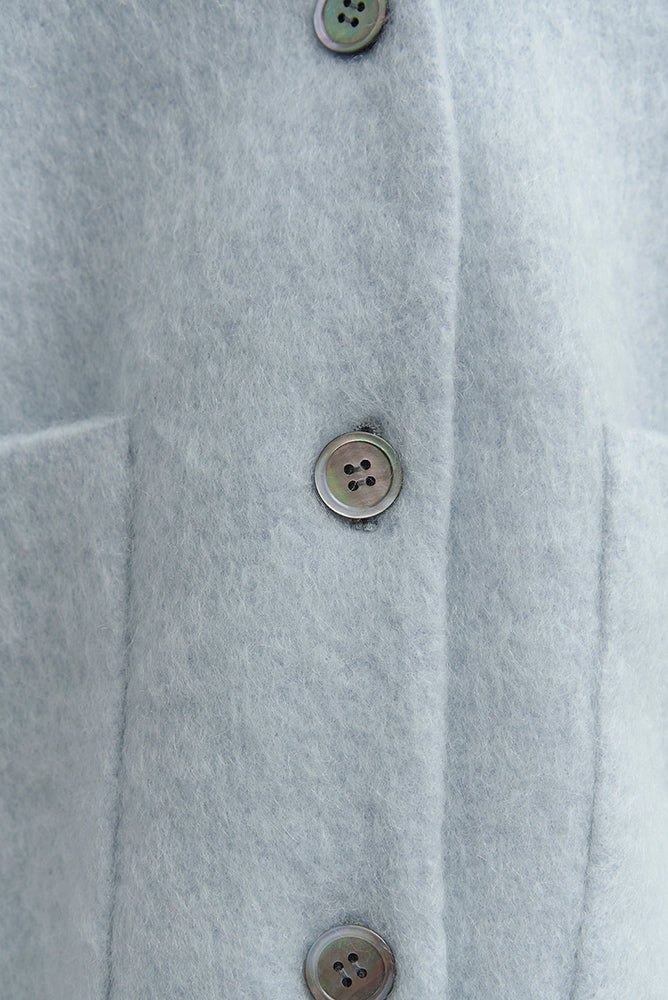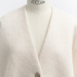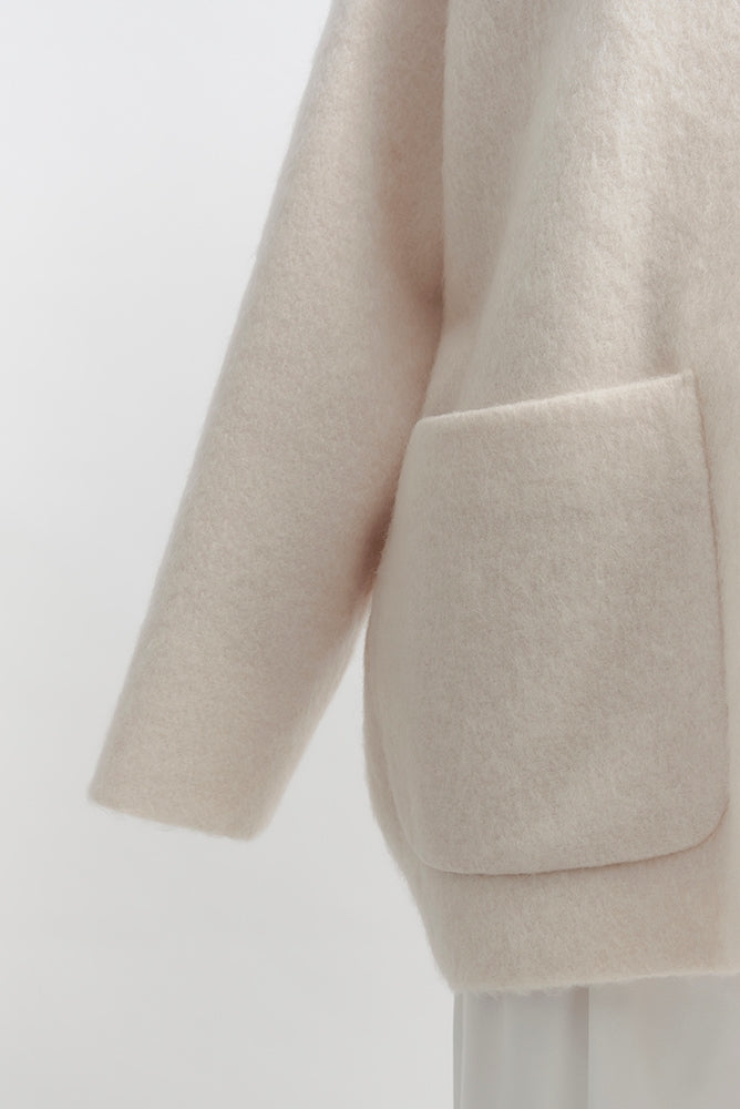 顔回りを華やかに魅せるyoriオリジナルカラーのライトイエローと女性らしい印象を与えるコーラルレッドが新作です。今期は防寒性と型崩れを防止する裏地付きにアップデート。表面がふっくらとした毛足のある優しいタッチと軽い着心地のシャギー素材を使用しています。ウールとモヘア独特の微光沢感と暖かさが特徴です。身体を包みこむようなたっぷりとした分量感、バックは裾に向かって細くなるコクーンシルエット。深めのV衿開きで着ぶくれせずスマートな印象でお召しになれます。ヒップが隠れる丈感でゆったりシルエットだから体が華奢見えします。 フロントに配した贅沢な貝ボタンもポイント。シンプルなスタイリングに羽織るだけでぐっとこなれた印象に。春先までお召し頂けます