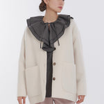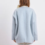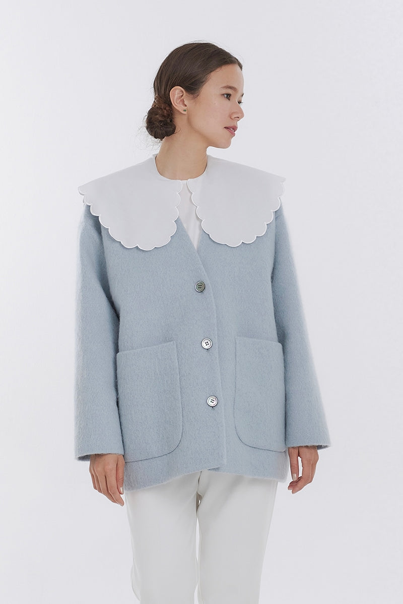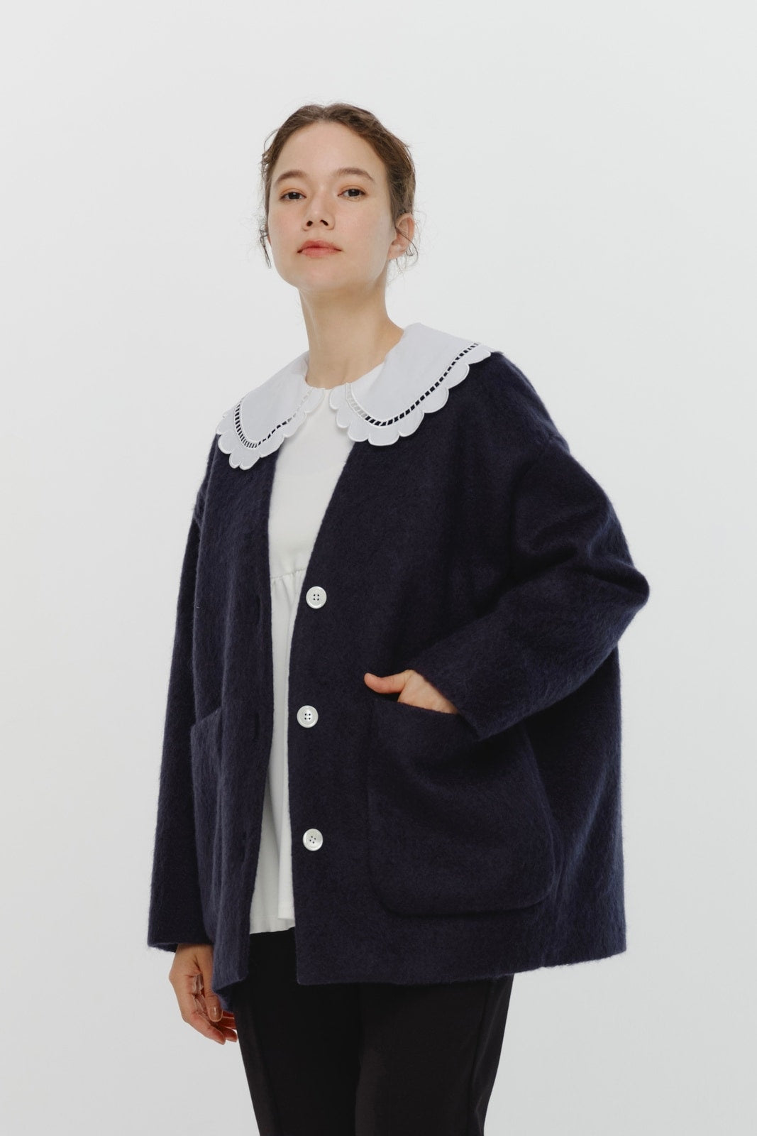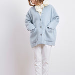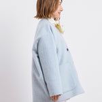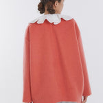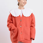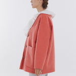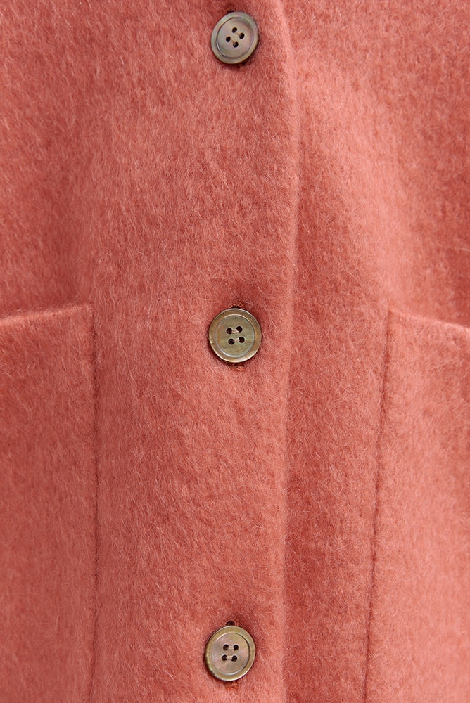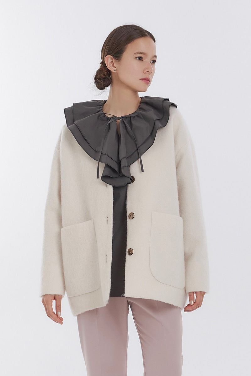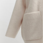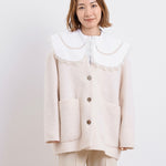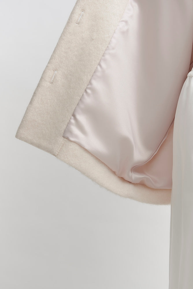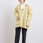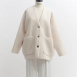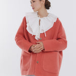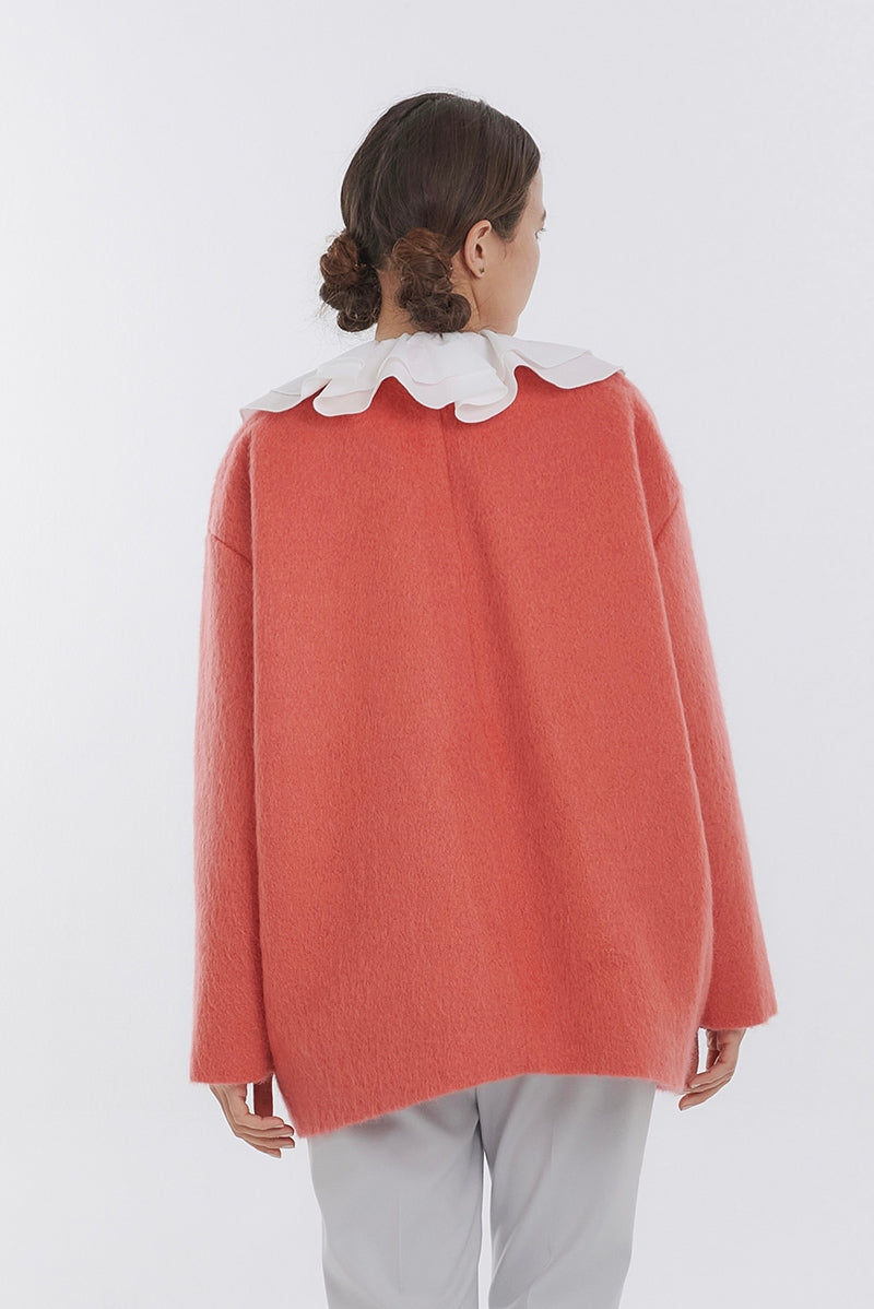 顔回りを華やかに魅せるyoriオリジナルカラーのライトイエローと女性らしい印象を与えるコーラルレッドが新作です。今期は防寒性と型崩れを防止する裏地付きにアップデート。表面がふっくらとした毛足のある優しいタッチと軽い着心地のシャギー素材を使用しています。ウールとモヘア独特の微光沢感と暖かさが特徴です。身体を包みこむようなたっぷりとした分量感、バックは裾に向かって細くなるコクーンシルエット。深めのV衿開きで着ぶくれせずスマートな印象でお召しになれます。ヒップが隠れる丈感でゆったりシルエットだから体が華奢見えします。 フロントに配した贅沢な貝ボタンもポイント。シンプルなスタイリングに羽織るだけでぐっとこなれた印象に。春先までお召し頂けます