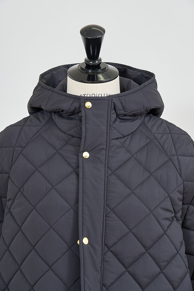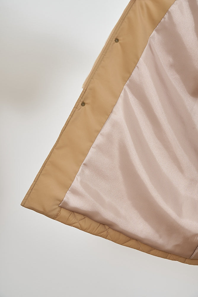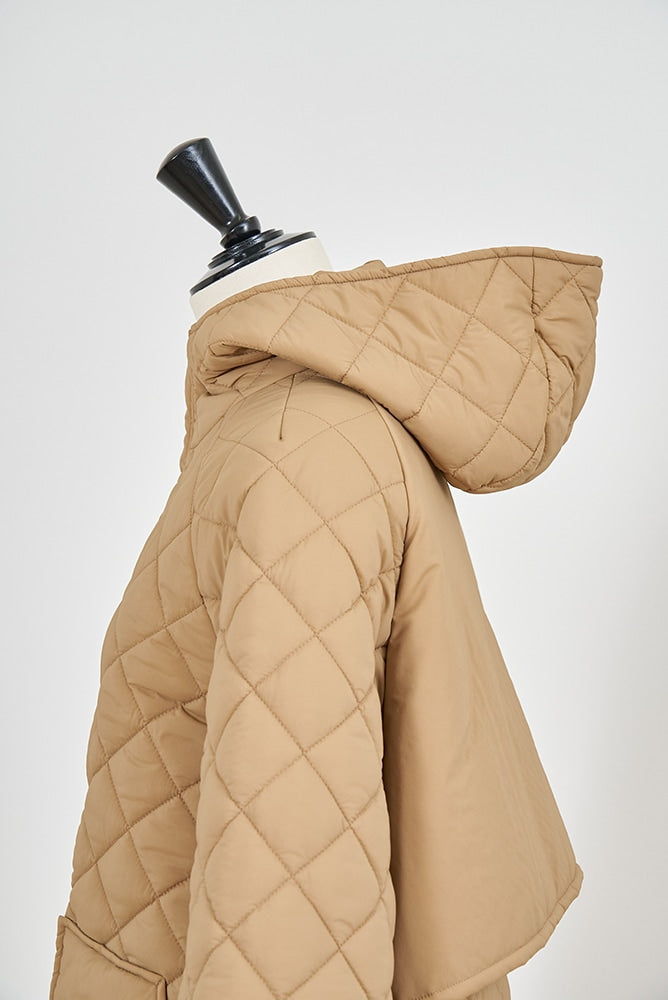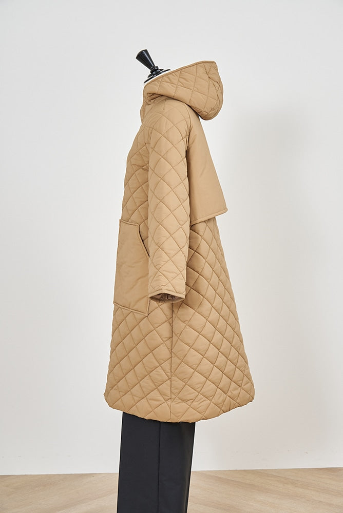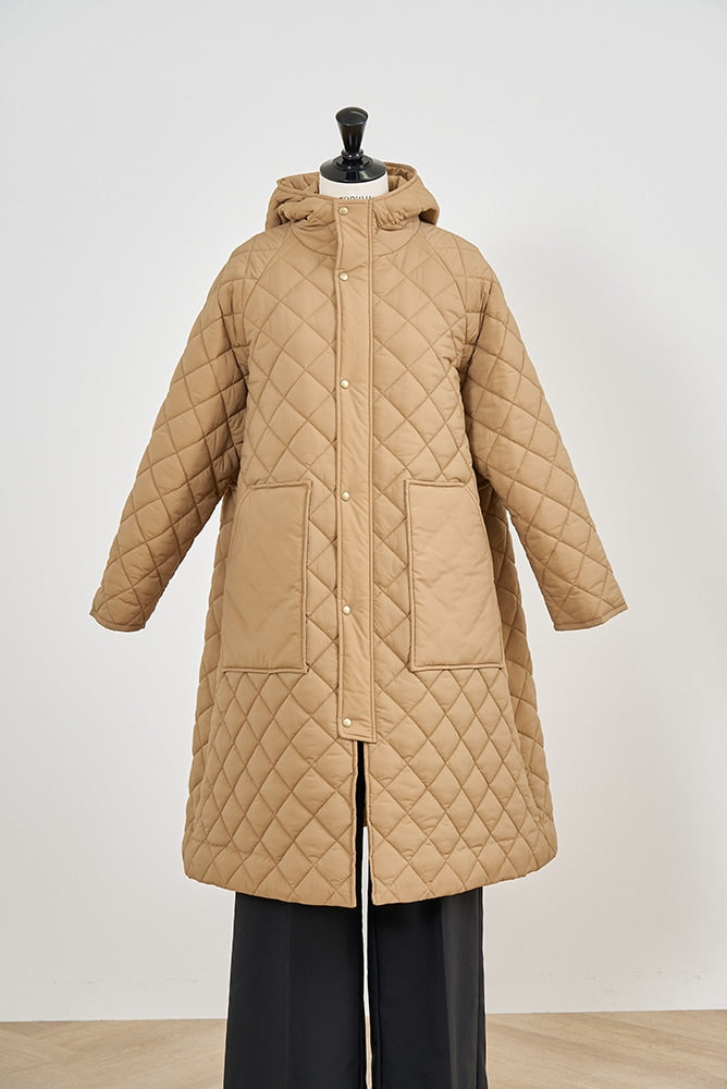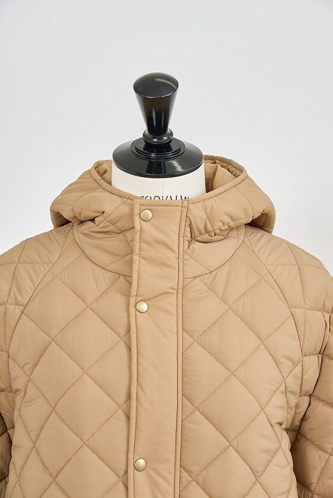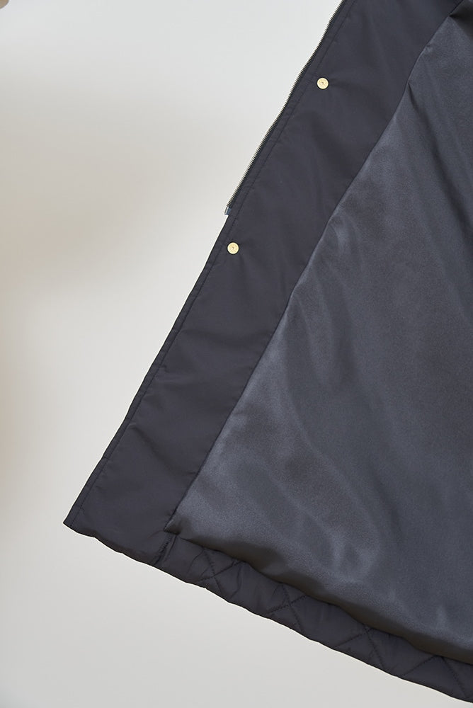 2022AWで人気のキルティングロングコートの生地を改良いたしました。表面をより柔らかな生地感にし撥水加工を施しています。ボリューミーなシルエットで見た目以上に軽くゆったりした着心地です。光り過ぎない上品なマットな風合いで撥水性と防風性、ナチュラル感があるきれいな表面感が魅力の生地です。広めのアームホールでニットを重ね着してもごわつきません。首元まで覆う高めのフードは保温性があります。やや控えめな長さの前ファスナーは足さばきがいいです。ラグランスリーブが柔らかで女性らしさを感じられる上品なデザインです。重ね着をしているような背面部分や前立て、前ポケットやフード裏はキルトステッチをなくす事でメリハリを持たせ、すっきりとした縦長効果があります。