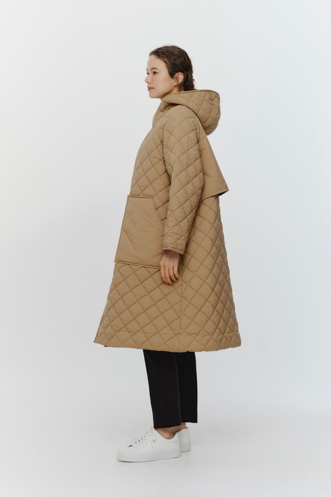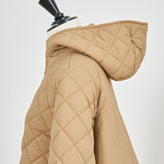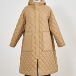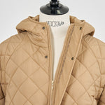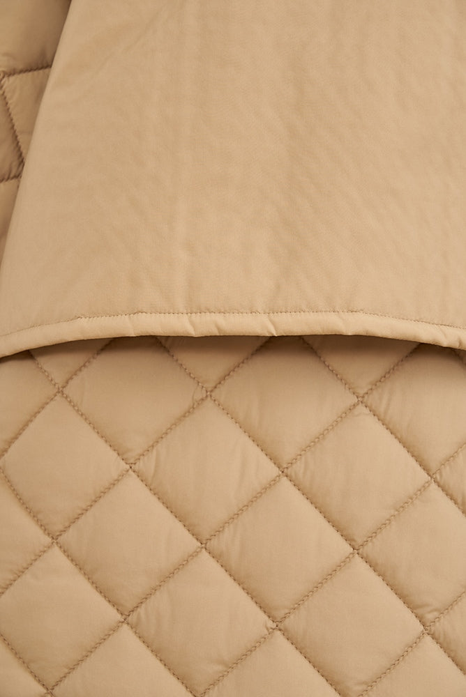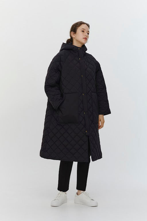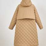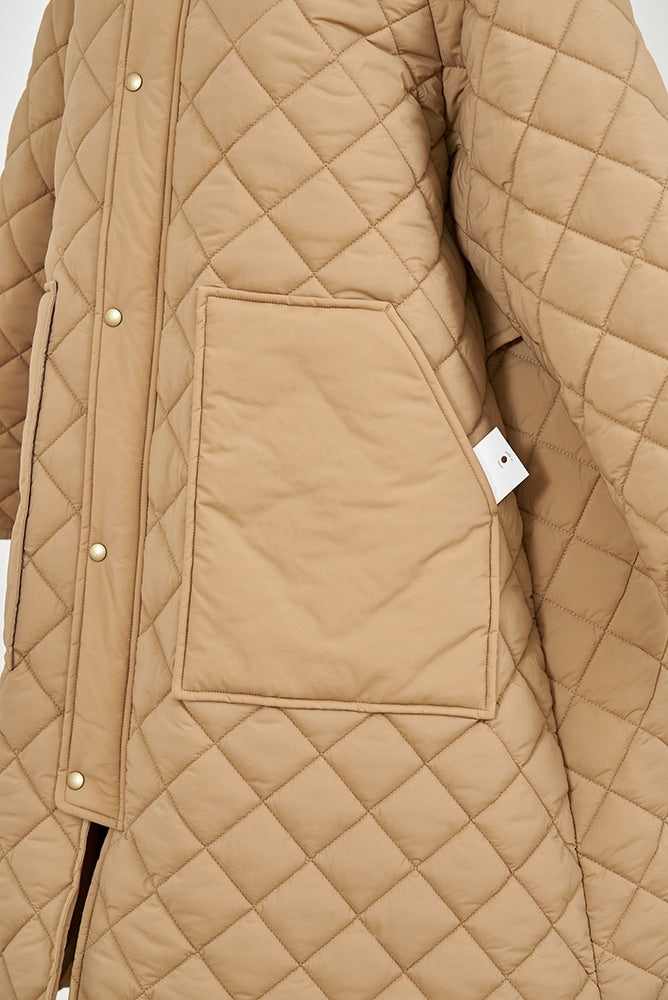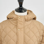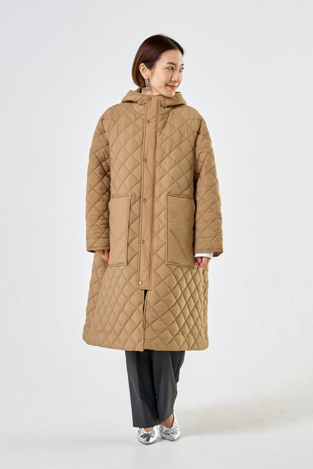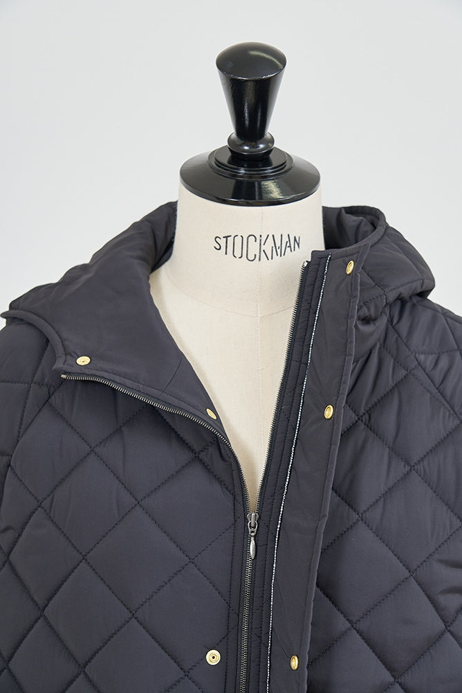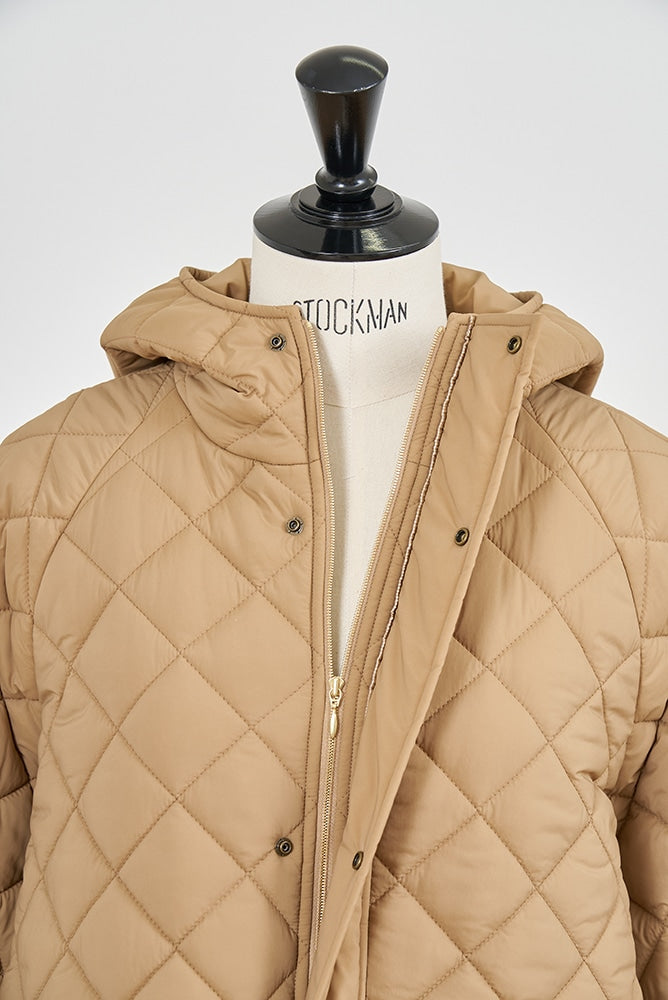 2022AWで人気のキルティングロングコートの生地を改良いたしました。表面をより柔らかな生地感にし撥水加工を施しています。ボリューミーなシルエットで見た目以上に軽くゆったりした着心地です。光り過ぎない上品なマットな風合いで撥水性と防風性、ナチュラル感があるきれいな表面感が魅力の生地です。広めのアームホールでニットを重ね着してもごわつきません。首元まで覆う高めのフードは保温性があります。やや控えめな長さの前ファスナーは足さばきがいいです。ラグランスリーブが柔らかで女性らしさを感じられる上品なデザインです。重ね着をしているような背面部分や前立て、前ポケットやフード裏はキルトステッチをなくす事でメリハリを持たせ、すっきりとした縦長効果があります。