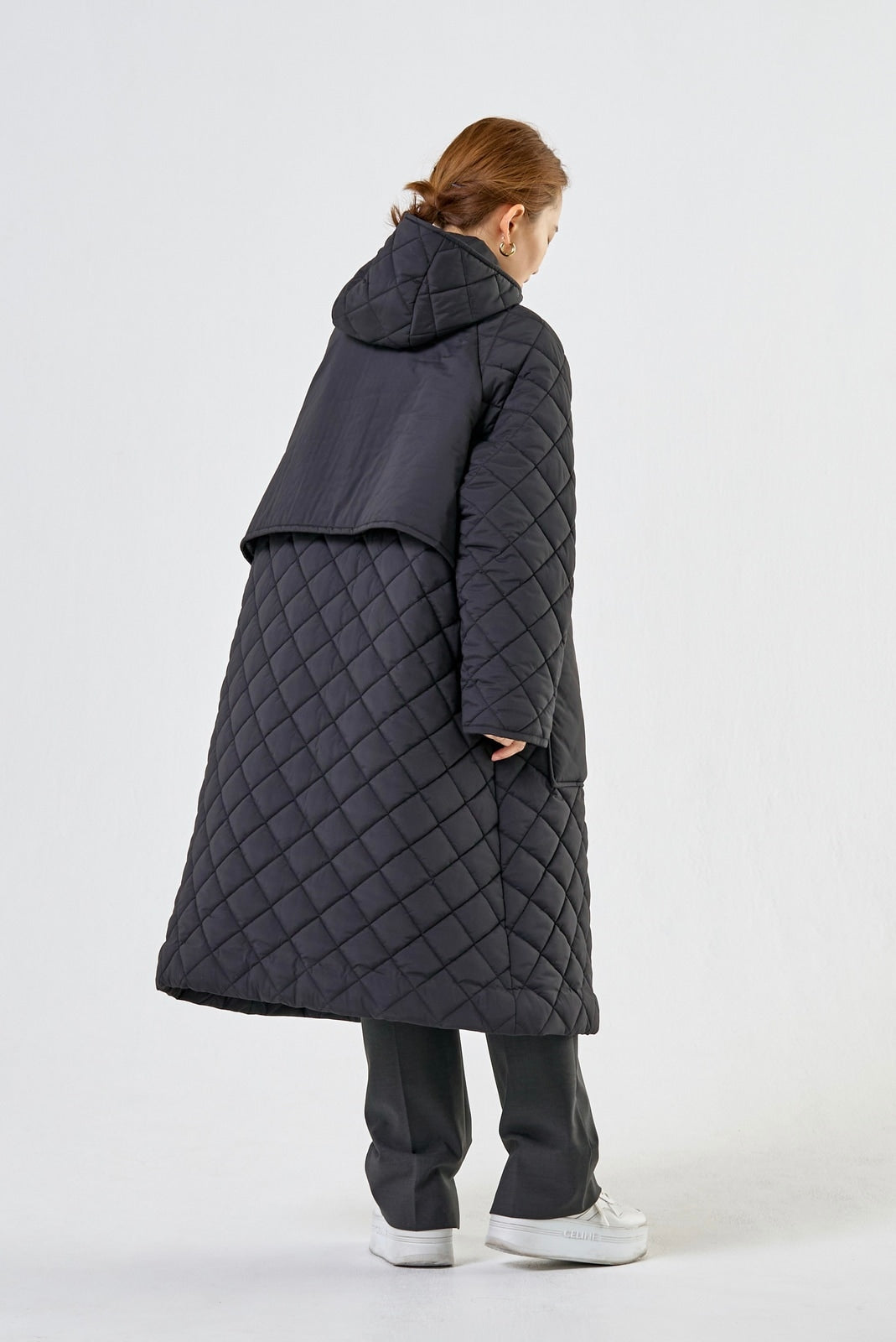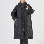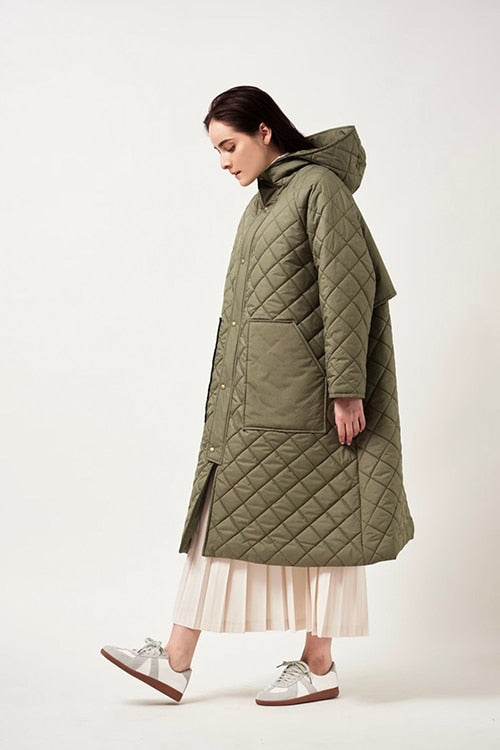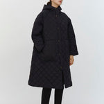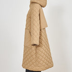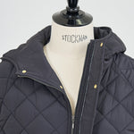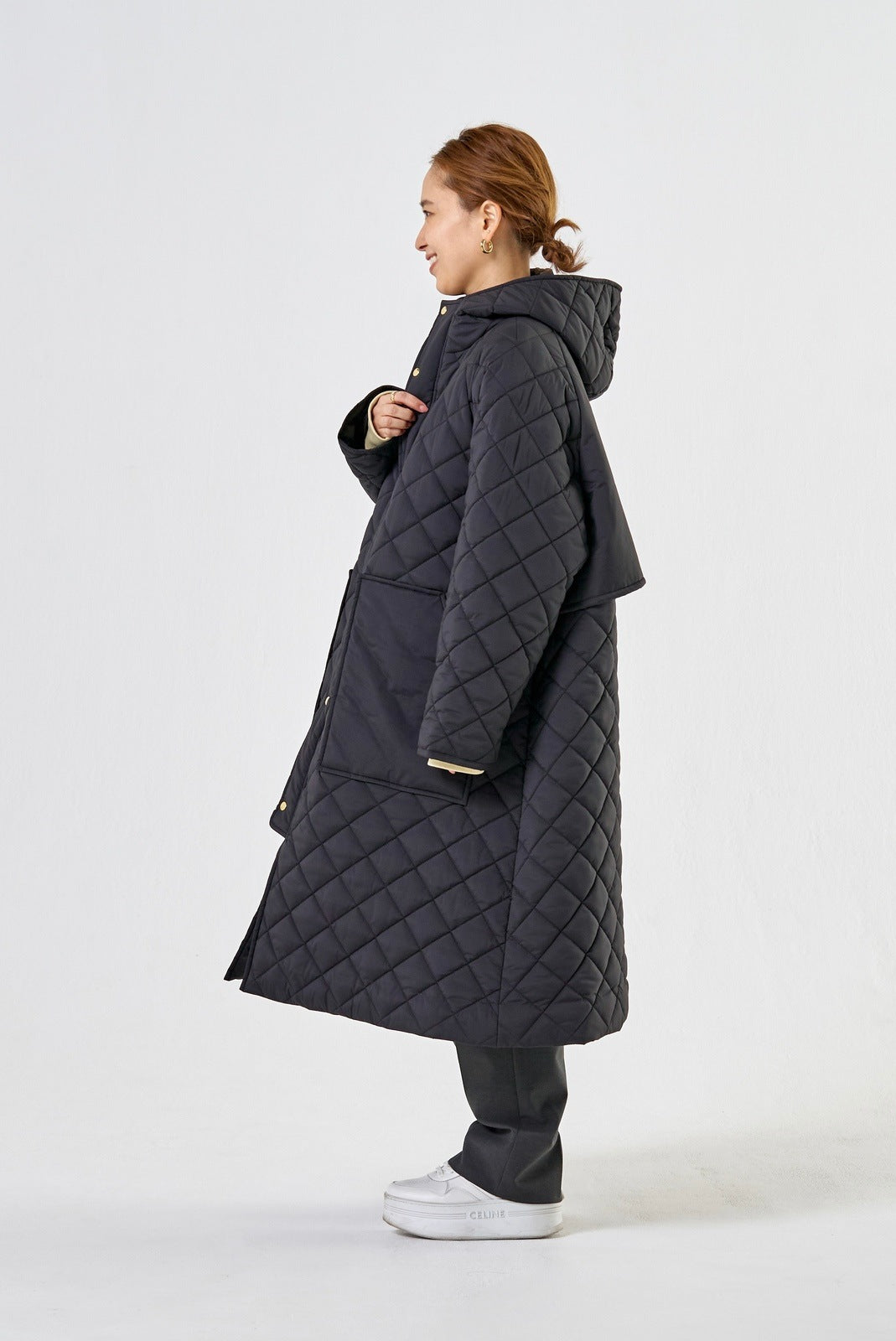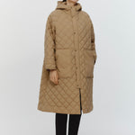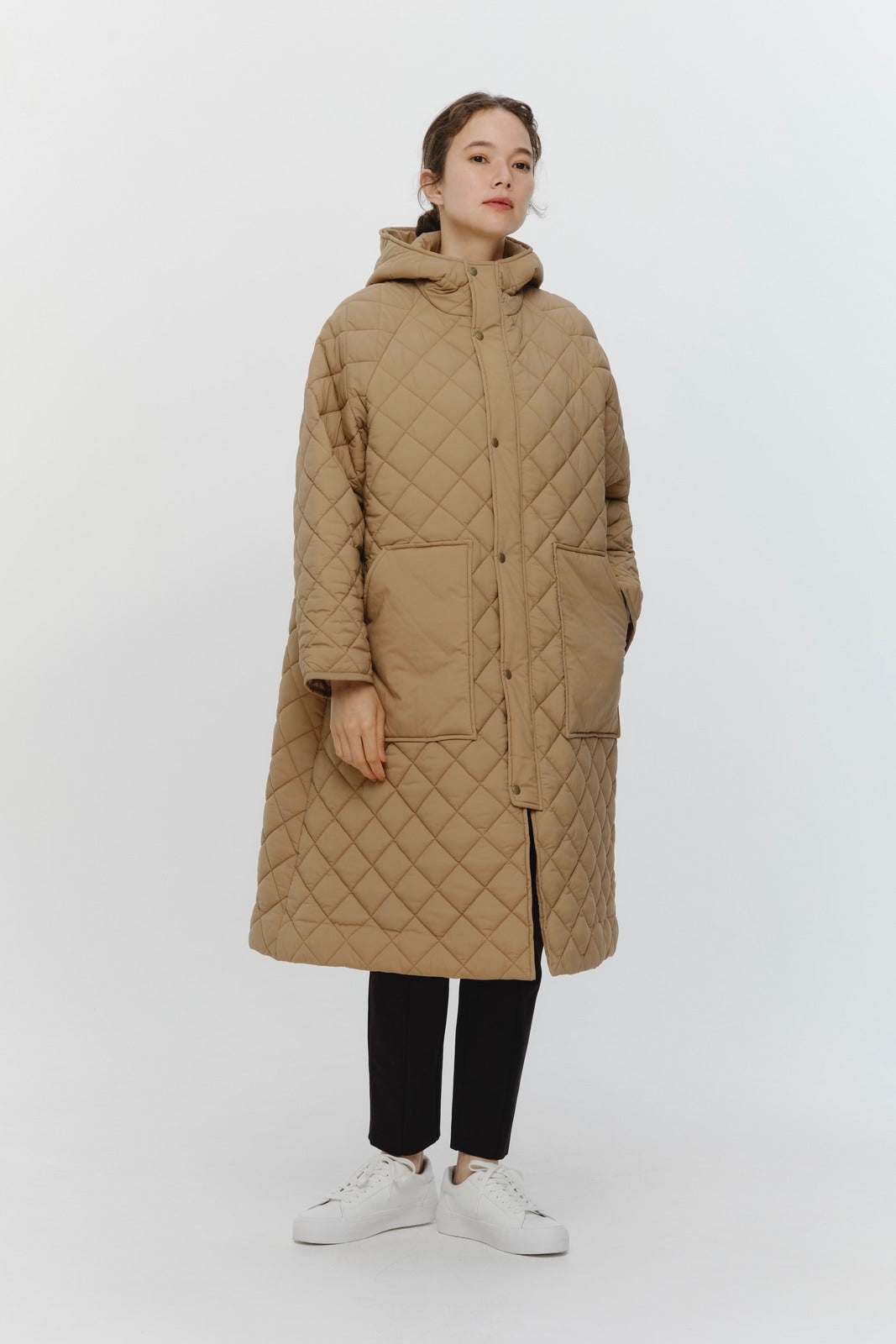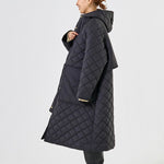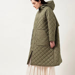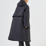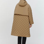 2022AWで人気のキルティングロングコートの生地を改良いたしました。表面をより柔らかな生地感にし撥水加工を施しています。ボリューミーなシルエットで見た目以上に軽くゆったりした着心地です。光り過ぎない上品なマットな風合いで撥水性と防風性、ナチュラル感があるきれいな表面感が魅力の生地です。広めのアームホールでニットを重ね着してもごわつきません。首元まで覆う高めのフードは保温性があります。やや控えめな長さの前ファスナーは足さばきがいいです。ラグランスリーブが柔らかで女性らしさを感じられる上品なデザインです。重ね着をしているような背面部分や前立て、前ポケットやフード裏はキルトステッチをなくす事でメリハリを持たせ、すっきりとした縦長効果があります。