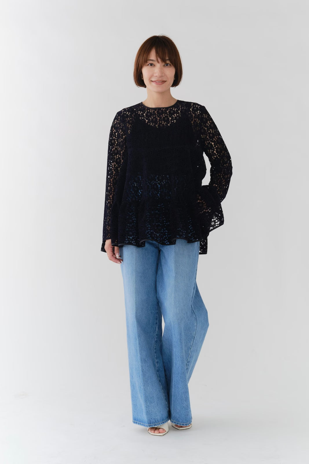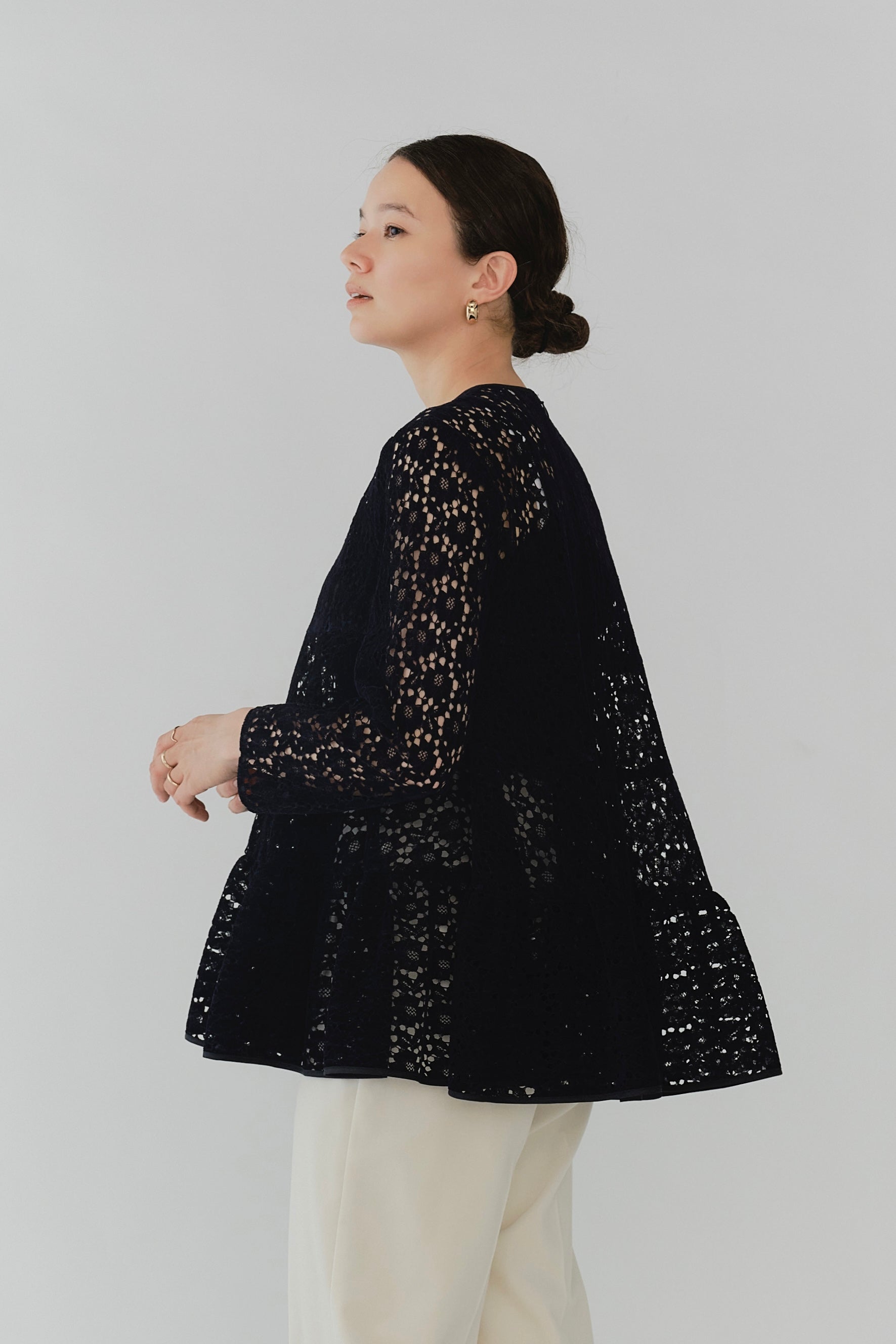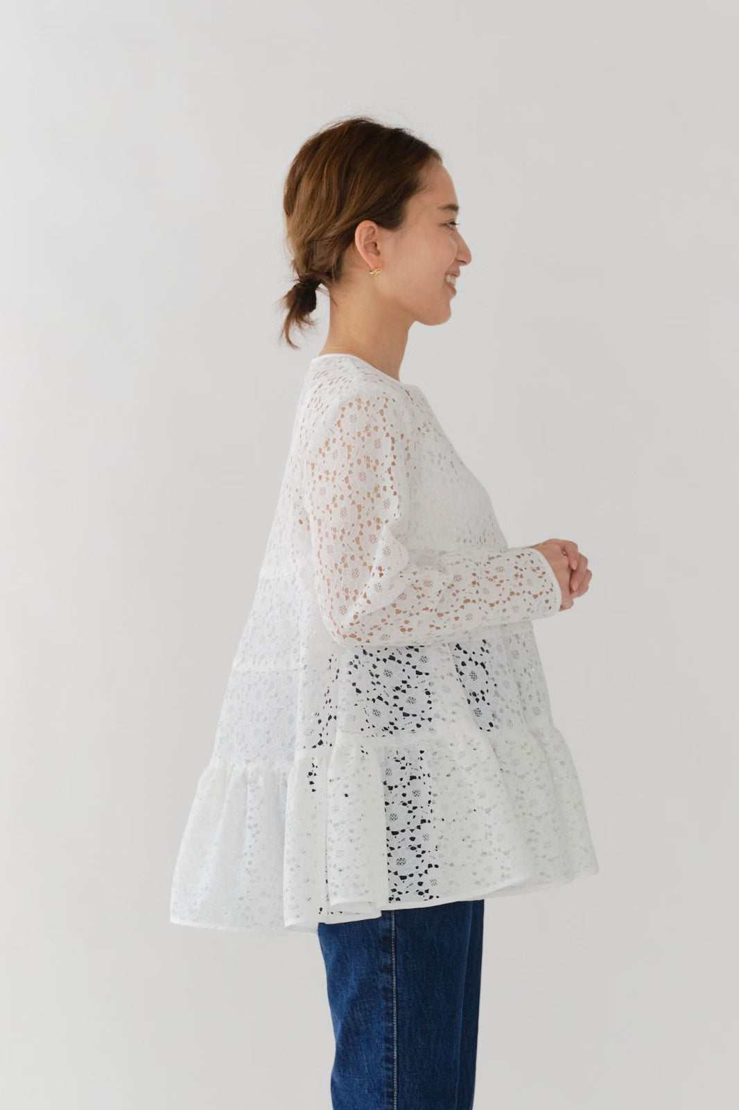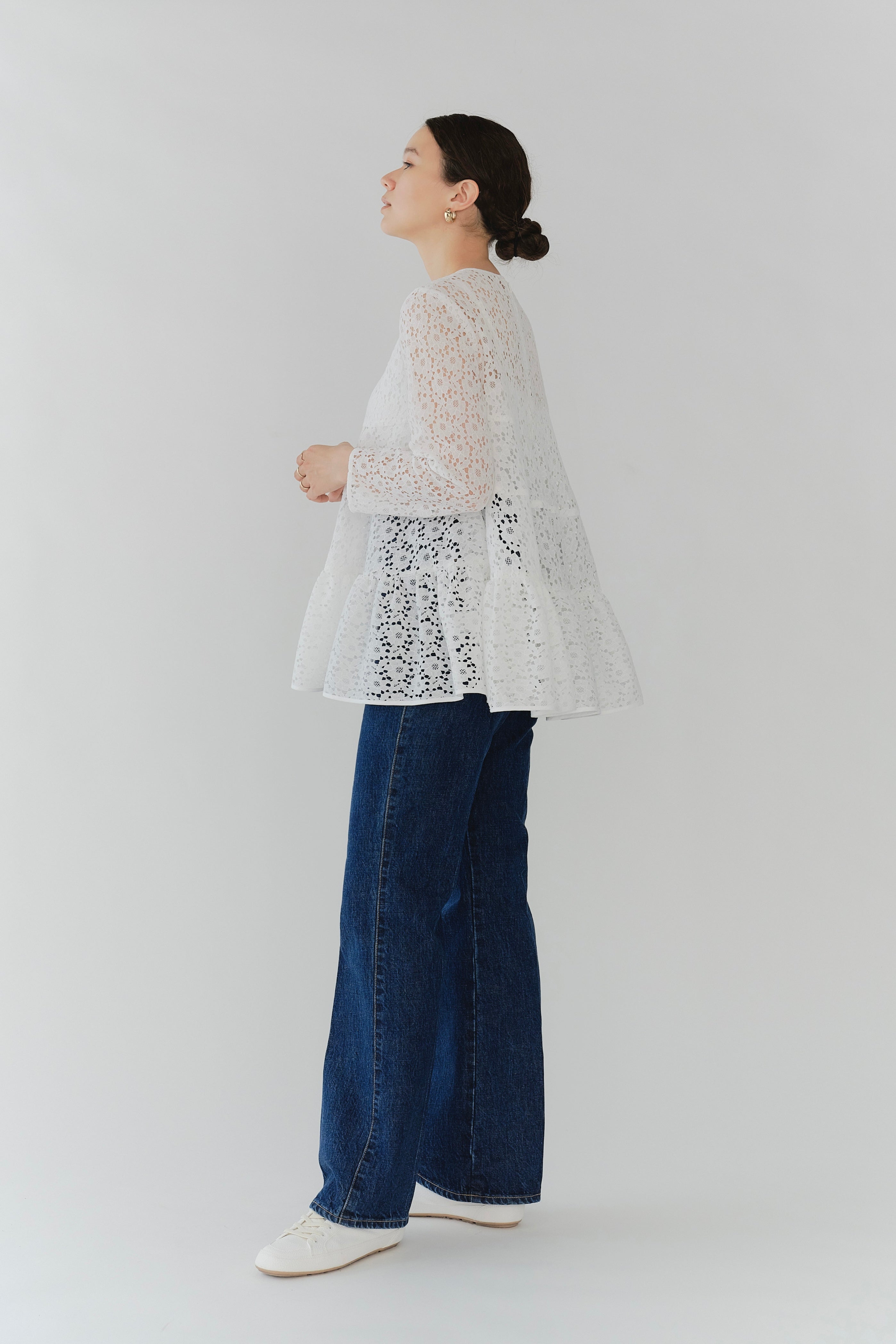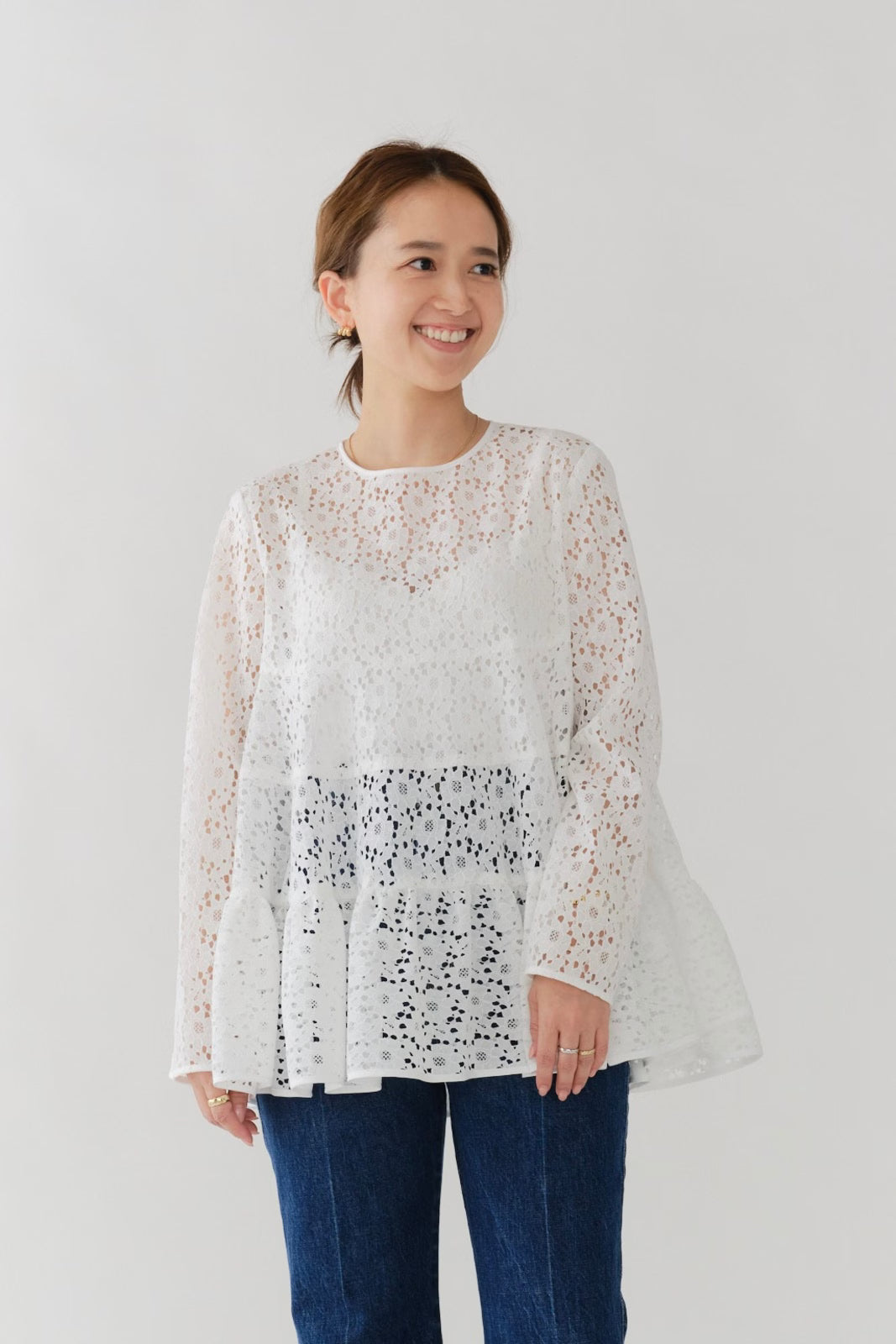 オリジナルの繊細なフロッキーレース生地を贅沢に使用したティアードブラウス。満開に咲く花々を思わせる優しいレースにふんわりと立体感を添えるフロッキー加工が、奥行きのある可憐な表情を生み出します。たっぷりと生地を使ったボリュームのあるティアードシルエットが動くたびに揺れ、華やかさを引き立てながらもレースによる透け感が甘すぎない上品な印象に。デニムと合わせて程よくカジュアルに、きれいめなボトムスと合わせてフォーマルなお席にも。ロンTeeやタートルと合わせてレースからインナーをほんのりと覗かせるスタイリングもこなれ感がプラスされておすすめです。およばれやオケージョンシーンにも映える特別感のあるアイテムです。