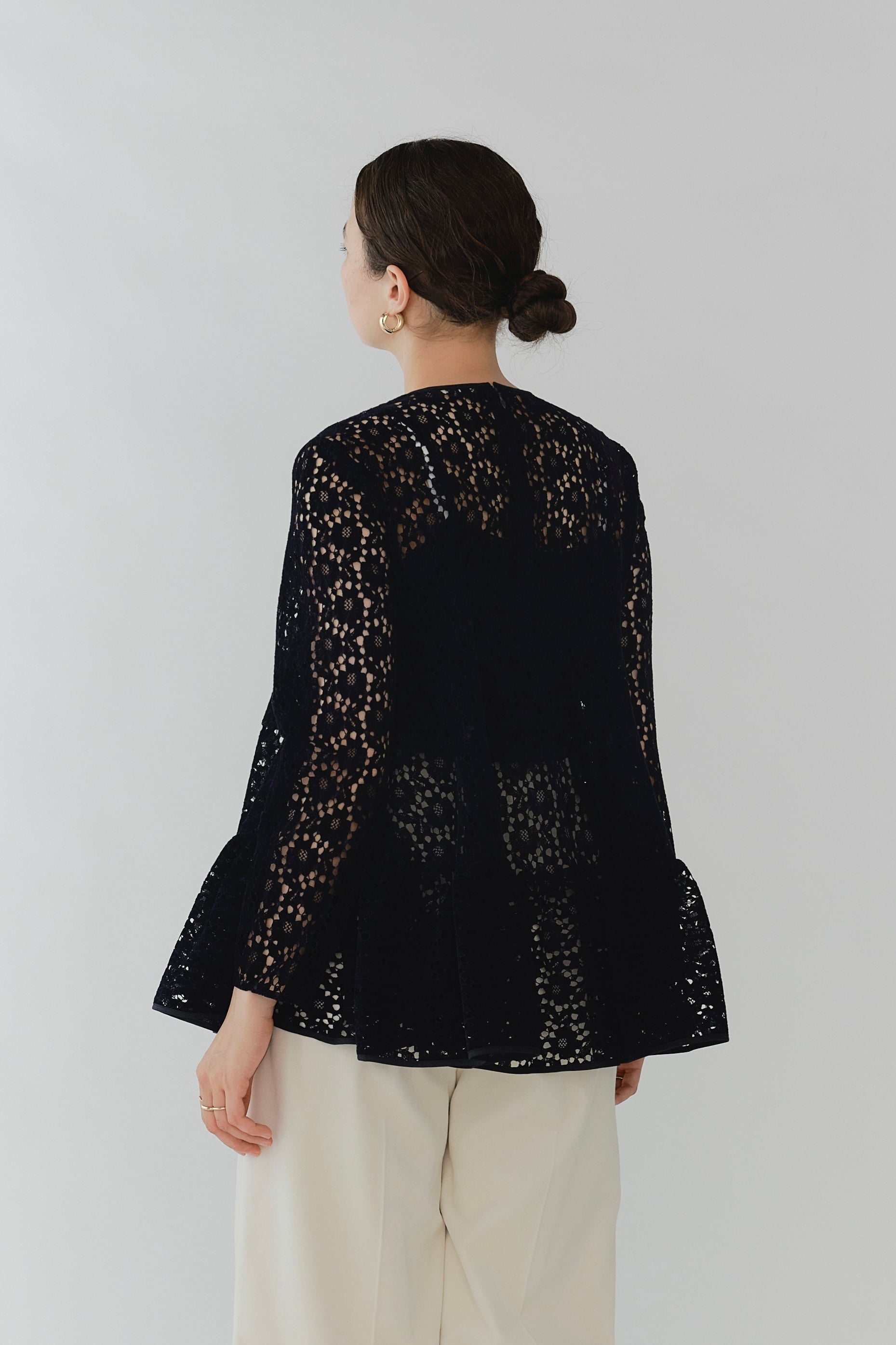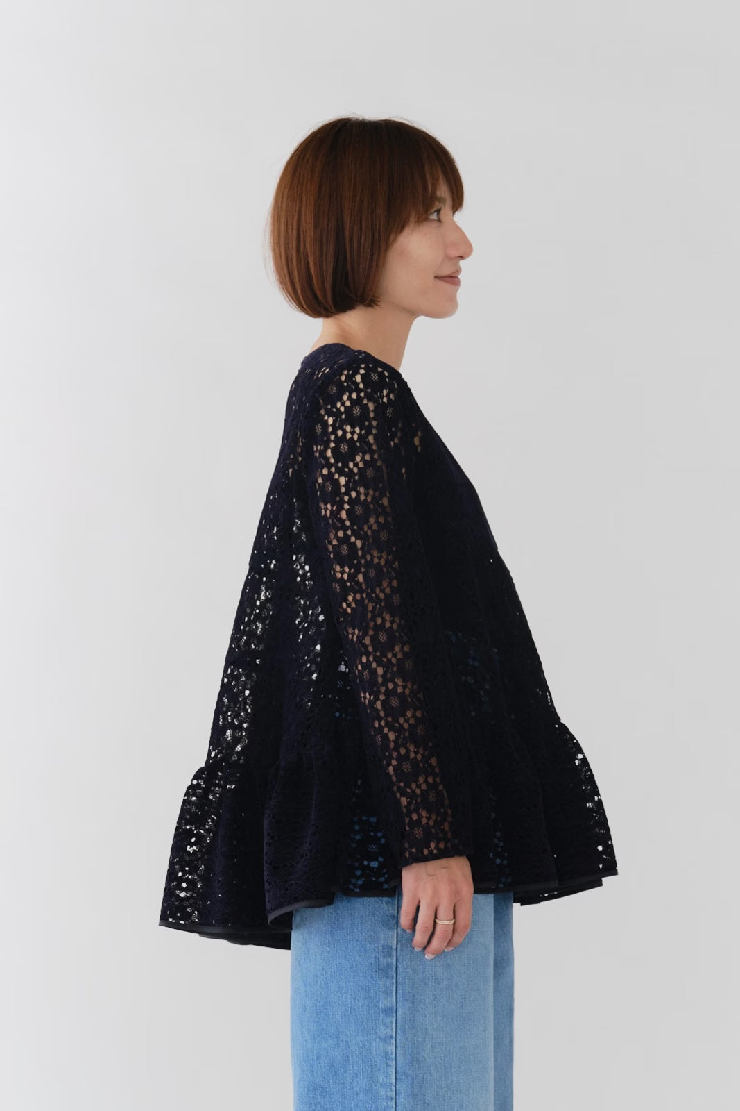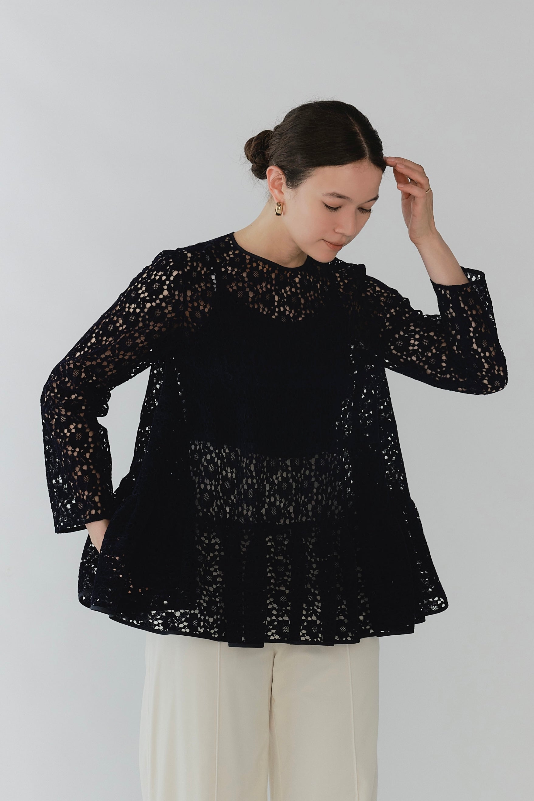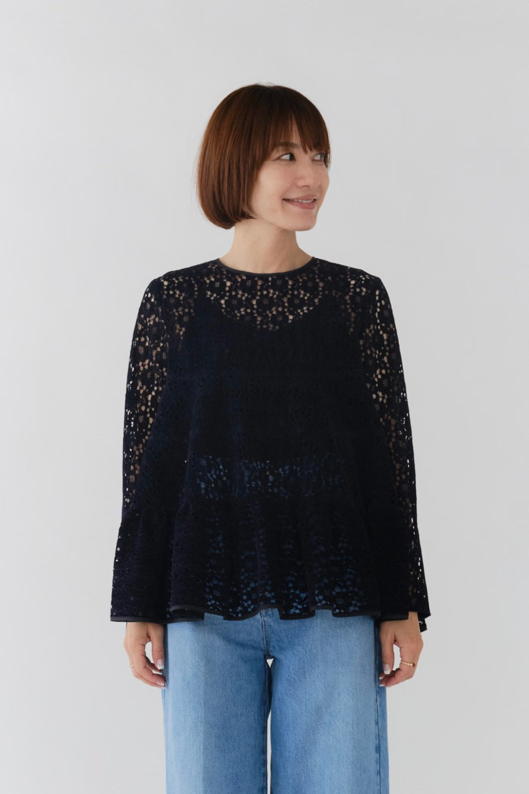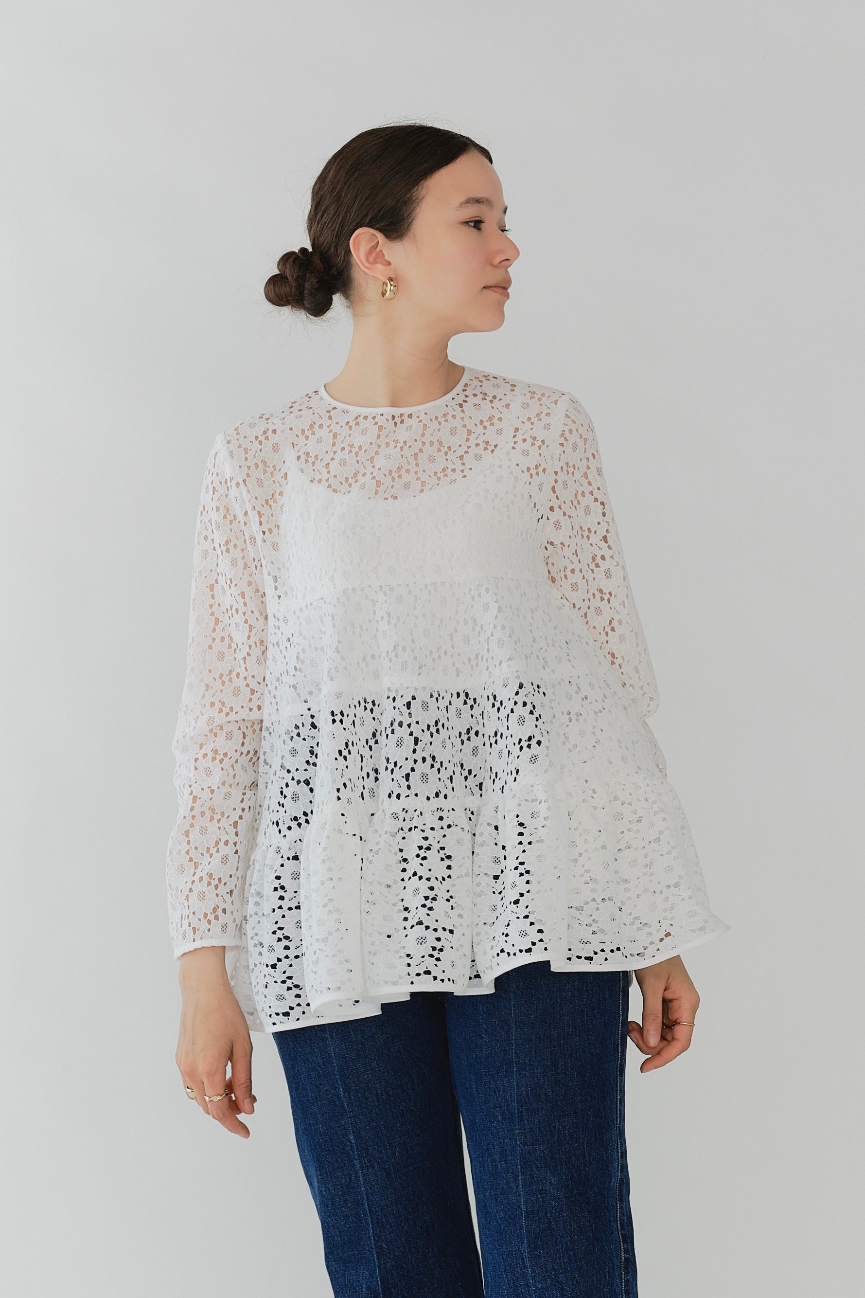 オリジナルの繊細なフロッキーレース生地を贅沢に使用したティアードブラウス。満開に咲く花々を思わせる優しいレースにふんわりと立体感を添えるフロッキー加工が、奥行きのある可憐な表情を生み出します。たっぷりと生地を使ったボリュームのあるティアードシルエットが動くたびに揺れ、華やかさを引き立てながらもレースによる透け感が甘すぎない上品な印象に。デニムと合わせて程よくカジュアルに、きれいめなボトムスと合わせてフォーマルなお席にも。ロンTeeやタートルと合わせてレースからインナーをほんのりと覗かせるスタイリングもこなれ感がプラスされておすすめです。およばれやオケージョンシーンにも映える特別感のあるアイテムです。