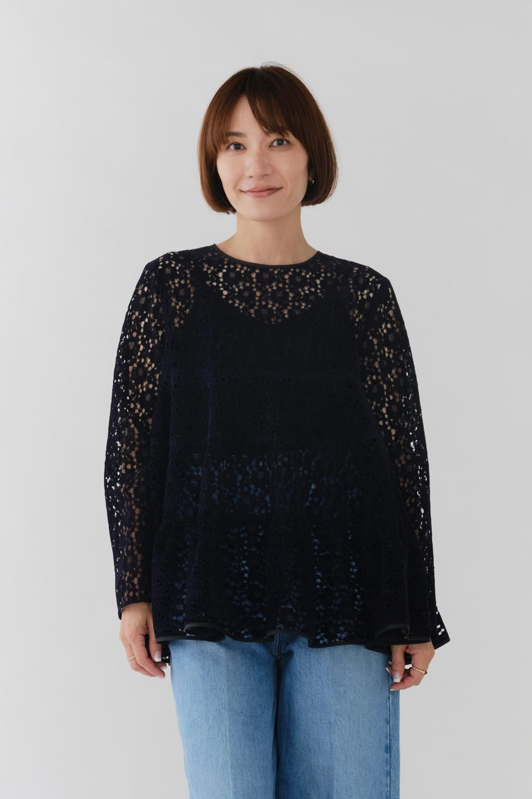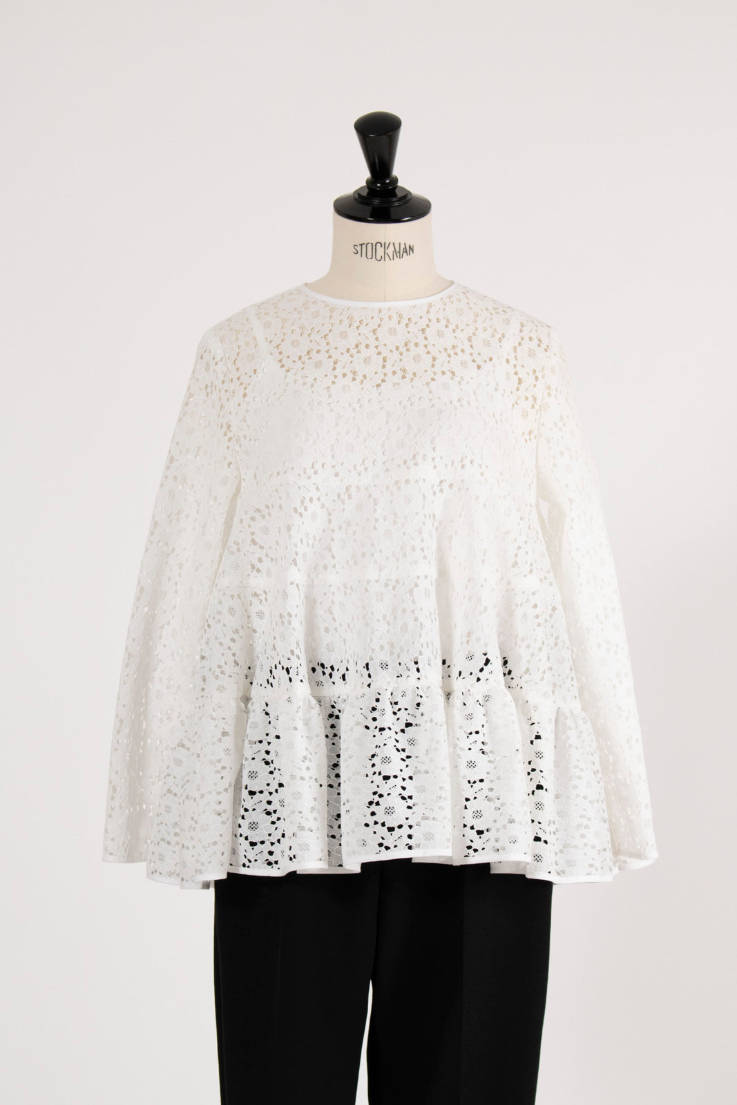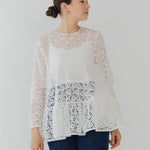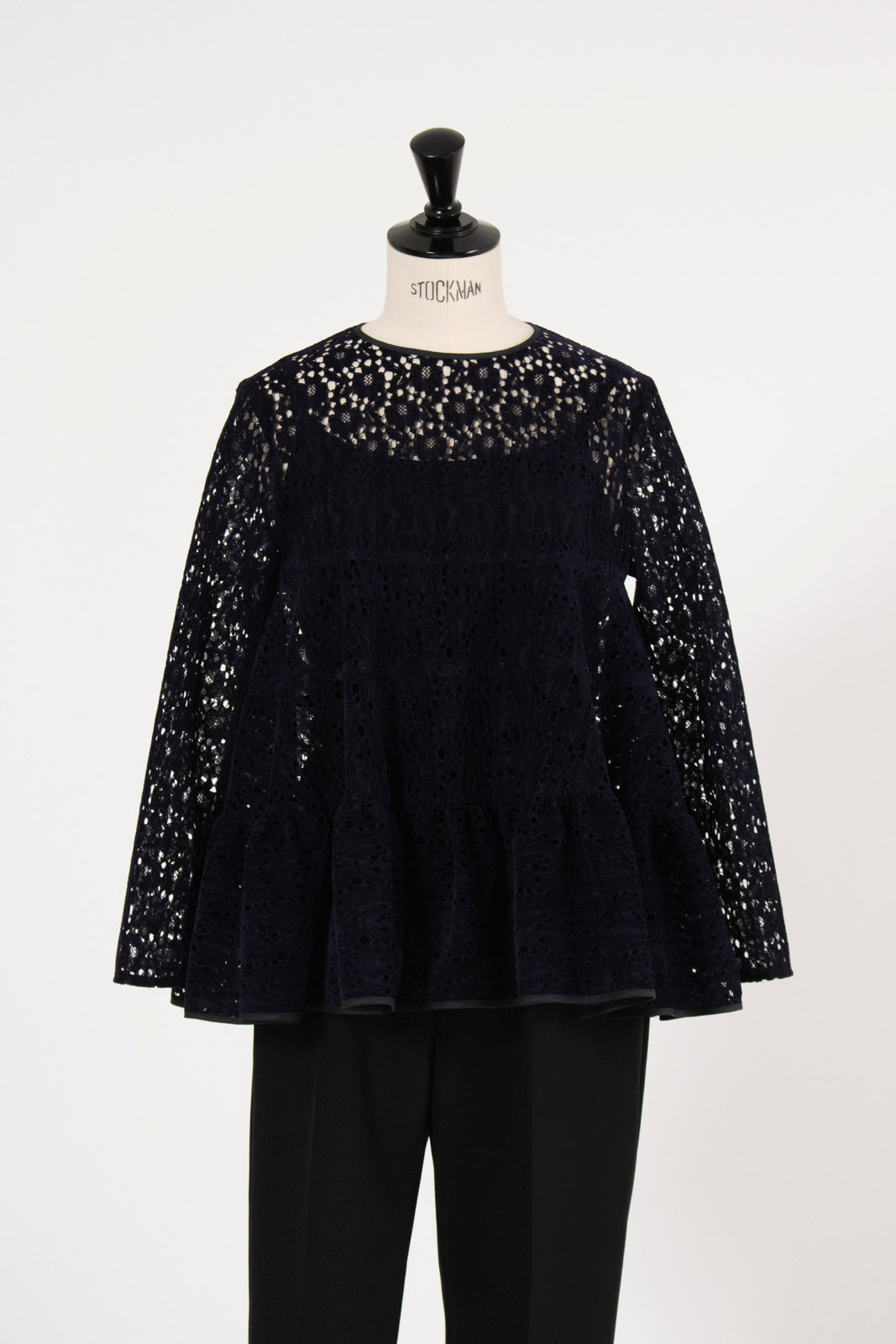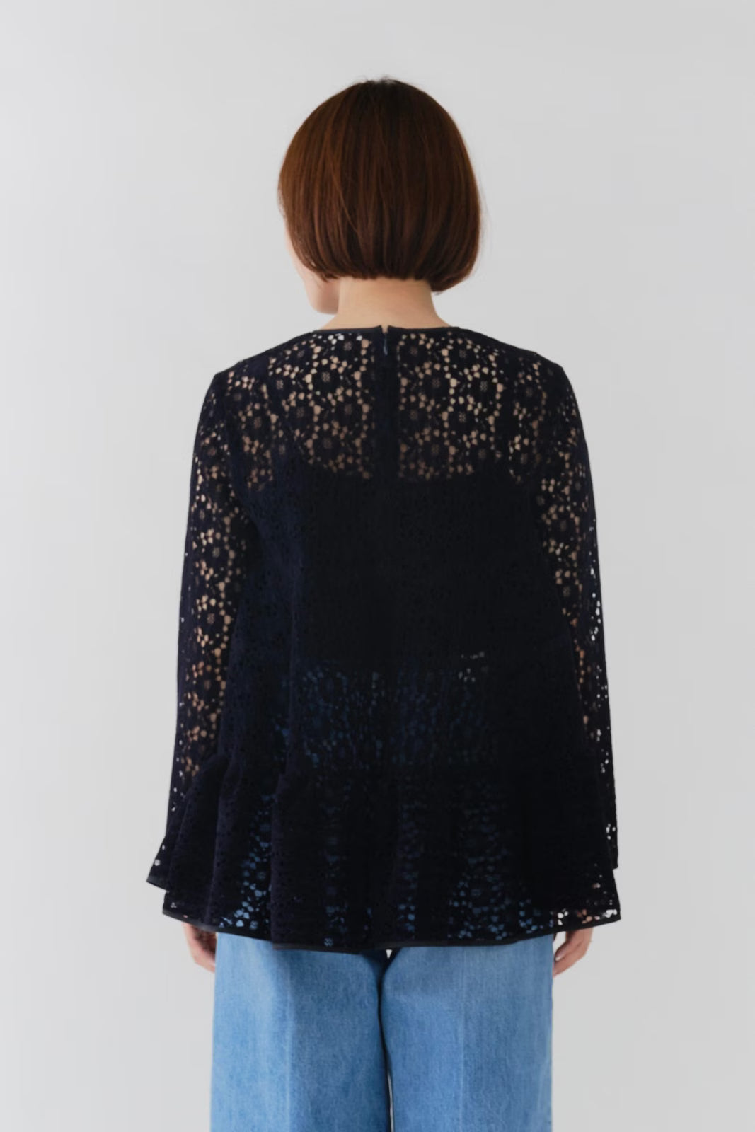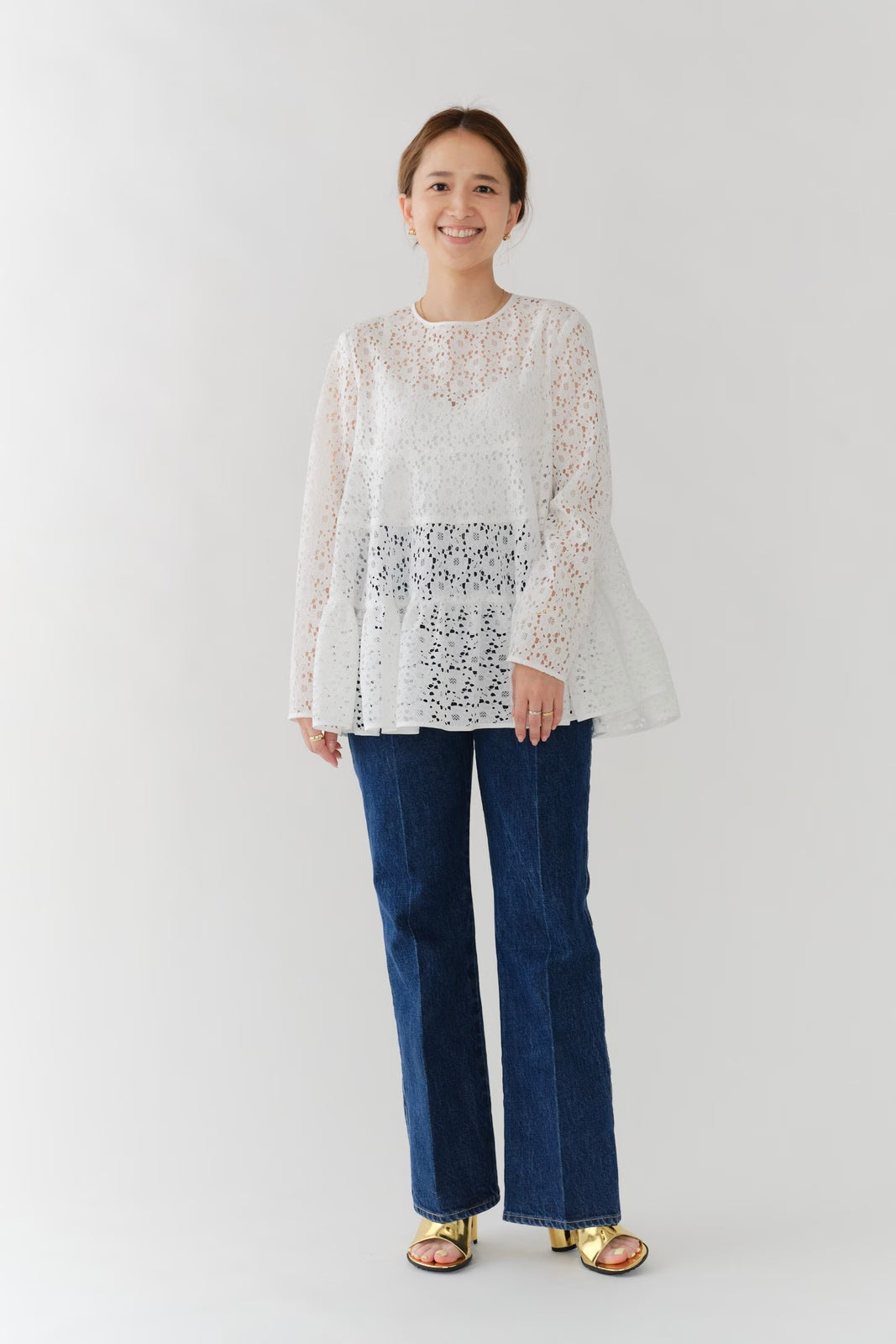 オリジナルの繊細なフロッキーレース生地を贅沢に使用したティアードブラウス。満開に咲く花々を思わせる優しいレースにふんわりと立体感を添えるフロッキー加工が、奥行きのある可憐な表情を生み出します。たっぷりと生地を使ったボリュームのあるティアードシルエットが動くたびに揺れ、華やかさを引き立てながらもレースによる透け感が甘すぎない上品な印象に。デニムと合わせて程よくカジュアルに、きれいめなボトムスと合わせてフォーマルなお席にも。ロンTeeやタートルと合わせてレースからインナーをほんのりと覗かせるスタイリングもこなれ感がプラスされておすすめです。およばれやオケージョンシーンにも映える特別感のあるアイテムです。