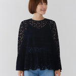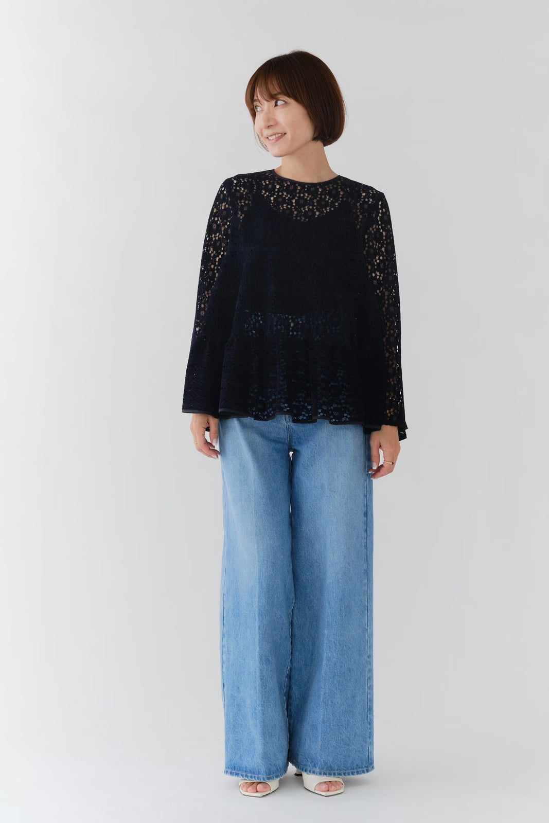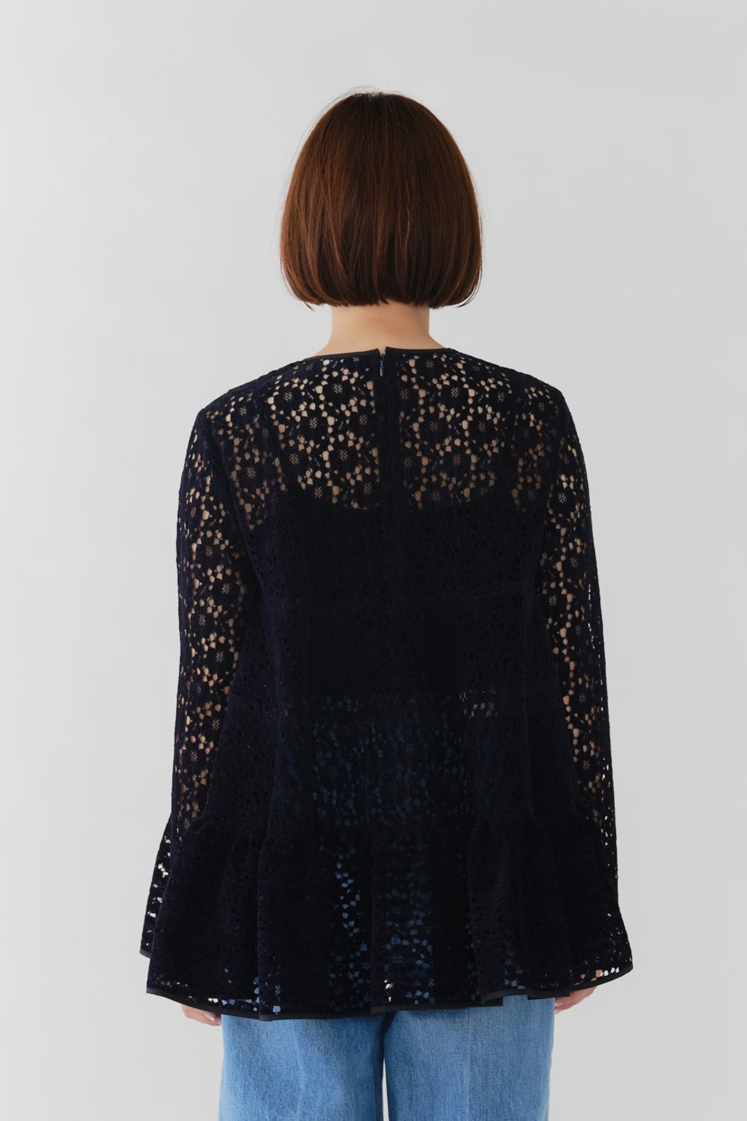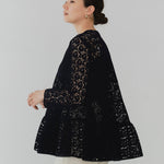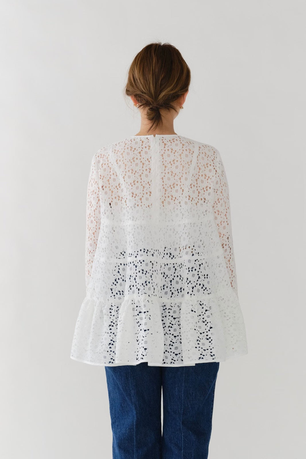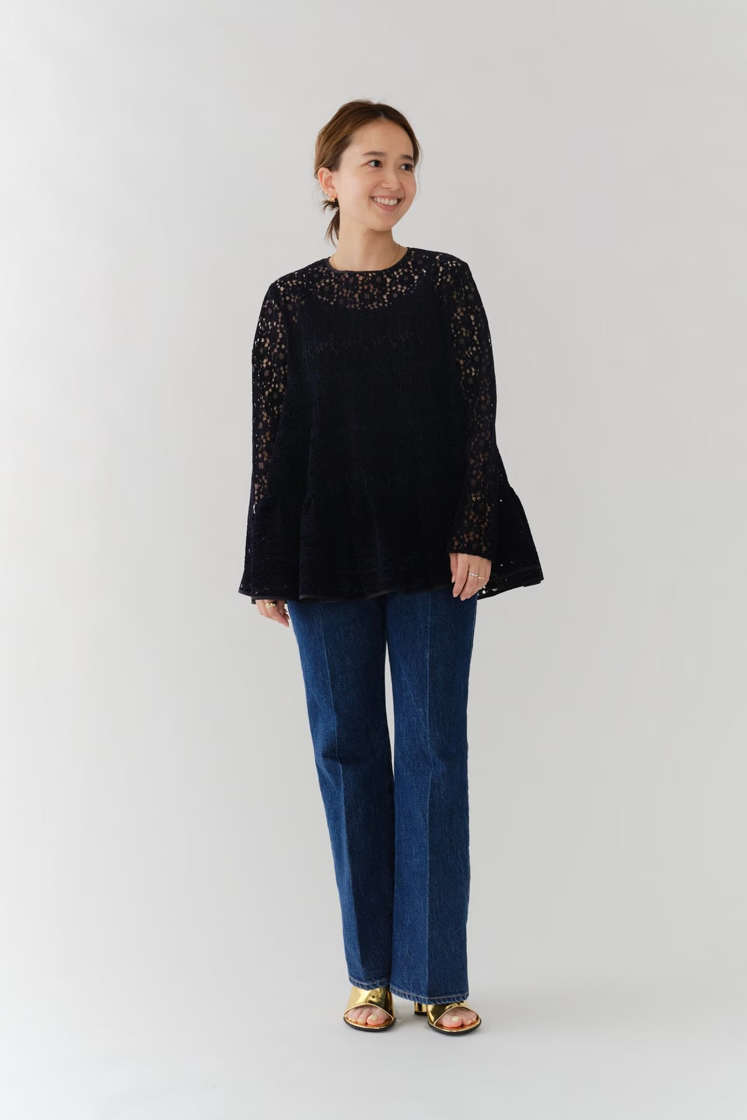 オリジナルの繊細なフロッキーレース生地を贅沢に使用したティアードブラウス。満開に咲く花々を思わせる優しいレースにふんわりと立体感を添えるフロッキー加工が、奥行きのある可憐な表情を生み出します。たっぷりと生地を使ったボリュームのあるティアードシルエットが動くたびに揺れ、華やかさを引き立てながらもレースによる透け感が甘すぎない上品な印象に。デニムと合わせて程よくカジュアルに、きれいめなボトムスと合わせてフォーマルなお席にも。ロンTeeやタートルと合わせてレースからインナーをほんのりと覗かせるスタイリングもこなれ感がプラスされておすすめです。およばれやオケージョンシーンにも映える特別感のあるアイテムです。