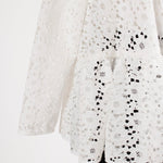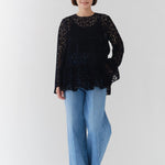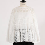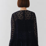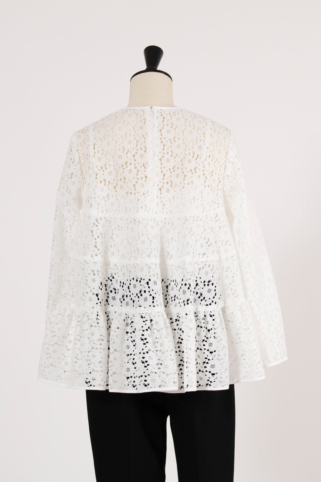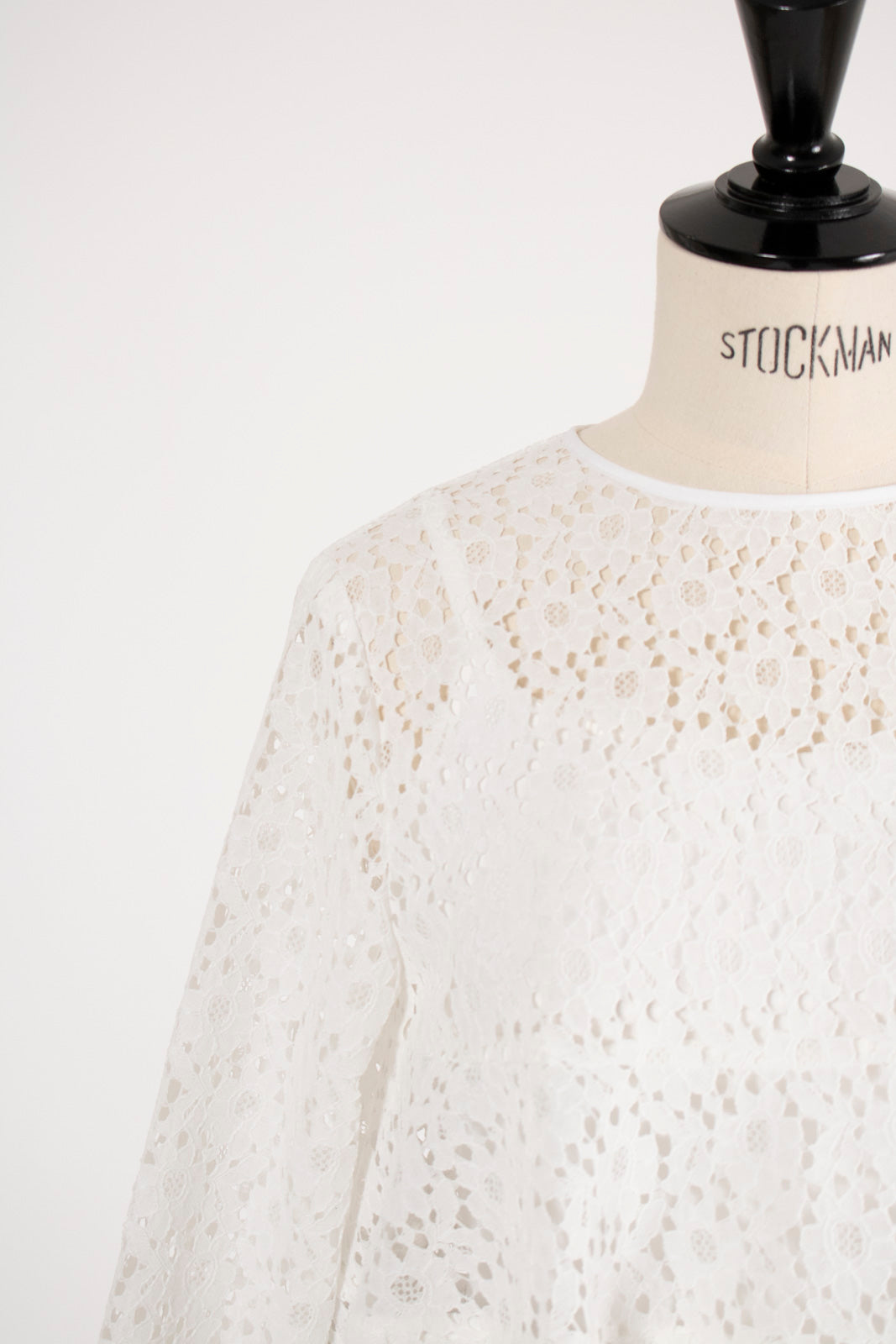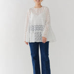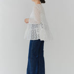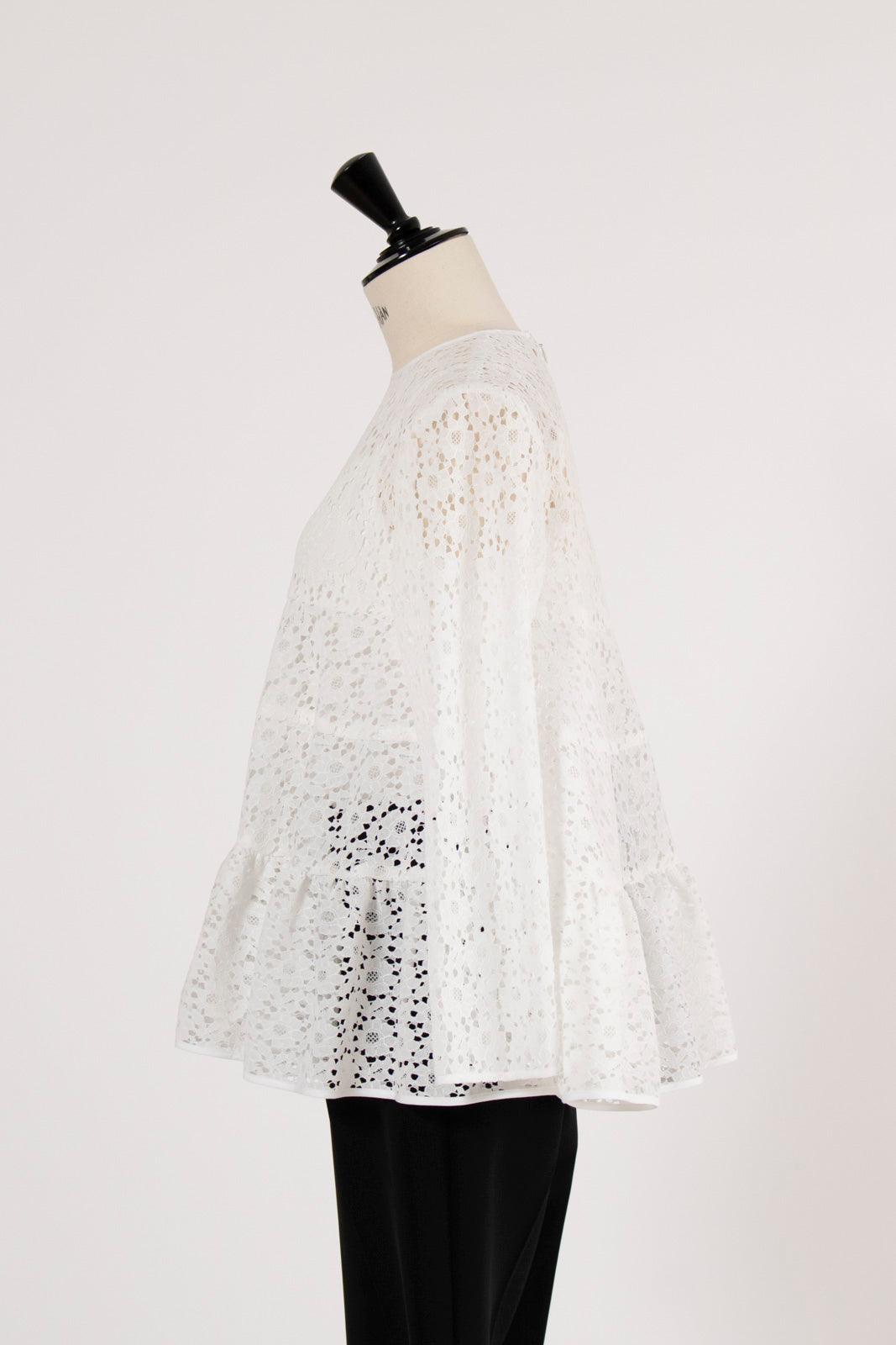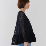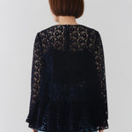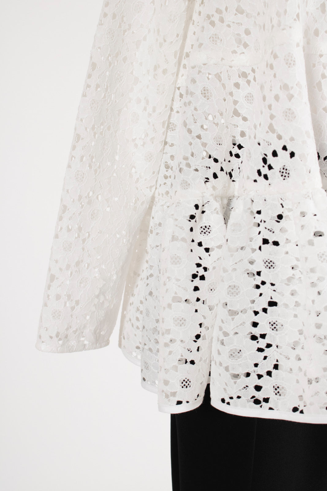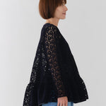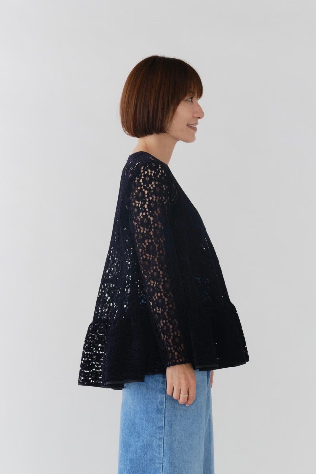 オリジナルの繊細なフロッキーレース生地を贅沢に使用したティアードブラウス。満開に咲く花々を思わせる優しいレースにふんわりと立体感を添えるフロッキー加工が、奥行きのある可憐な表情を生み出します。たっぷりと生地を使ったボリュームのあるティアードシルエットが動くたびに揺れ、華やかさを引き立てながらもレースによる透け感が甘すぎない上品な印象に。デニムと合わせて程よくカジュアルに、きれいめなボトムスと合わせてフォーマルなお席にも。ロンTeeやタートルと合わせてレースからインナーをほんのりと覗かせるスタイリングもこなれ感がプラスされておすすめです。およばれやオケージョンシーンにも映える特別感のあるアイテムです。
