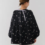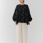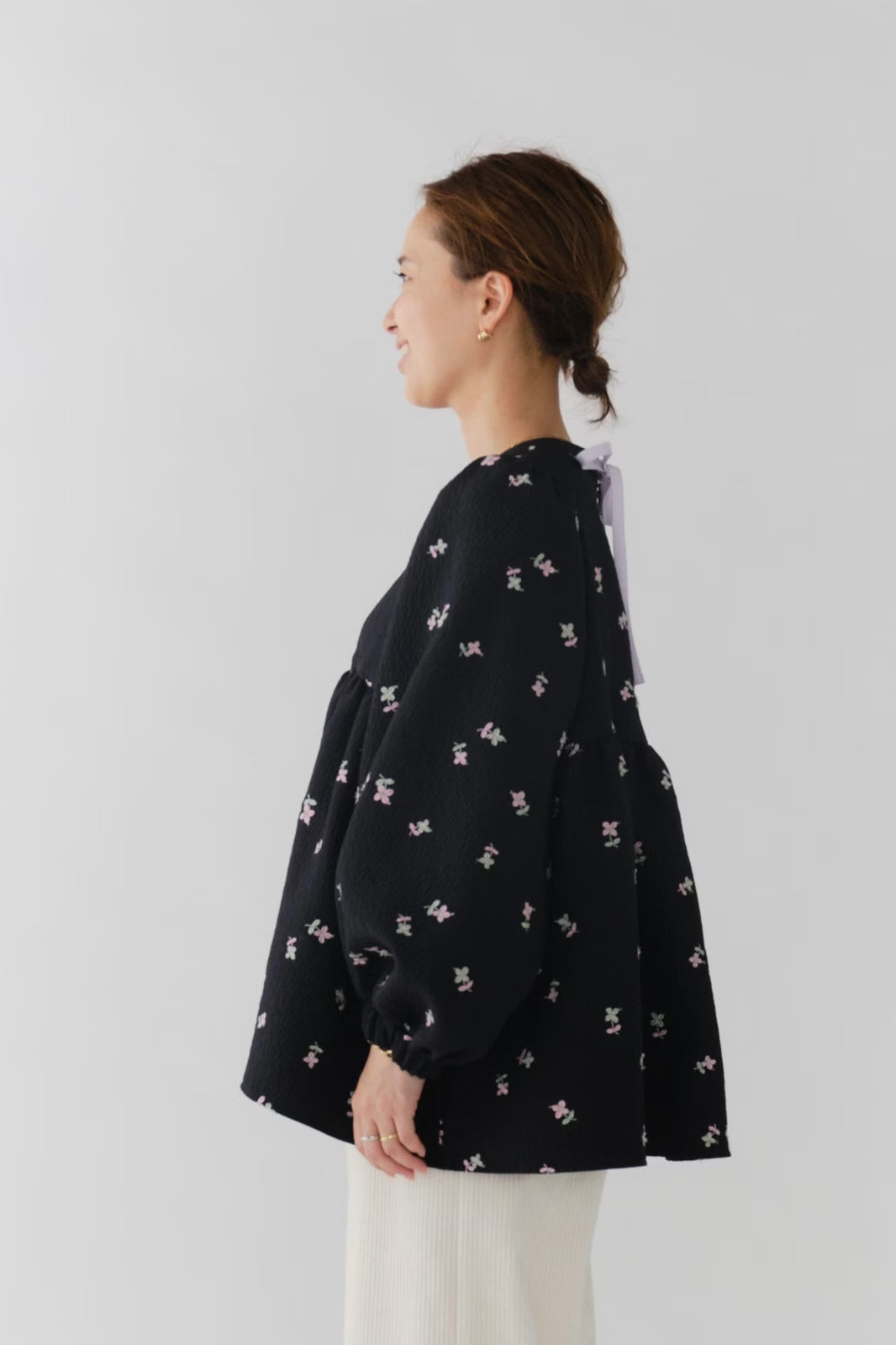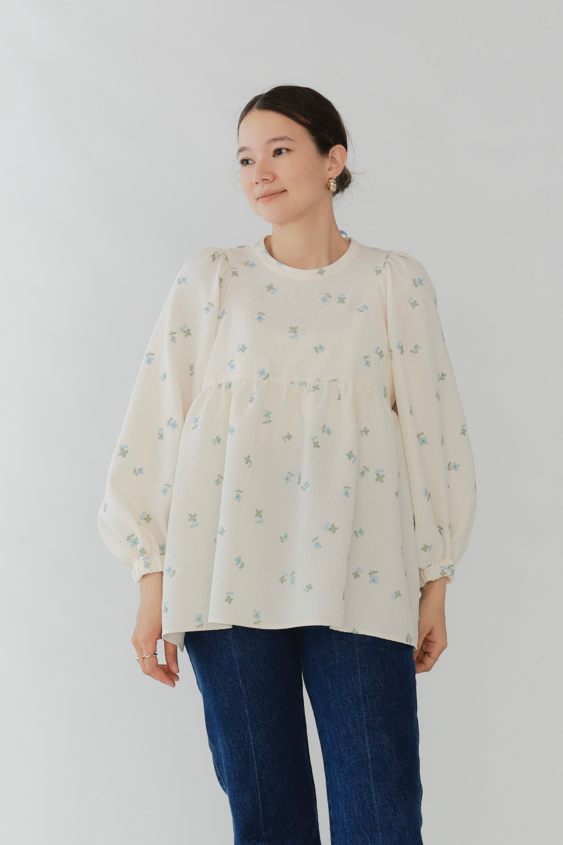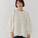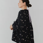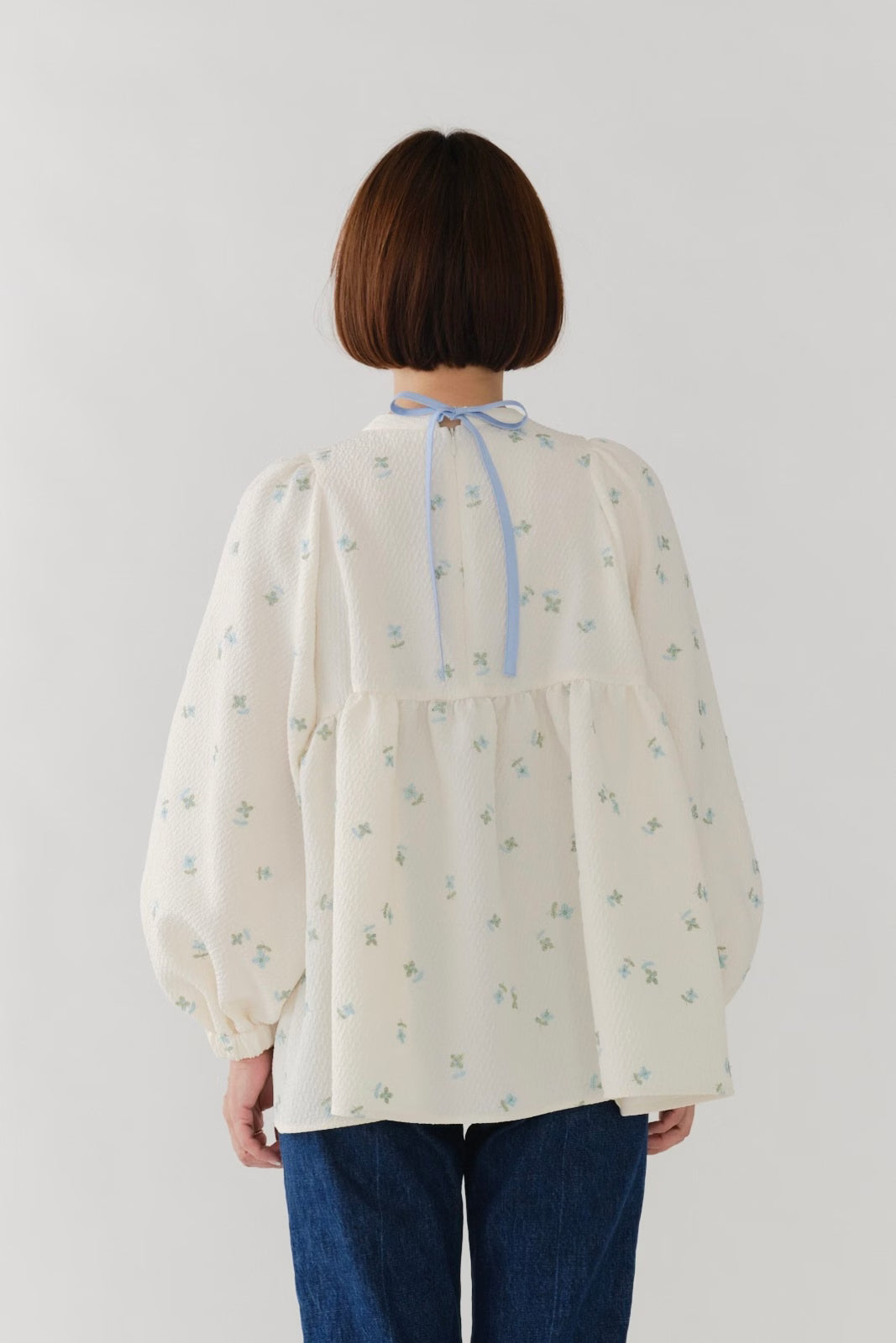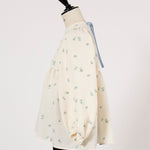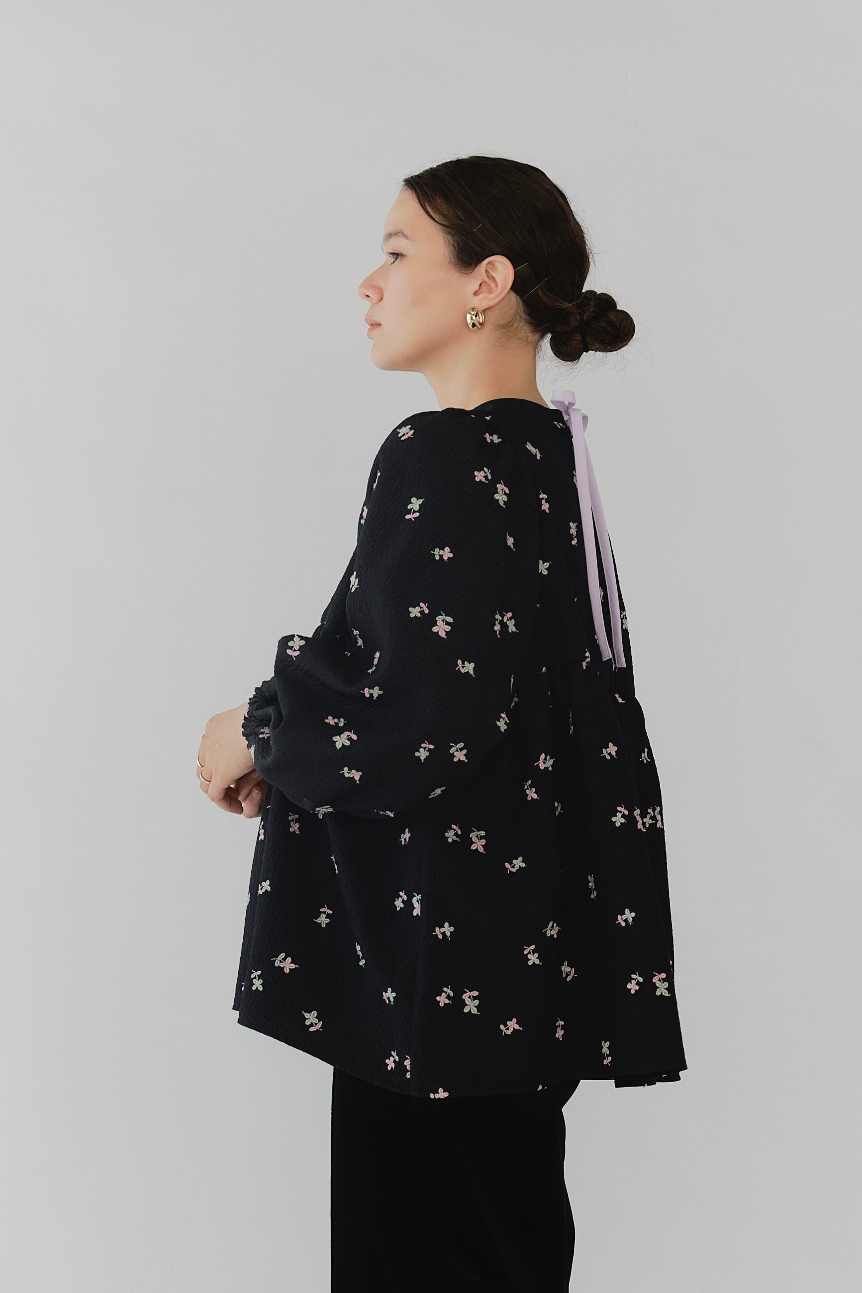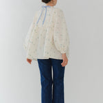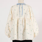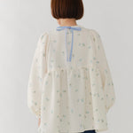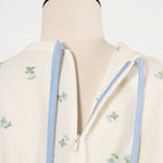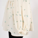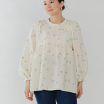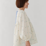 まるで煌めく花々が舞い踊るような刺繍が可愛い<yori>オリジナルのフクレジャガード生地を使用。立体感のある織りと繊細で艶やかなお花の刺繍が他にはない特別感あふれる一着に。可愛らしさと華やかさをぎゅっと詰め込みました。ふんわりとしたパフスリーブとギャザーたっぷりのシルエットで、体のラインを拾わず肩や腰回りを華奢に見せてくれます。袖口ゴムでさっと肘まで上げられる機能性もあり、刺繍に合わせて配色で施した後ろリボンもポイント。シワになりにくく、自宅でお手入れ可能です。一枚で様になり簡単にコーディネートできるアイテムです。デイリーからお出かけまで幅広いシーンでお召しいただけます。