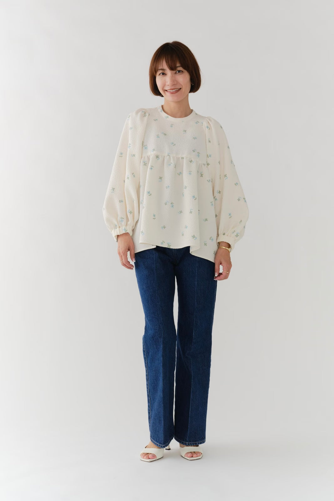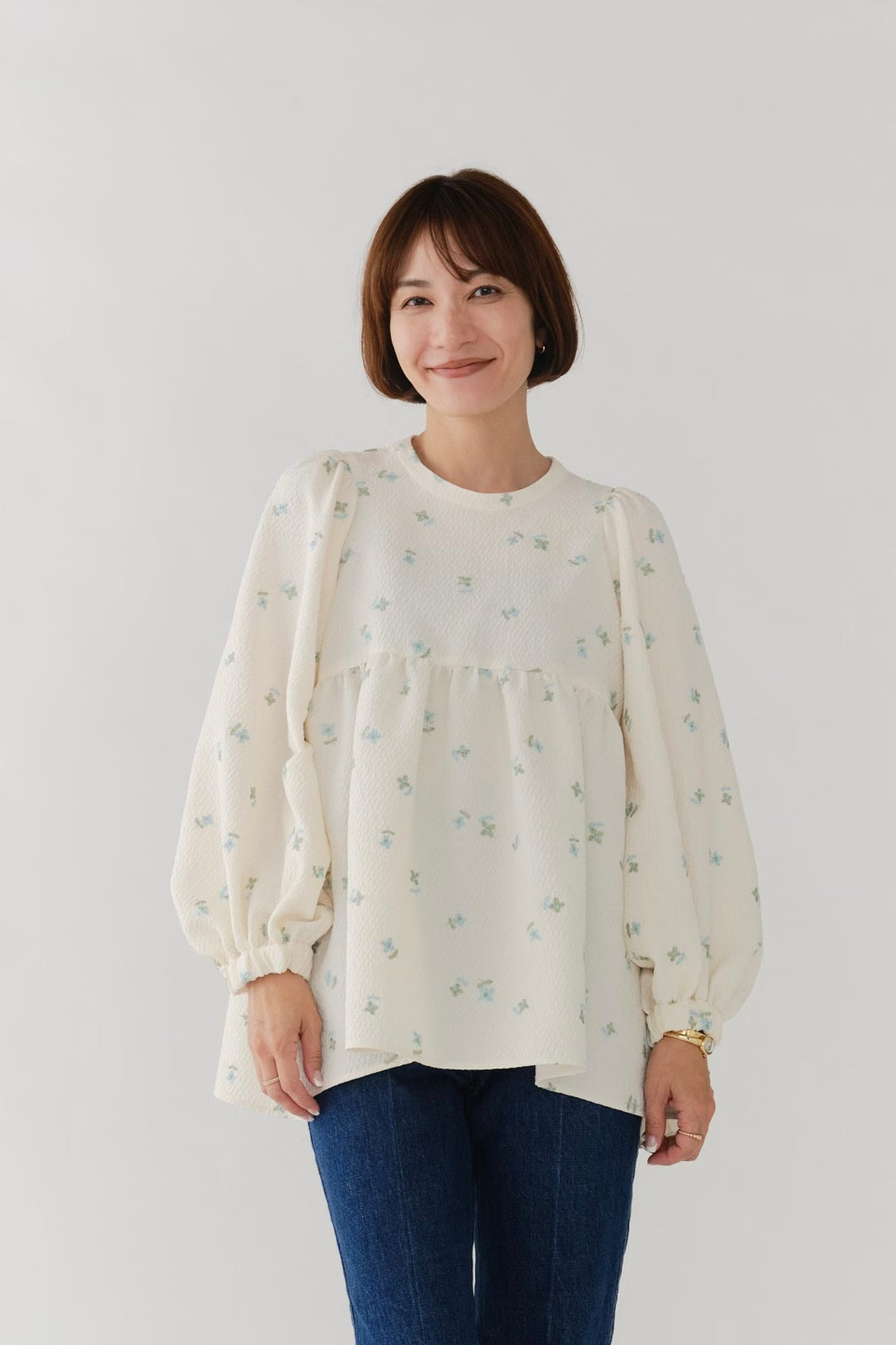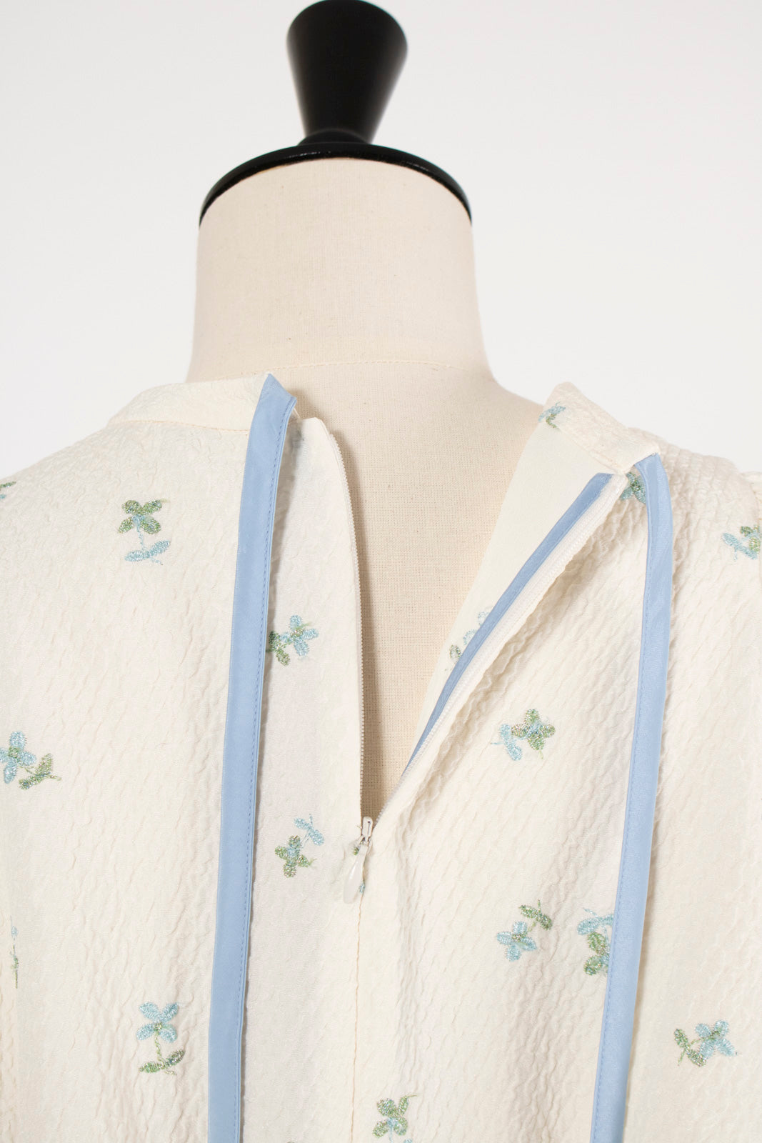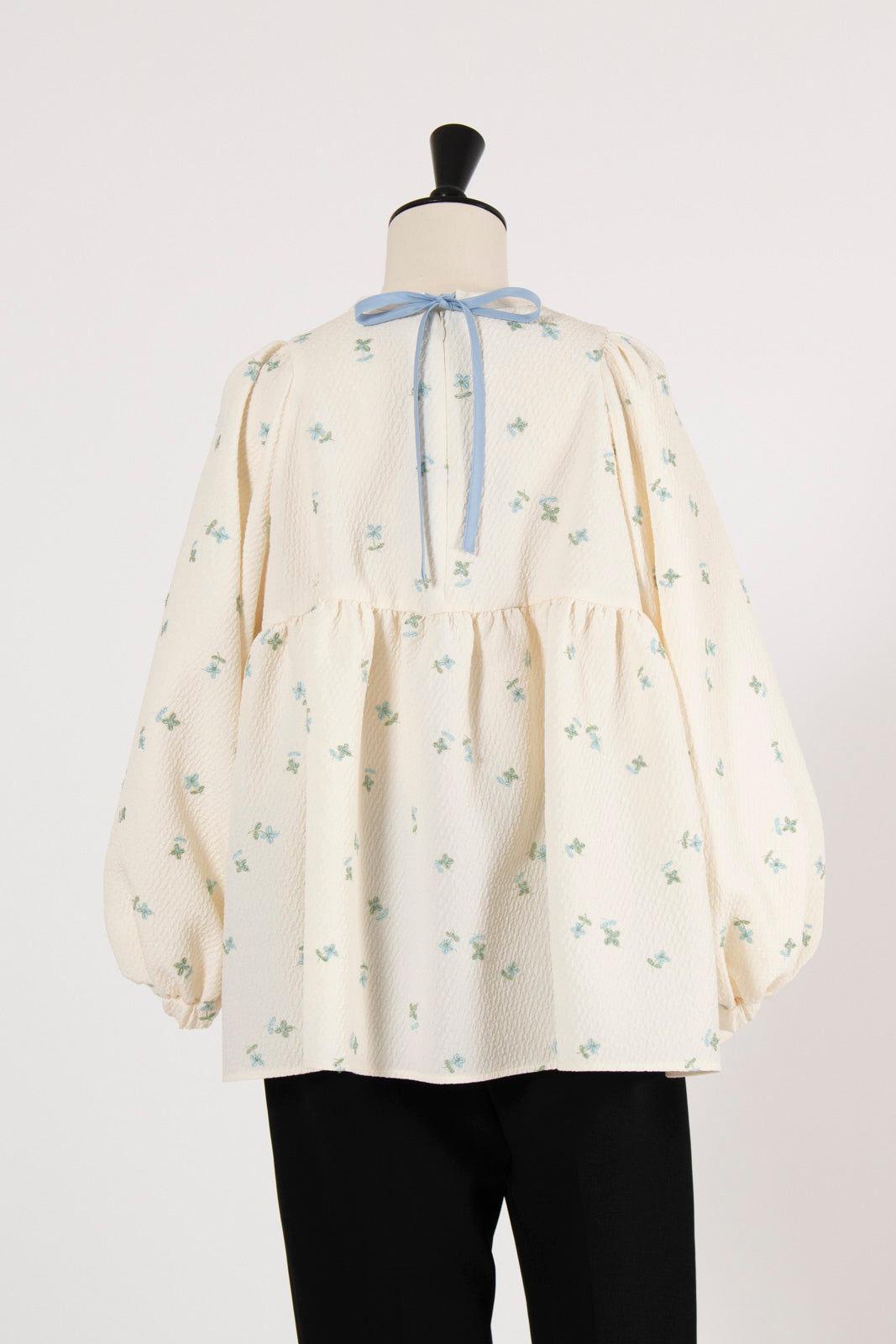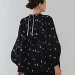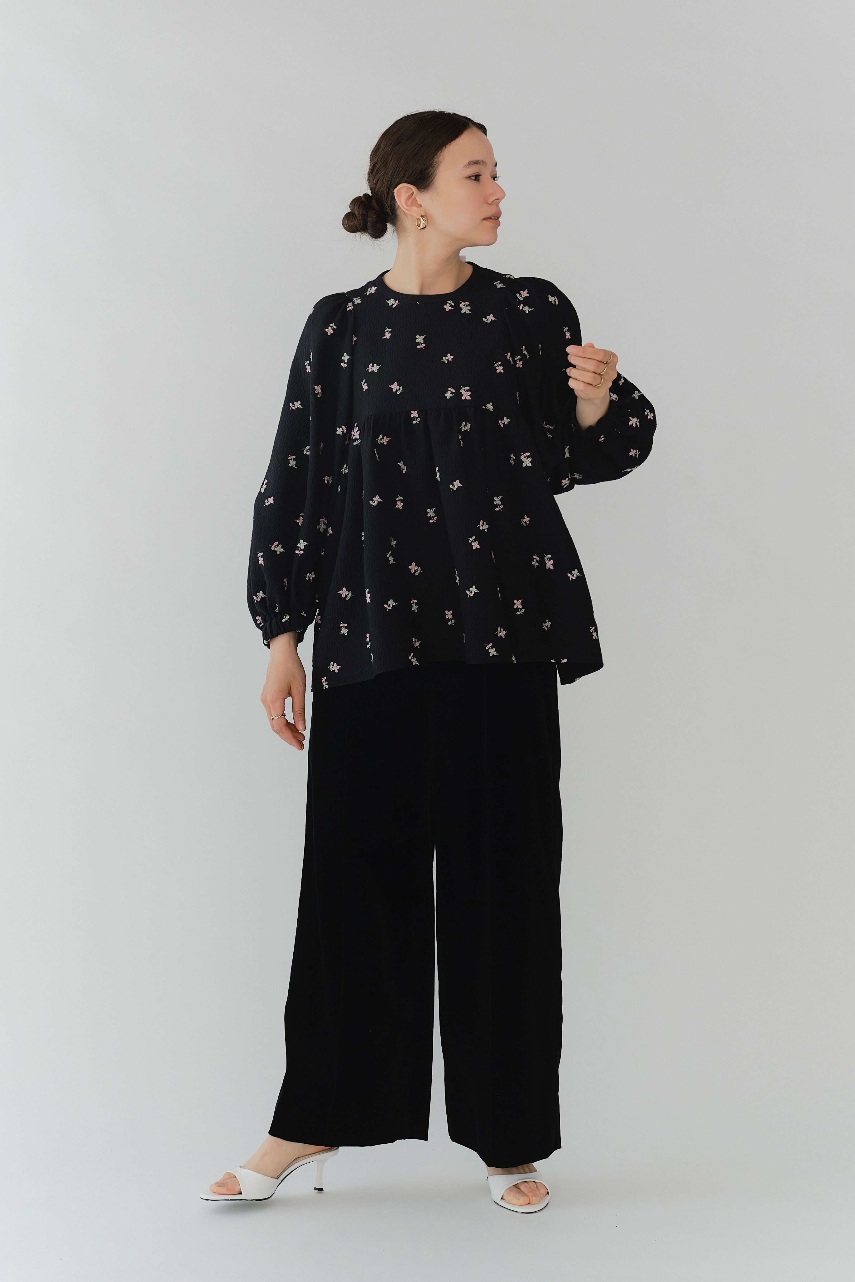 まるで煌めく花々が舞い踊るような刺繍が可愛い<yori>オリジナルのフクレジャガード生地を使用。立体感のある織りと繊細で艶やかなお花の刺繍が他にはない特別感あふれる一着に。可愛らしさと華やかさをぎゅっと詰め込みました。ふんわりとしたパフスリーブとギャザーたっぷりのシルエットで、体のラインを拾わず肩や腰回りを華奢に見せてくれます。袖口ゴムでさっと肘まで上げられる機能性もあり、刺繍に合わせて配色で施した後ろリボンもポイント。シワになりにくく、自宅でお手入れ可能です。一枚で様になり簡単にコーディネートできるアイテムです。デイリーからお出かけまで幅広いシーンでお召しいただけます。