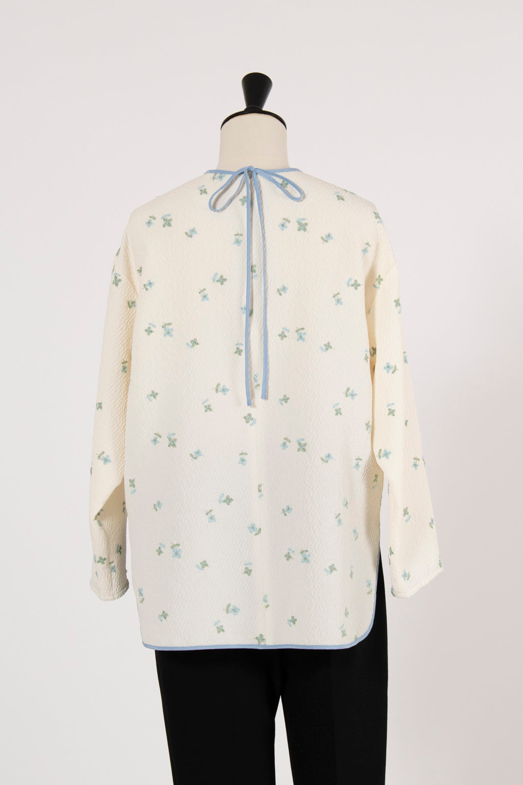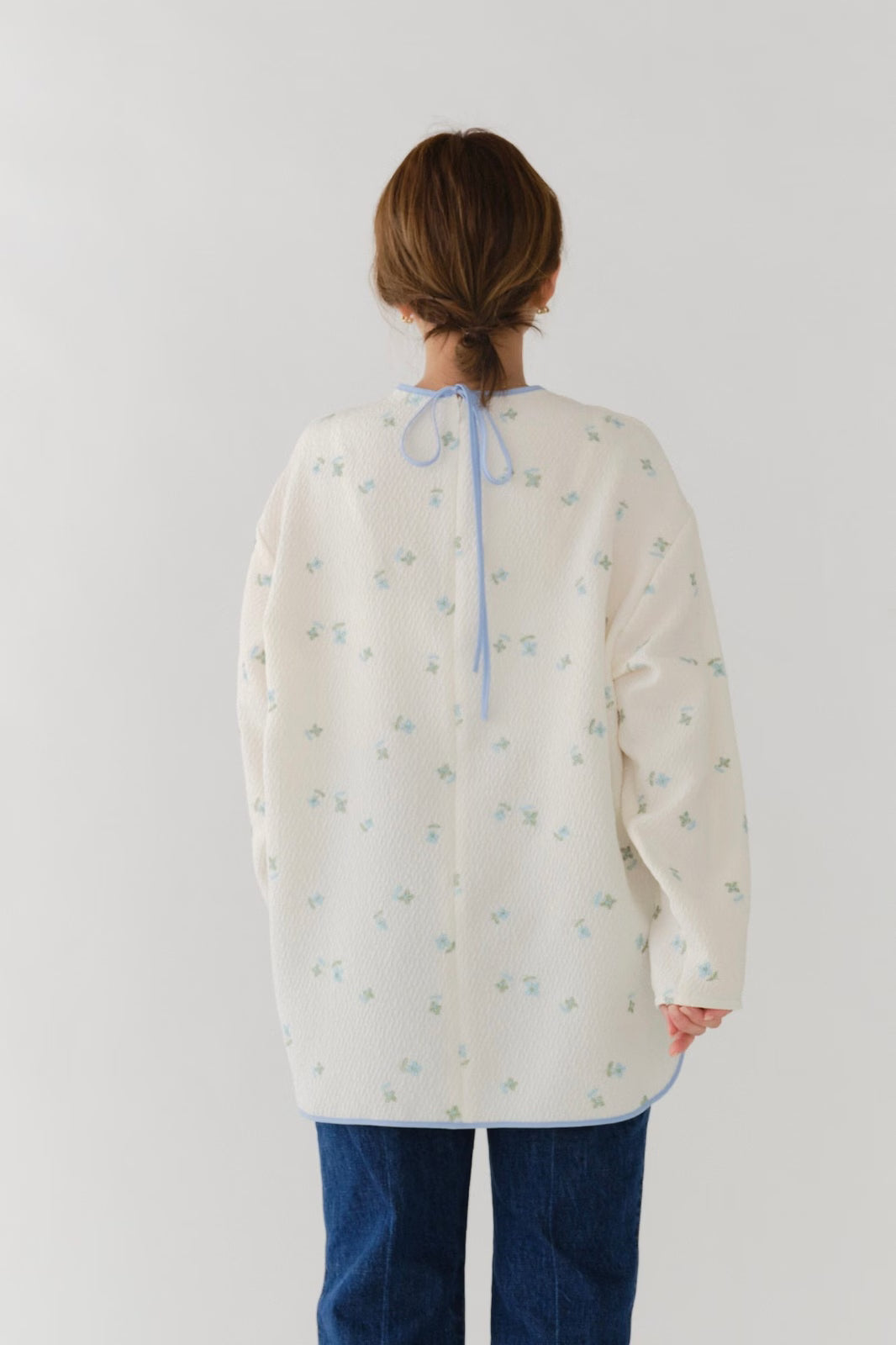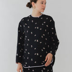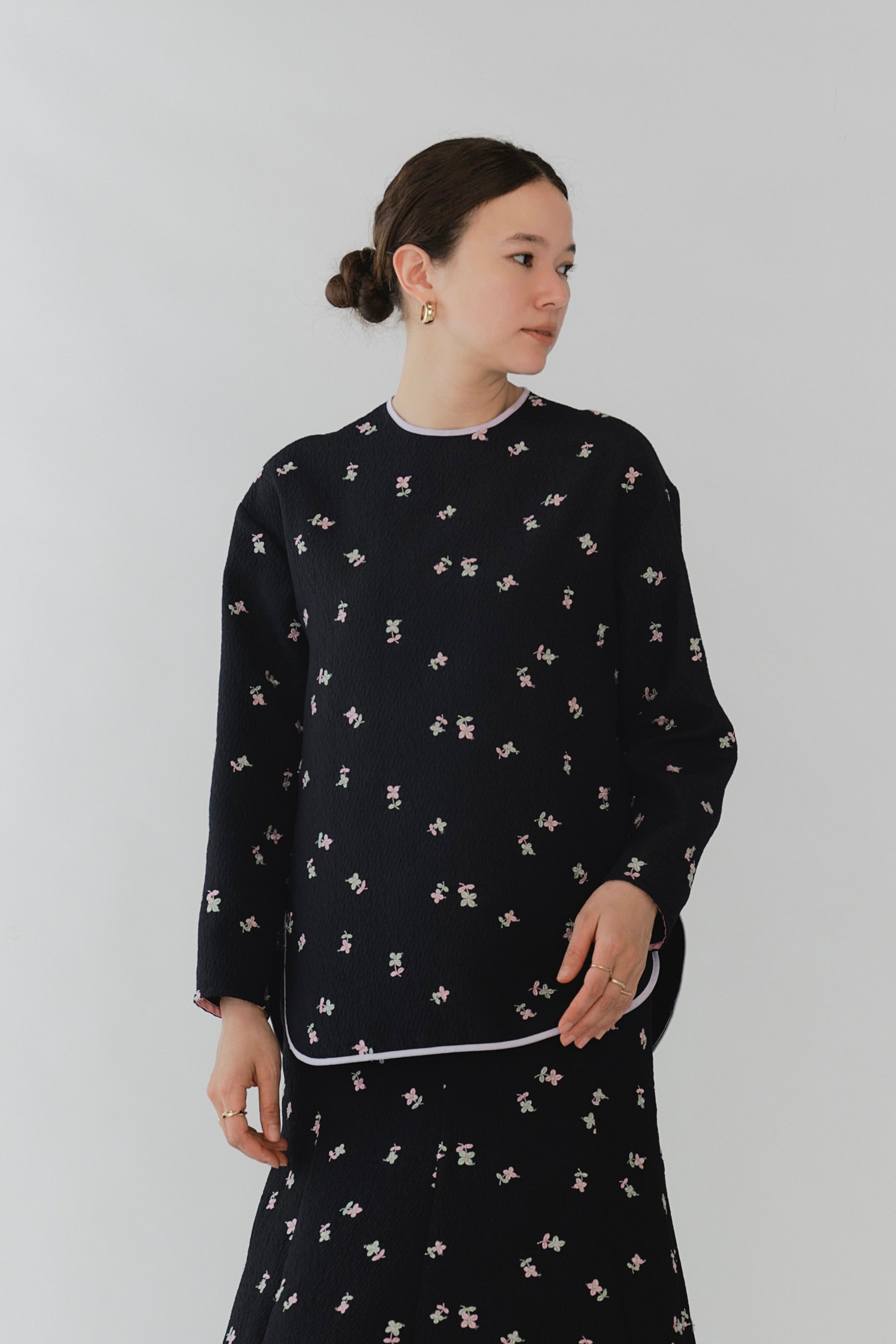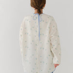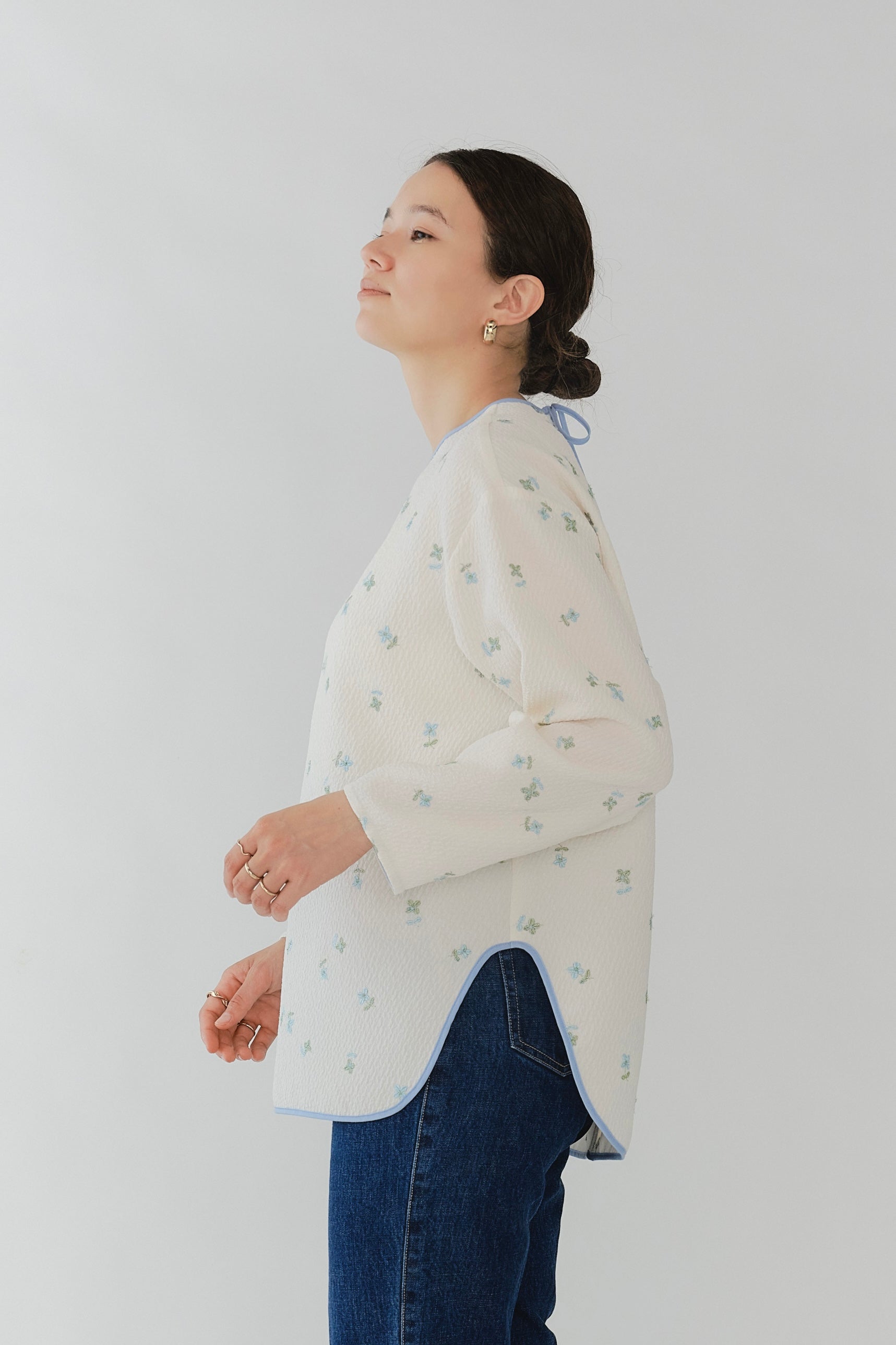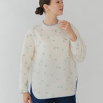 まるで煌めく花々が舞い踊るような刺繍が可愛い<yori>オリジナルのフクレジャガード生地を使用。立体感のある織りと繊細で艶やかなお花の刺繍が他にはない特別感あふれる一着に。プレーンなシルエットの中に、裾・襟ぐり・後ろリボンに刺繍と合わせた配色の生地を施し、さりげない大人の可憐さを演出。ゆったりとしたオーバーなサイズ感とゆるやかにラウンドされた前後差ある裾で飽きのこないデザインです。シワになりにくく、お手入れ楽ちんなのも嬉しいポイント。袖をたくし上げて手首を見せるスタイリングも抜け感がでてバランスが取りやすくおすすめです。デイリーからお出かけまで幅広いシーンでお召しいただけます。