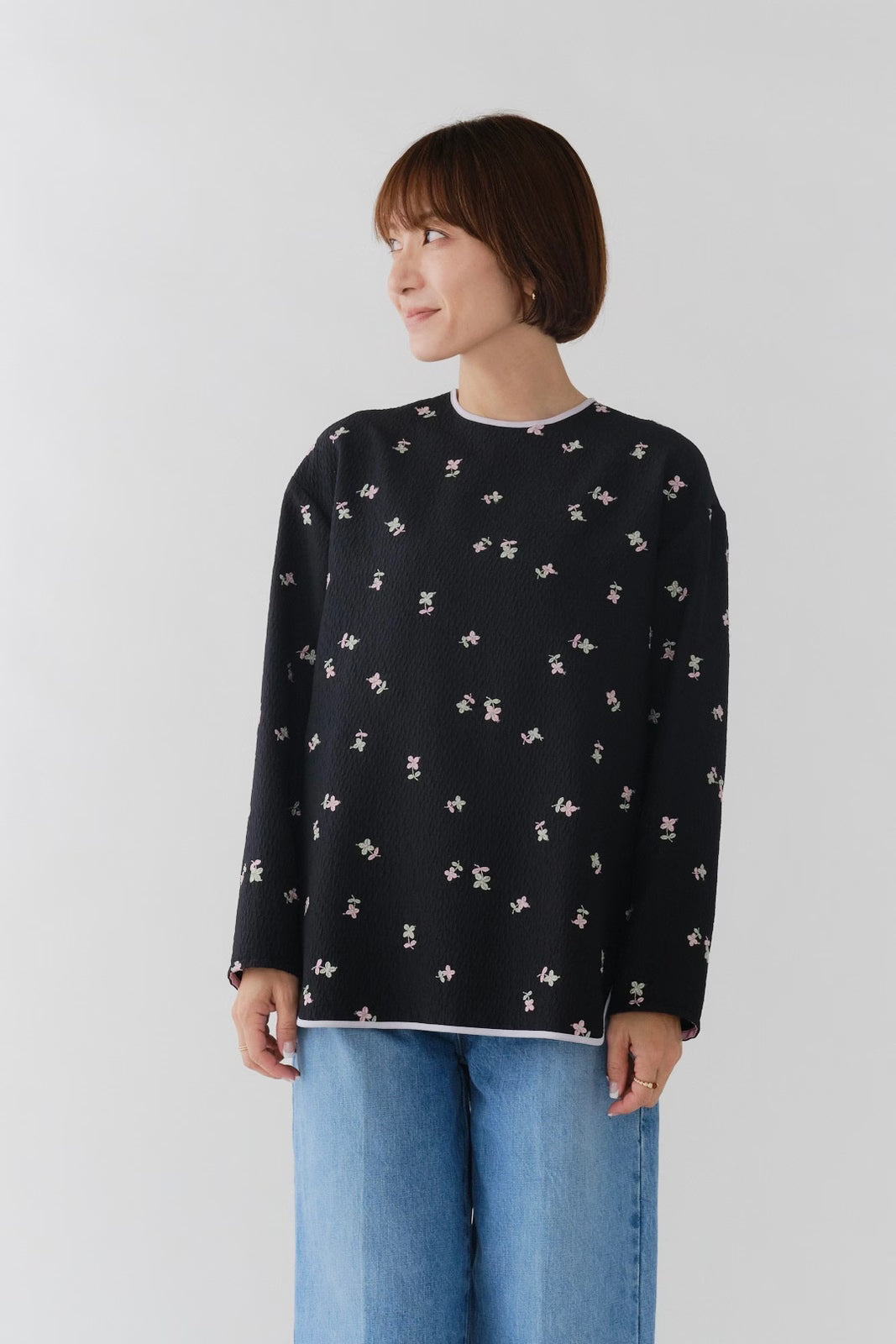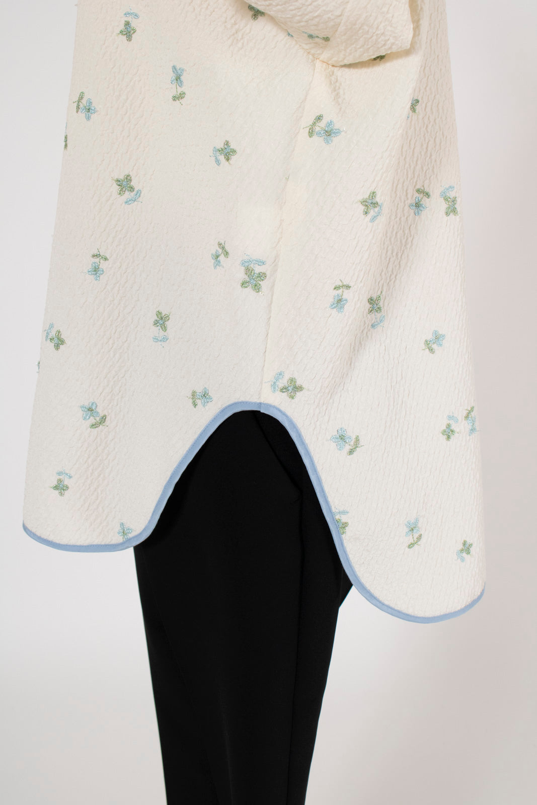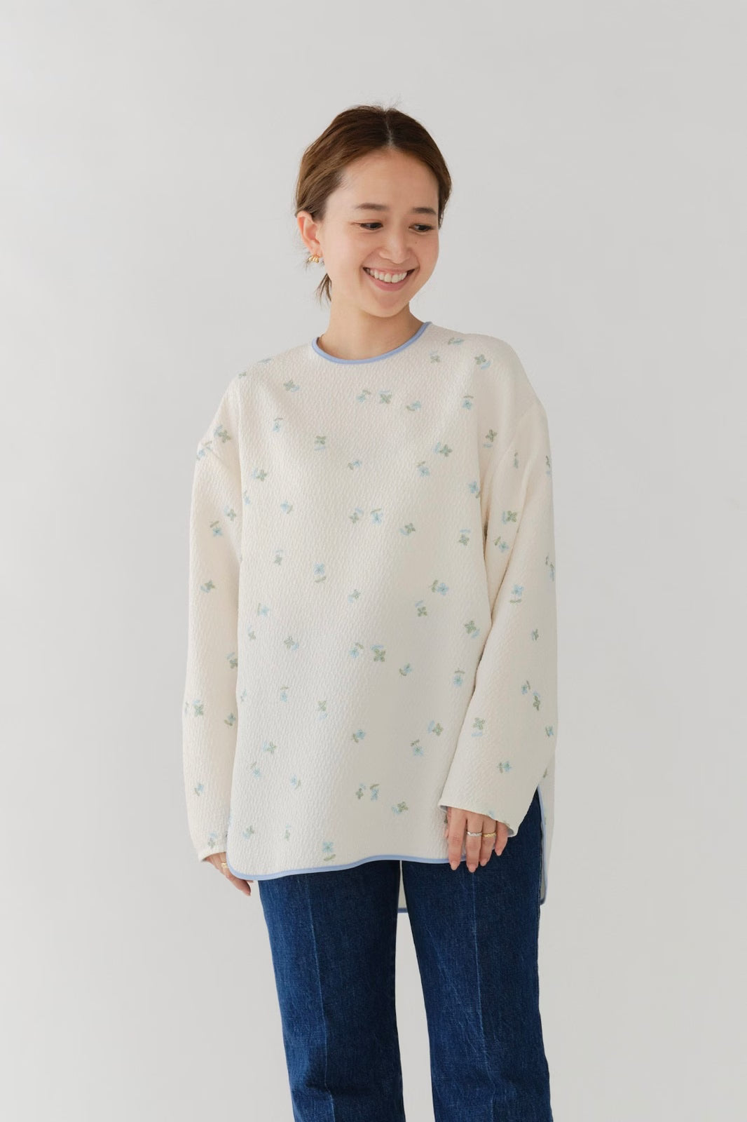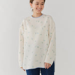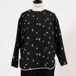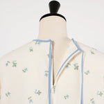まるで煌めく花々が舞い踊るような刺繍が可愛い<yori>オリジナルのフクレジャガード生地を使用。立体感のある織りと繊細で艶やかなお花の刺繍が他にはない特別感あふれる一着に。プレーンなシルエットの中に、裾・襟ぐり・後ろリボンに刺繍と合わせた配色の生地を施し、さりげない大人の可憐さを演出。ゆったりとしたオーバーなサイズ感とゆるやかにラウンドされた前後差ある裾で飽きのこないデザインです。シワになりにくく、お手入れ楽ちんなのも嬉しいポイント。袖をたくし上げて手首を見せるスタイリングも抜け感がでてバランスが取りやすくおすすめです。デイリーからお出かけまで幅広いシーンでお召しいただけます。