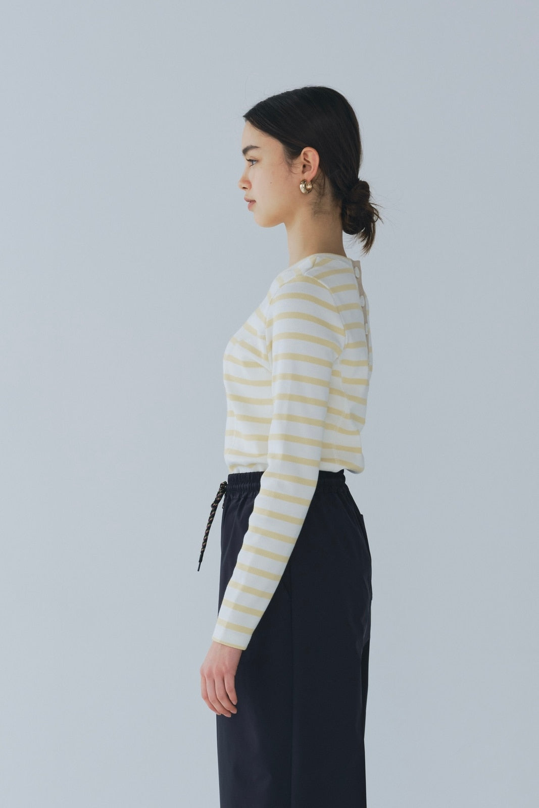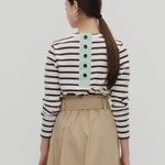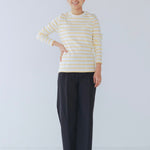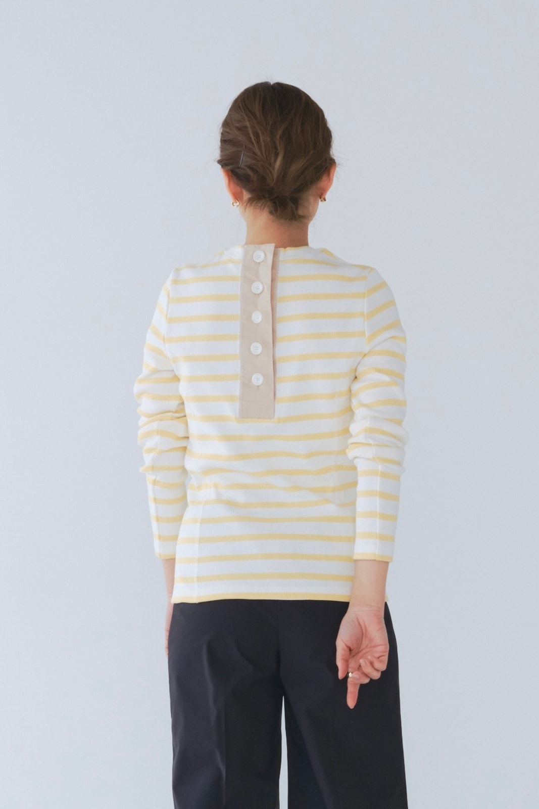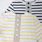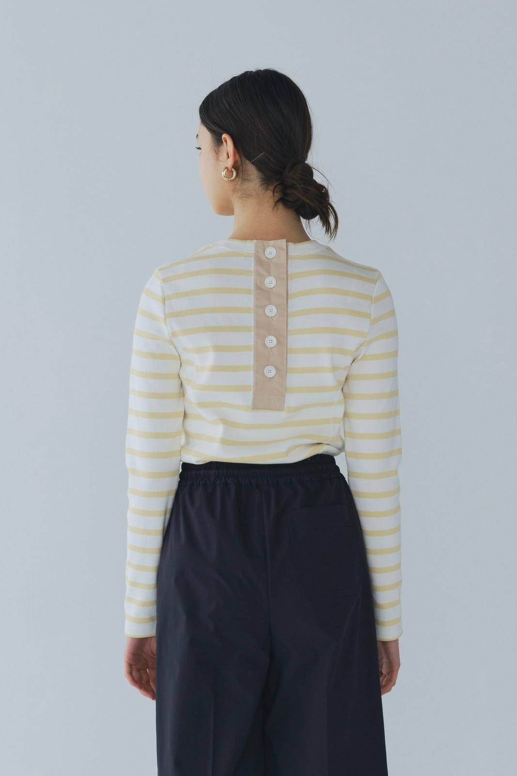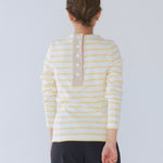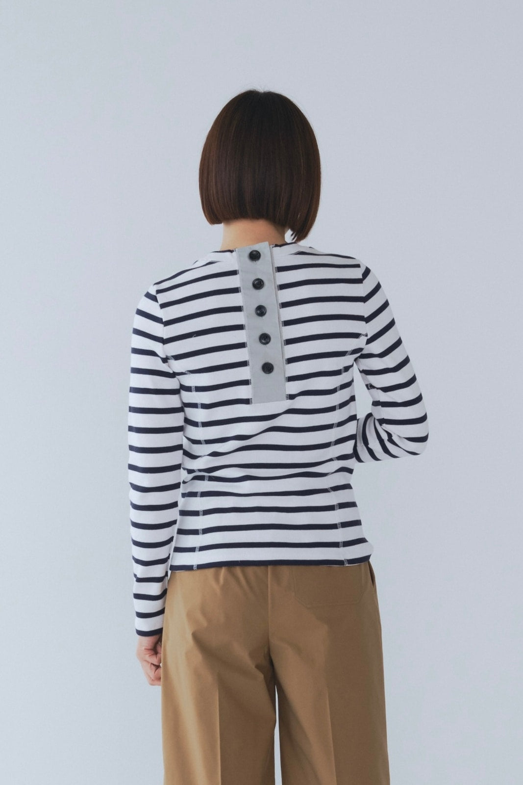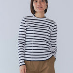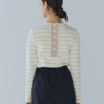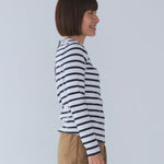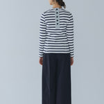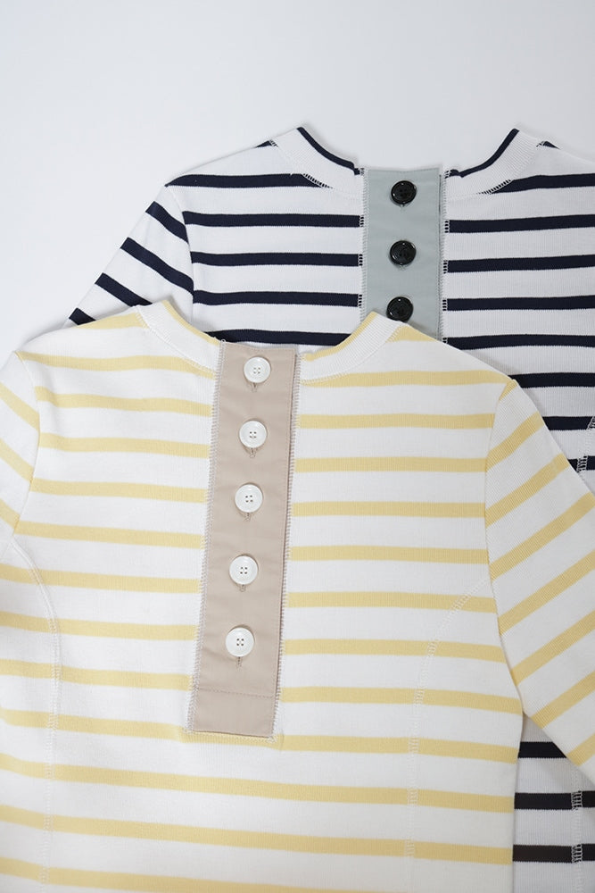 伸縮性のあるフライス編みで、ふっくらとした肉厚で柔らかさのあるニットライクなカットソー素材です。背中には配色の布生地(シャツ地)と存在感のあるボタン、プリンセスラインの切り替えデザインでモードとカジュアルを感じるプルオーバーです。絶妙にミックスされた配色でどこかレトロな雰囲気のボーダー柄と規則的なボーダー柄の2色展開になります。デニムやバギーパンツ、クラシックなスカートと合わせてカジュアルミックスを楽しめるアイテムです。