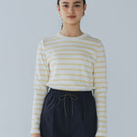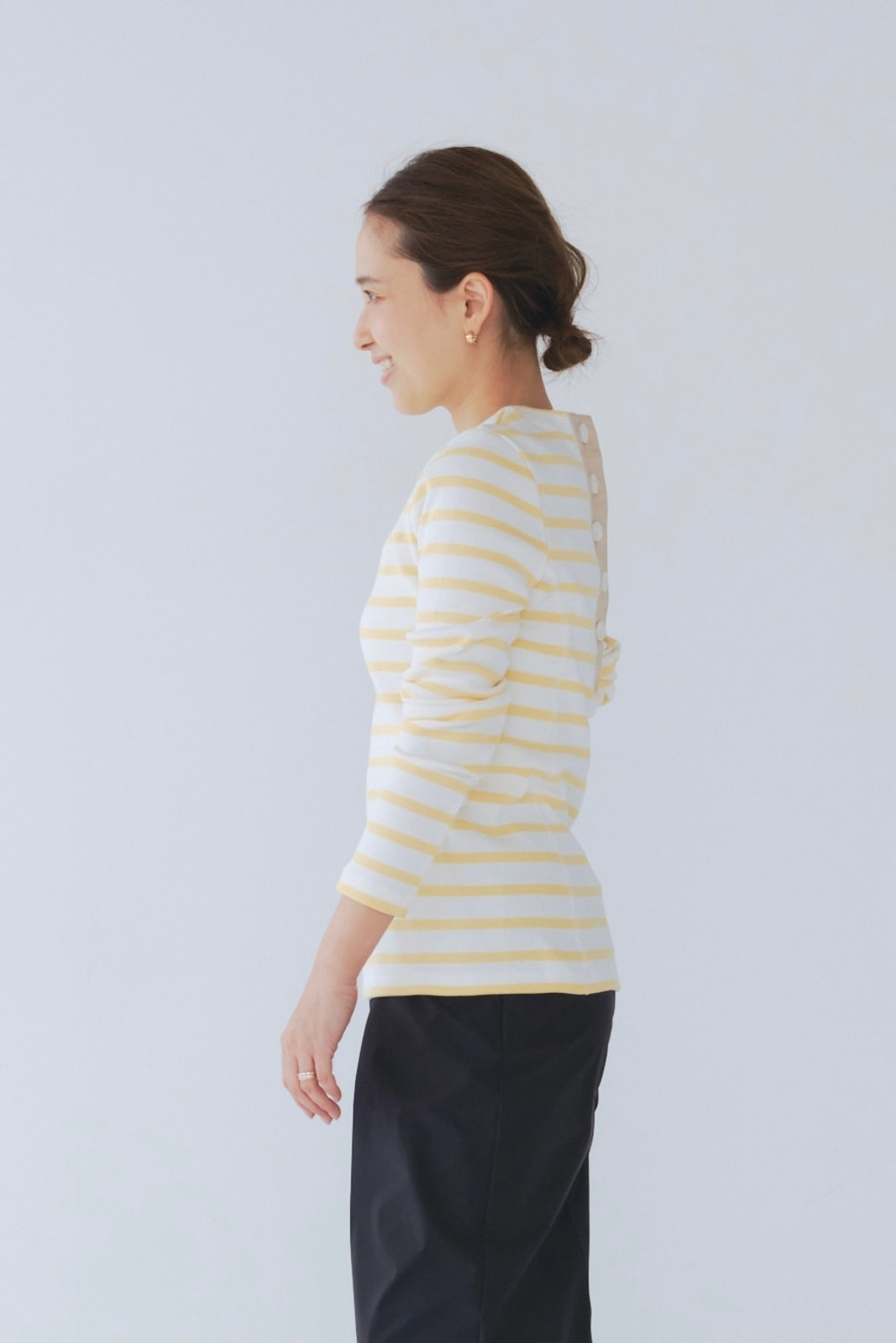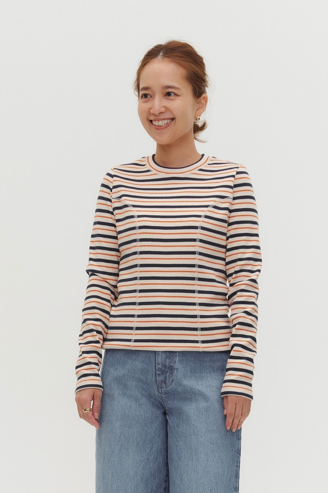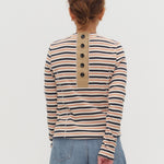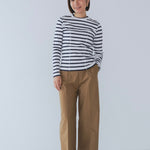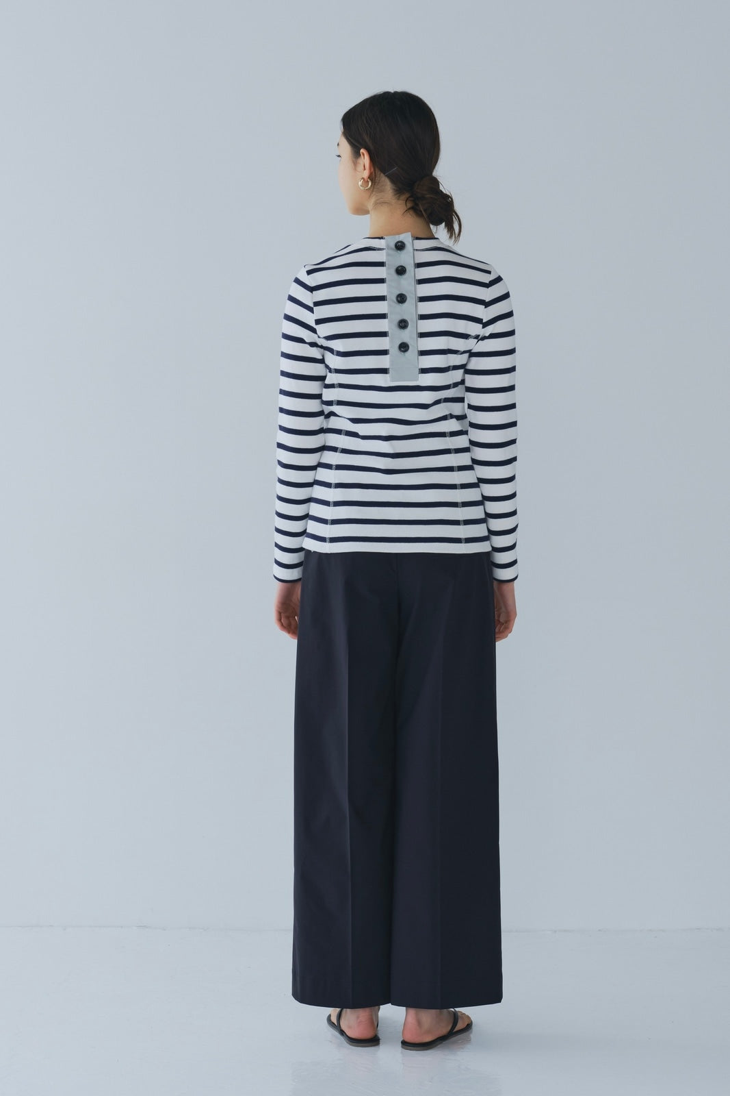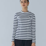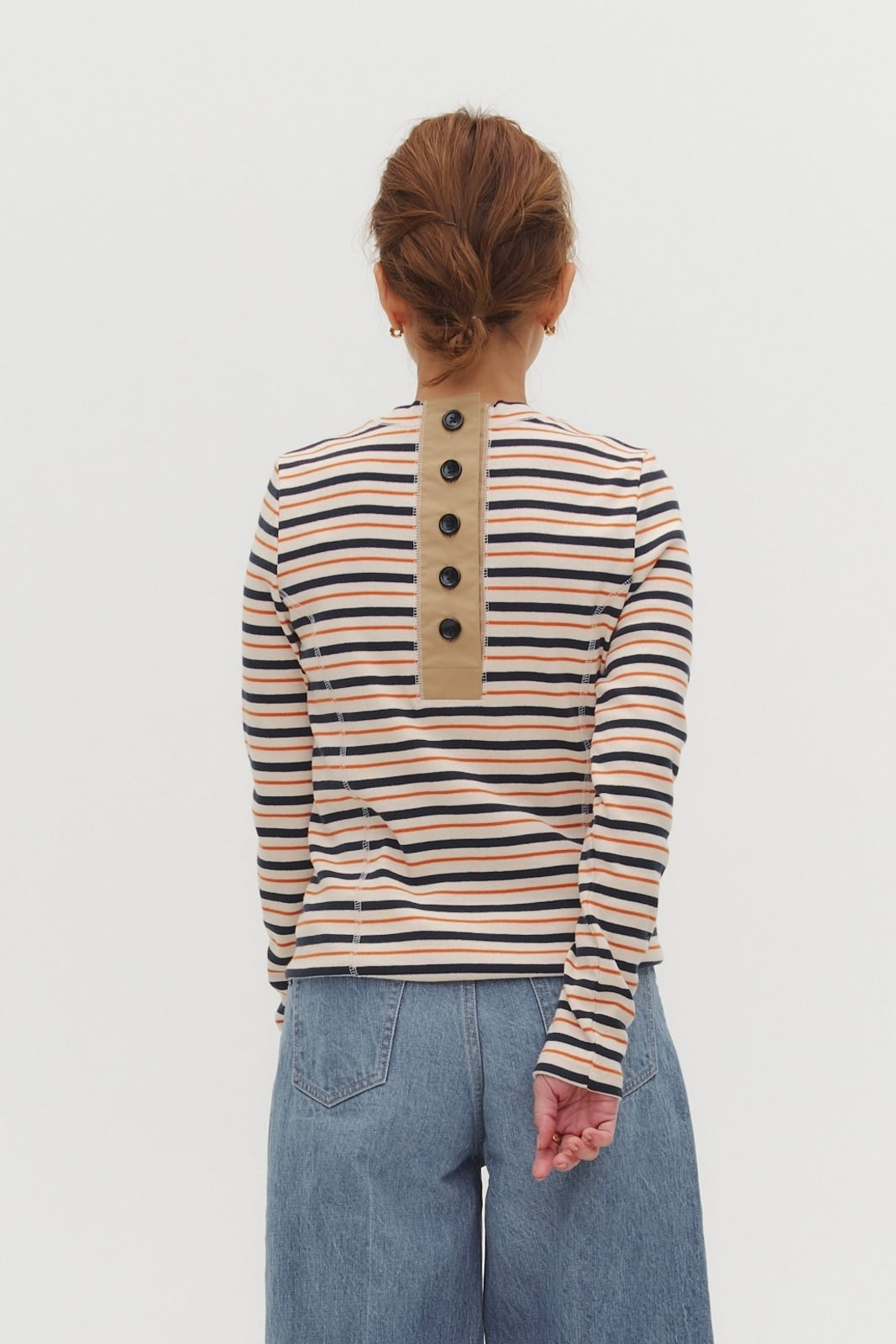 伸縮性のあるフライス編みで、ふっくらとした肉厚で柔らかさのあるニットライクなカットソー素材です。背中には配色の布生地(シャツ地)と存在感のあるボタン、プリンセスラインの切り替えデザインでモードとカジュアルを感じるプルオーバーです。絶妙にミックスされた配色でどこかレトロな雰囲気のボーダー柄と規則的なボーダー柄の2色展開になります。デニムやバギーパンツ、クラシックなスカートと合わせてカジュアルミックスを楽しめるアイテムです。