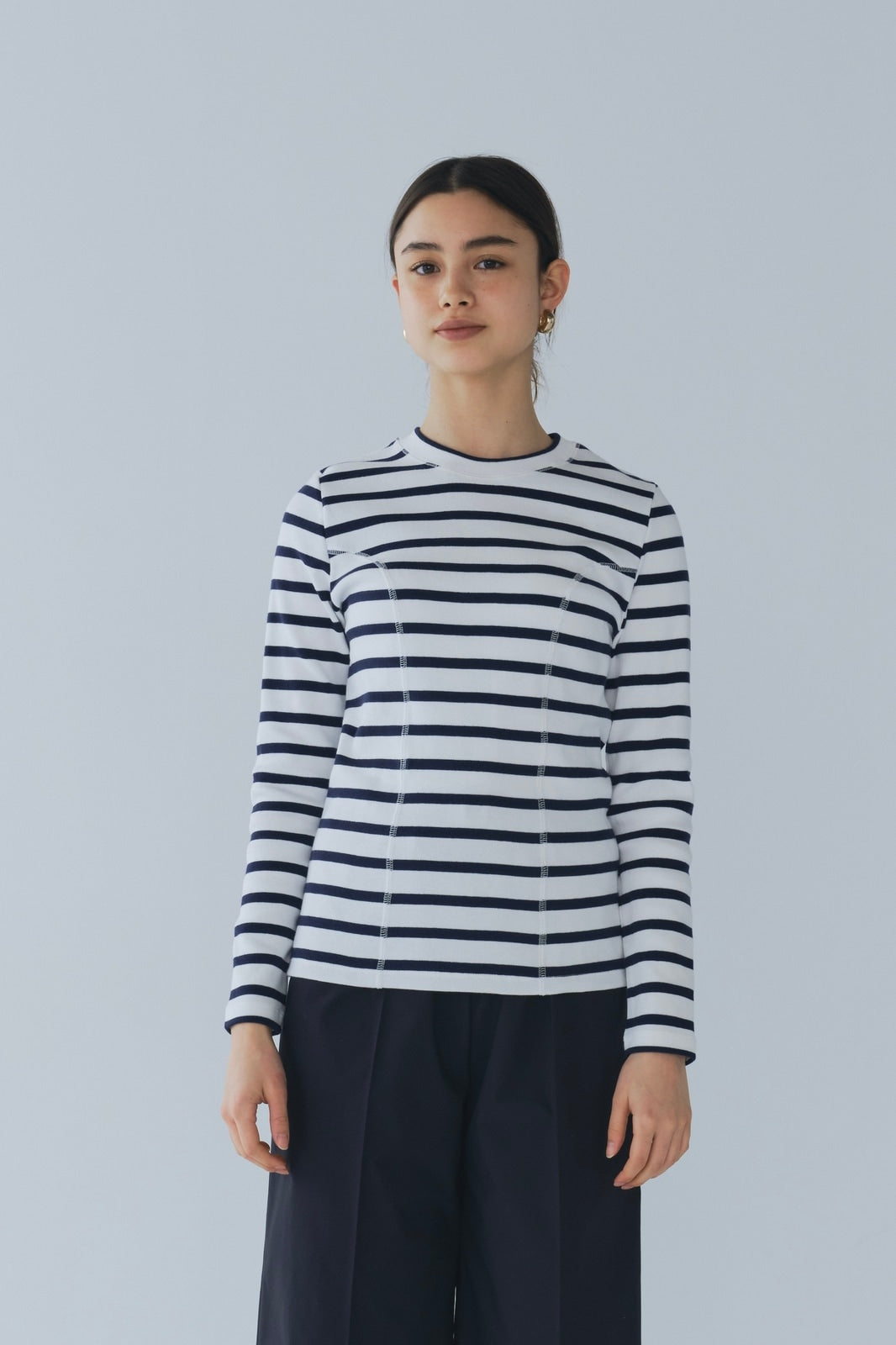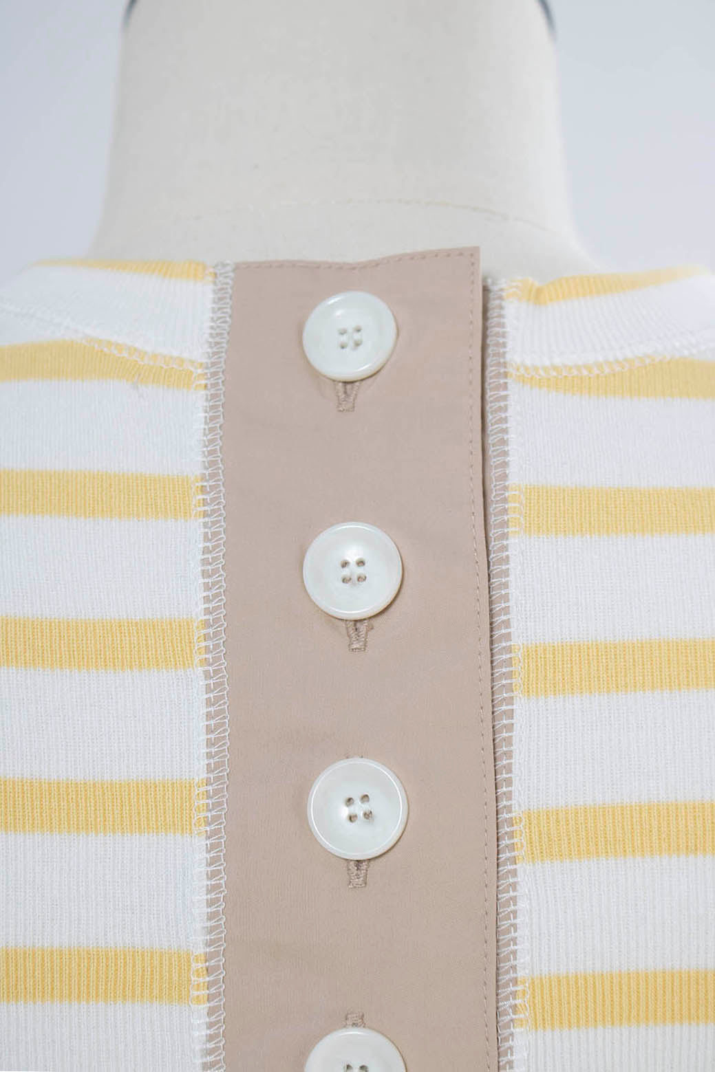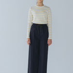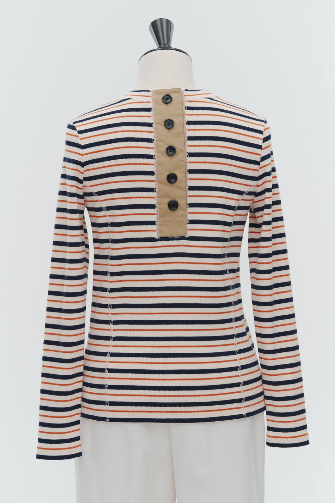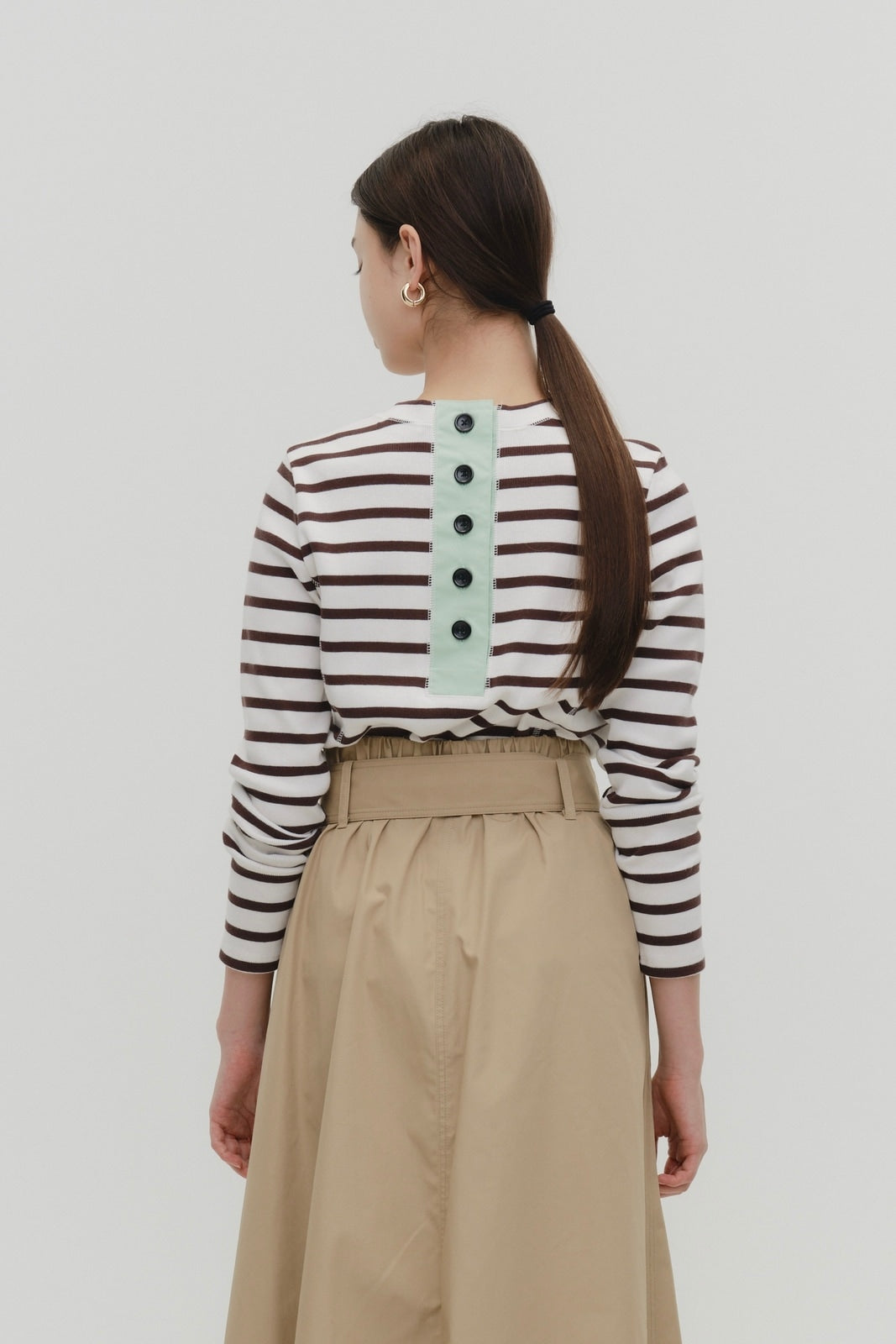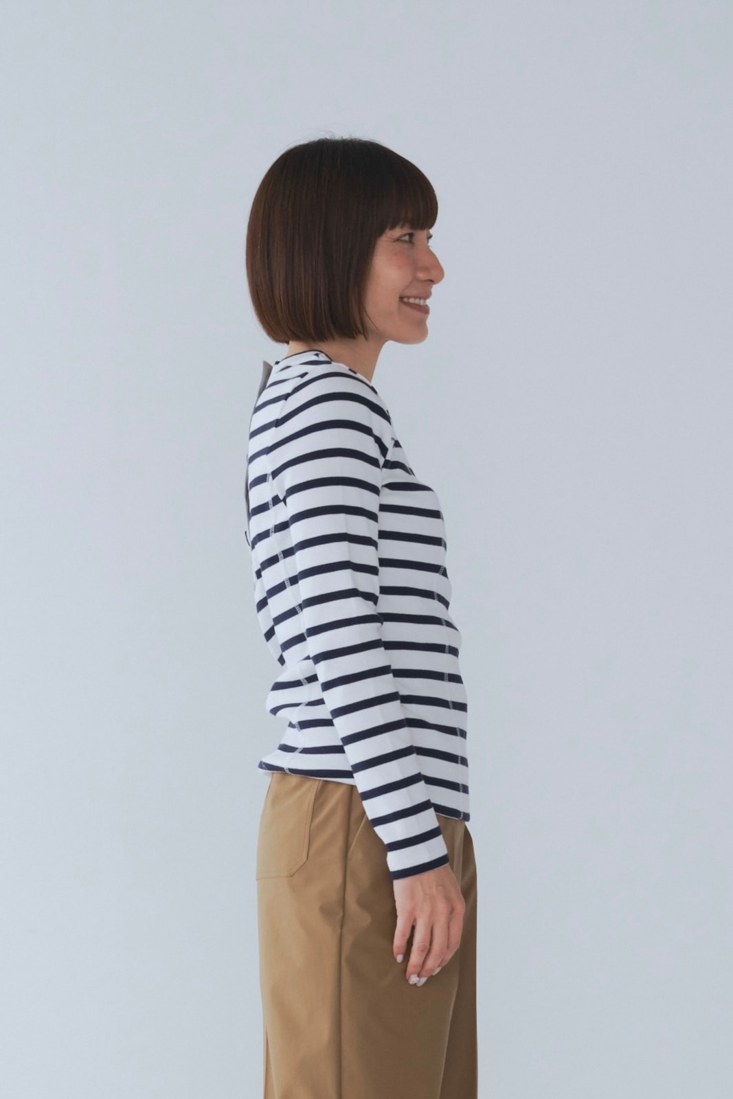 伸縮性のあるフライス編みで、ふっくらとした肉厚で柔らかさのあるニットライクなカットソー素材です。背中には配色の布生地(シャツ地)と存在感のあるボタン、プリンセスラインの切り替えデザインでモードとカジュアルを感じるプルオーバーです。絶妙にミックスされた配色でどこかレトロな雰囲気のボーダー柄と規則的なボーダー柄の2色展開になります。デニムやバギーパンツ、クラシックなスカートと合わせてカジュアルミックスを楽しめるアイテムです。