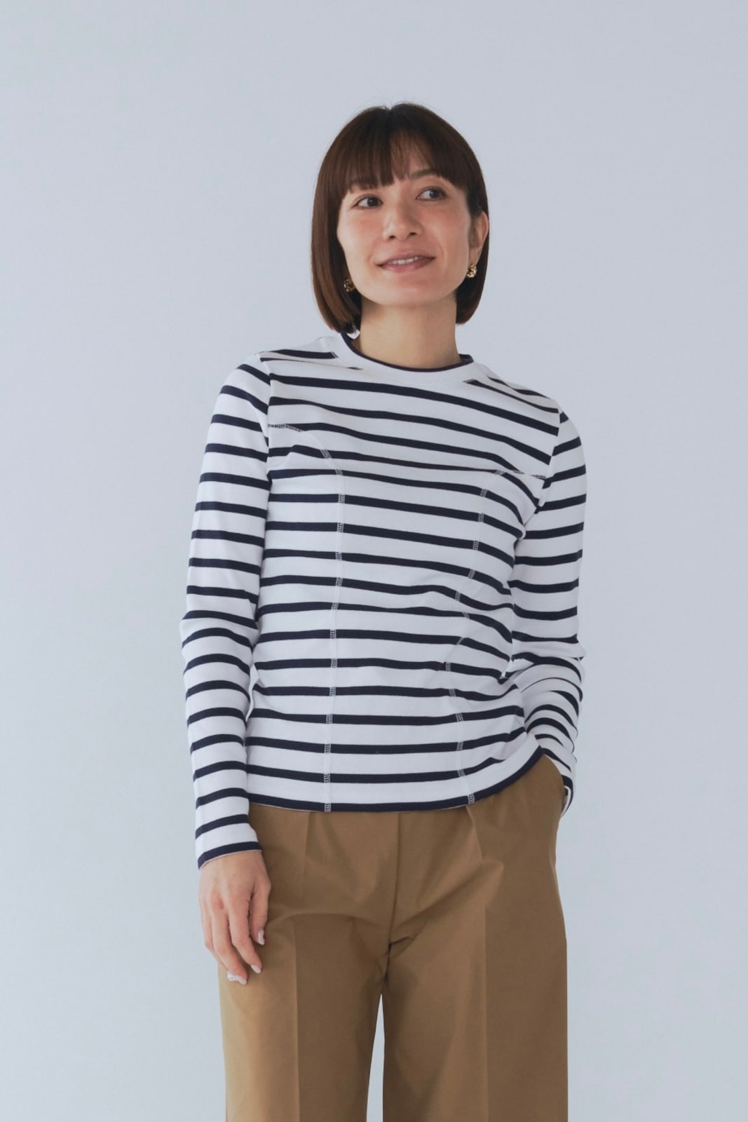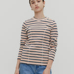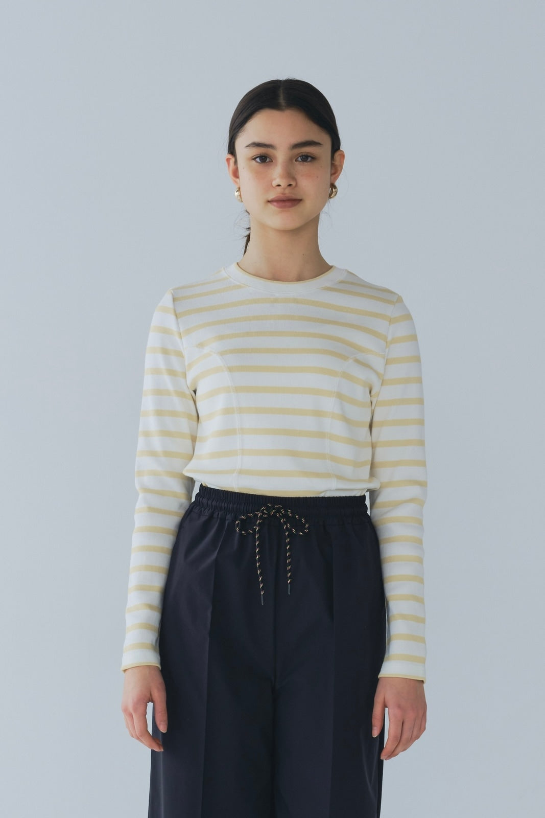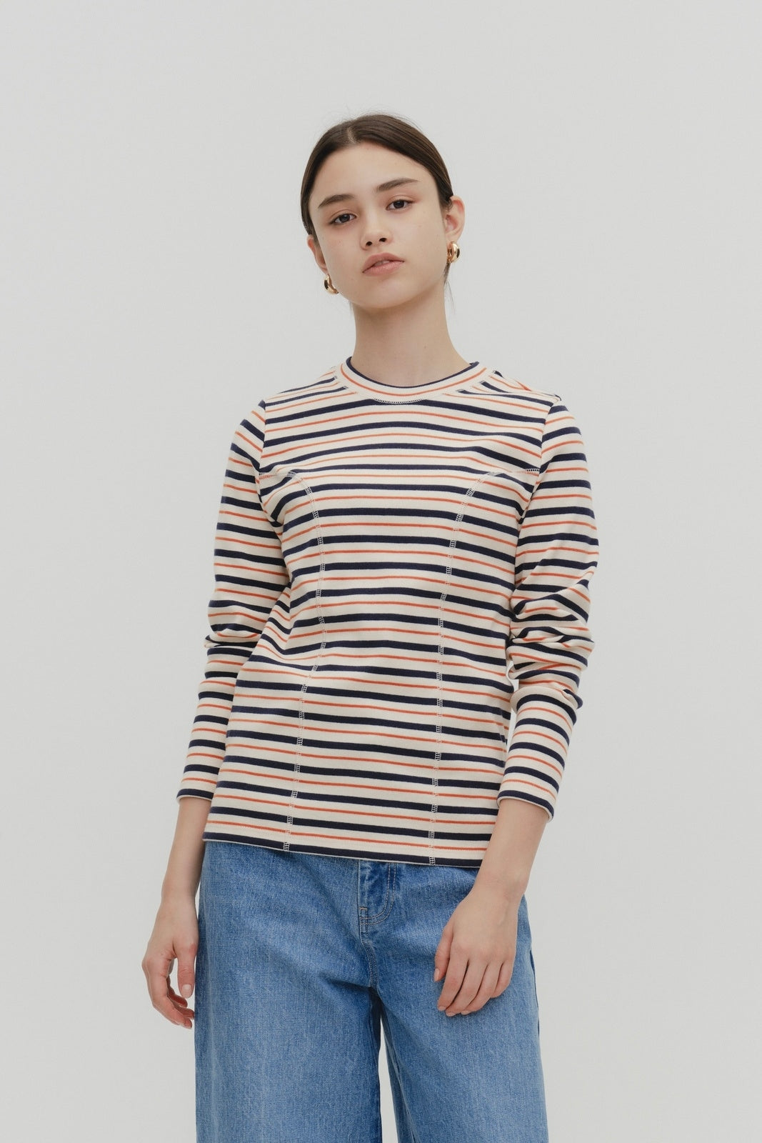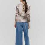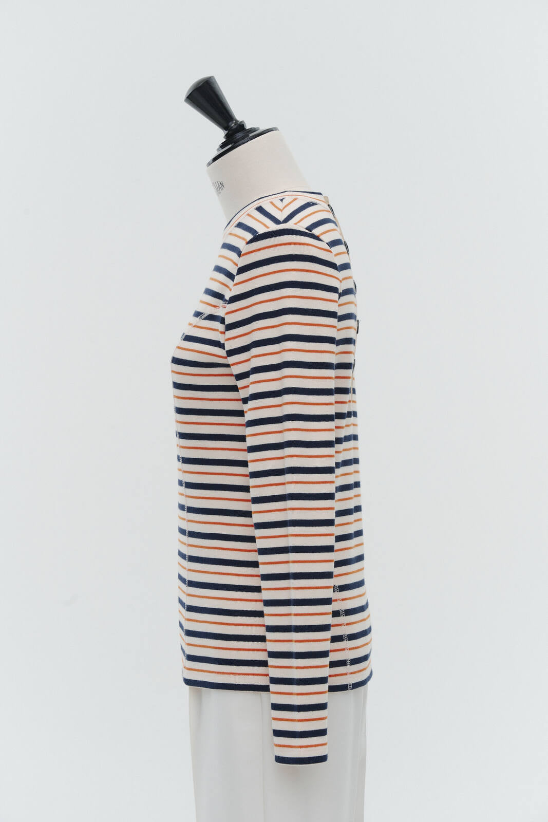 伸縮性のあるフライス編みで、ふっくらとした肉厚で柔らかさのあるニットライクなカットソー素材です。背中には配色の布生地(シャツ地)と存在感のあるボタン、プリンセスラインの切り替えデザインでモードとカジュアルを感じるプルオーバーです。絶妙にミックスされた配色でどこかレトロな雰囲気のボーダー柄と規則的なボーダー柄の2色展開になります。デニムやバギーパンツ、クラシックなスカートと合わせてカジュアルミックスを楽しめるアイテムです。