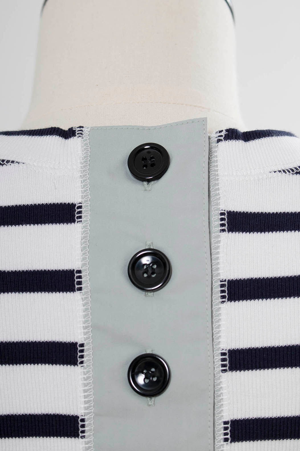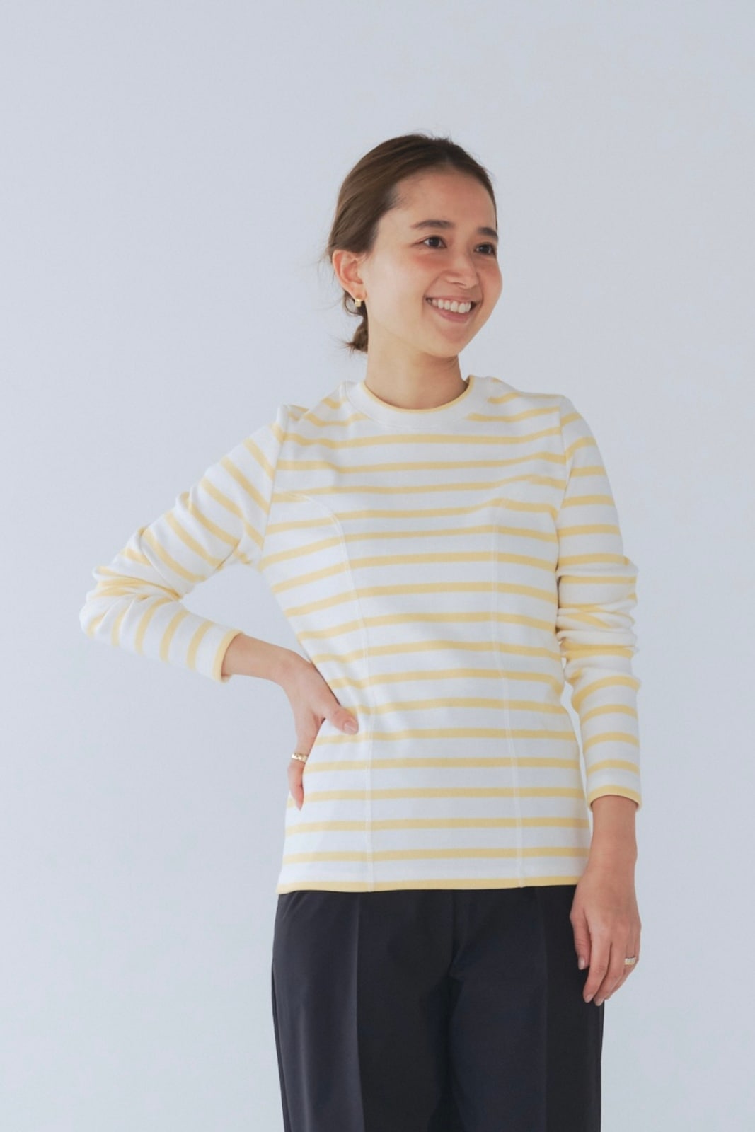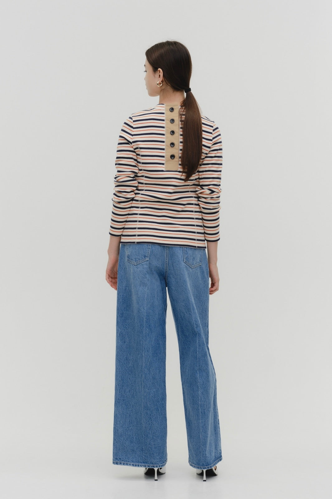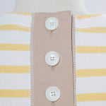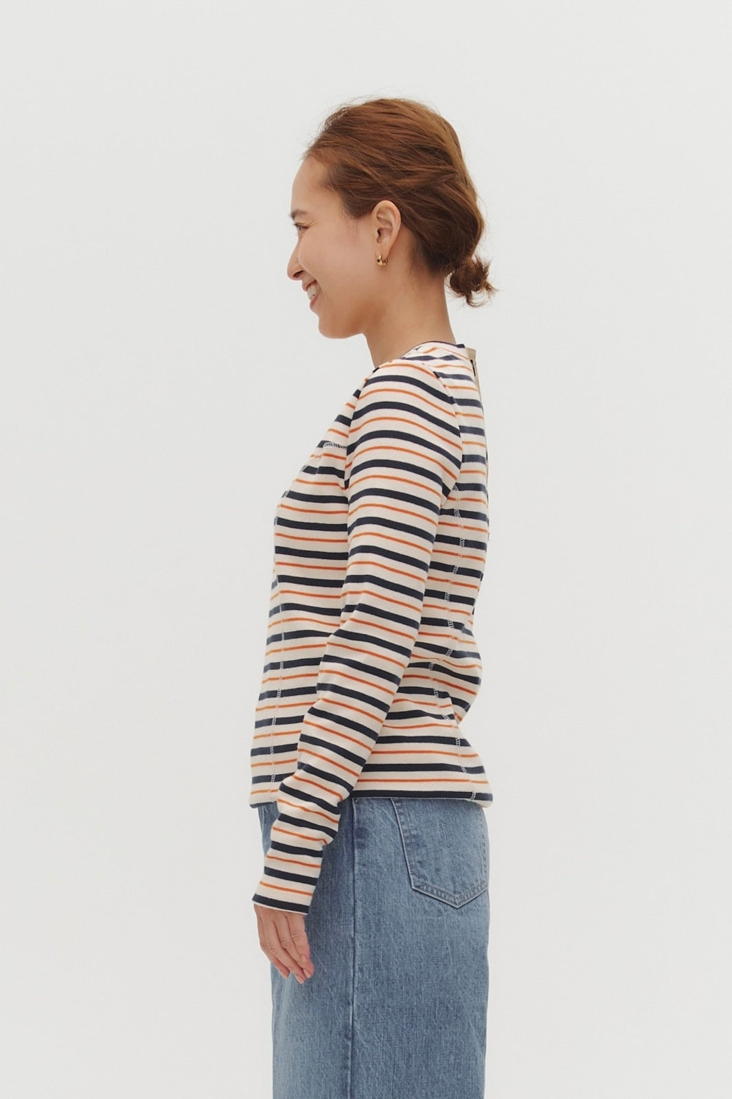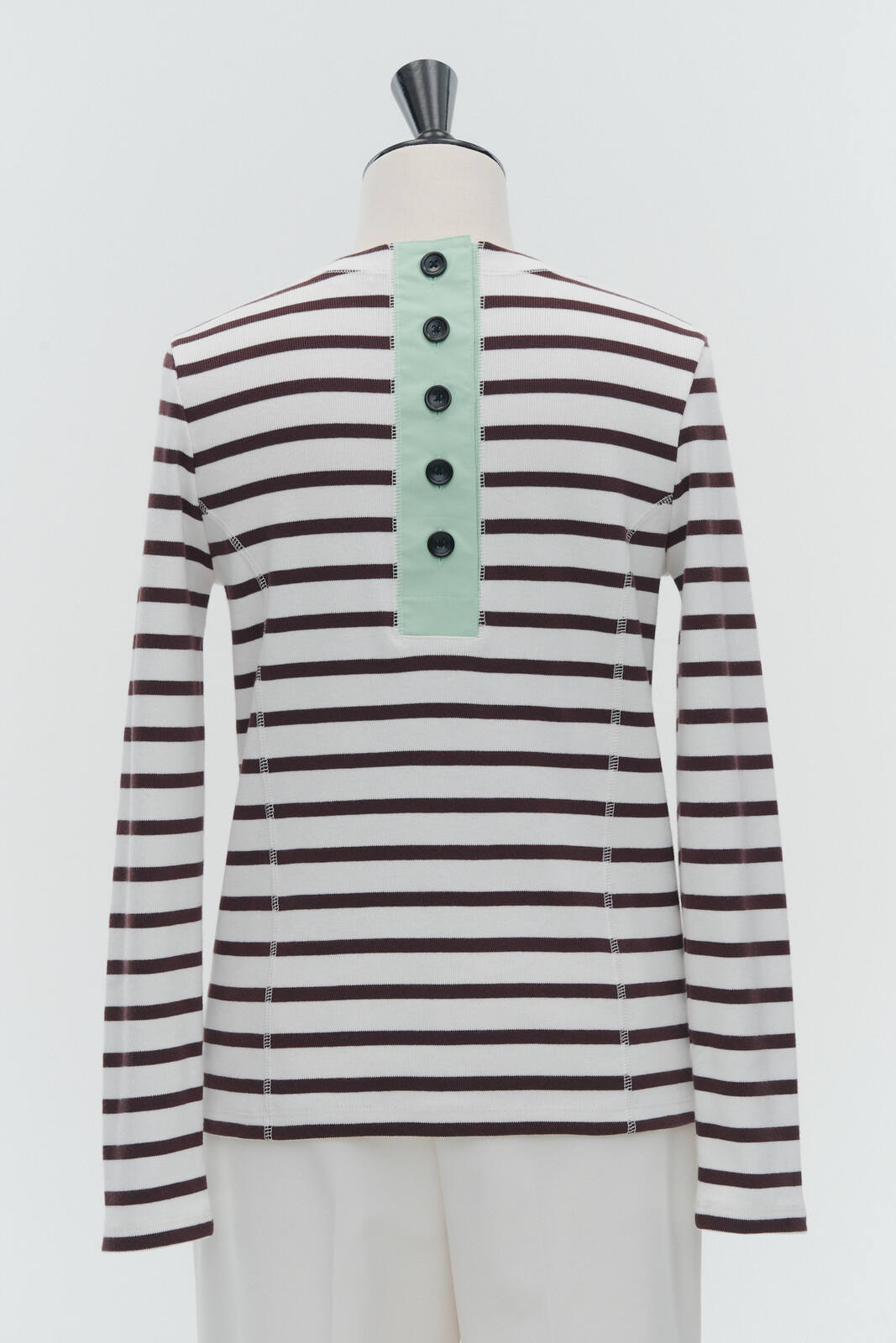 伸縮性のあるフライス編みで、ふっくらとした肉厚で柔らかさのあるニットライクなカットソー素材です。背中には配色の布生地(シャツ地)と存在感のあるボタン、プリンセスラインの切り替えデザインでモードとカジュアルを感じるプルオーバーです。絶妙にミックスされた配色でどこかレトロな雰囲気のボーダー柄と規則的なボーダー柄の2色展開になります。デニムやバギーパンツ、クラシックなスカートと合わせてカジュアルミックスを楽しめるアイテムです。