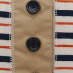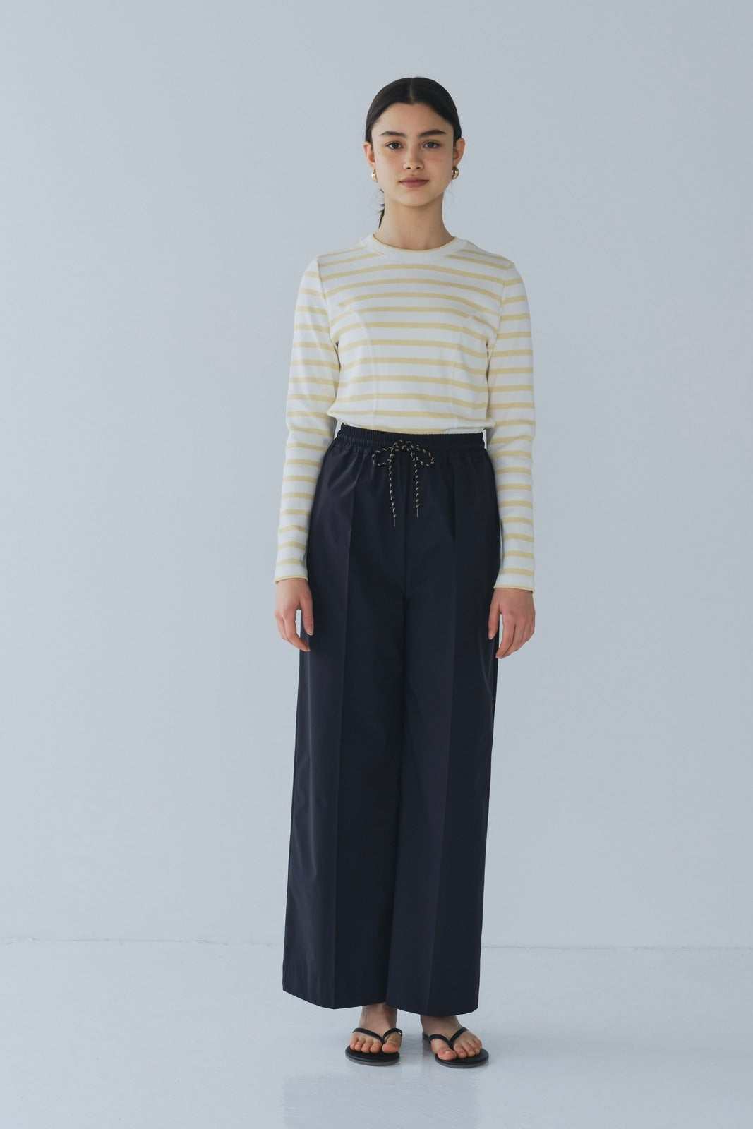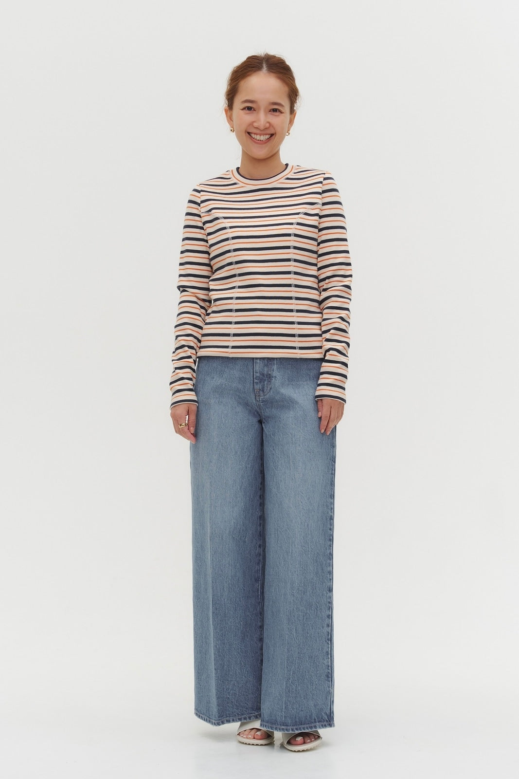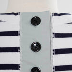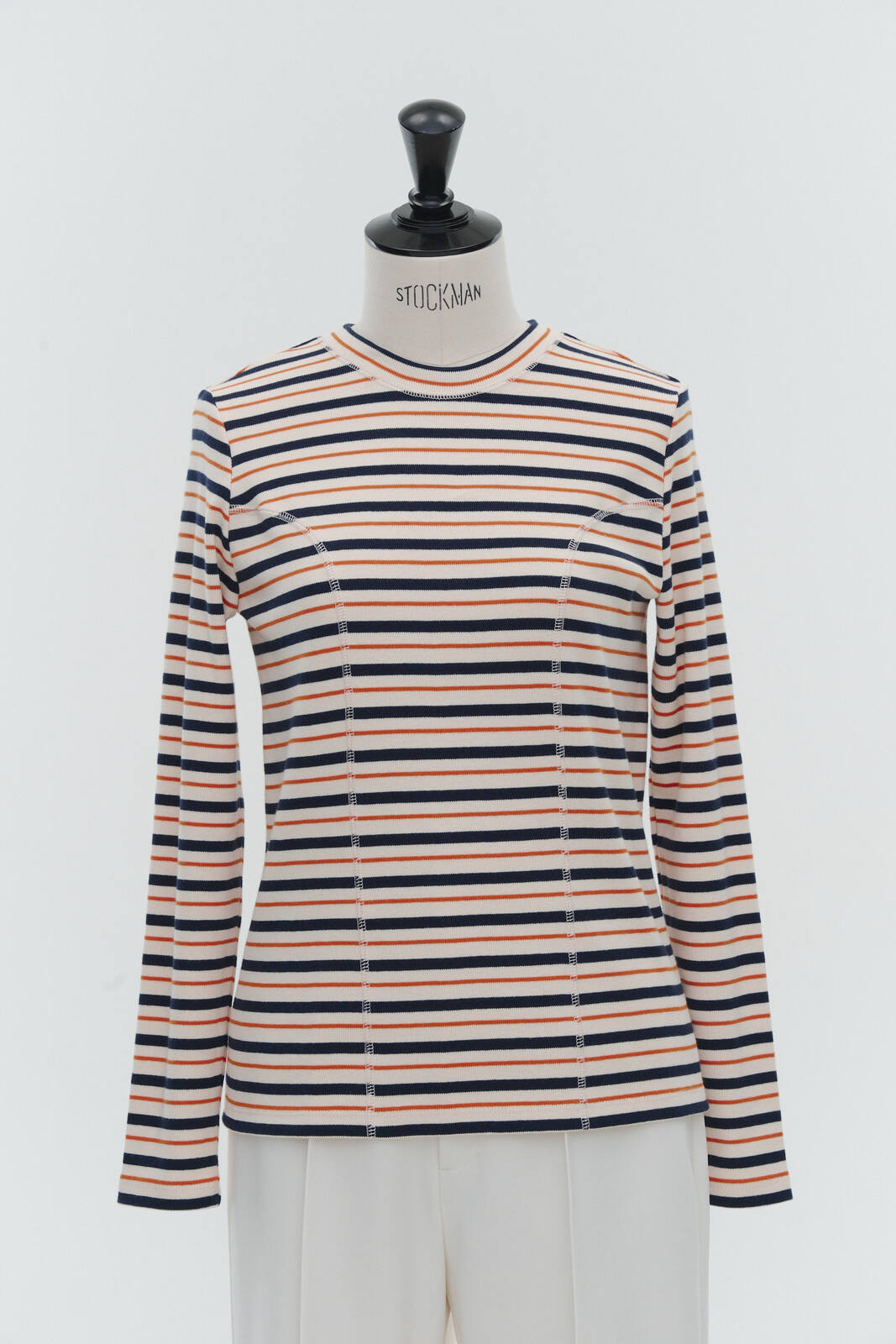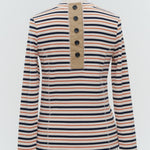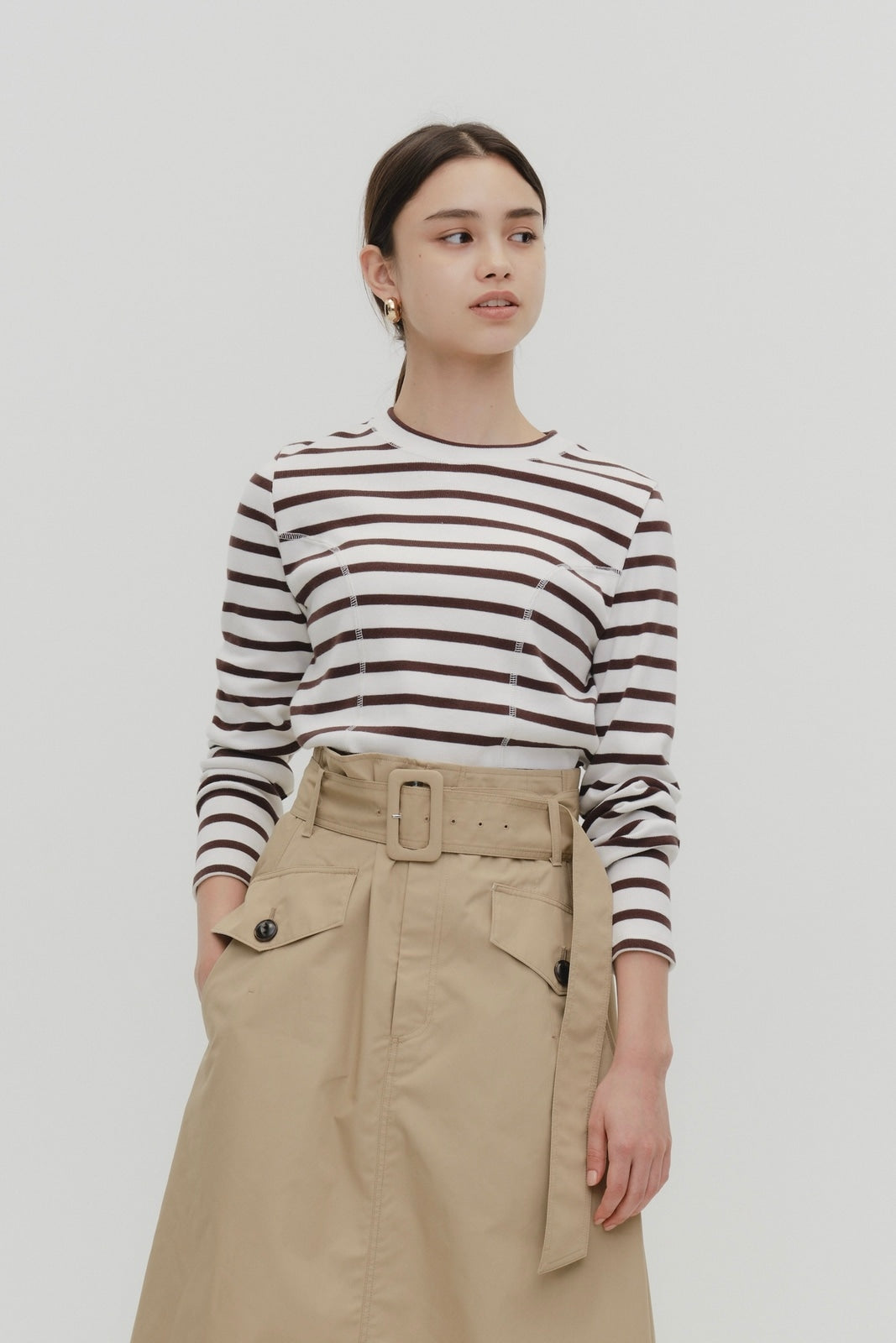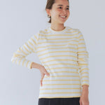伸縮性のあるフライス編みで、ふっくらとした肉厚で柔らかさのあるニットライクなカットソー素材です。背中には配色の布生地(シャツ地)と存在感のあるボタン、プリンセスラインの切り替えデザインでモードとカジュアルを感じるプルオーバーです。絶妙にミックスされた配色でどこかレトロな雰囲気のボーダー柄と規則的なボーダー柄の2色展開になります。デニムやバギーパンツ、クラシックなスカートと合わせてカジュアルミックスを楽しめるアイテムです。