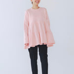 コットン100%柔らかい、さらっとした肌触りでラフな着心地の日本産裏毛素材(トレーナー生地)を使用しています。衿周りはリブを使いコンパクトなネックライン。ティアードのボリュームを持たせたシルエットは着やせ効果があります。細身パンツともバランス良く合わせられる絶妙な着丈もポイントです。女性らしく仕上げた大人のリラックスアイテムです。