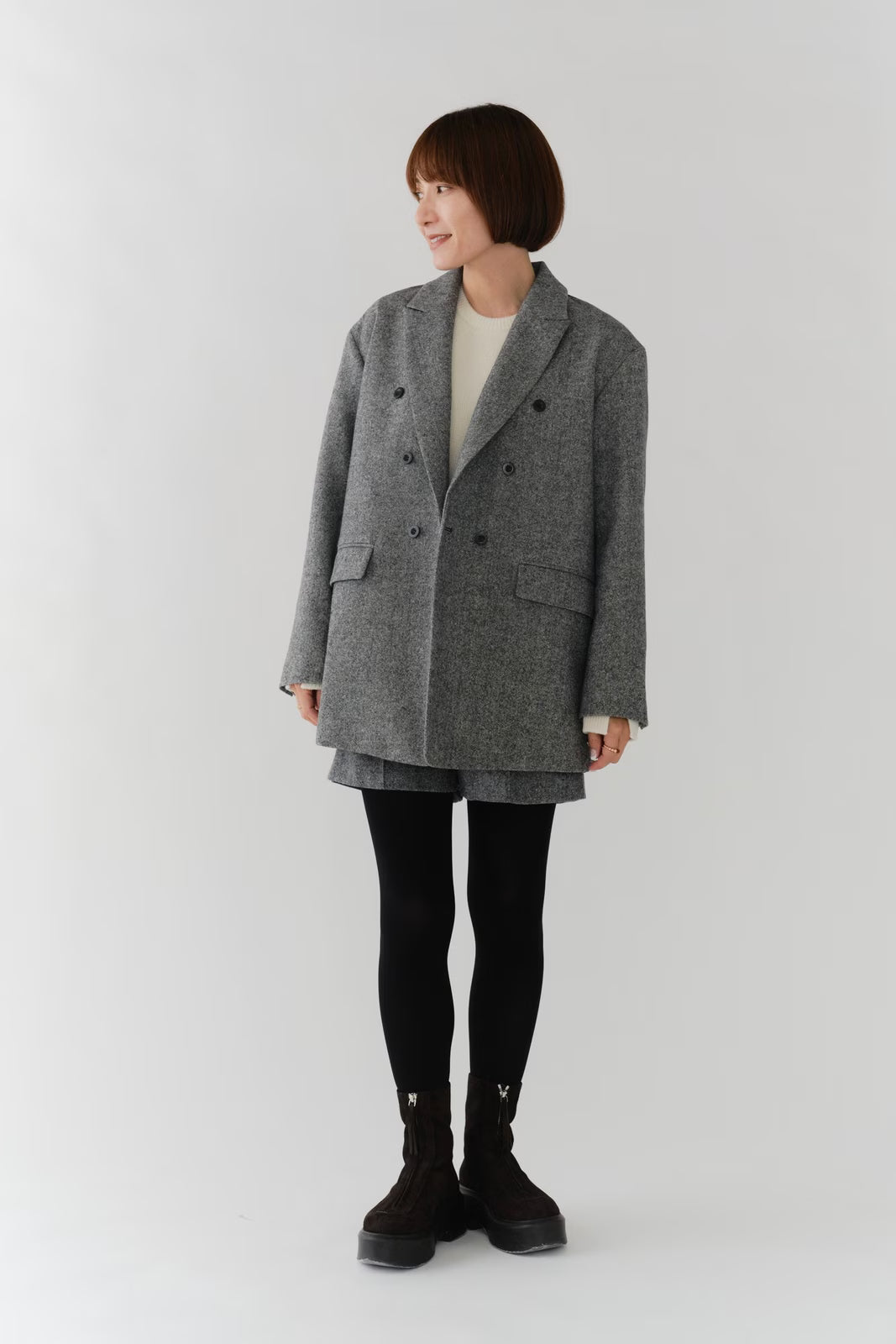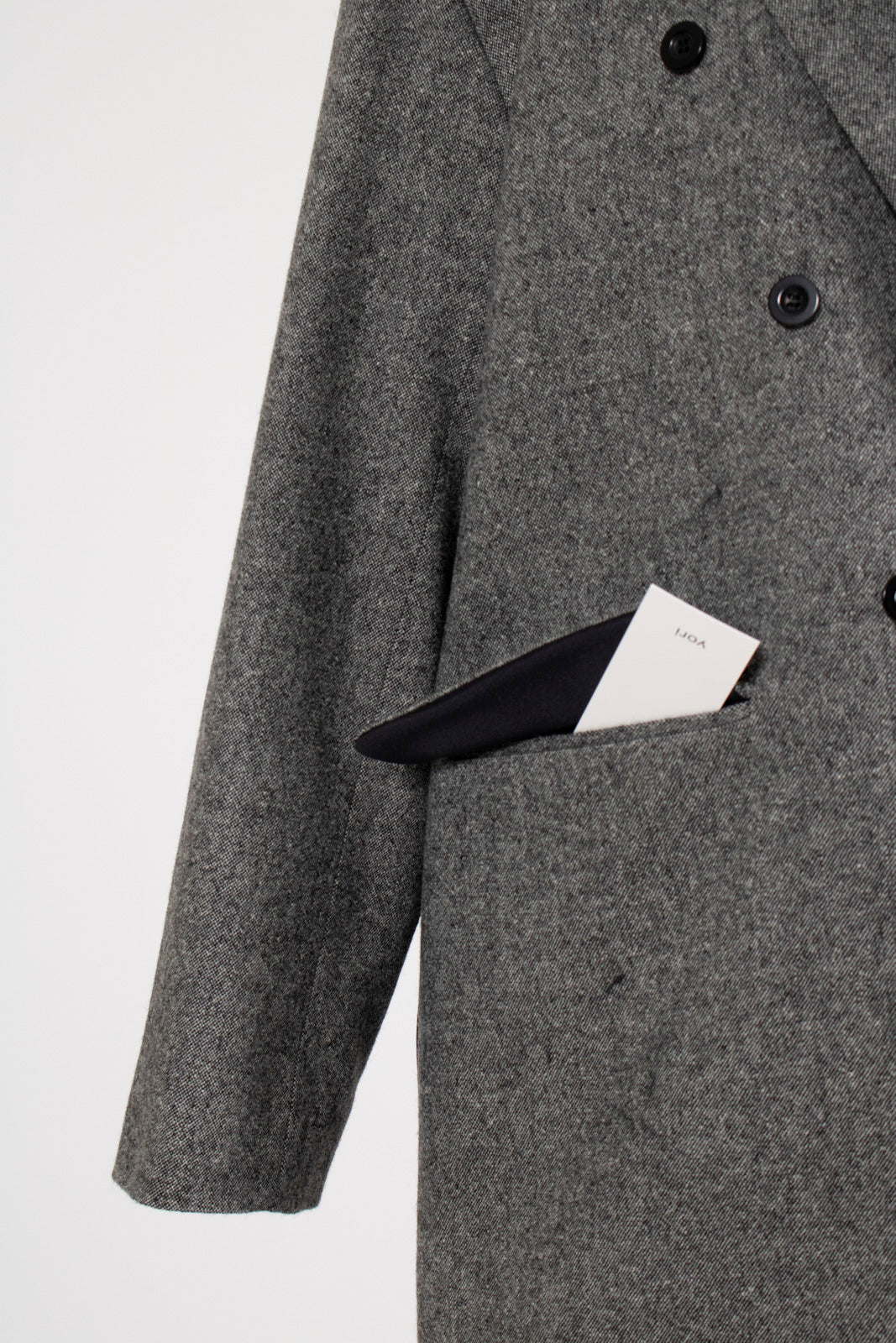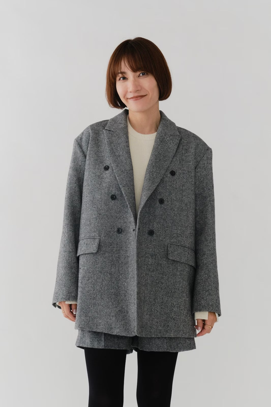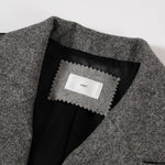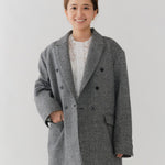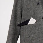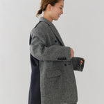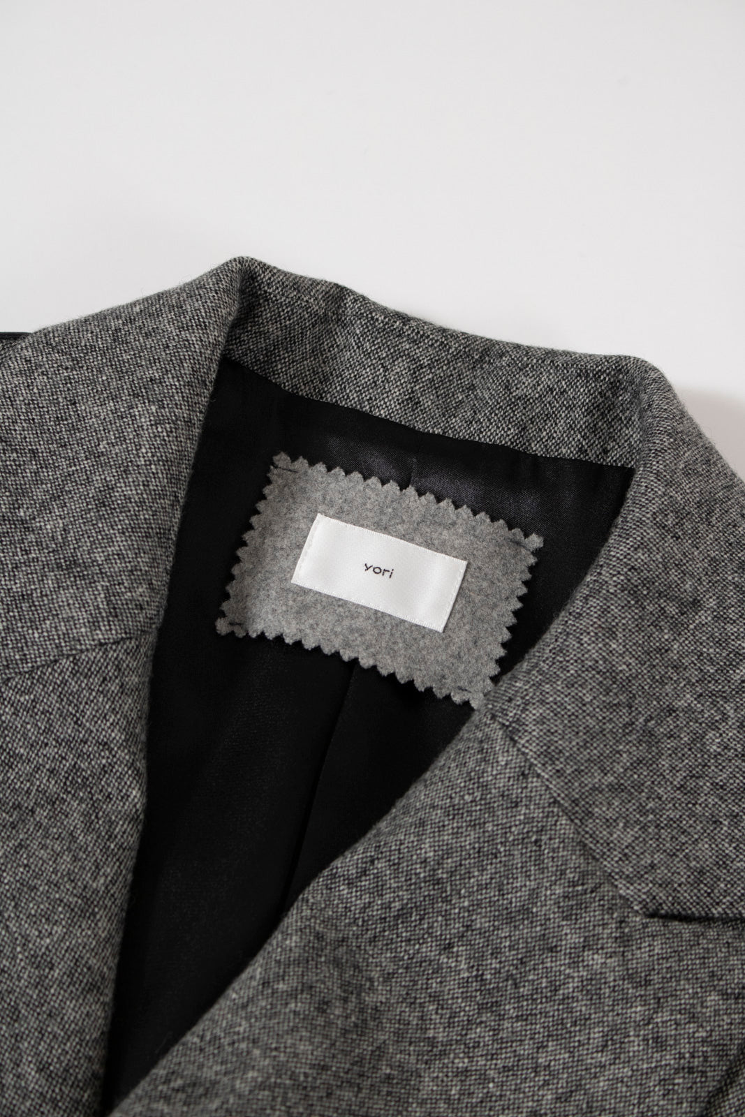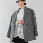 国産のリサイクルポリエステルを選定し、全ての工程を日本国内で行っているリサイクル紡毛素材を使用。クラシックな佇まいに、現代的なエッセンスを取り入れたエコウールツイードジャケット。上質なメンズツイードを思わせる風合いのある生地は、ほどよい厚みと柔らかさを兼ね備えています。フロントには深めのVラインとダブルボタン、ピークドラペルを採用し、凛とした印象に。クラシカルなデザインながらも、女性らしく軽やかに羽織れるビックシルエットに仕上げました。袖口には繊細なボタンを贅沢にあしらい、袖裏にはストライプ柄の裏地を使用。ロールアップ時にも美しさを保ちます。さらに、バックスタイルにはサテン生地を施したベンツを配し、動きのある上品な表情を演出。yoriらしいネームタグモチーフもさりげないアクセントに。タイムレスなデザインと確かな素材感が、日常をワンランクアップさせてくれる一着です。